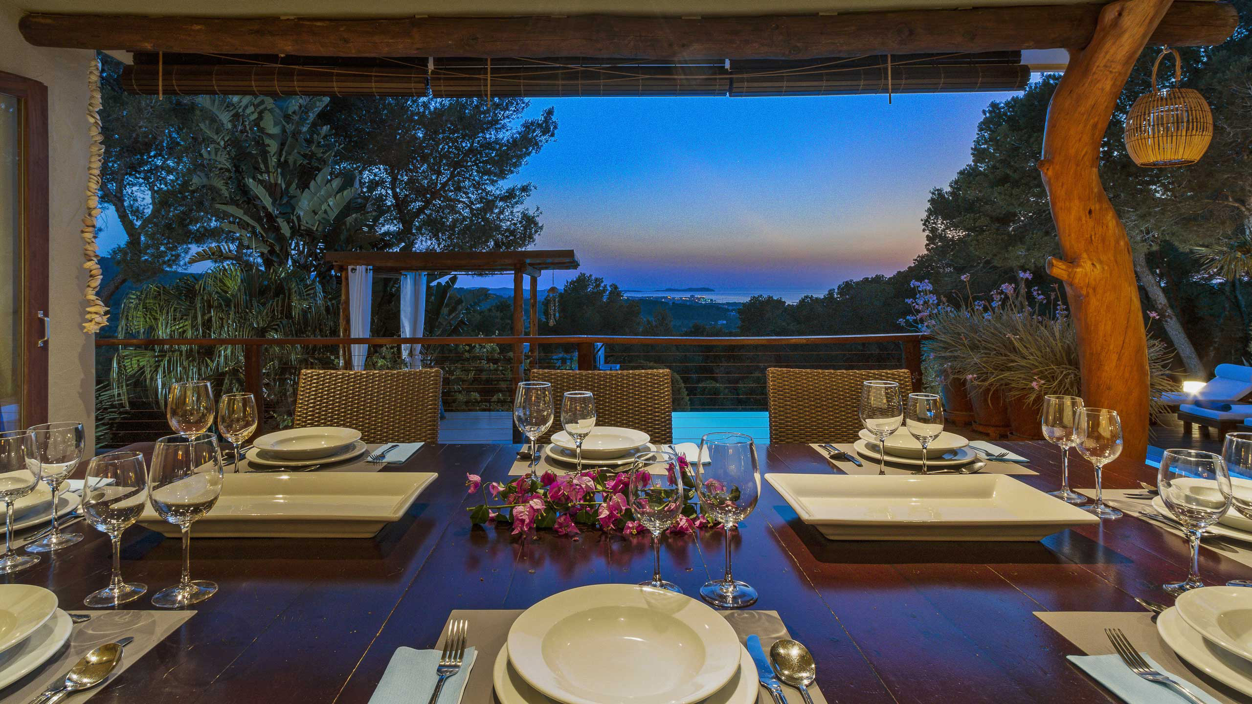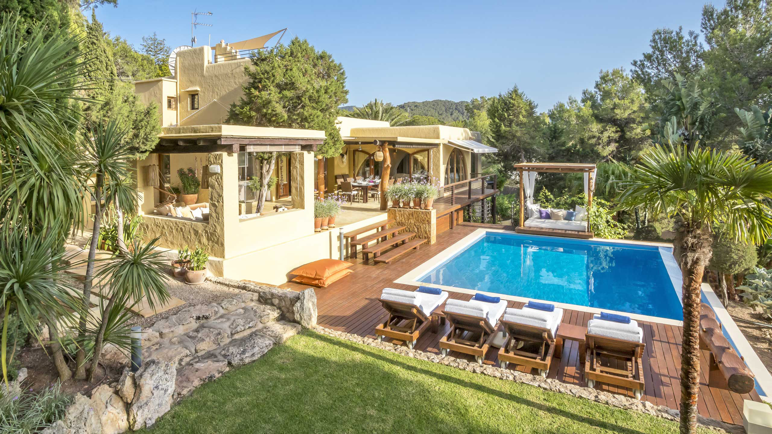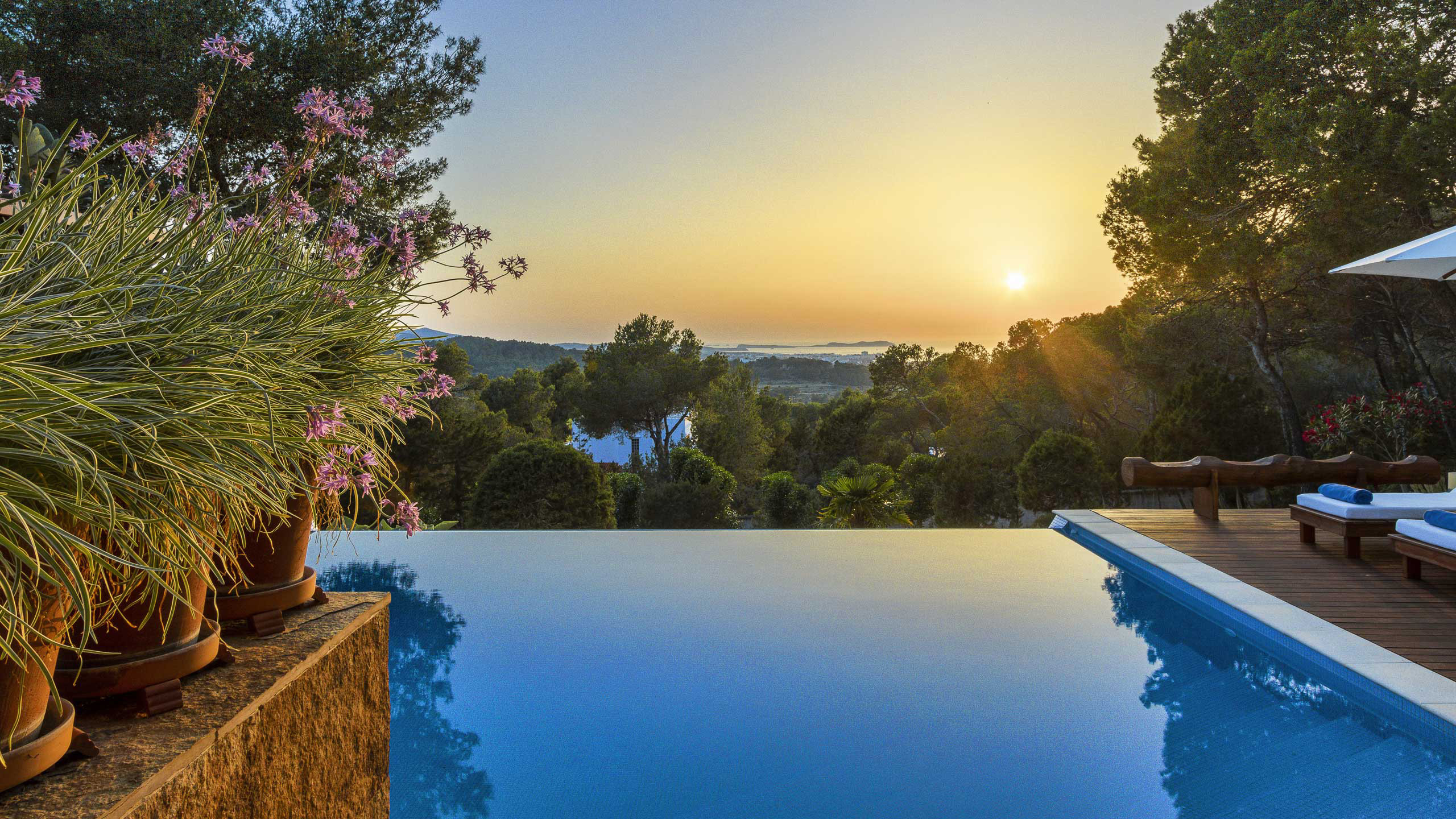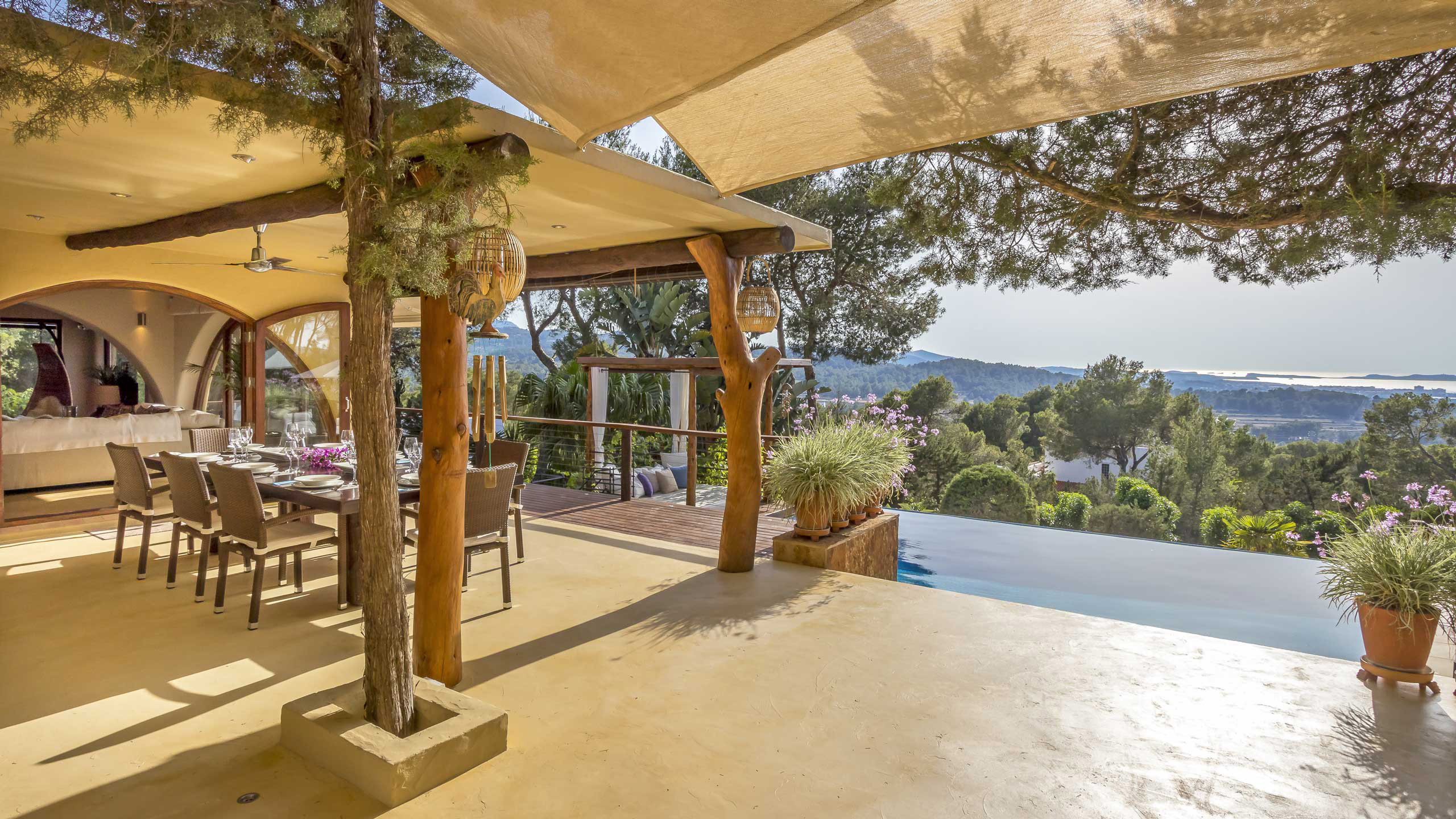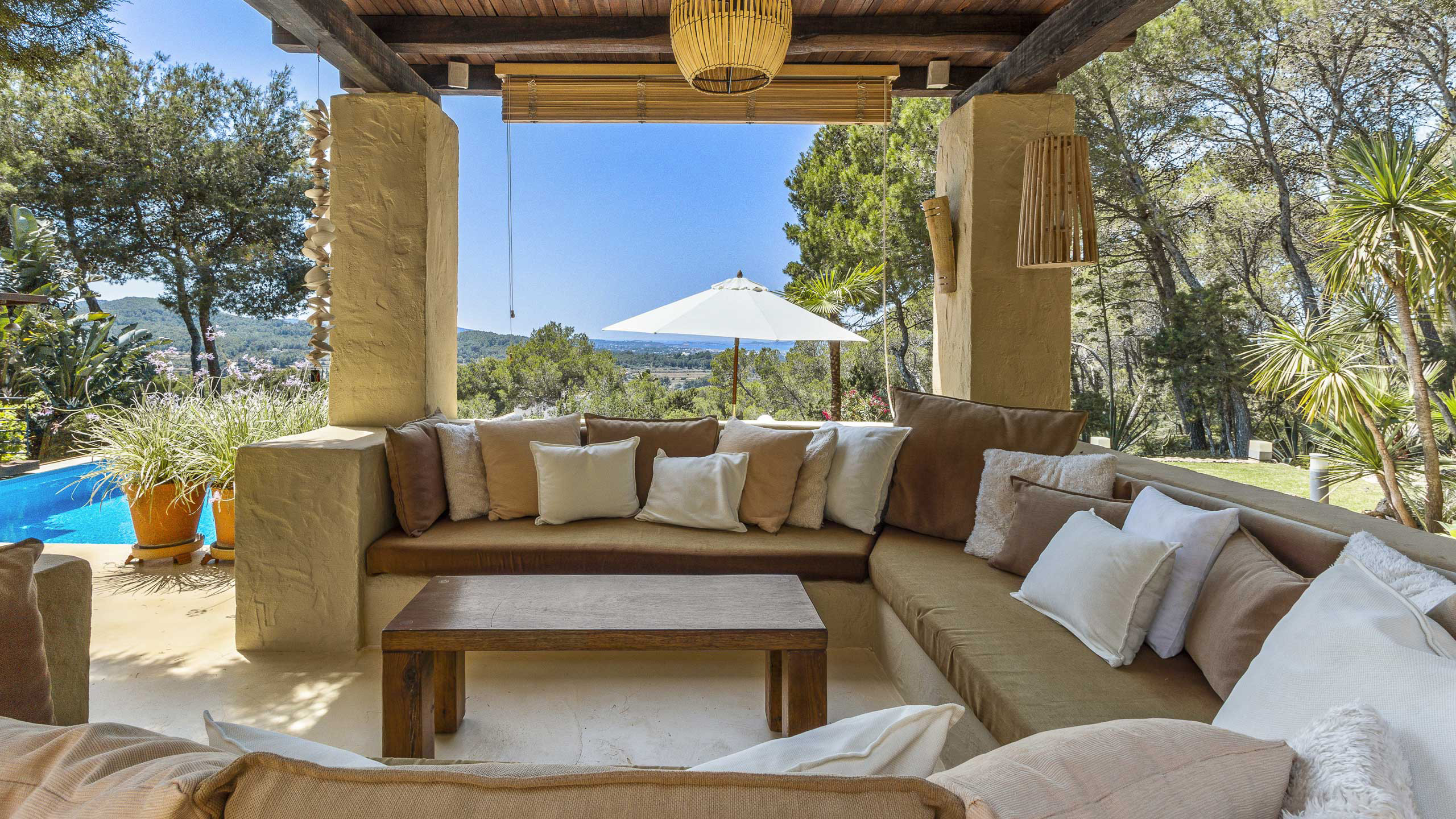 Villa Fergolia is set in verdant countryside, the contemporary Mediterranean-style residence has a roof terrace with spectacular views of the sea and Ibiza's sunsets.