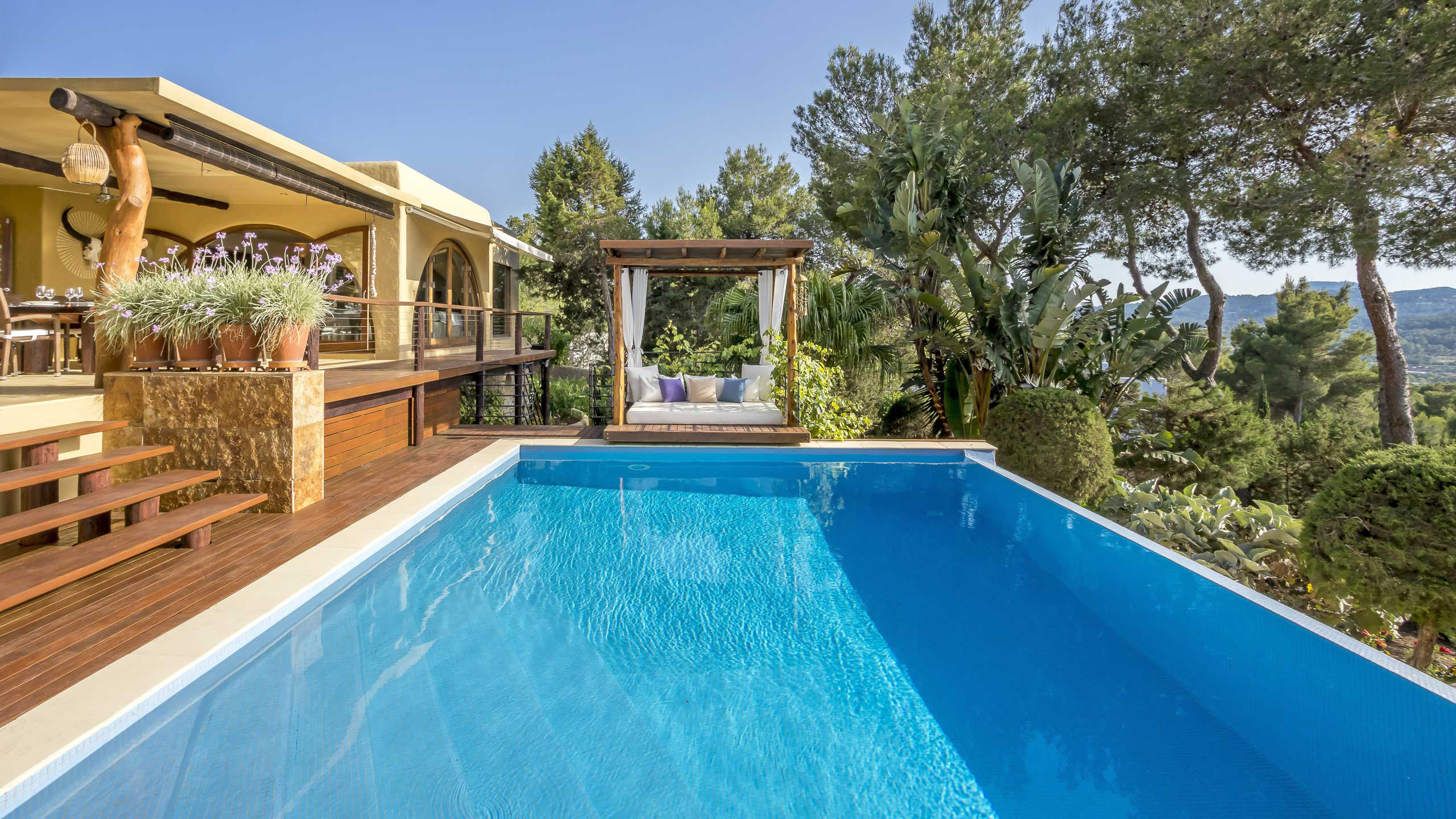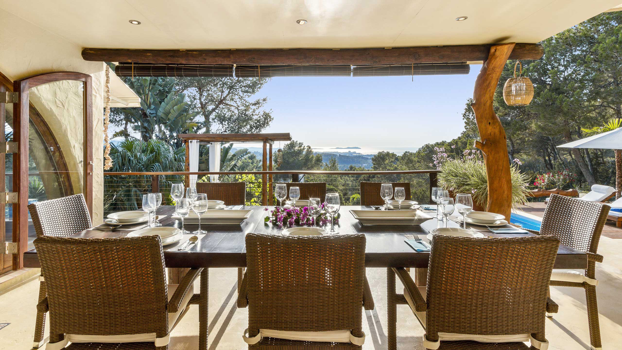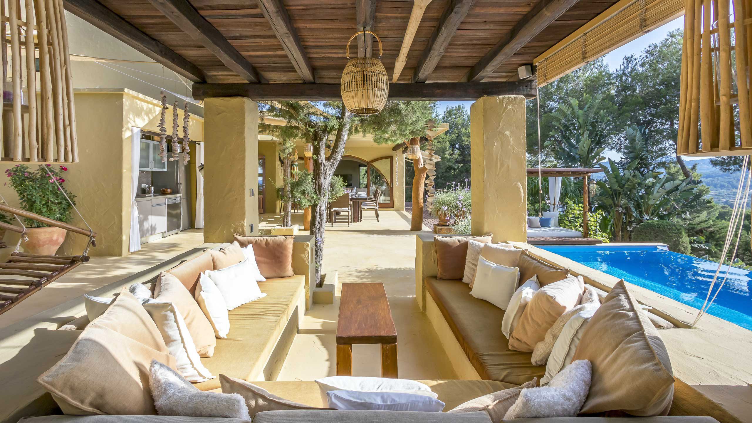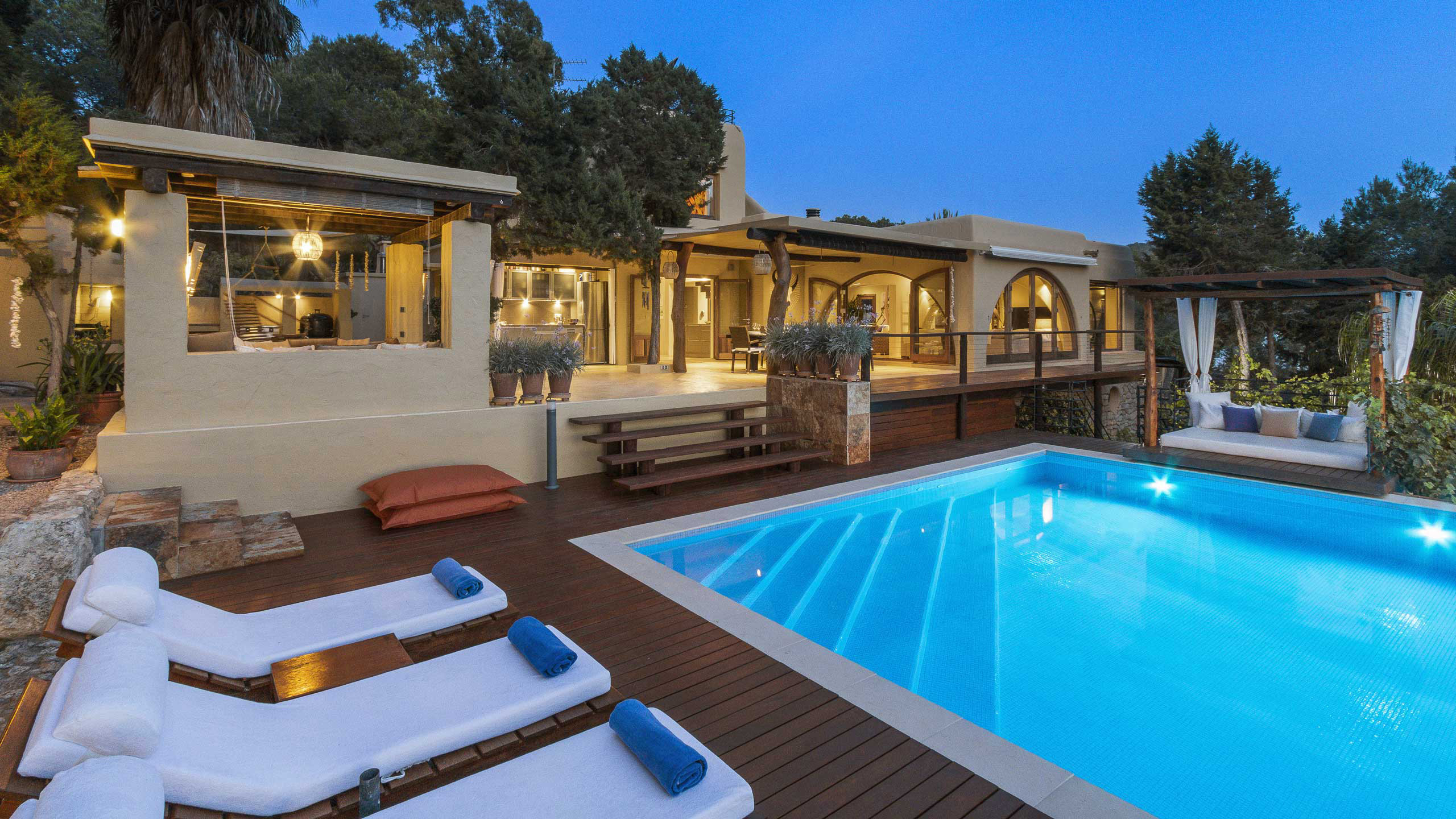 Villa Fergolia is set in verdant countryside, the contemporary Mediterranean-style residence has a roof terrace with spectacular views of the sea and Ibiza's sunsets.