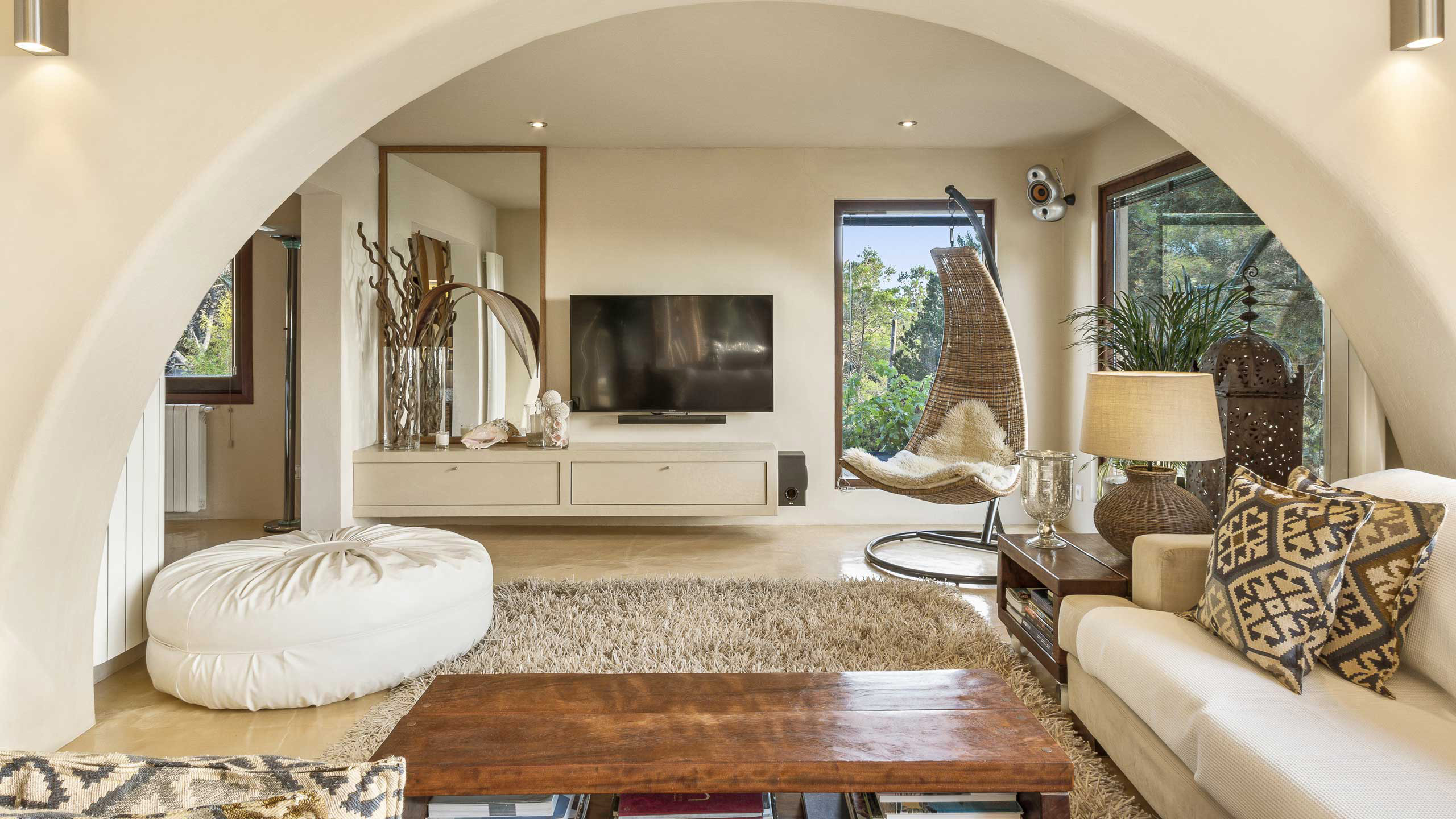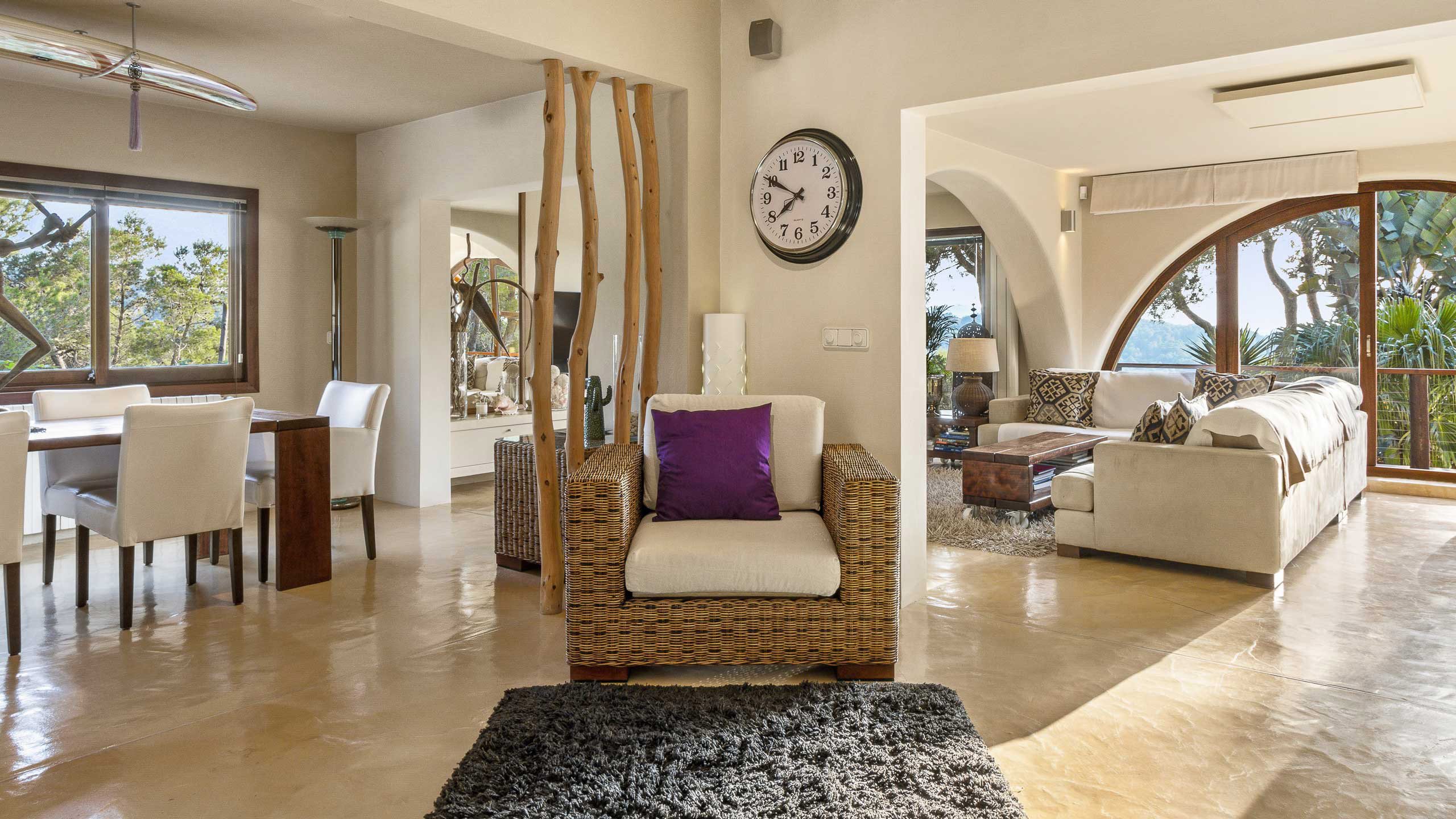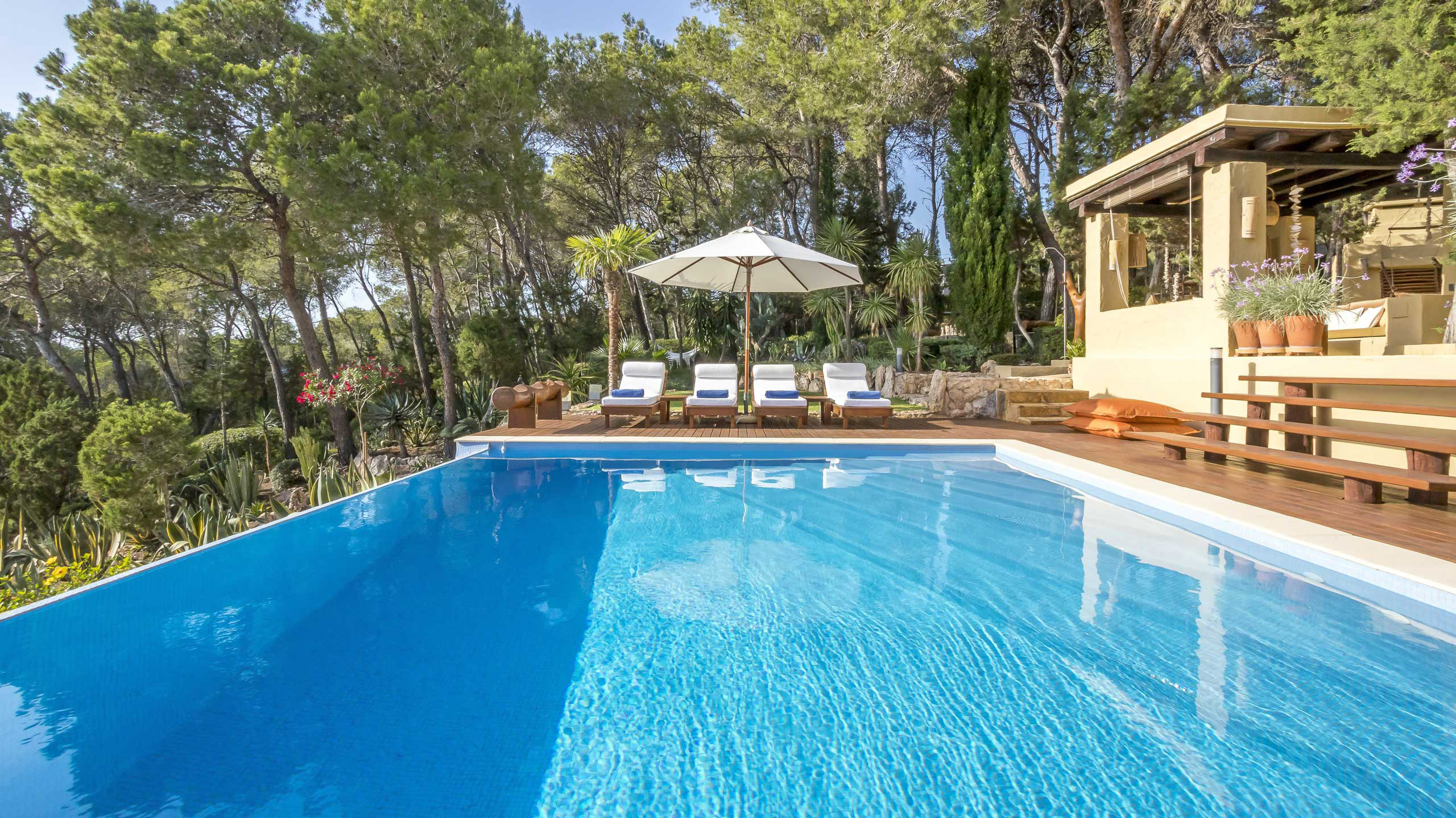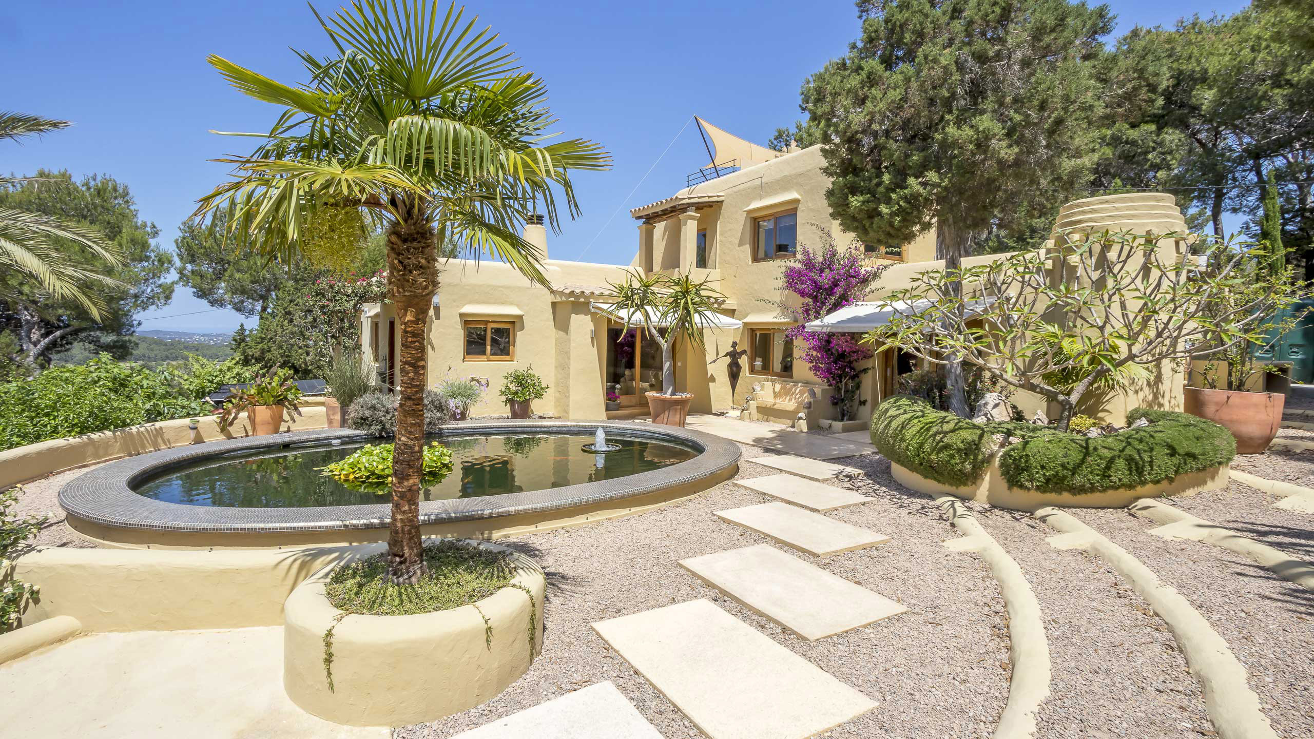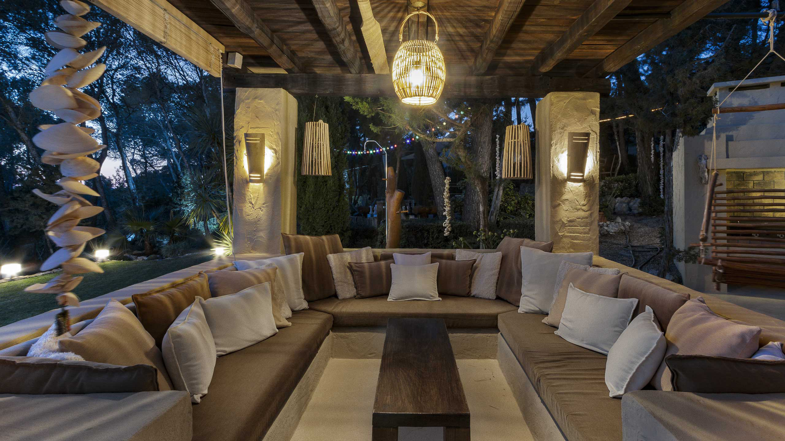 Villa Fergolia is set in verdant countryside, the contemporary Mediterranean-style residence has a roof terrace with spectacular views of the sea and Ibiza's sunsets.