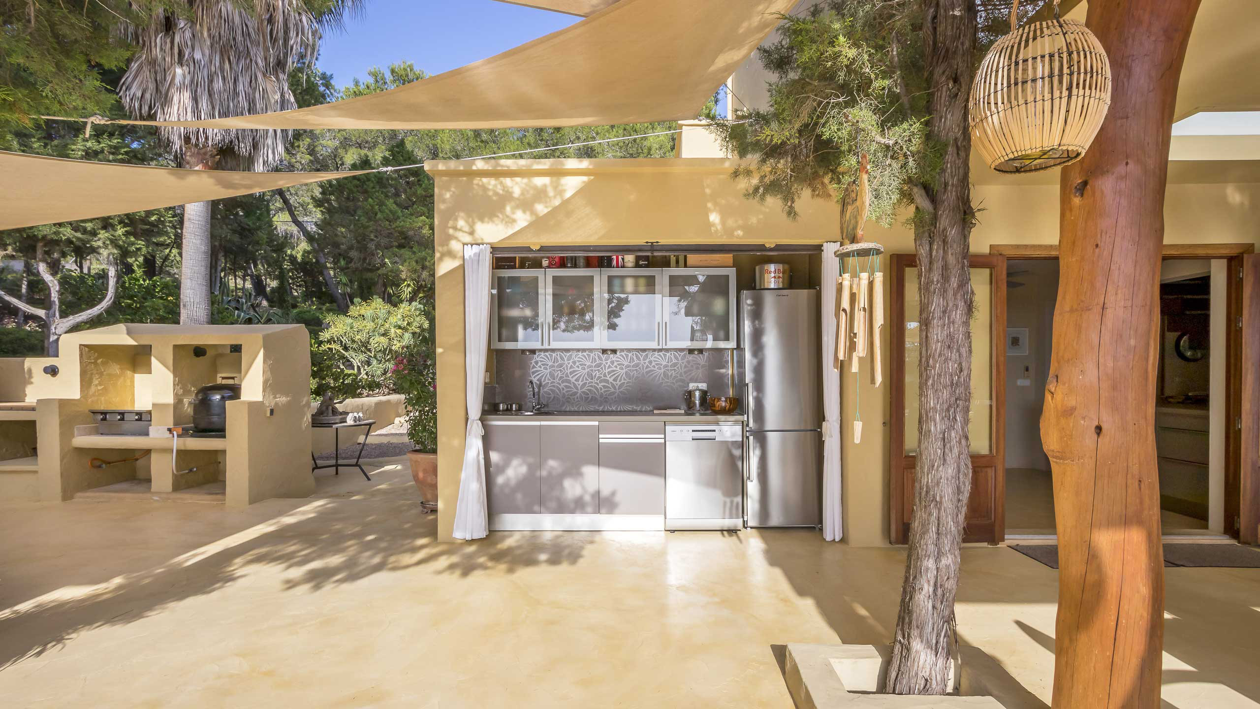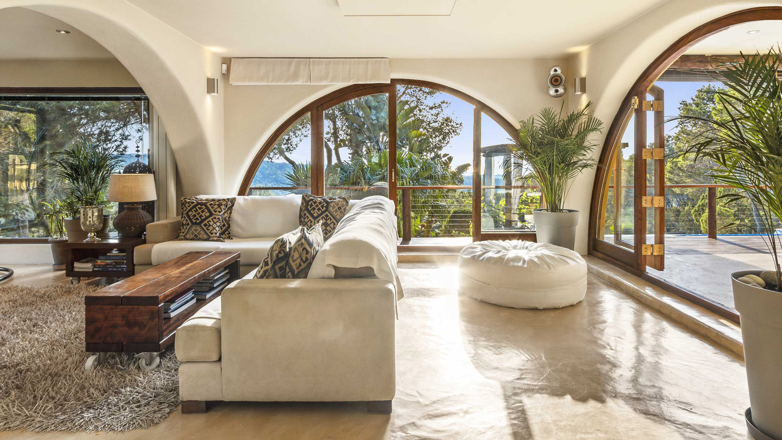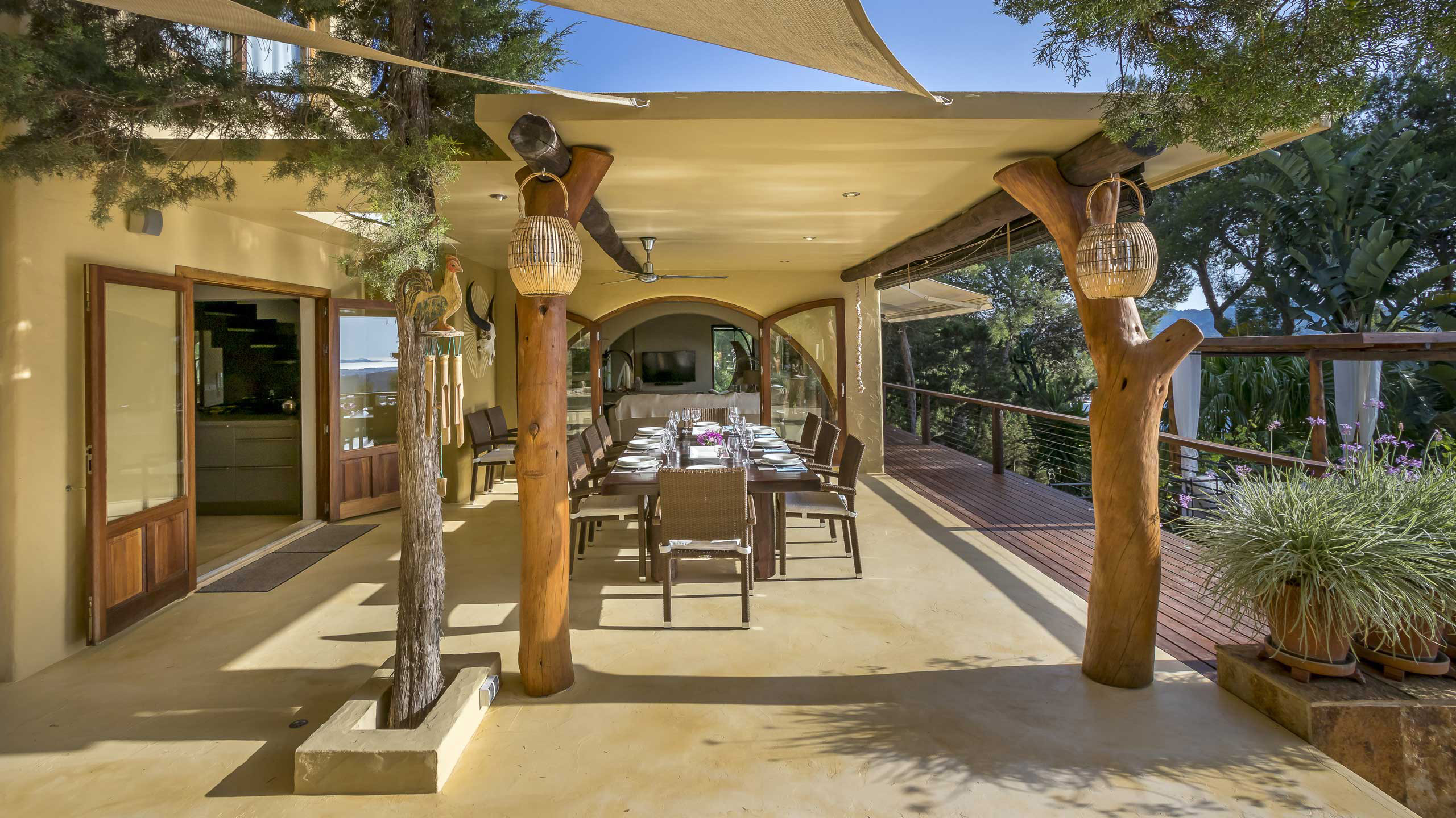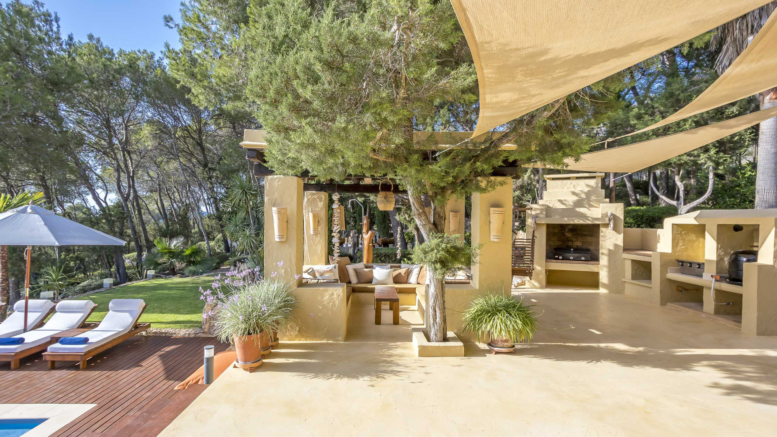 Villa Fergolia is set in verdant countryside, the contemporary Mediterranean-style residence has a roof terrace with spectacular views of the sea and Ibiza's sunsets.