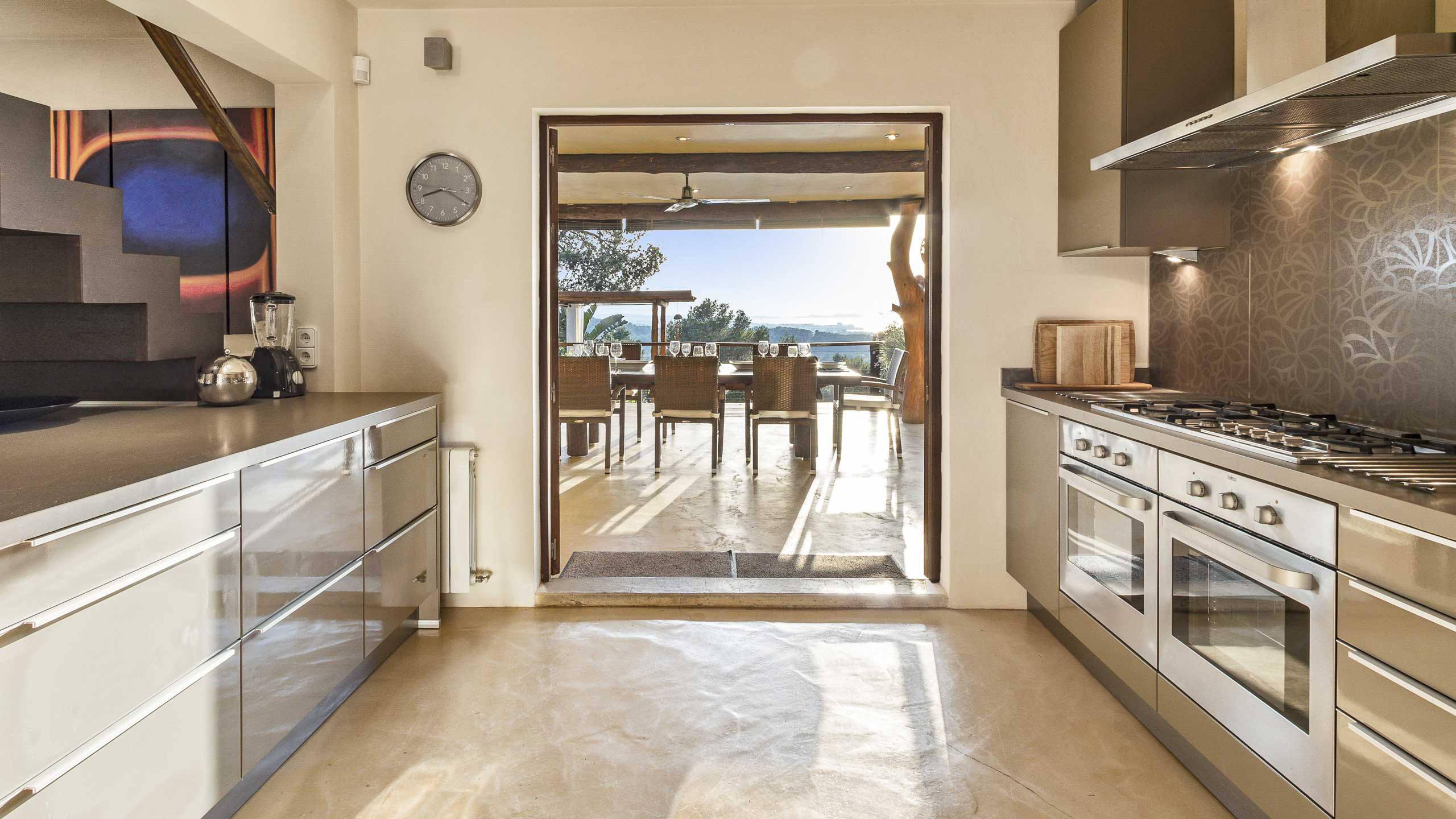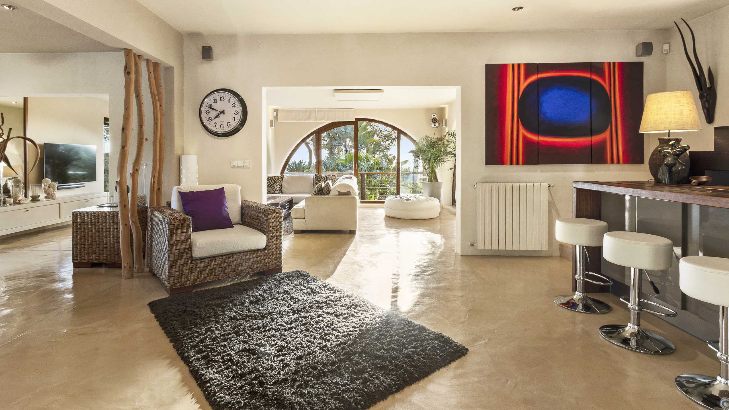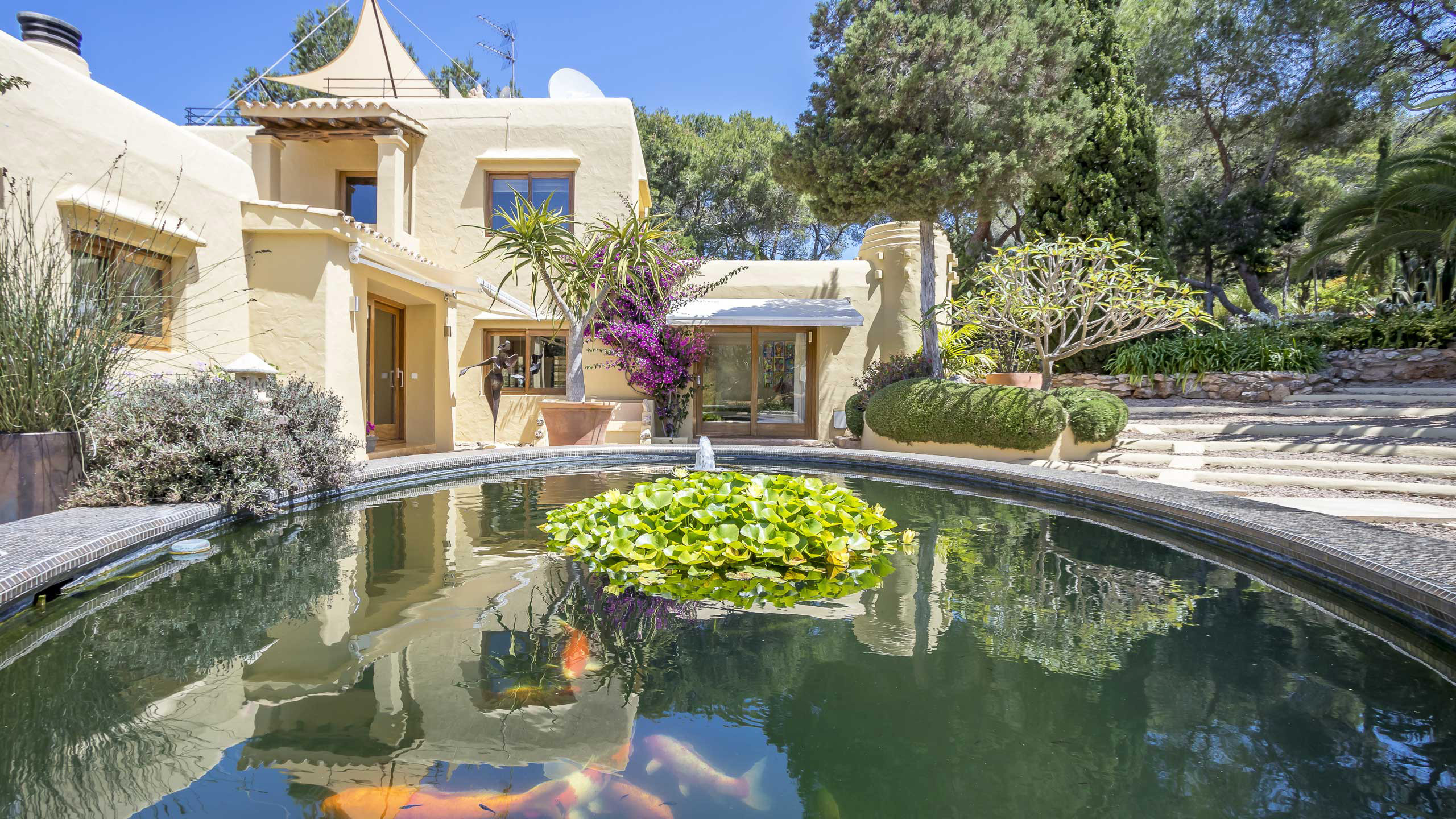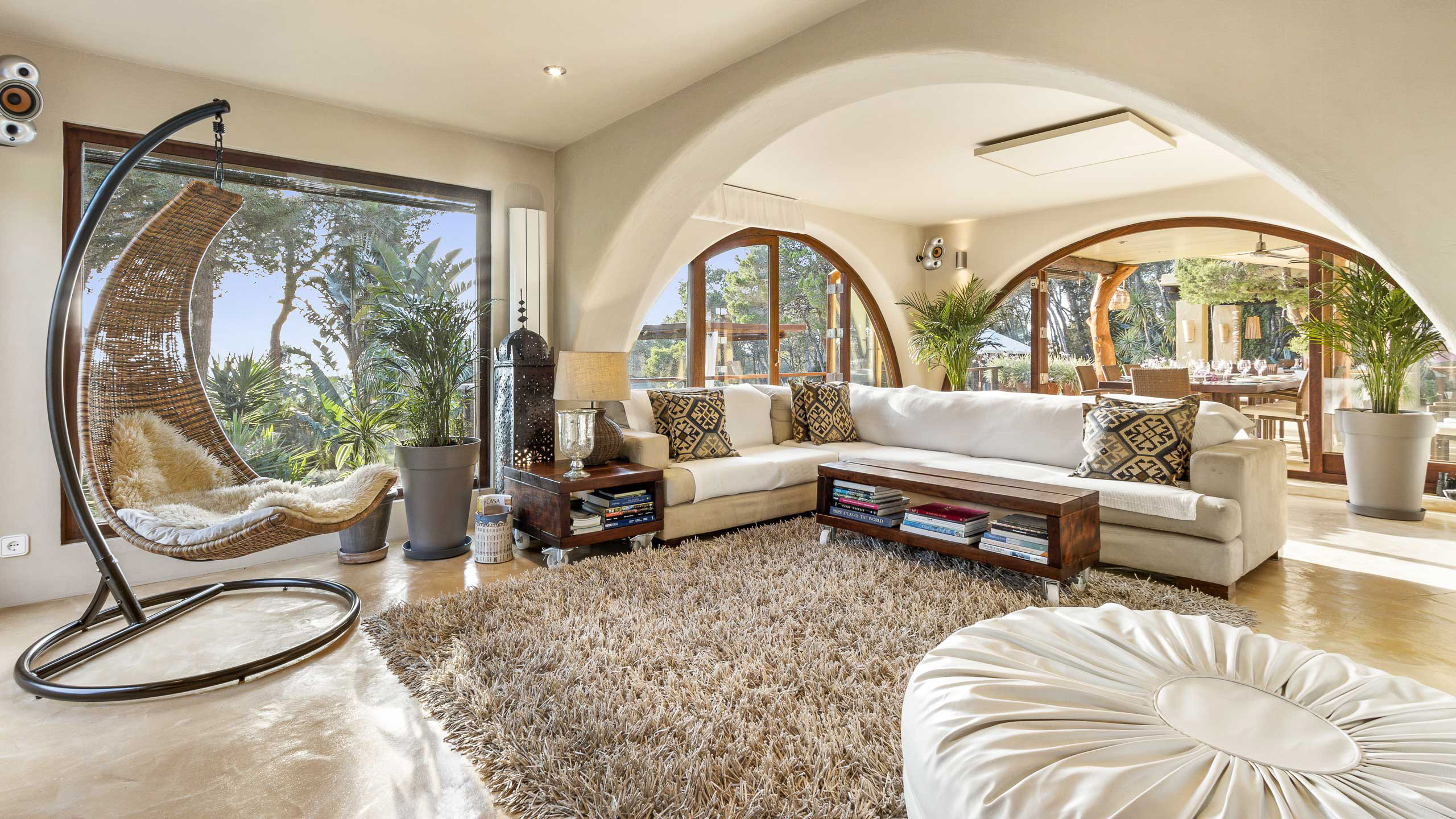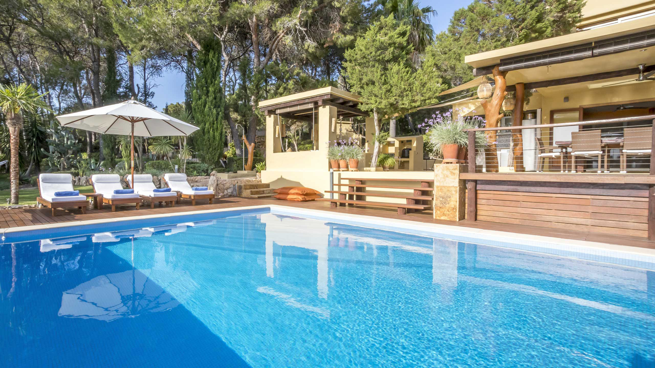 Villa Fergolia is set in verdant countryside, the contemporary Mediterranean-style residence has a roof terrace with spectacular views of the sea and Ibiza's sunsets.