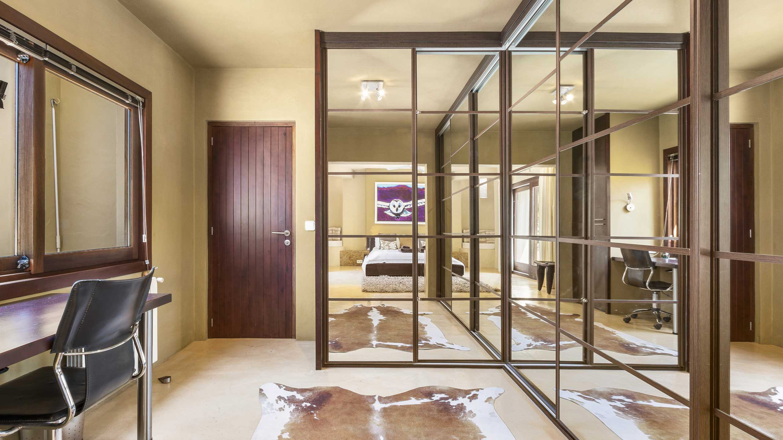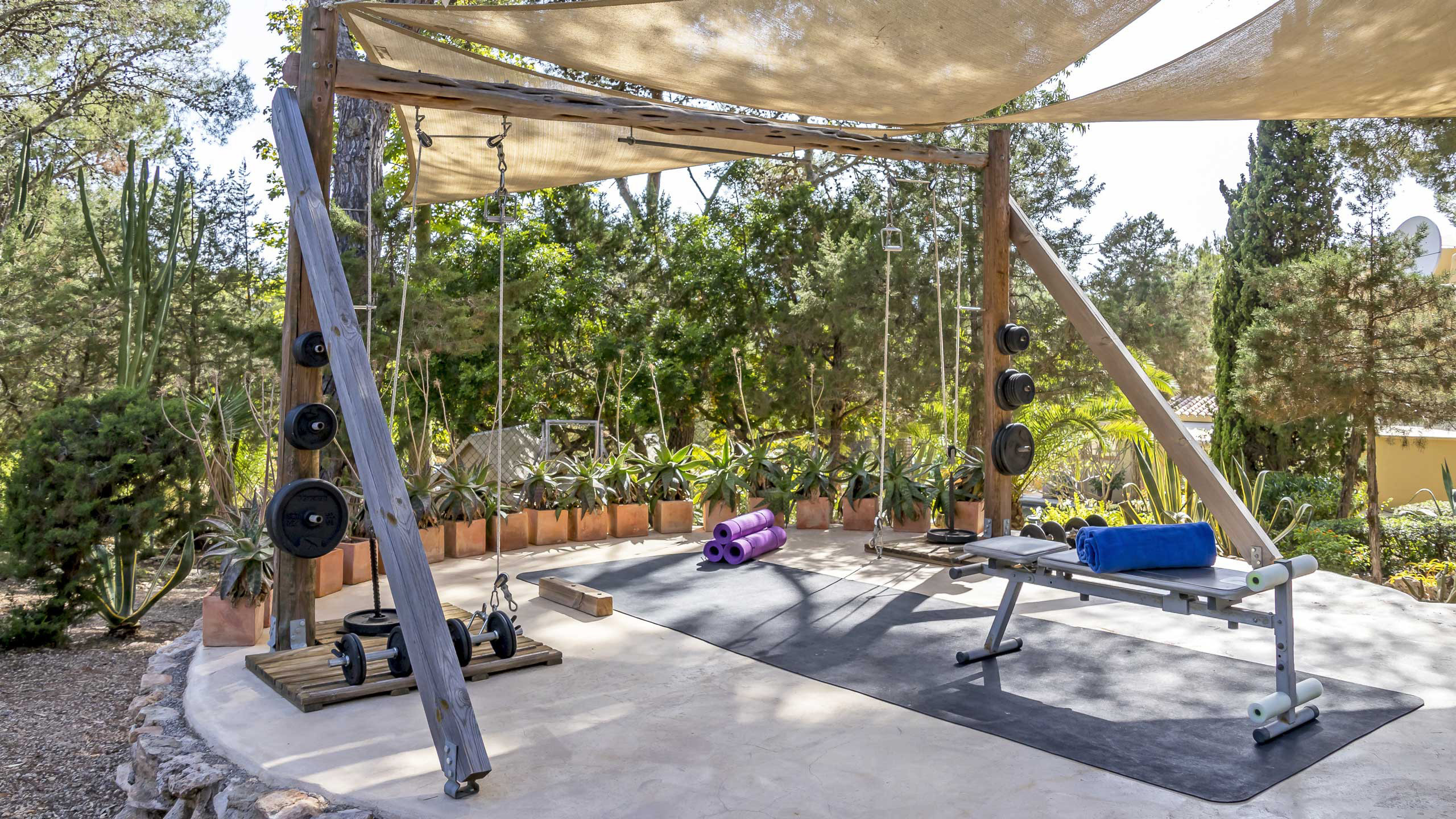 The interiors are warm and welcoming, the living room has eye-catching arches and deep-pile rugs, squishy sofas, and wicker swing chairs lined in sheepskin, all creating a sociable setting. The outside well equipped to entertain with chill-out and dining area, open-air gym, barbecue pit, canopied poolside and table tennis.
