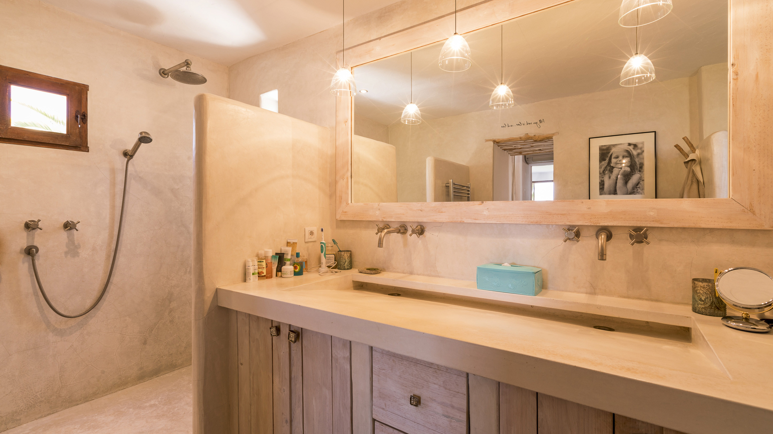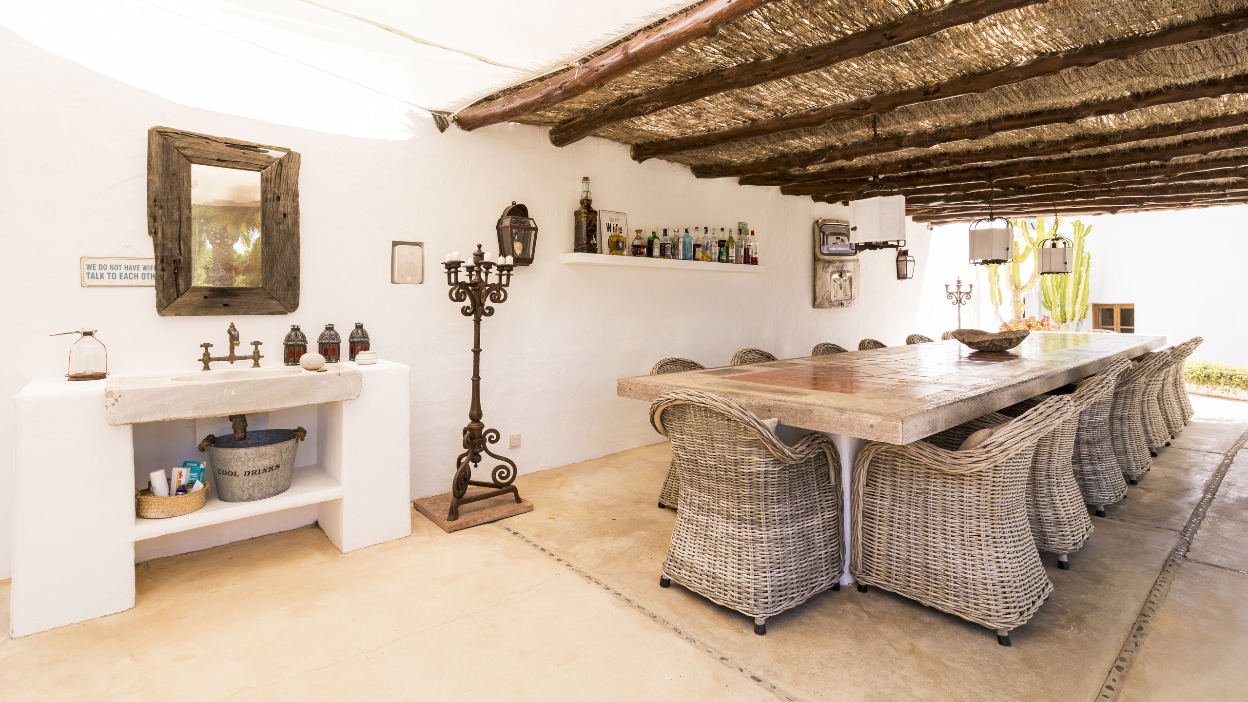 The original architecture of the finca has been fully preserved after the refined renovation work by a renowned designer, capturing the full magic and Ibiza-style essence. The property features two pools, one rectangular-shaped at the back and another irregularly shaped on the main terrace, equipped with umbrellas and sun loungers for guests' relaxation. It's accompanied by an inviting dining area with an outdoor kitchen and all the amenities to spend moments of pure relaxation while savoring some delicacies prepared by our chefs.