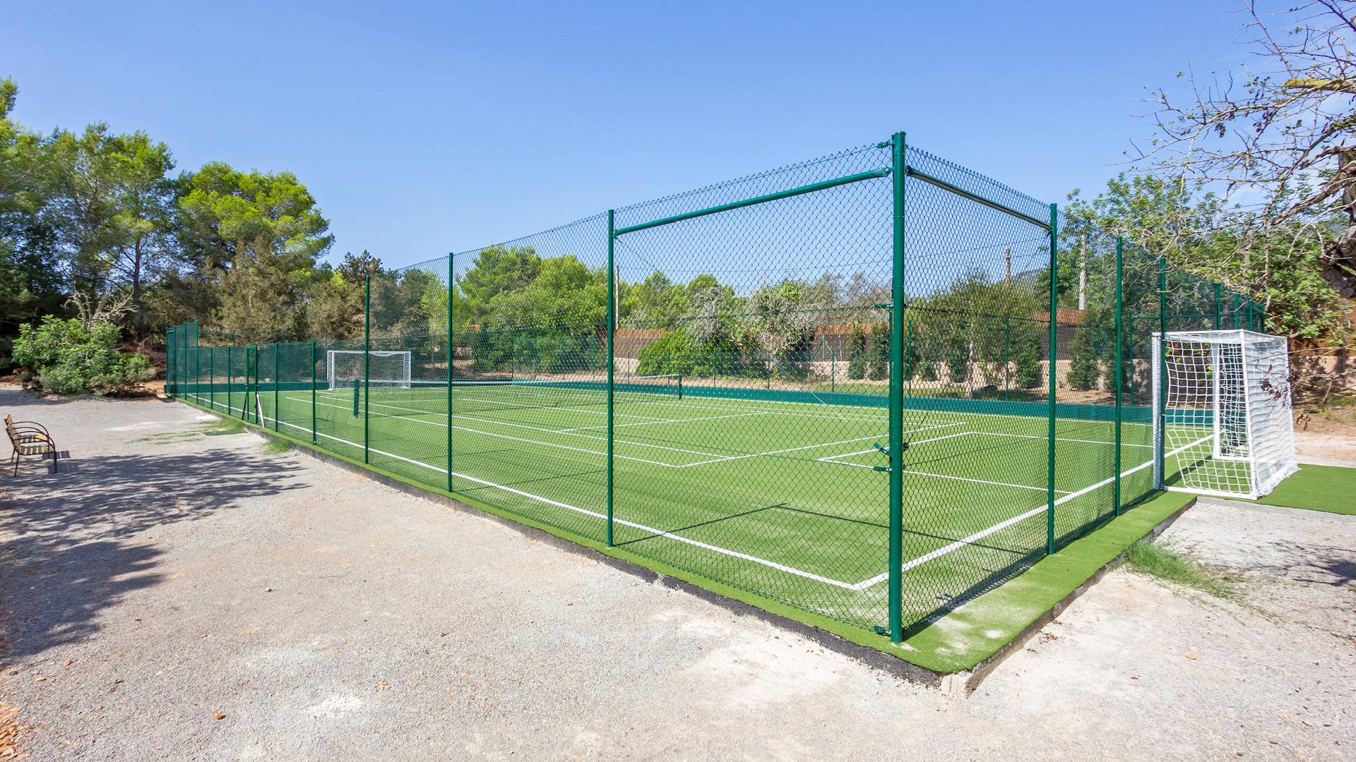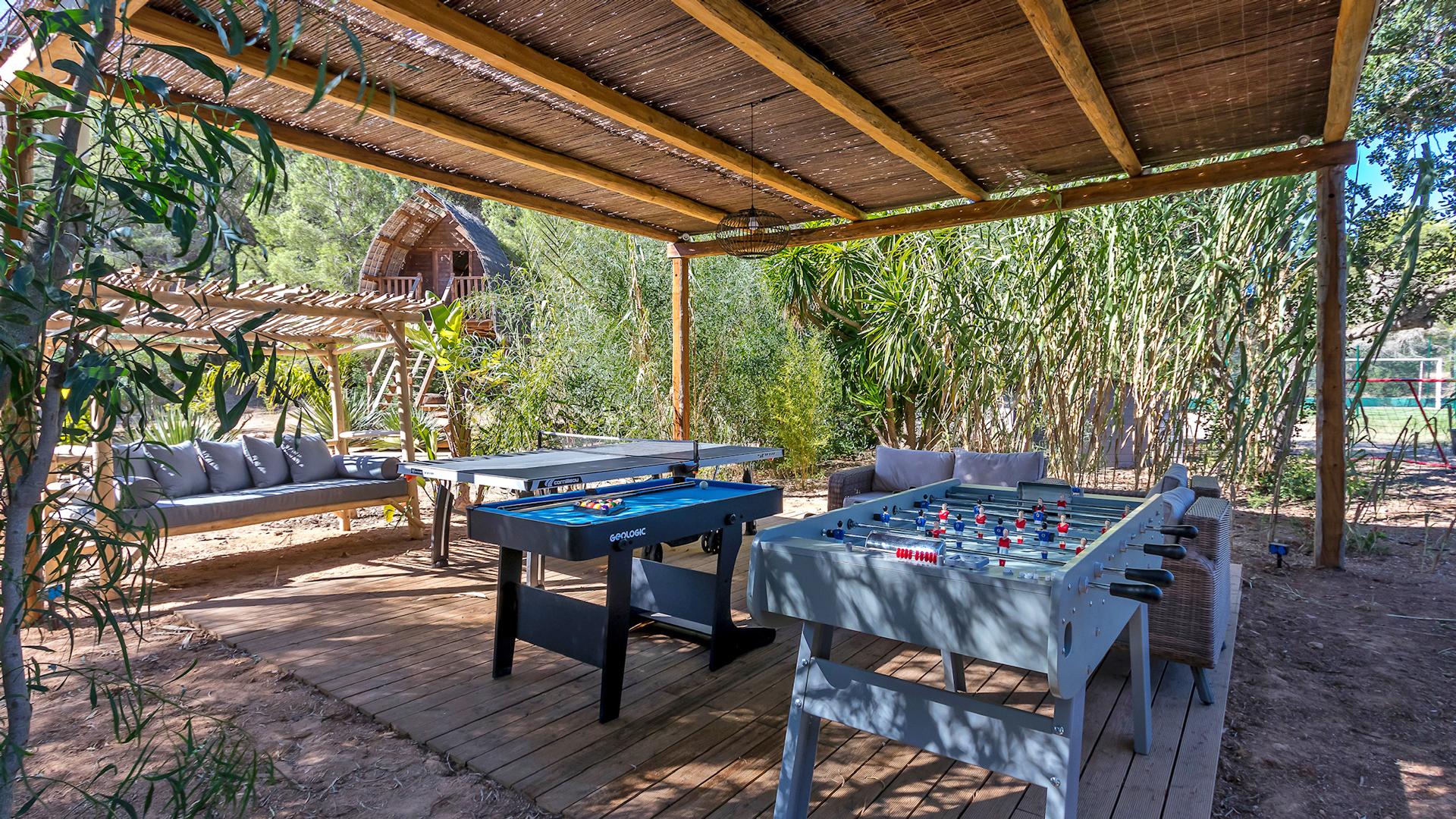 The outdoor area stretches over 10,000 square meters of lush gardens and perfectly manicured lawns, making it an ideal setting for younger guests, who can safely enjoy games like ping pong and foosball, along with a variety of other fun activities. Naturally, there's also a private swimming pool in front of the main building, which can be heated on request—perfect for those who prefer a warmer dip in the early morning or evening. The dining area is charming and inviting, shaded by tall trees—apparently simple, yet refined—serviced by an outdoor kitchen complete with a BBQ and oven. Additional guest amenities include a private tennis court, ideal for anyone wanting to stay active while on holiday.