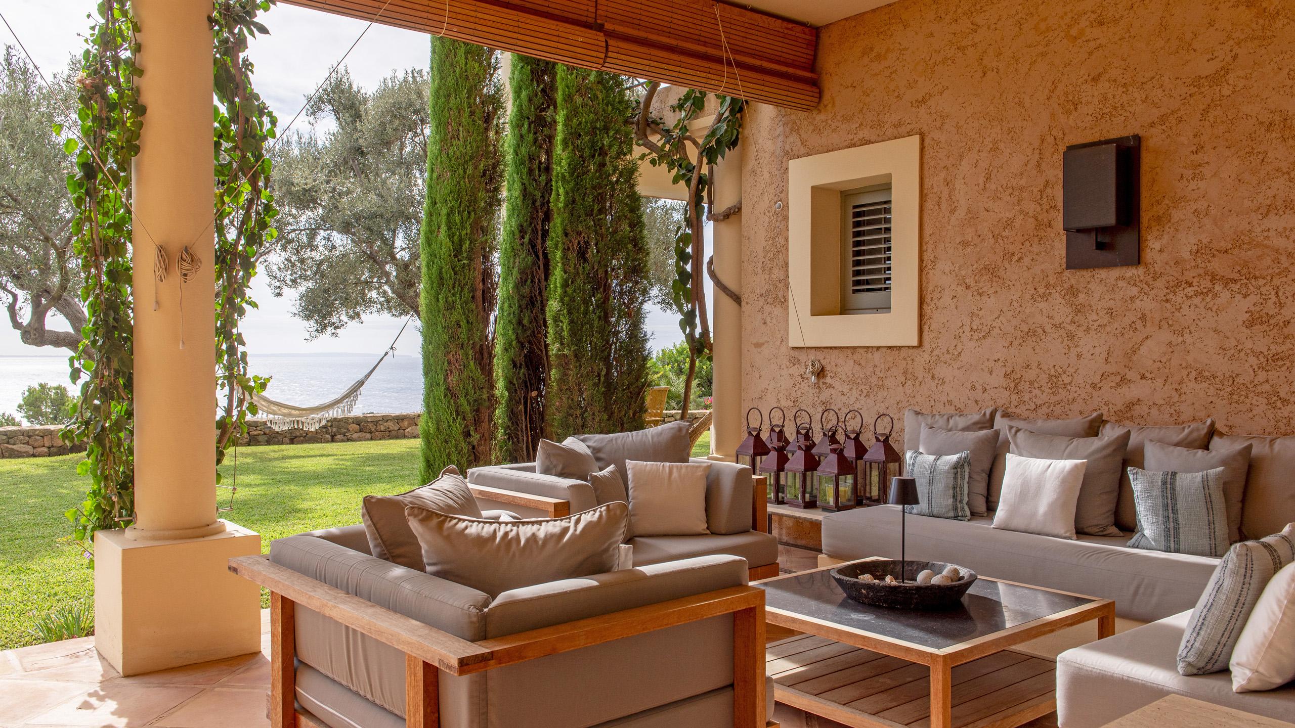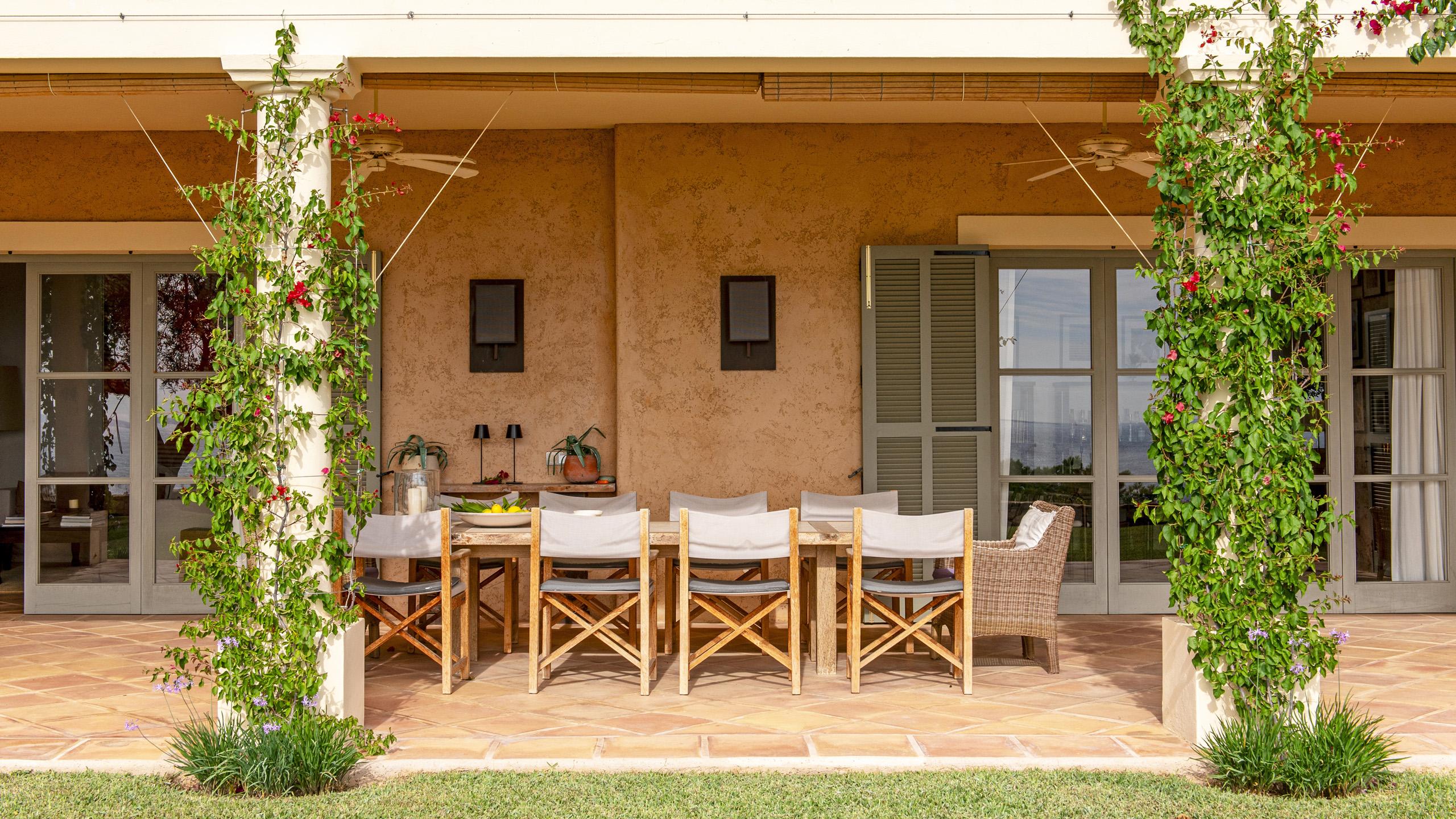 A well-kept lawn stretches out across the entire front of the property with a the private pool cleverly places in a slightly distant, lateral position for utmost privacy and independence for guests who prefer to take a dip with interacting with the common areas. The outdoor dining area and lounge spots are all perfectly shaded under the front arcade that bears typical traits of the French Riviera and Tuscany.