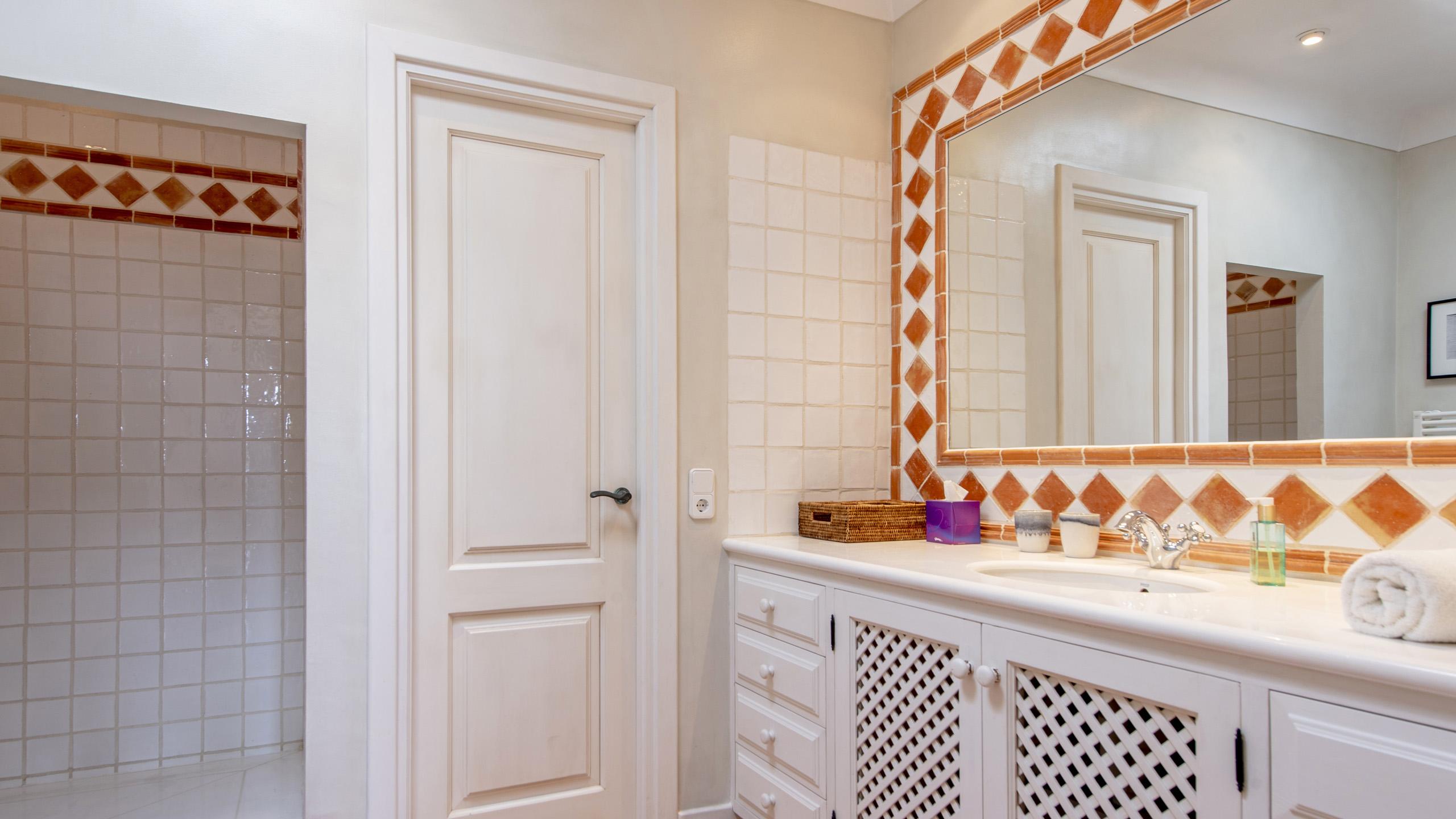 The interior spaces of Petale De Rose are a continuation of the theme seen outdoors, characterised by warm colors and a welcoming atmosphere throughout with an elegant, refined vibe. The bedrooms are evenly divided between the two levels of the property though the spacious master suite takes up most of the upper floor.