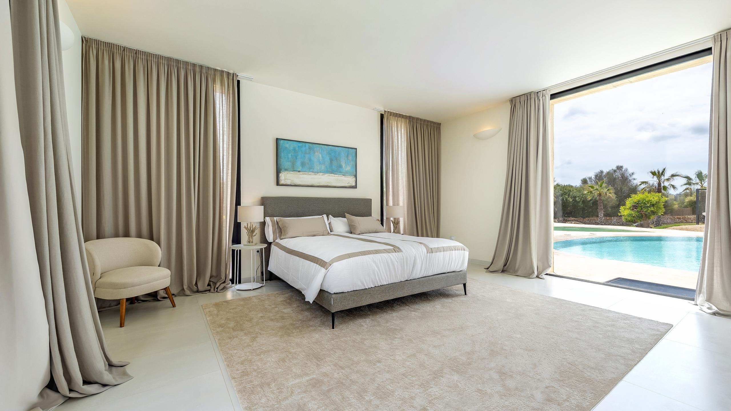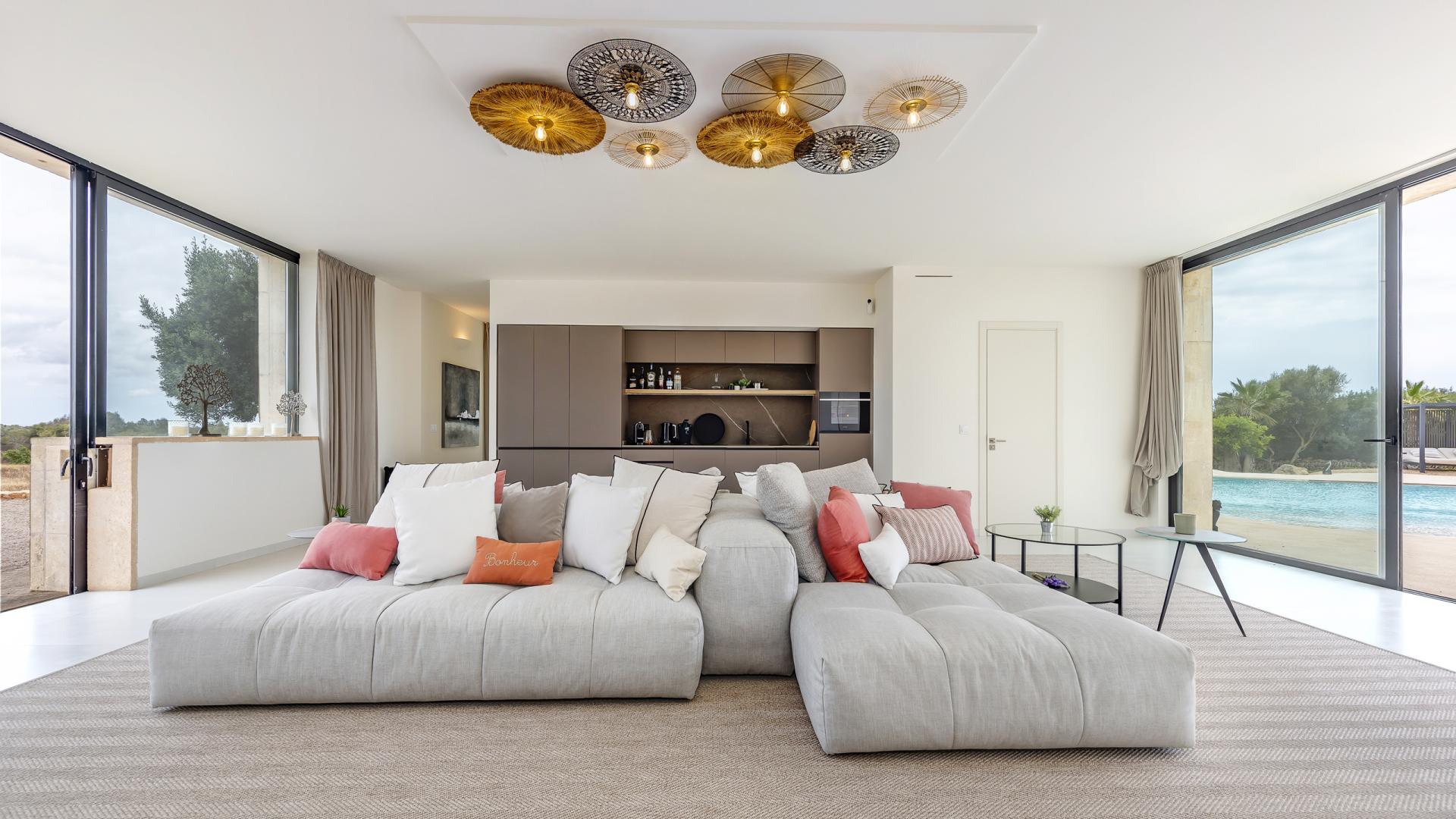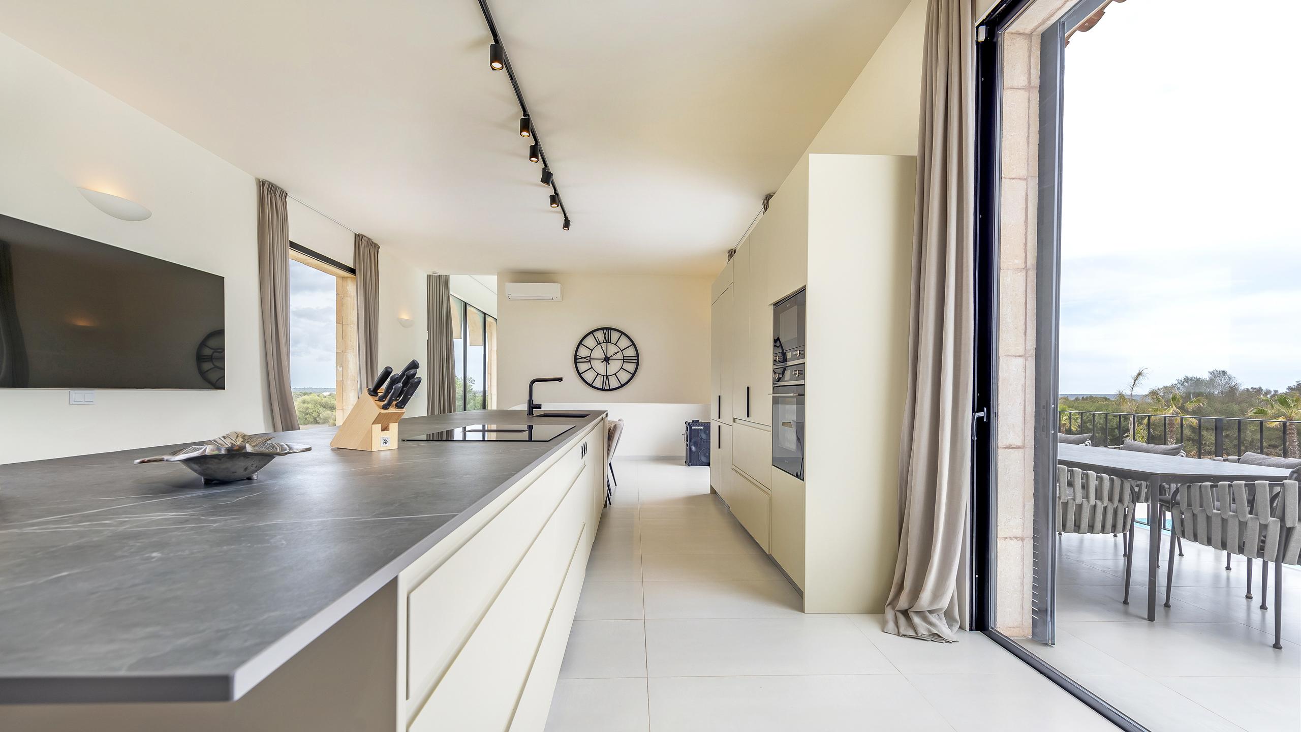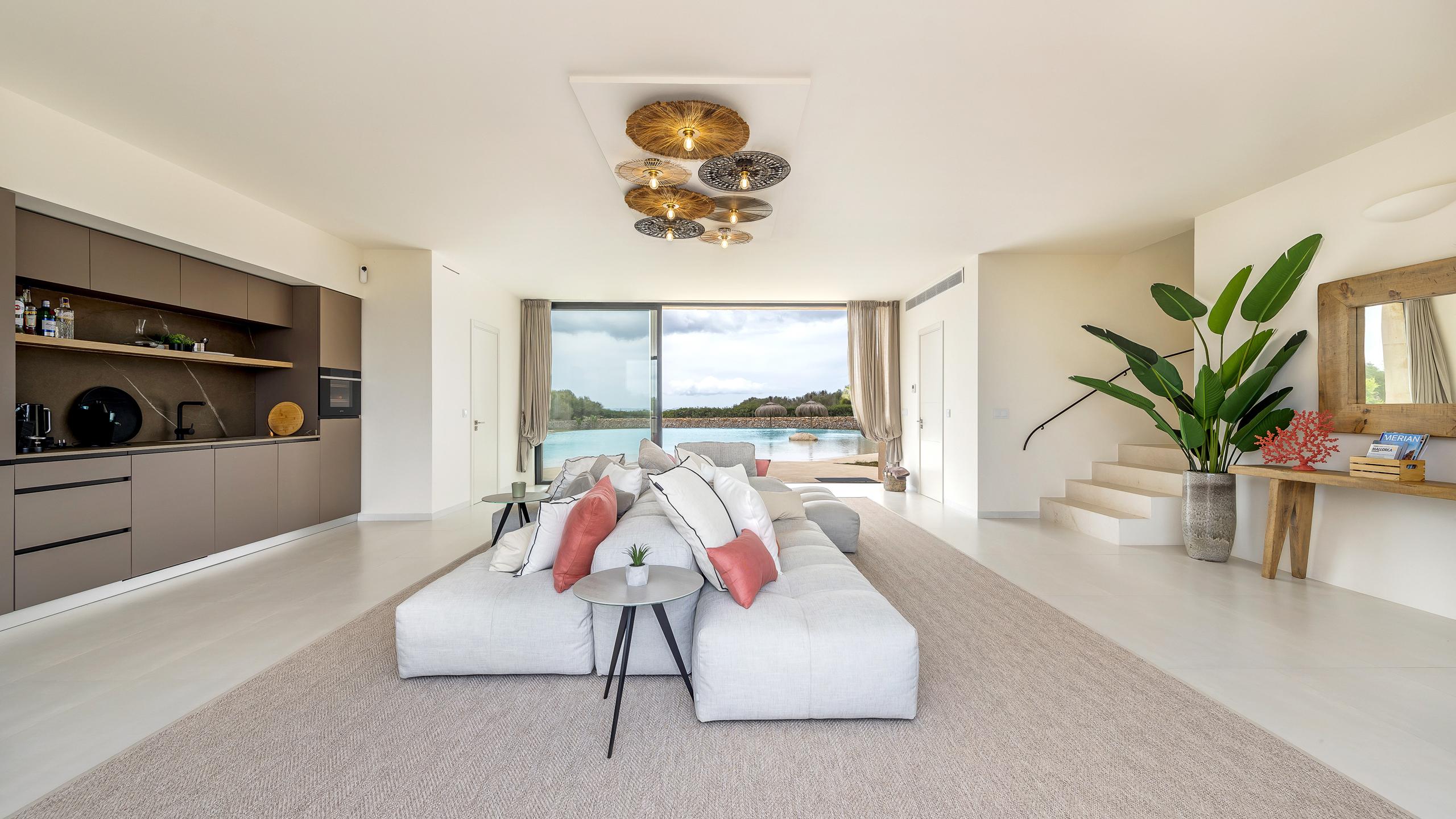A marble staircase connects to the upper floor, where a second fully equipped SMEG kitchen opens onto a terrace with dining for ten and panoramic views of the pool and the island of Cabrera. The villa offers five double bedrooms with en-suite bathrooms, Poliform wardrobes, safes and smart TVs, plus a fully equipped gym in the basement.