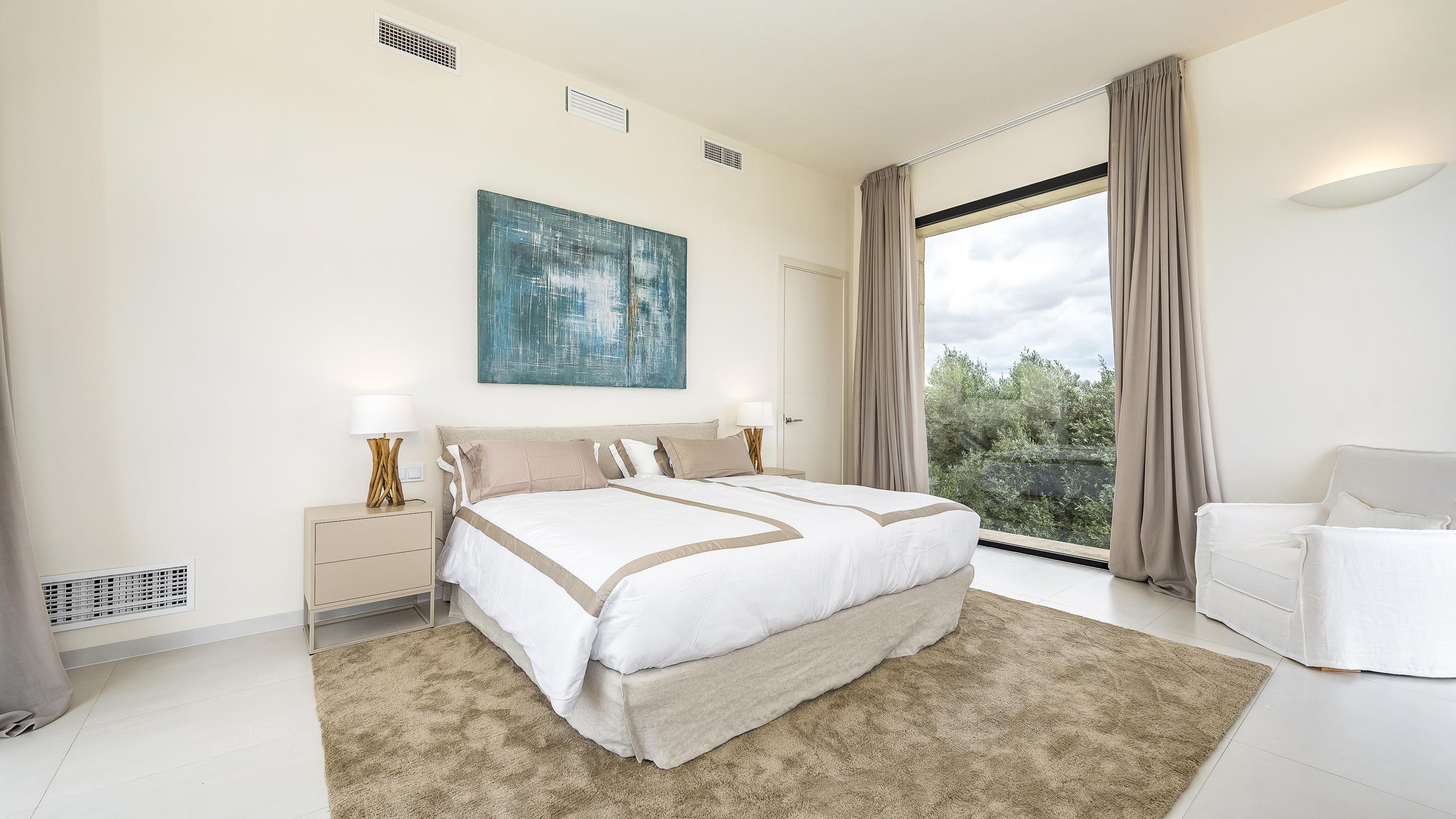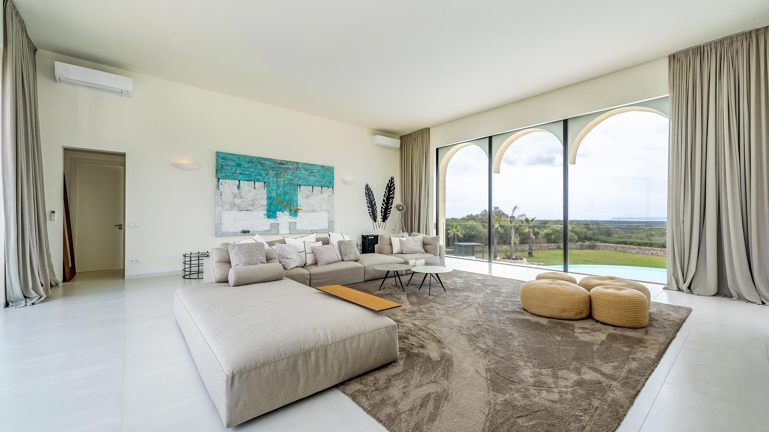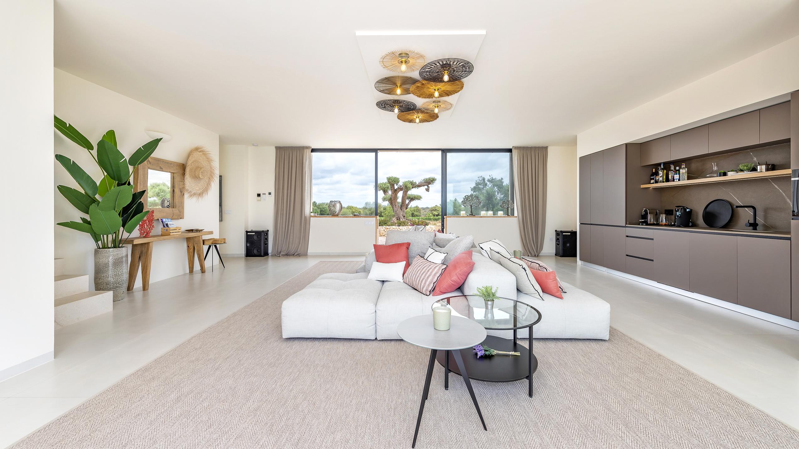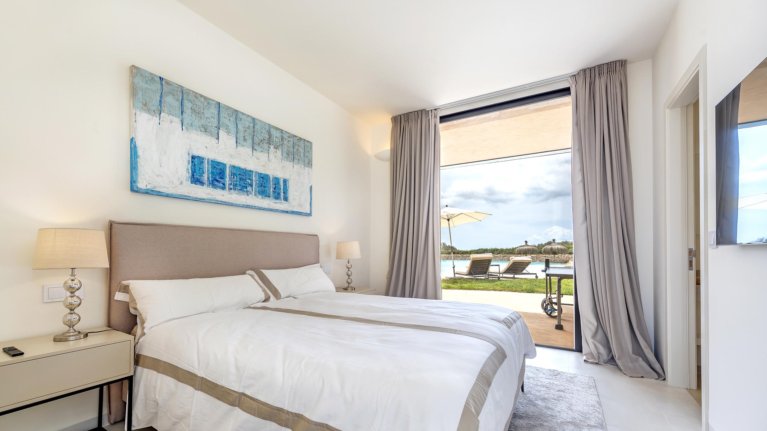 A marble staircase connects to the upper floor, where a second fully equipped SMEG kitchen opens onto a terrace with dining for ten and panoramic views of the pool and the island of Cabrera. The villa offers five double bedrooms with en-suite bathrooms, Poliform wardrobes, safes and smart TVs, plus a fully equipped gym in the basement.