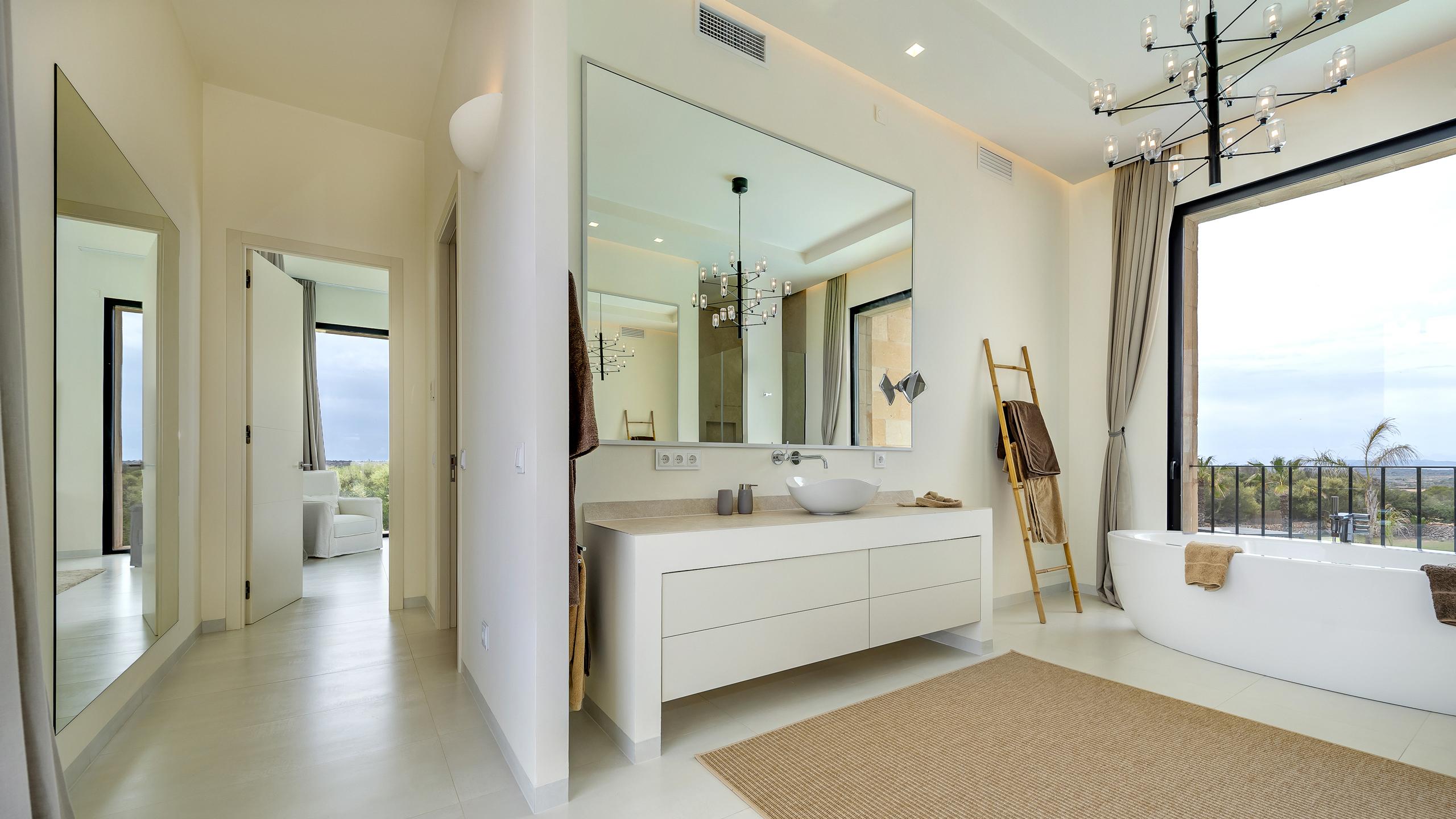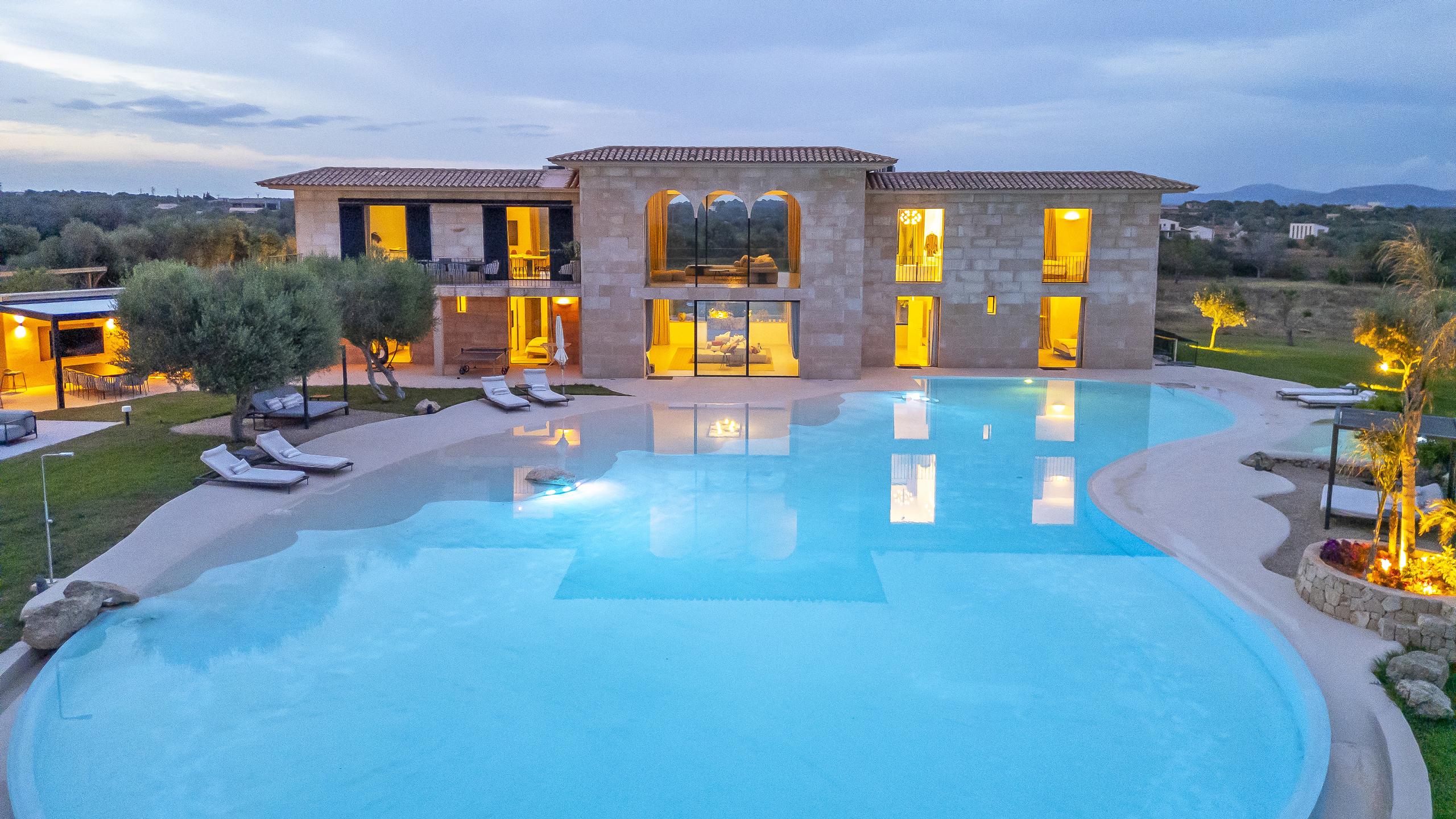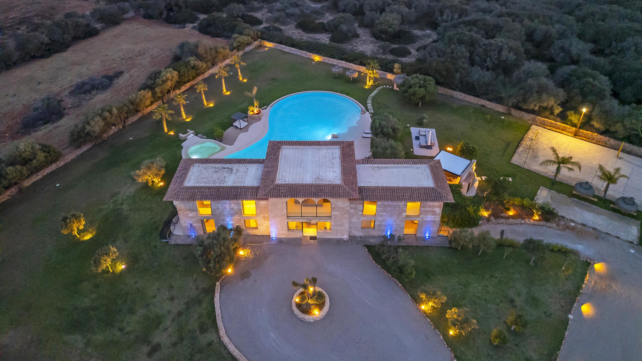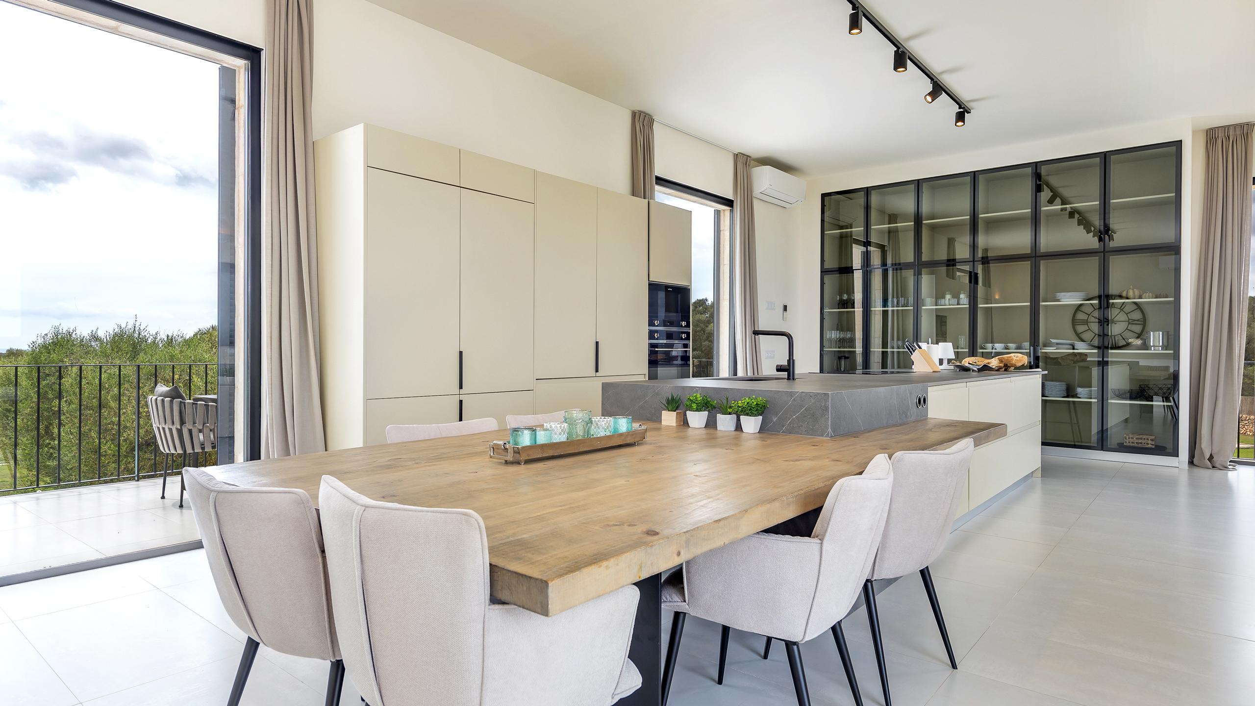 A marble staircase connects to the upper floor, where a second fully equipped SMEG kitchen opens onto a terrace with dining for ten and panoramic views of the pool and the island of Cabrera. The villa offers five double bedrooms with en-suite bathrooms, Poliform wardrobes, safes and smart TVs, plus a fully equipped gym in the basement.