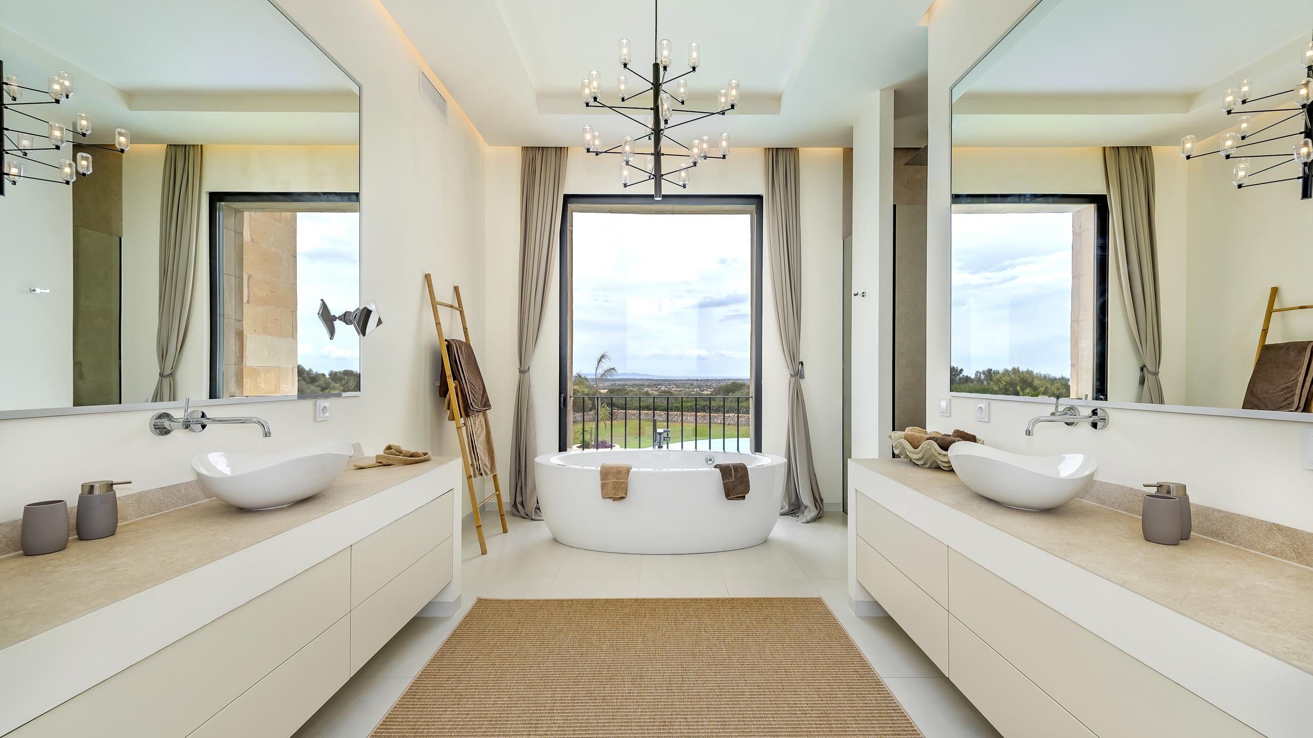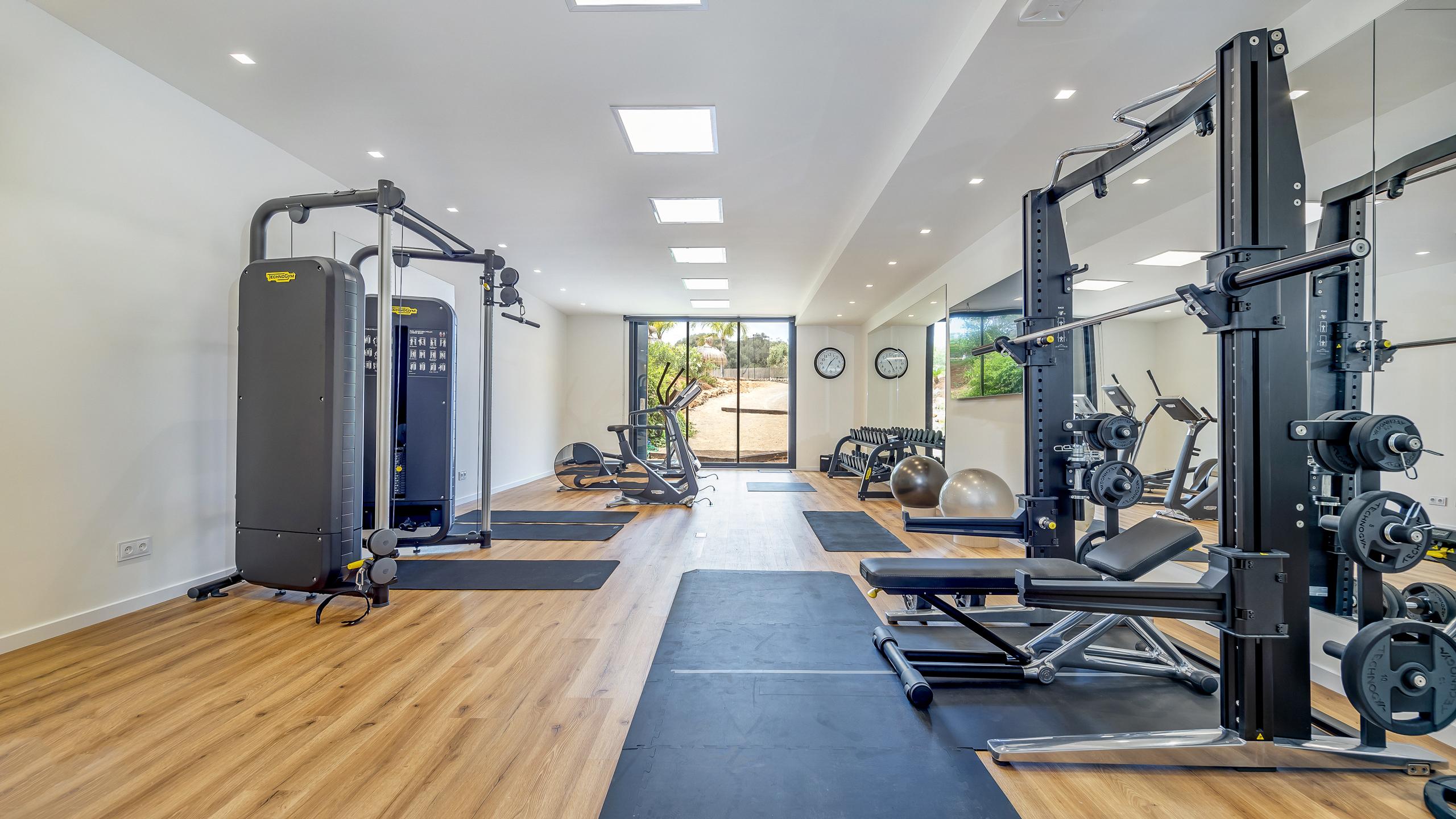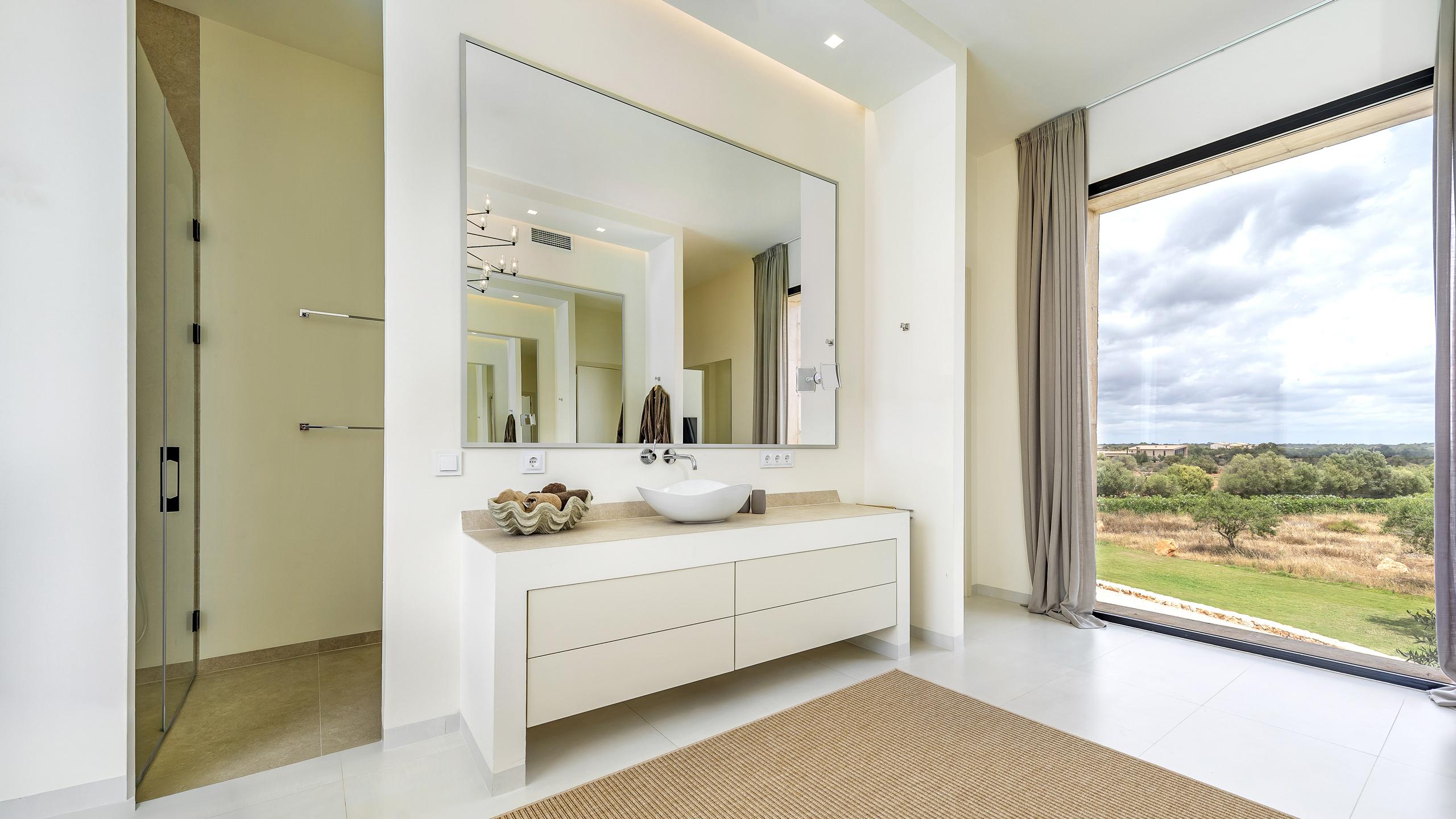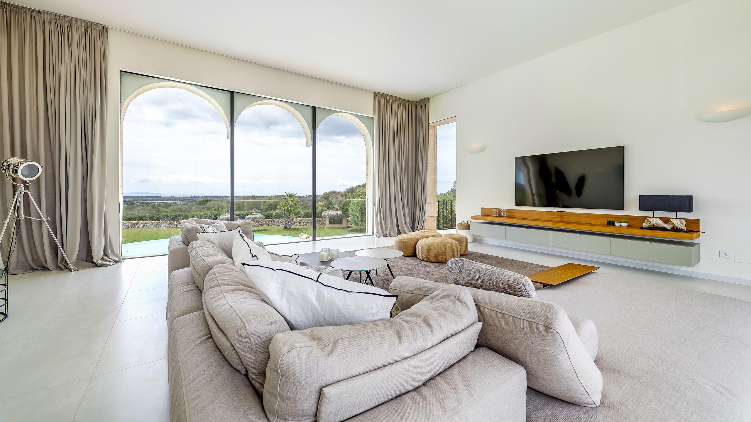A marble staircase connects to the upper floor, where a second fully equipped SMEG kitchen opens onto a terrace with dining for ten and panoramic views of the pool and the island of Cabrera. The villa offers five double bedrooms with en-suite bathrooms, Poliform wardrobes, safes and smart TVs, plus a fully equipped gym in the basement.