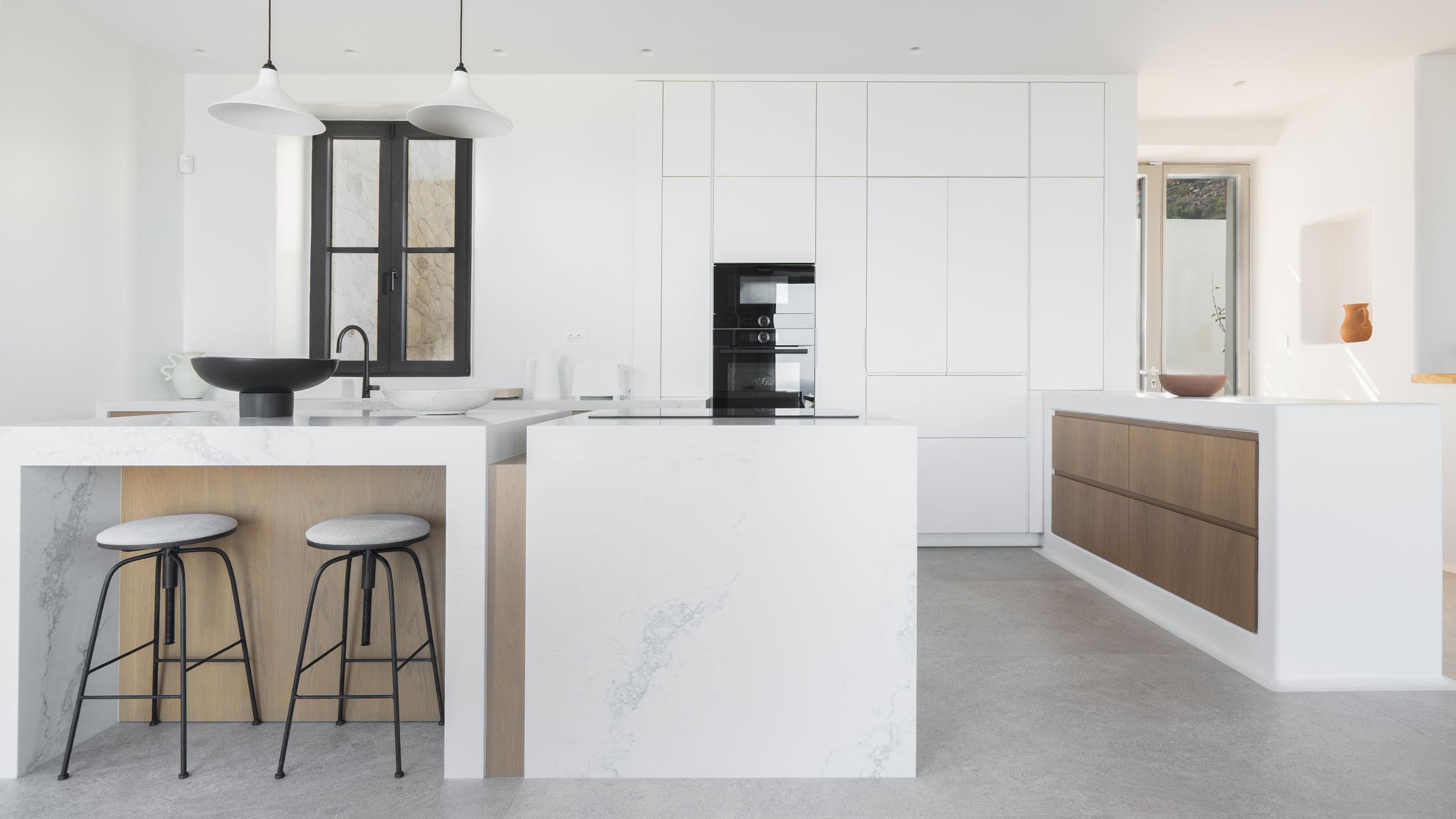 The sprawling 250 sqm interior features three elegant bedrooms and a dedicated media room, comfortably accommodating up to six guests across three refined levels. The entrance level serves as the heart of the home with a luxury kitchen and sea-view suites, while the upper level is dedicated entirely to an extra-large master sanctuary with a private terrace. For those balancing leisure with productivity, the lower level offers a fully equipped office for remote work, a home cinema, and a serene yoga space.