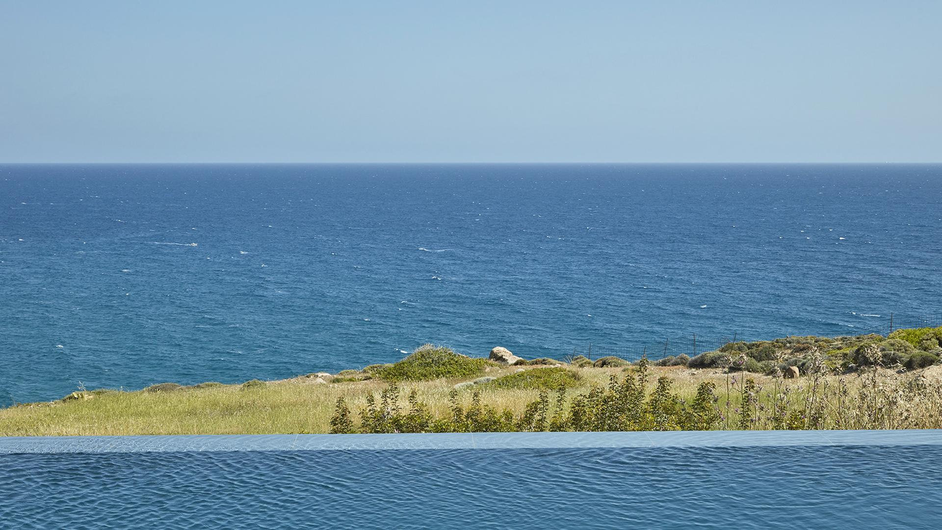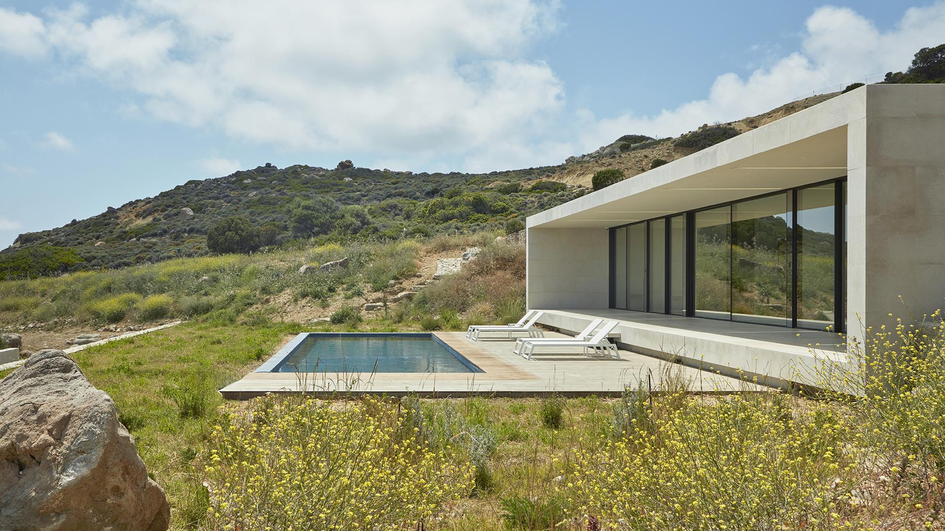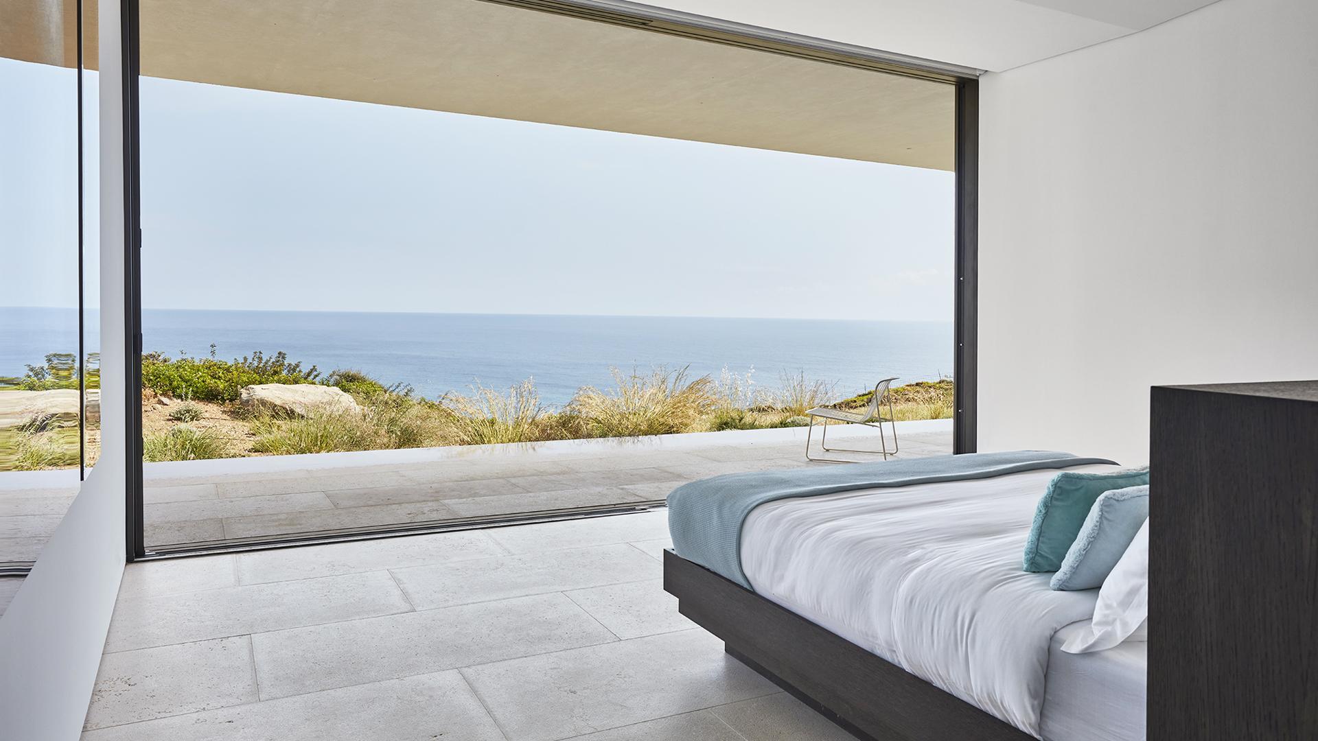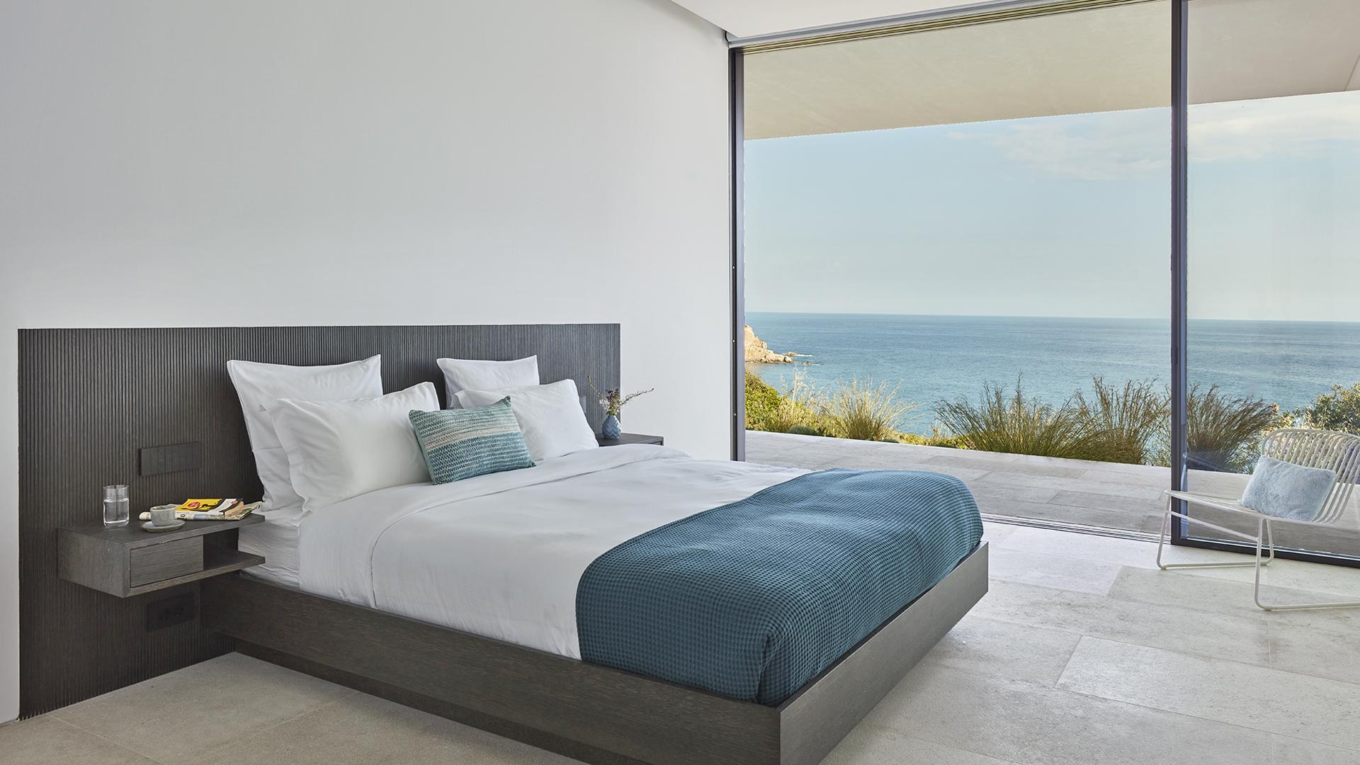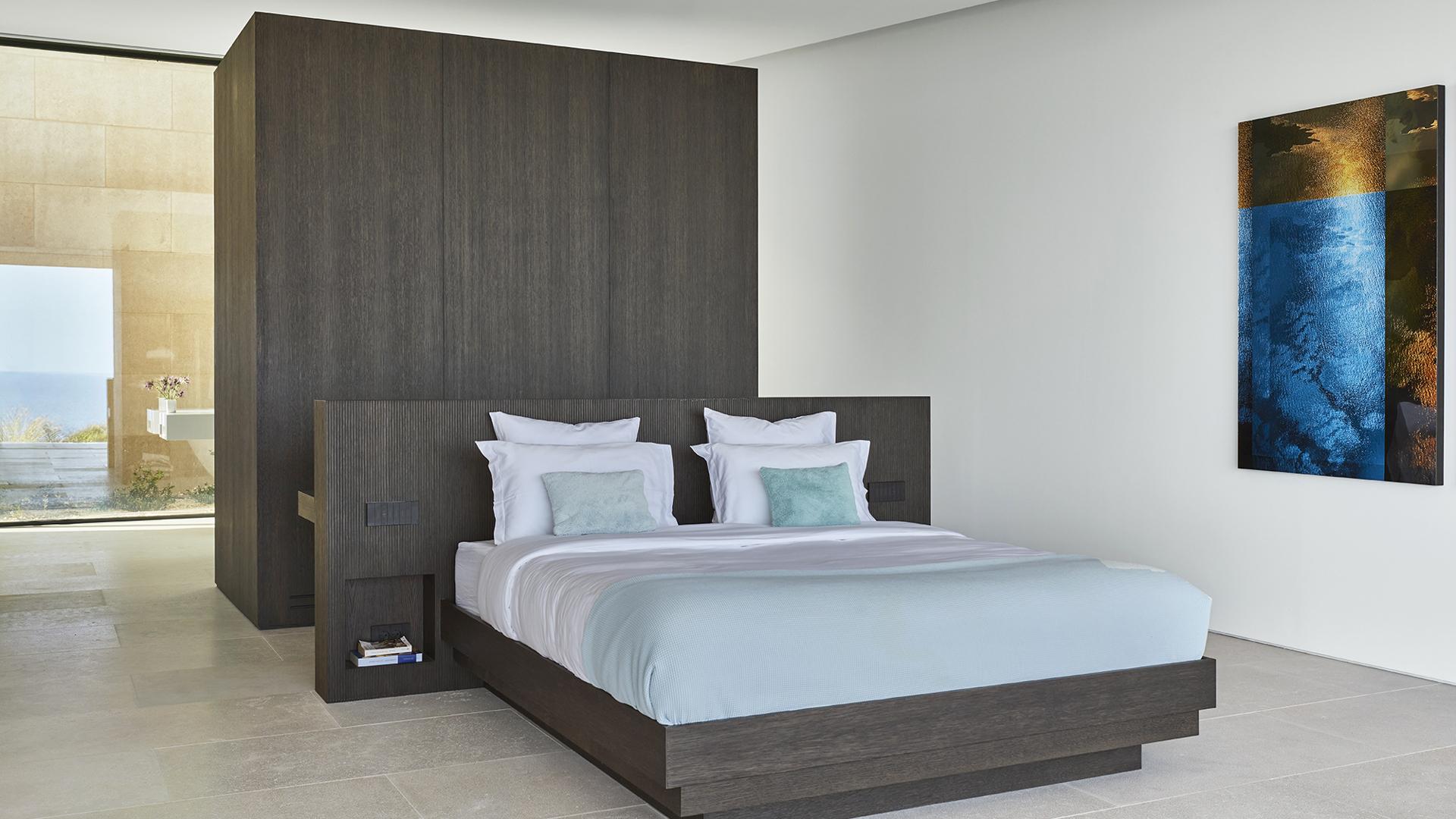 Designed as two independent villas carved into the landscape, the property features bioclimatic architecture in perfect harmony with nature. The main villa offers four elegant bedrooms and a private pool, while the guest villa mirrors this with four additional bedrooms and its own pool. Minimalist interiors frame breathtaking sea views, creating a calming atmosphere where luxury feels effortless.