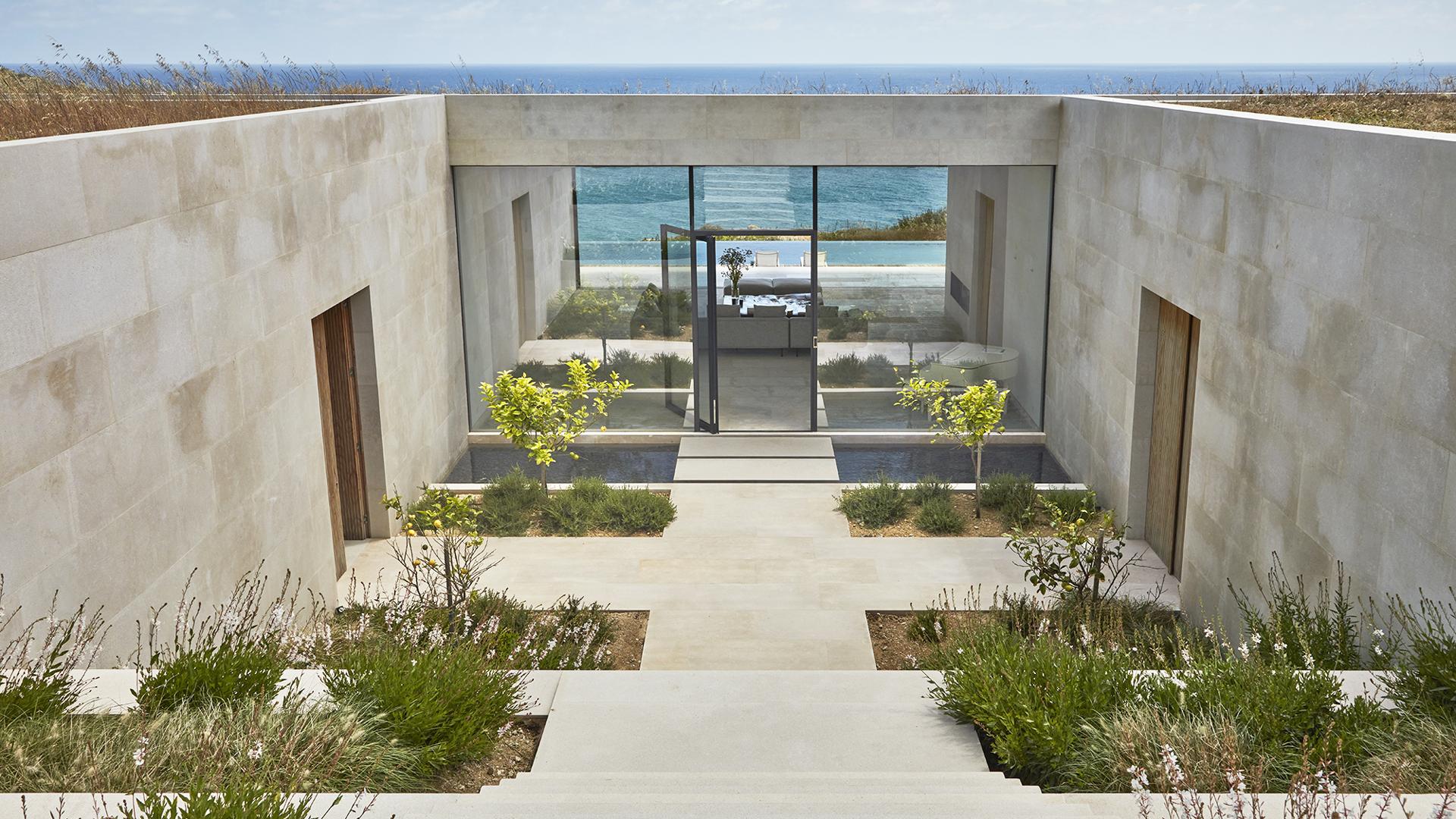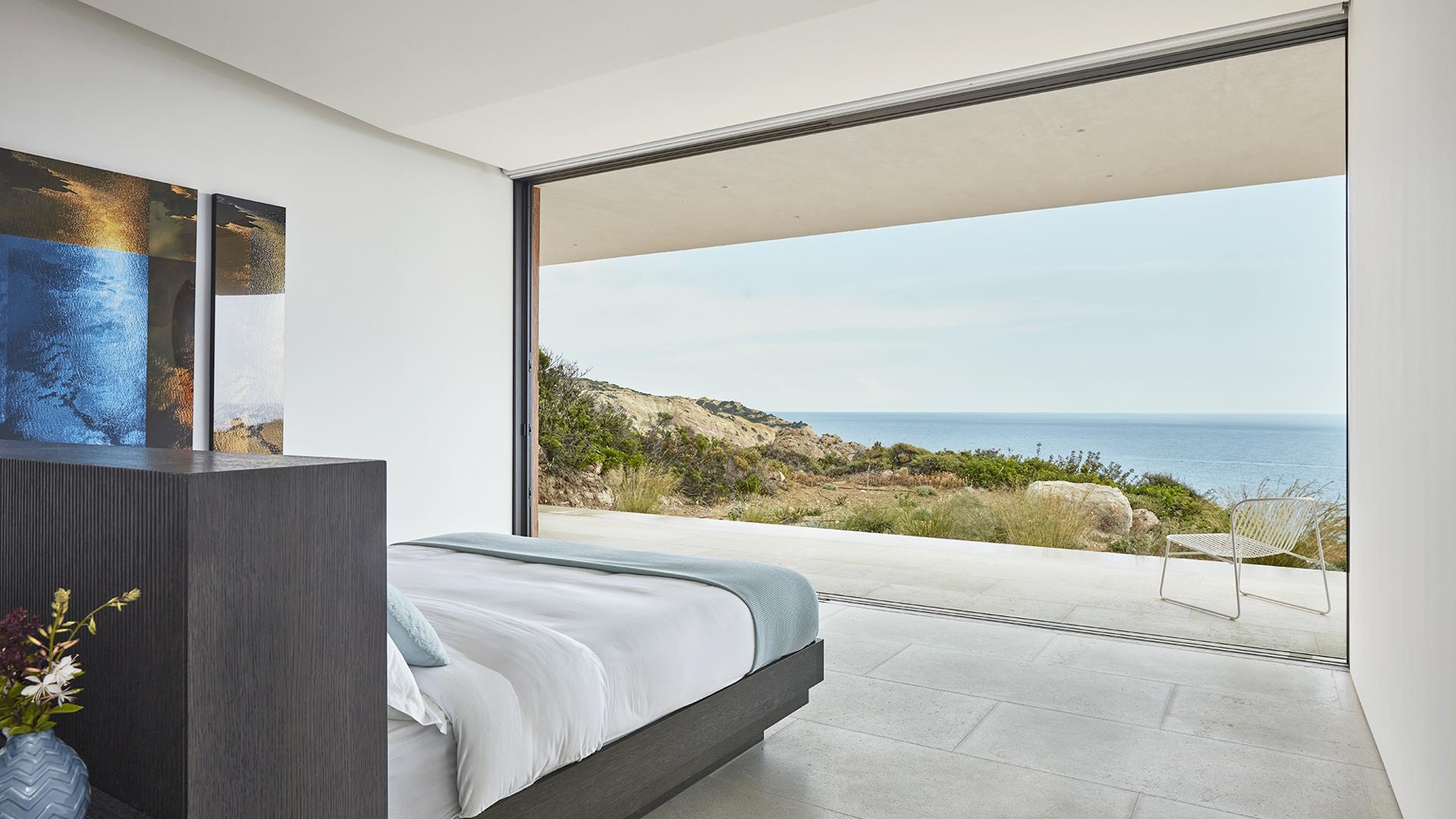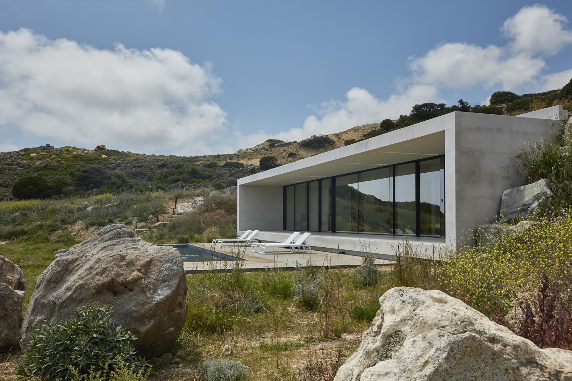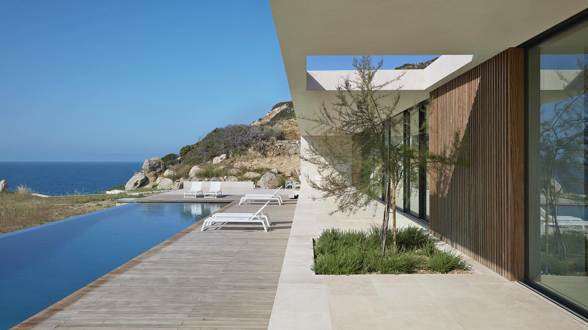 Designed as two independent villas carved into the landscape, the property features bioclimatic architecture in perfect harmony with nature. The main villa offers four elegant bedrooms and a private pool, while the guest villa mirrors this with four additional bedrooms and its own pool. Minimalist interiors frame breathtaking sea views, creating a calming atmosphere where luxury feels effortless.