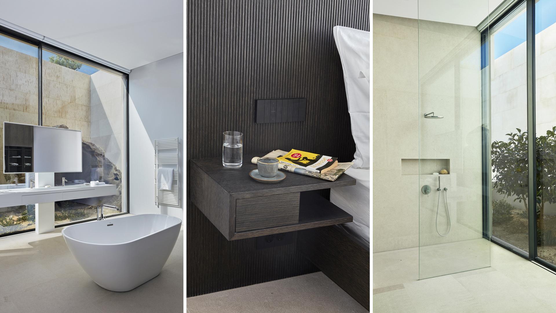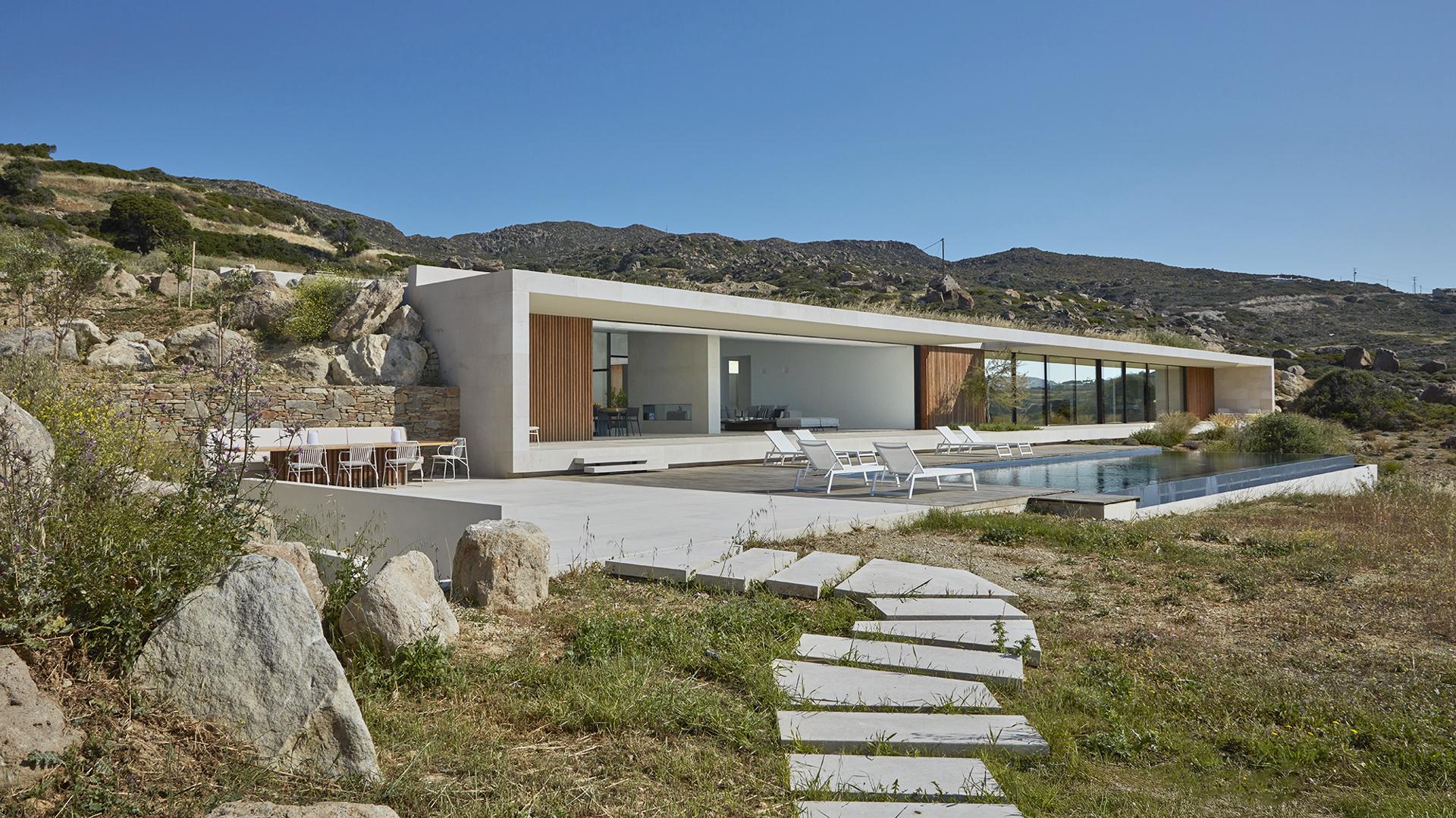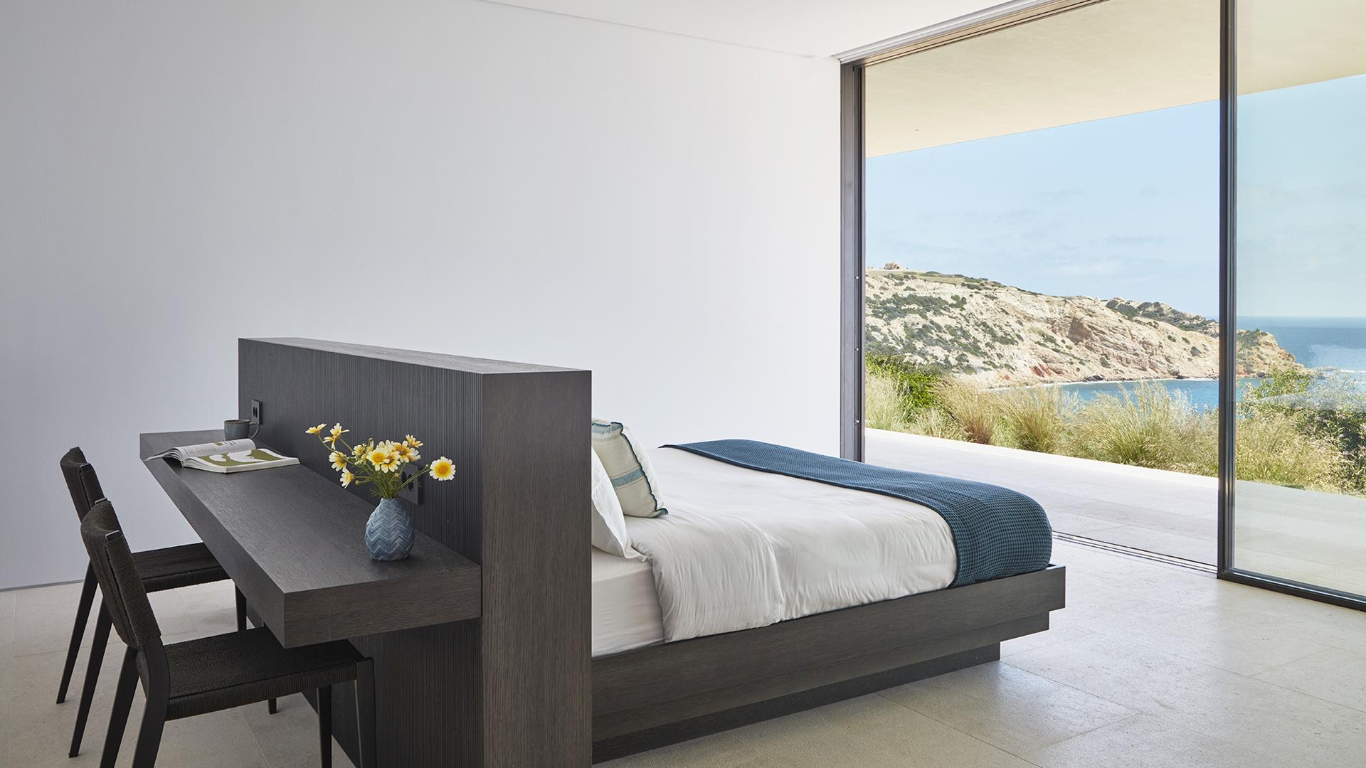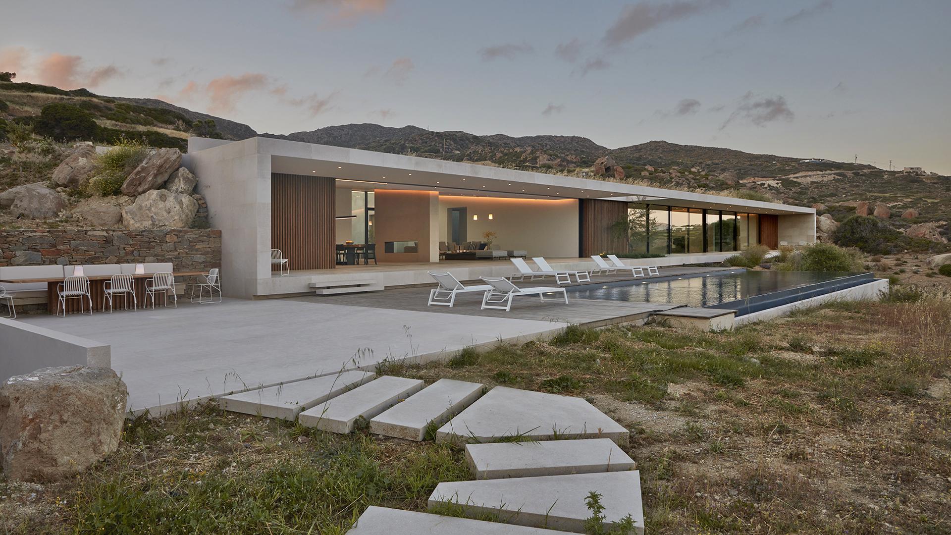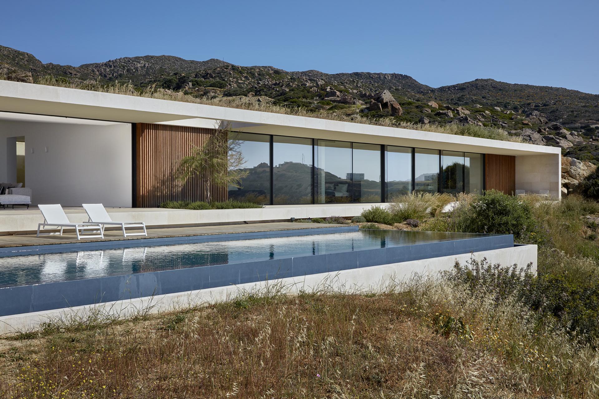Designed as two independent villas carved into the landscape, the property features bioclimatic architecture in perfect harmony with nature. The main villa offers four elegant bedrooms and a private pool, while the guest villa mirrors this with four additional bedrooms and its own pool. Minimalist interiors frame breathtaking sea views, creating a calming atmosphere where luxury feels effortless.