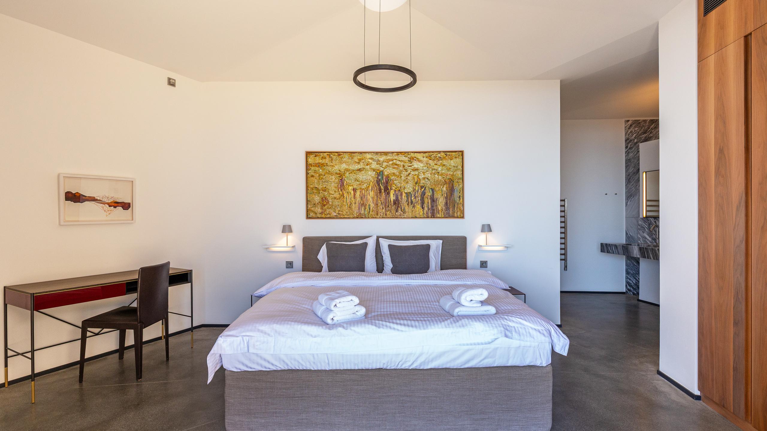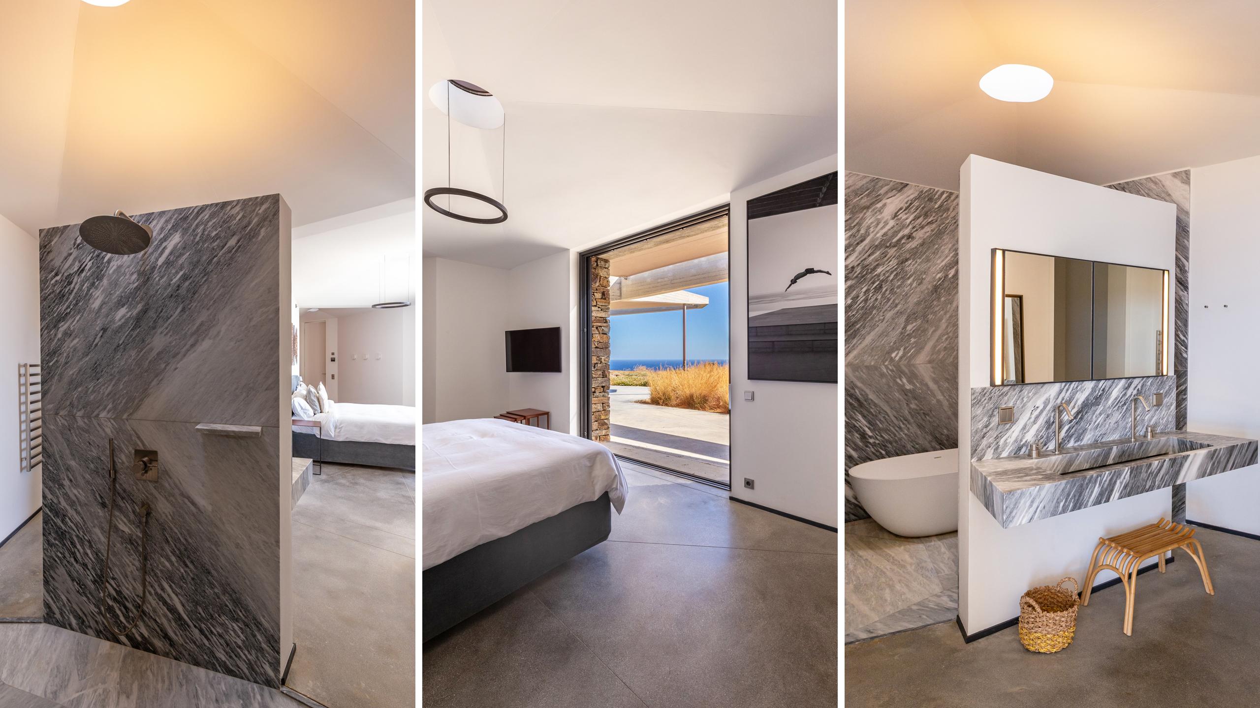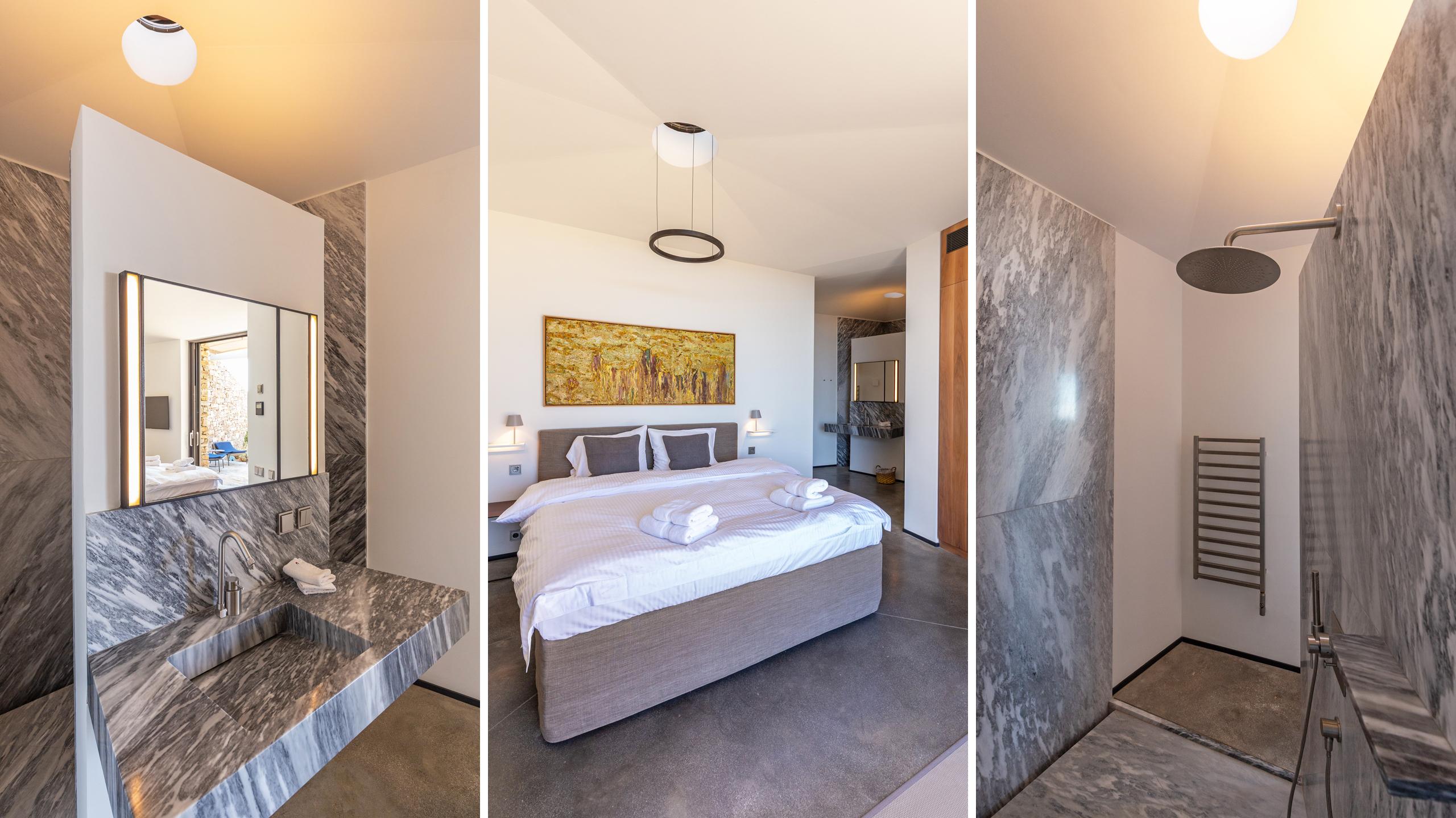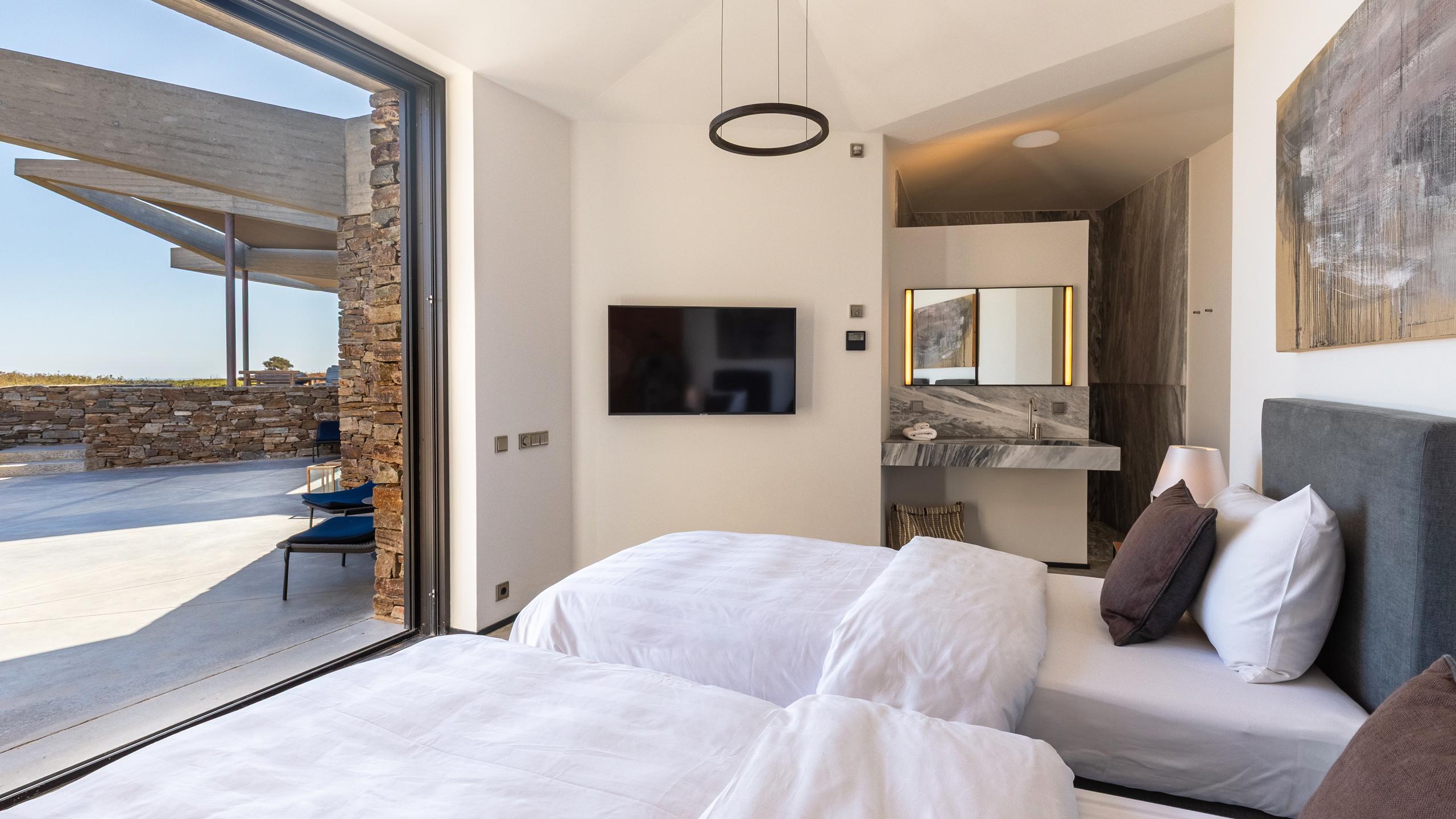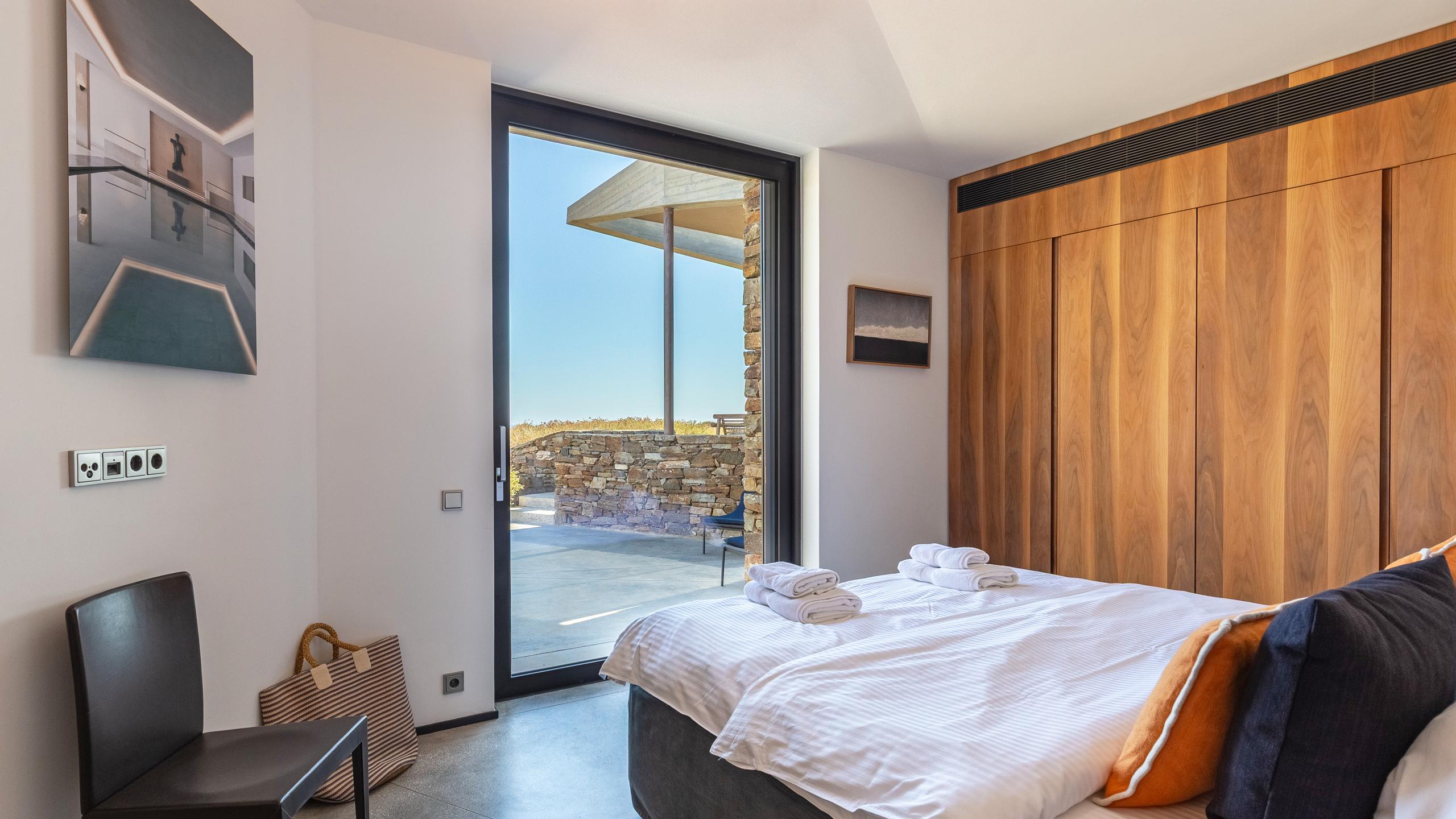 Inside, the aesthetic continues with refined precision. Smooth concrete surfaces, sculptural furniture, and bespoke lighting define an interior of uncompromising style. The living areas open effortlessly to the outdoors, creating a fluid continuity of space. Each bedroom is a private retreat, equipped with the highest comfort standards and curated design details, offering both seclusion and sophistication.