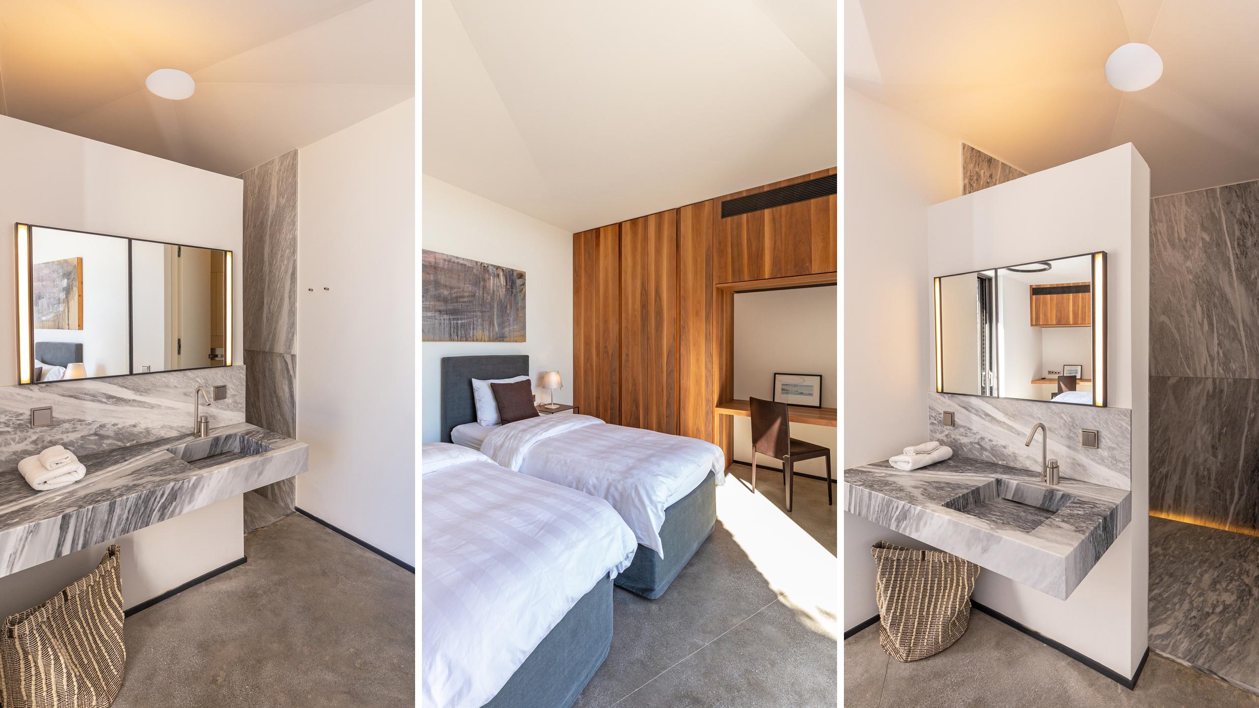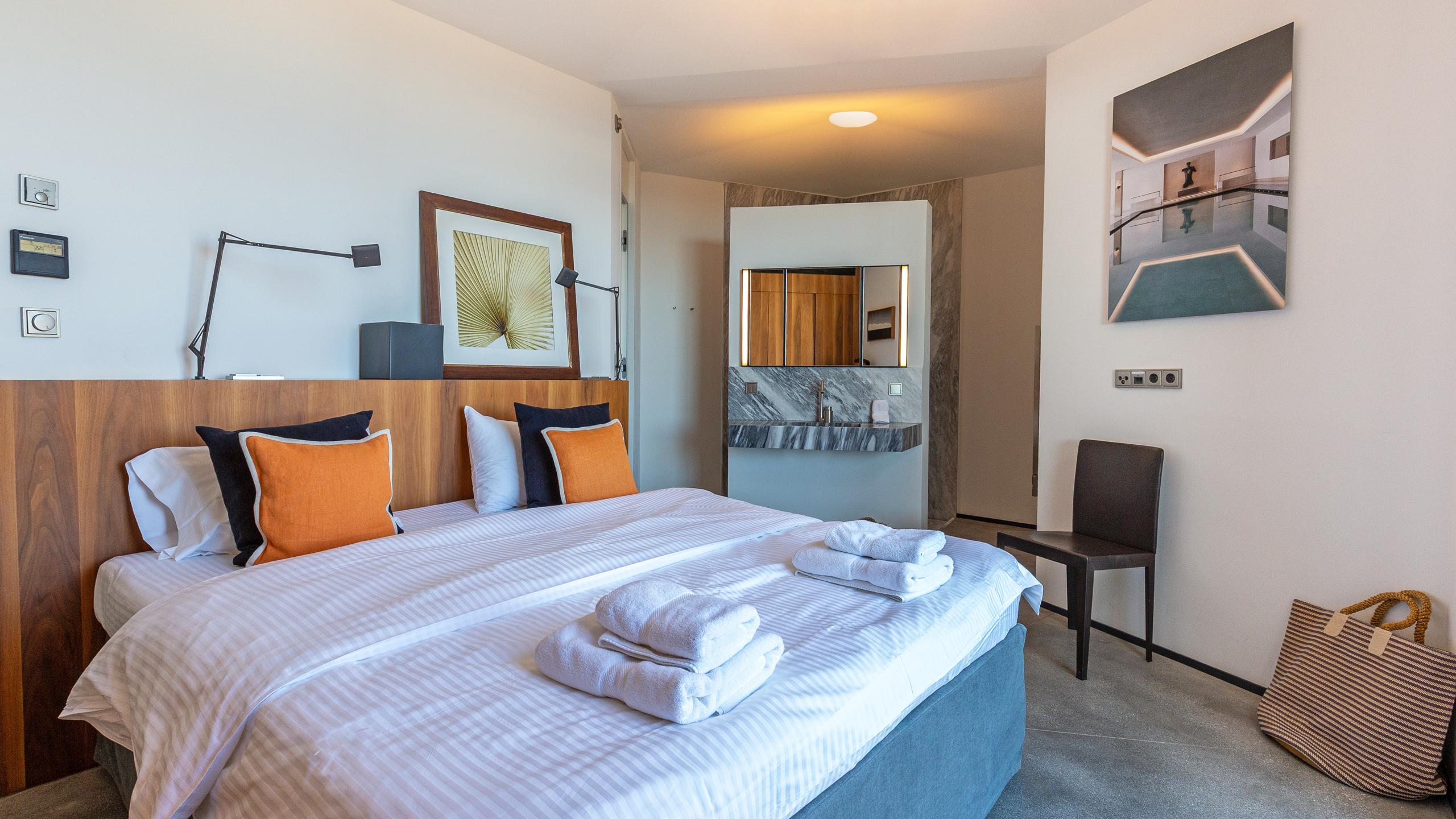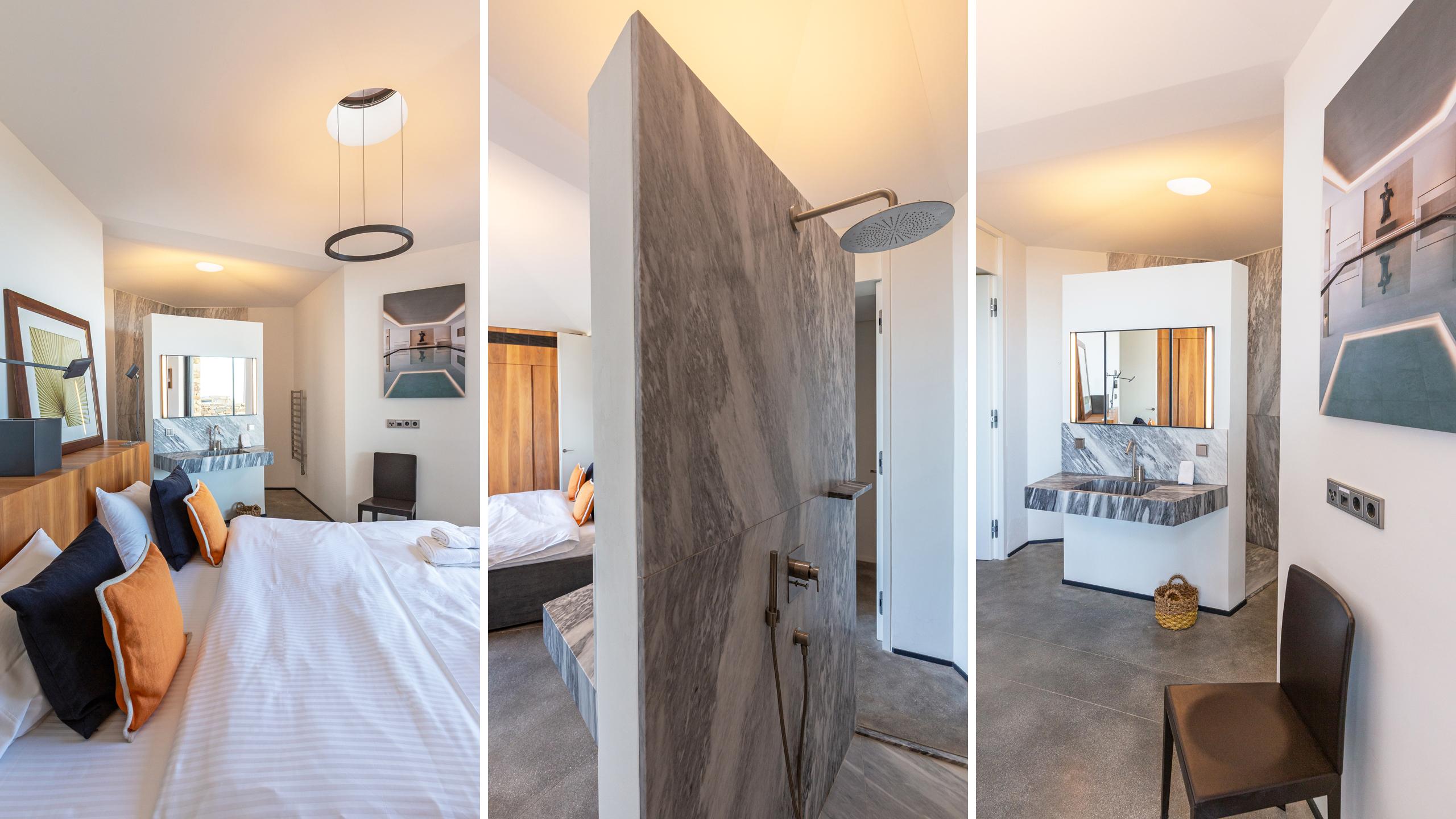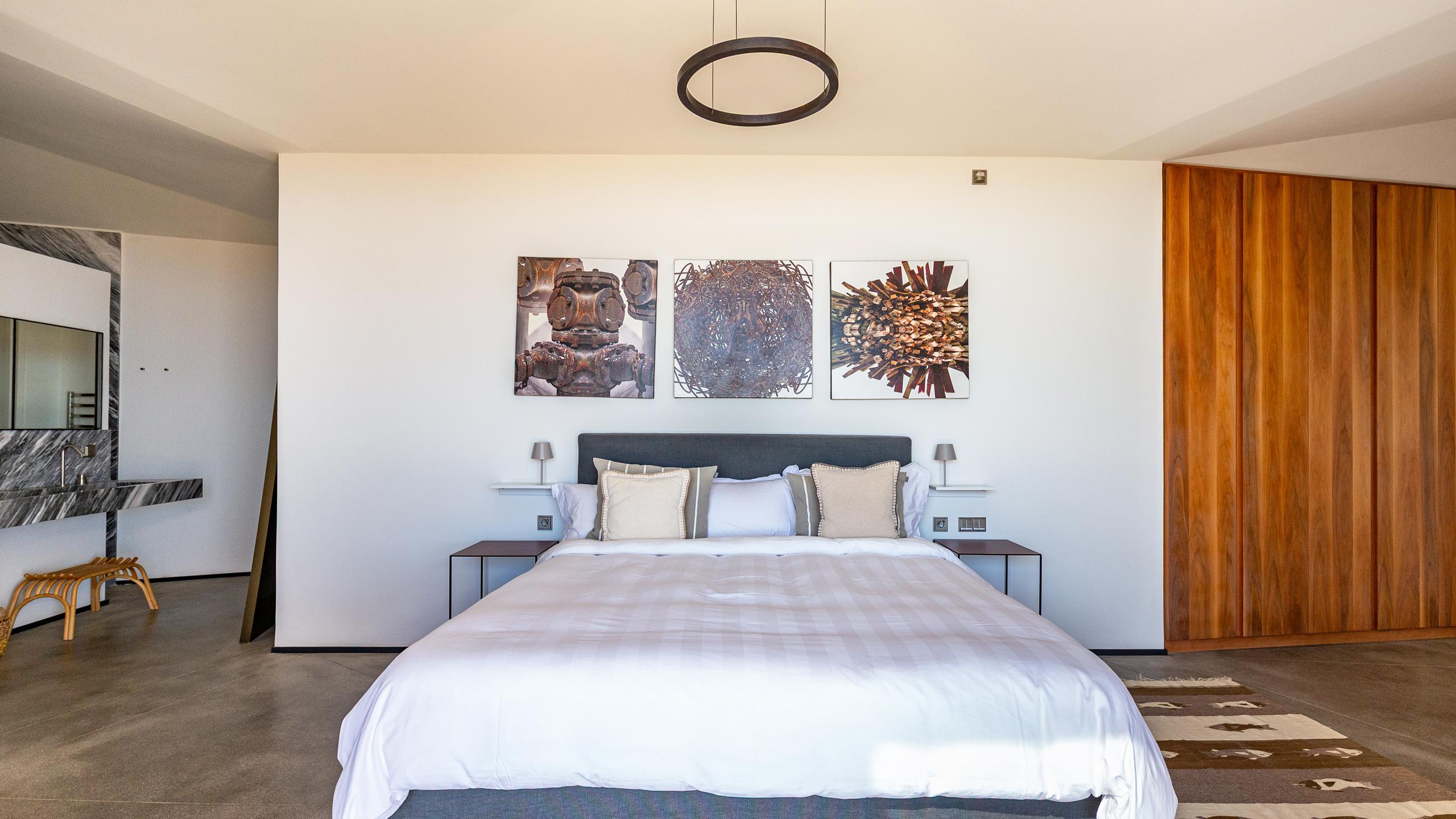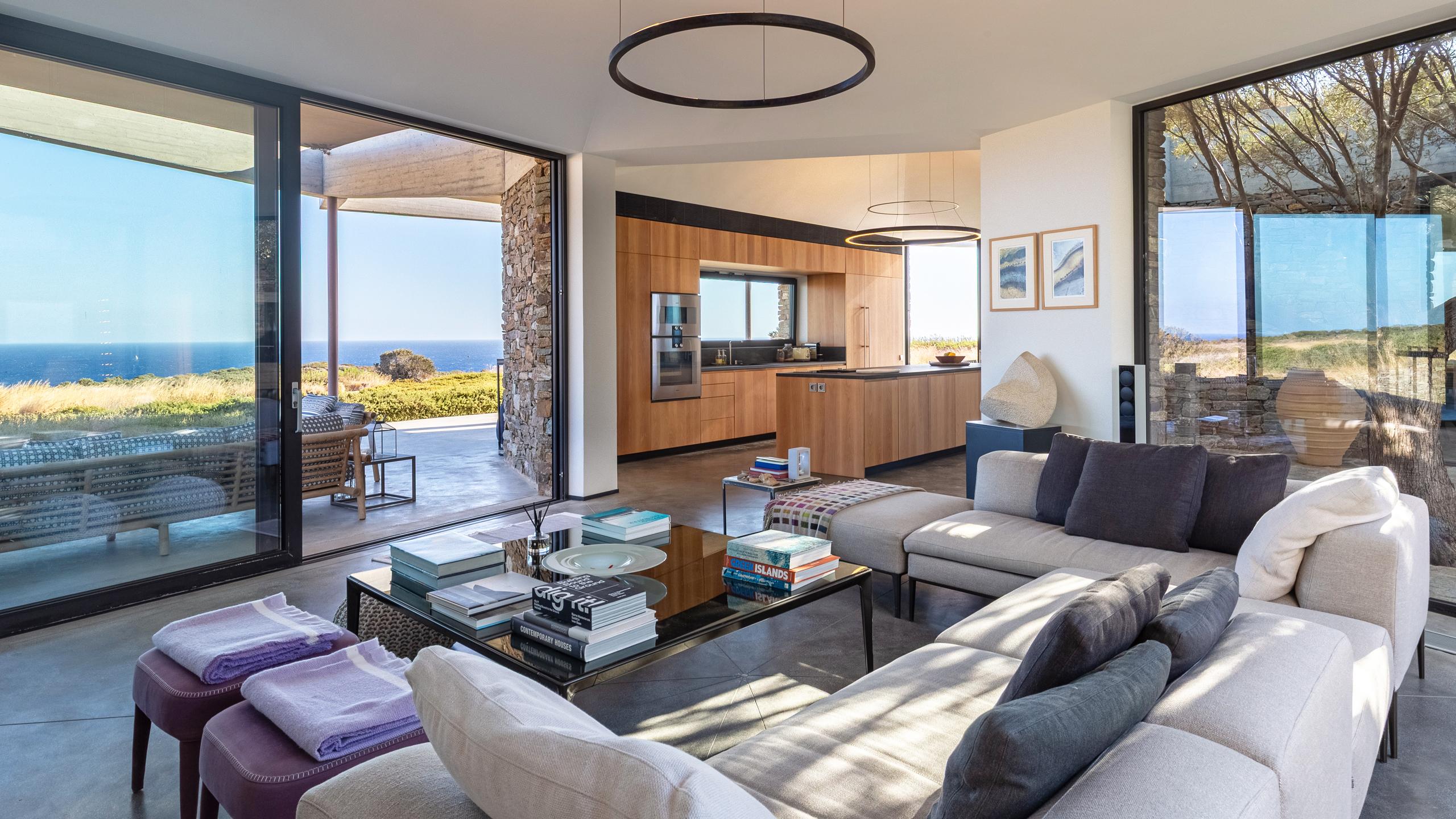 Inside, the aesthetic continues with refined precision. Smooth concrete surfaces, sculptural furniture, and bespoke lighting define an interior of uncompromising style. The living areas open effortlessly to the outdoors, creating a fluid continuity of space. Each bedroom is a private retreat, equipped with the highest comfort standards and curated design details, offering both seclusion and sophistication.