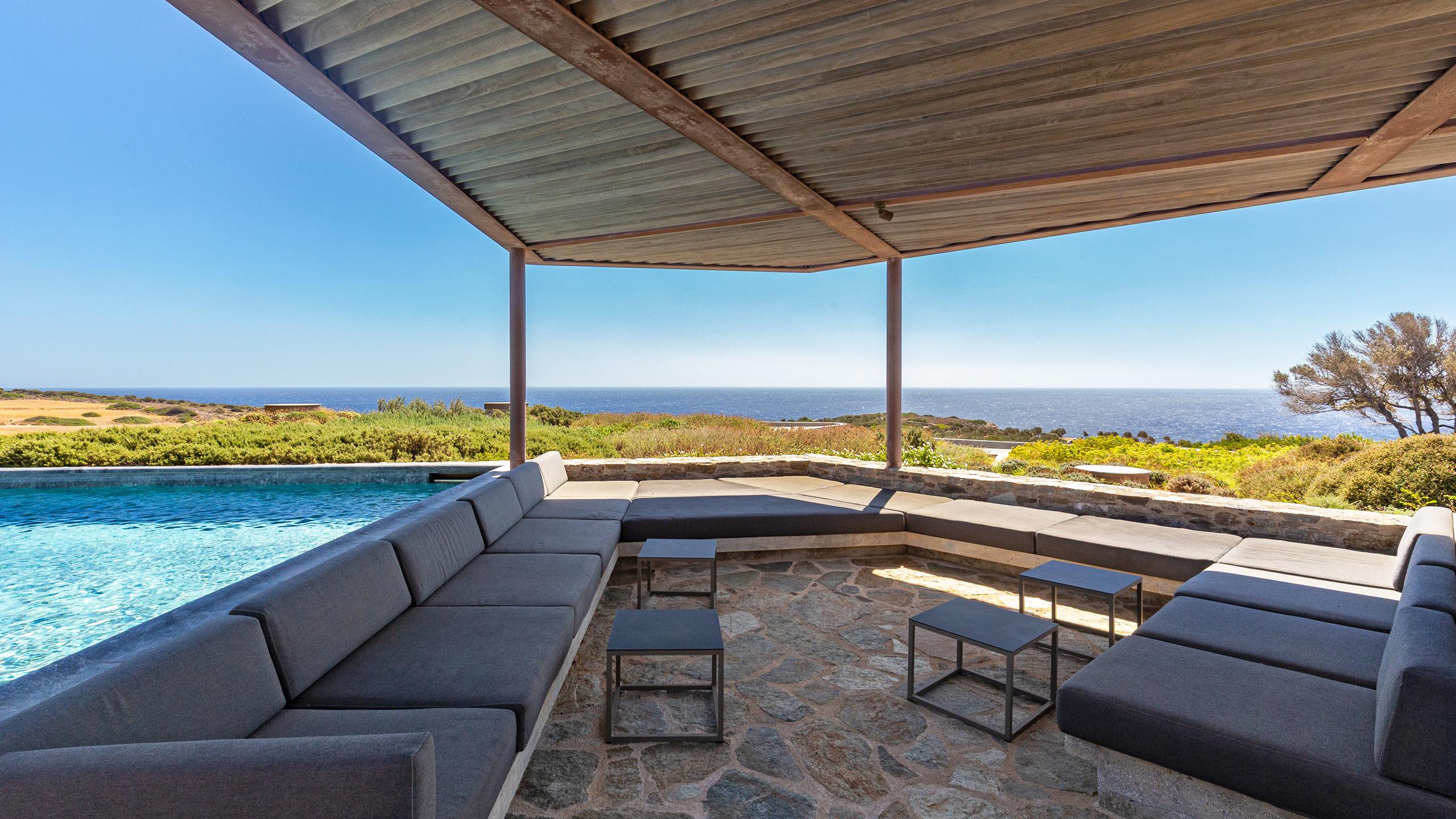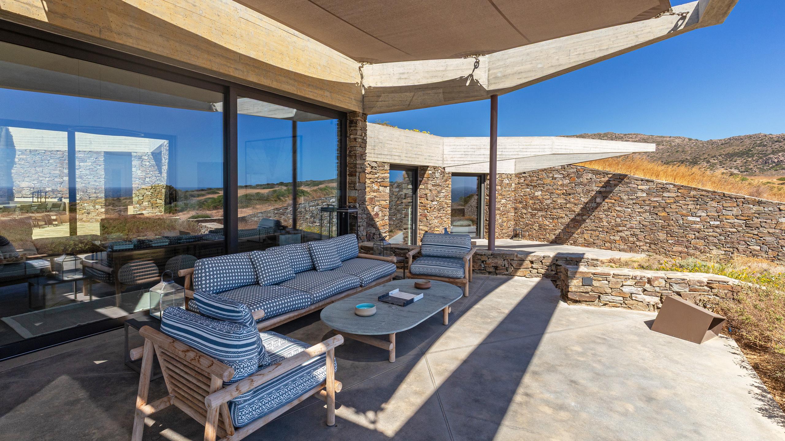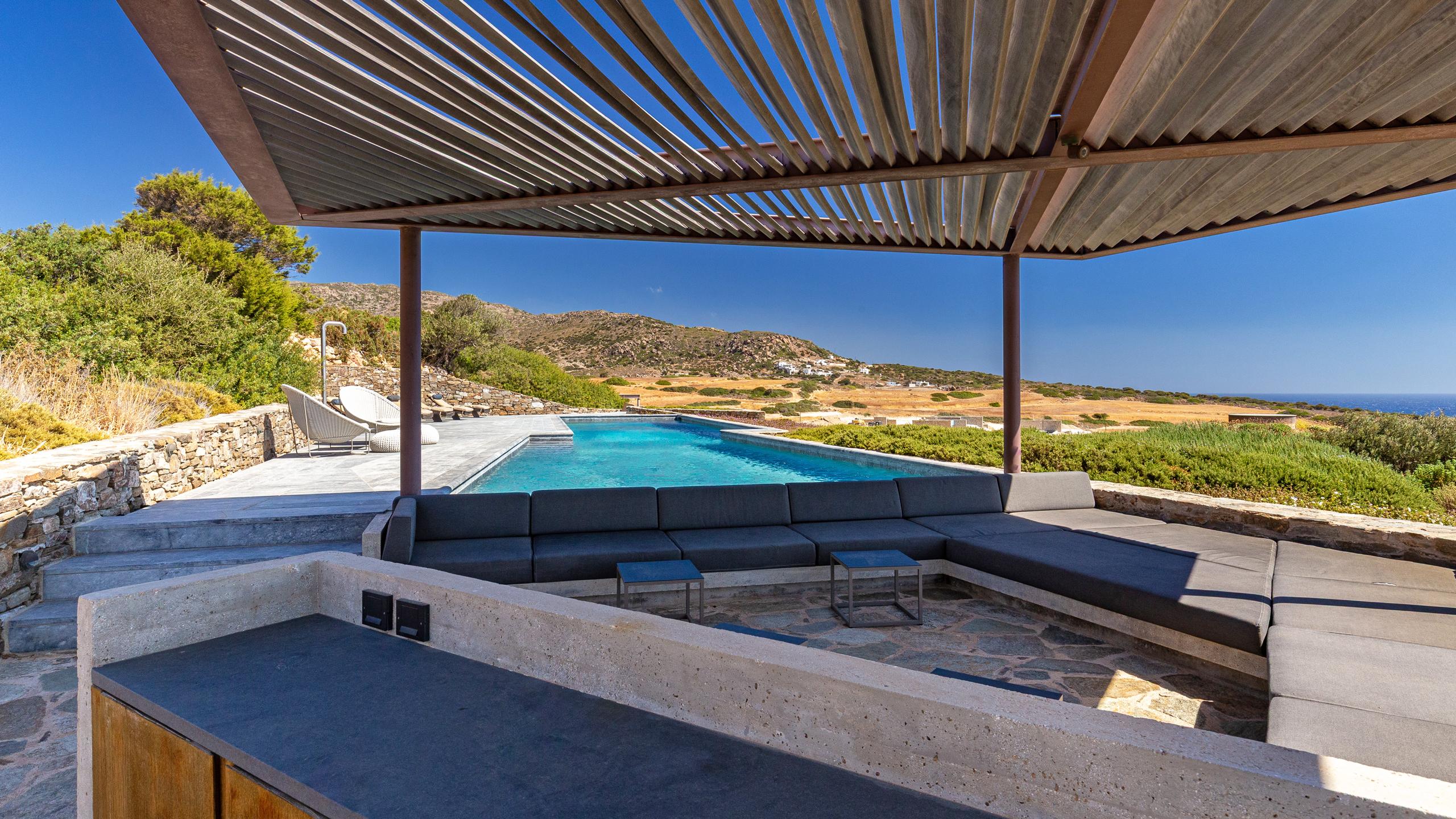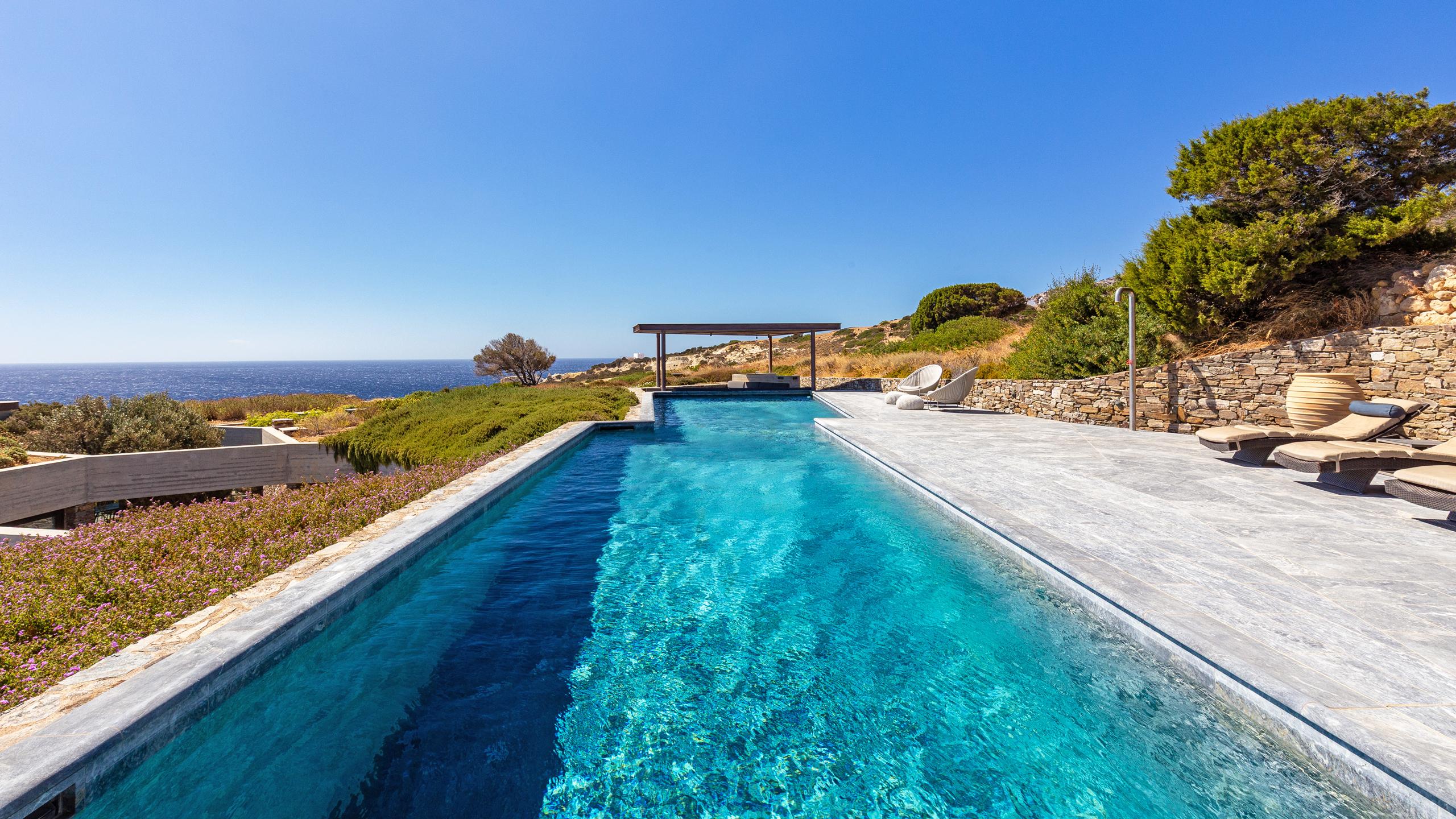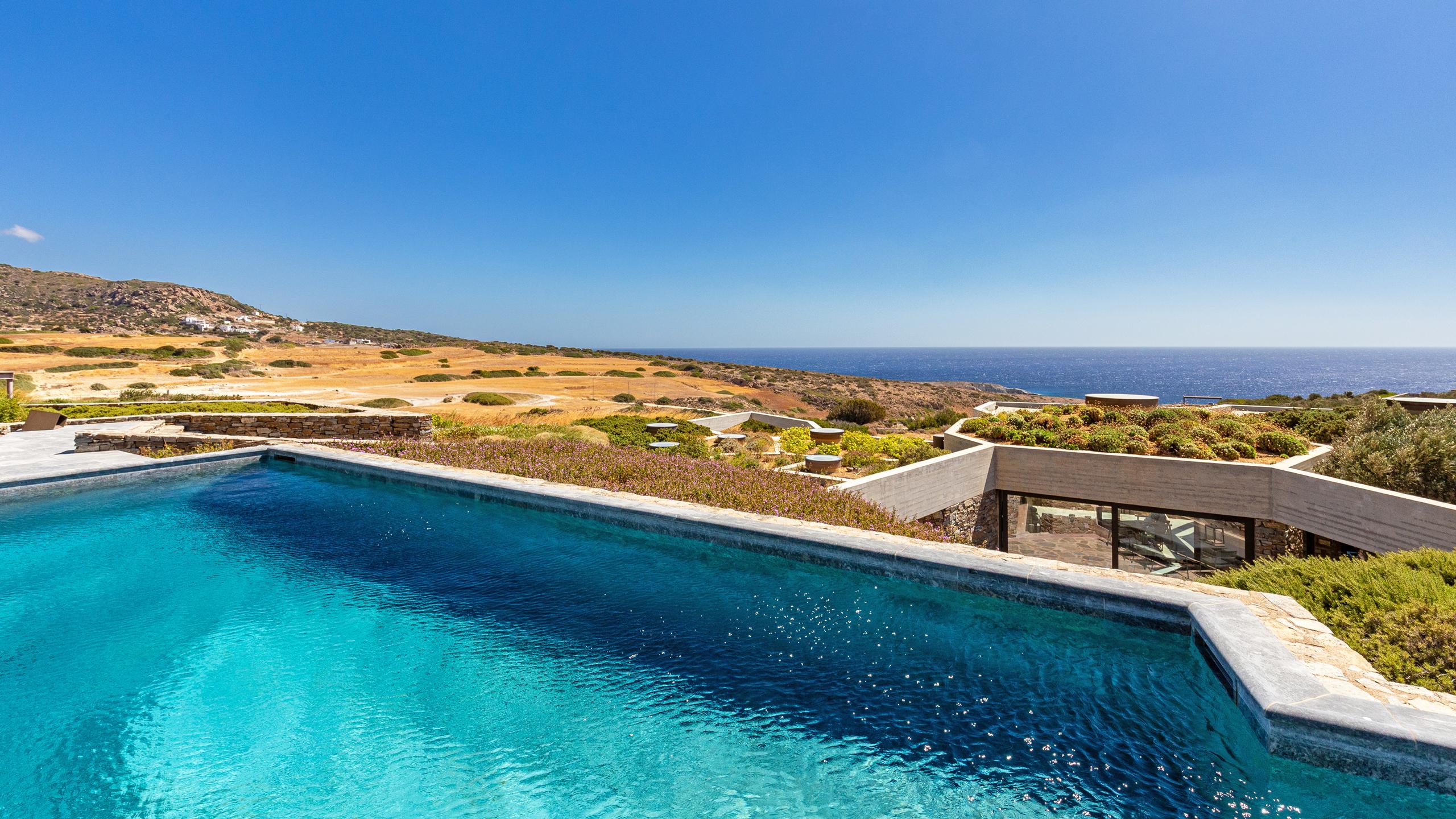Outside, expansive terraces flow seamlessly around the main living spaces, framing views of the island’s hills and sky. A spectacular geometric pool anchors the landscape, while a series of sunken lounges and shaded patios provide elegant settings for dining, relaxation, and quiet contemplation. Every element has been carefully choreographed to capture the essence of Cycladic light and the ever-changing horizon.