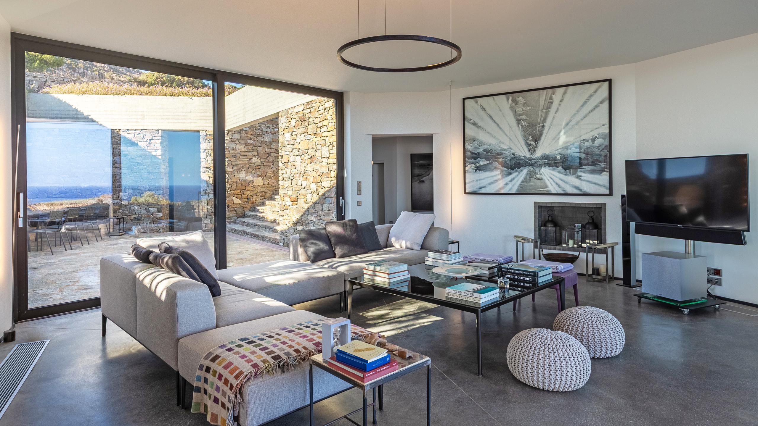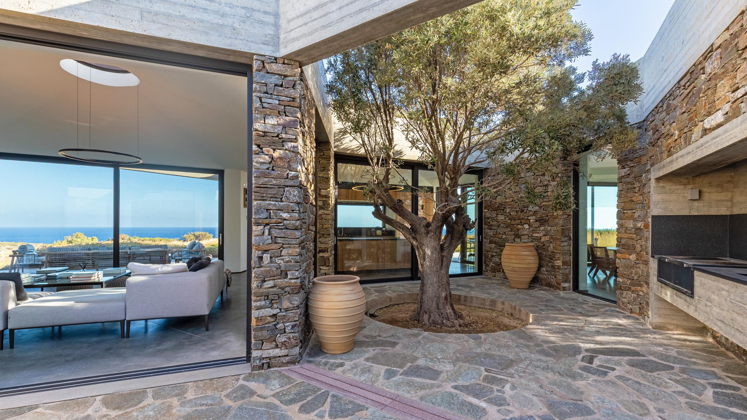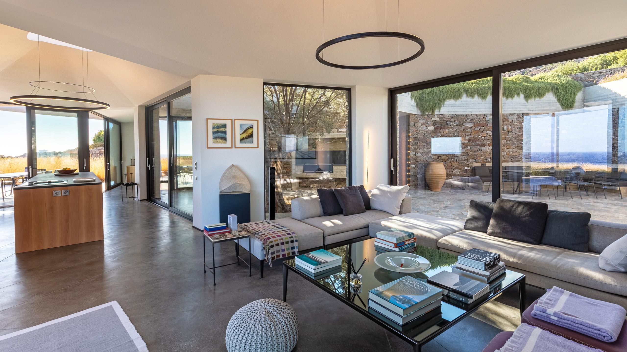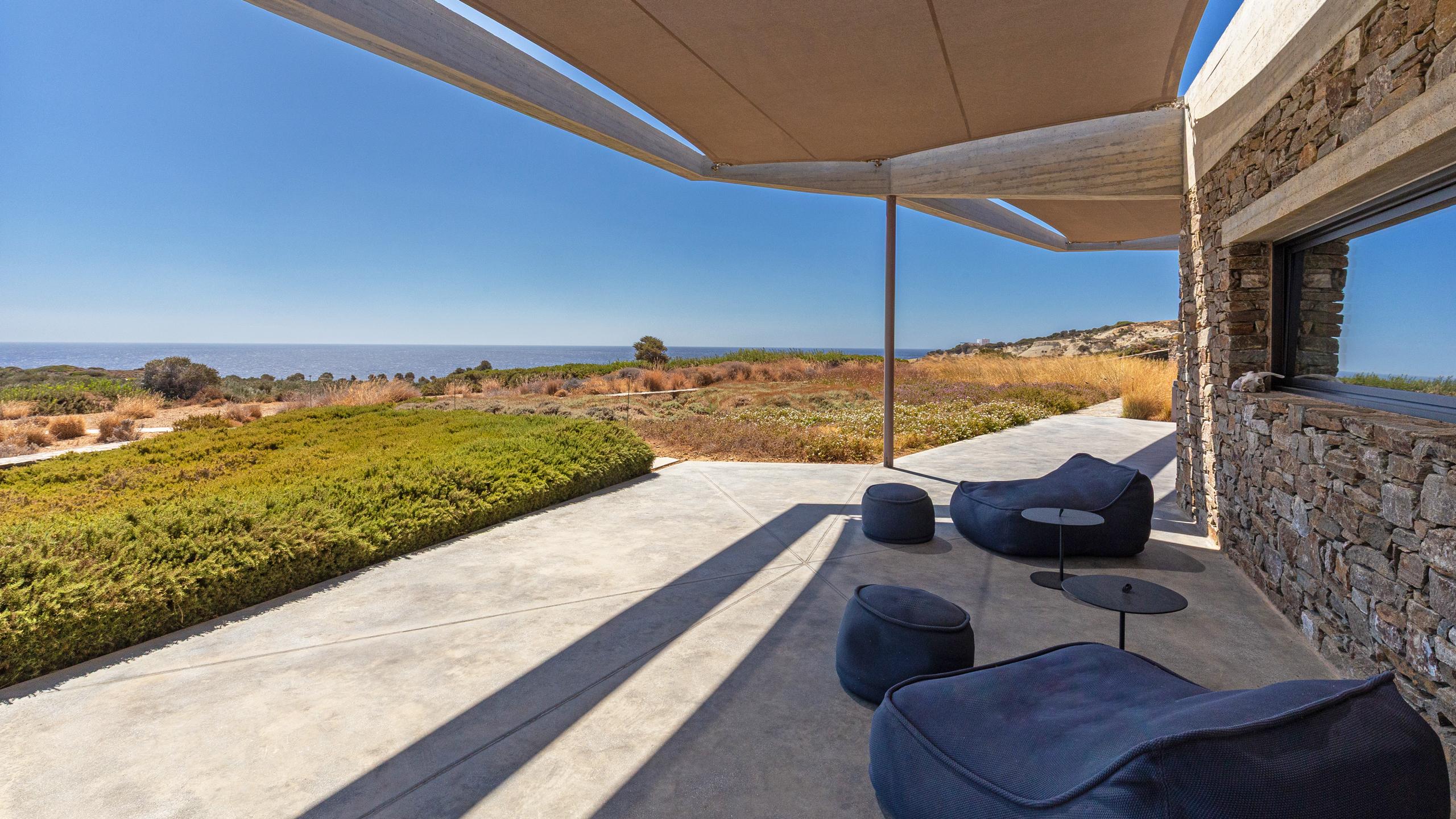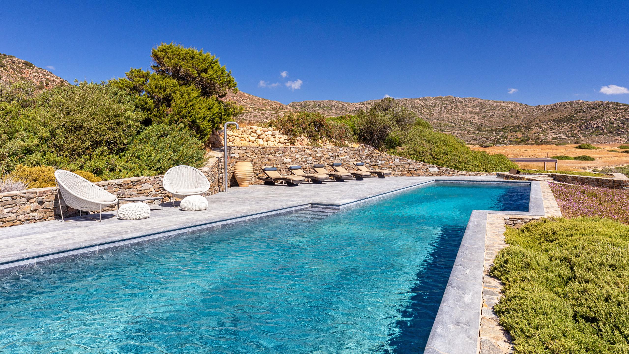 Outside, expansive terraces flow seamlessly around the main living spaces, framing views of the island’s hills and sky. A spectacular geometric pool anchors the landscape, while a series of sunken lounges and shaded patios provide elegant settings for dining, relaxation, and quiet contemplation. Every element has been carefully choreographed to capture the essence of Cycladic light and the ever-changing horizon.