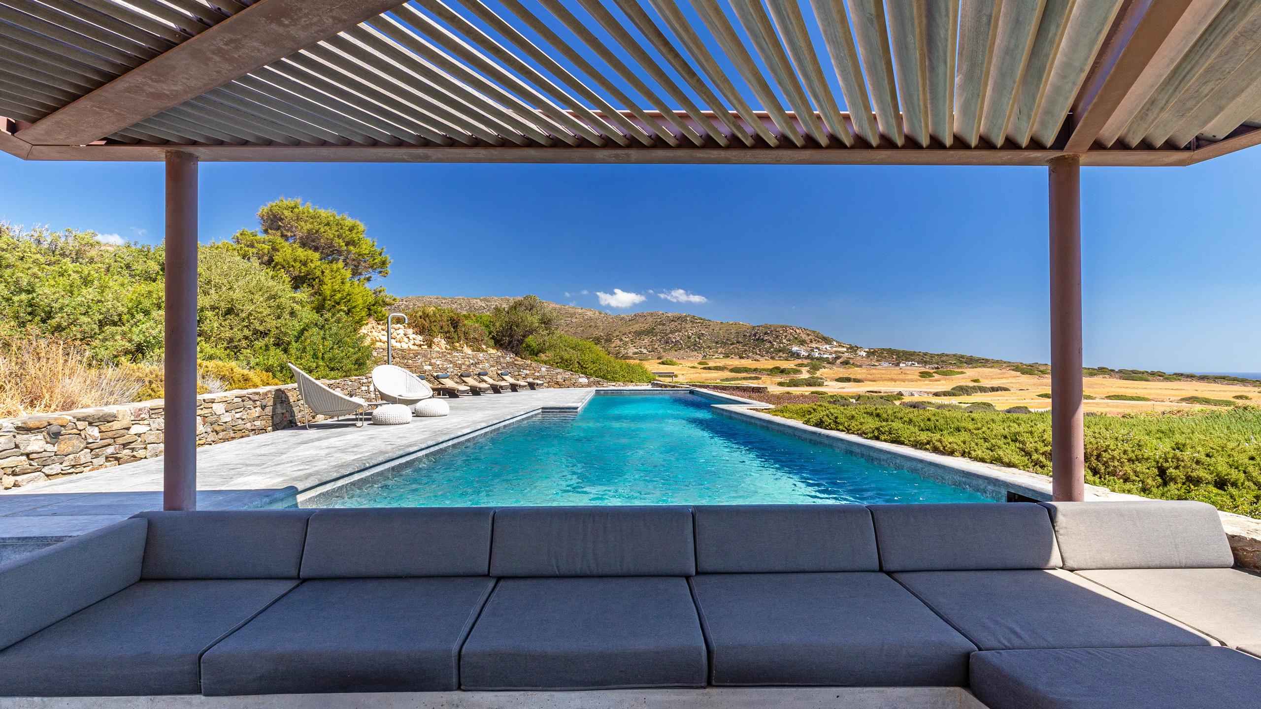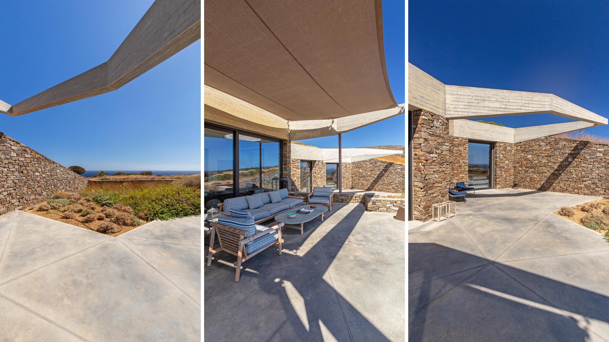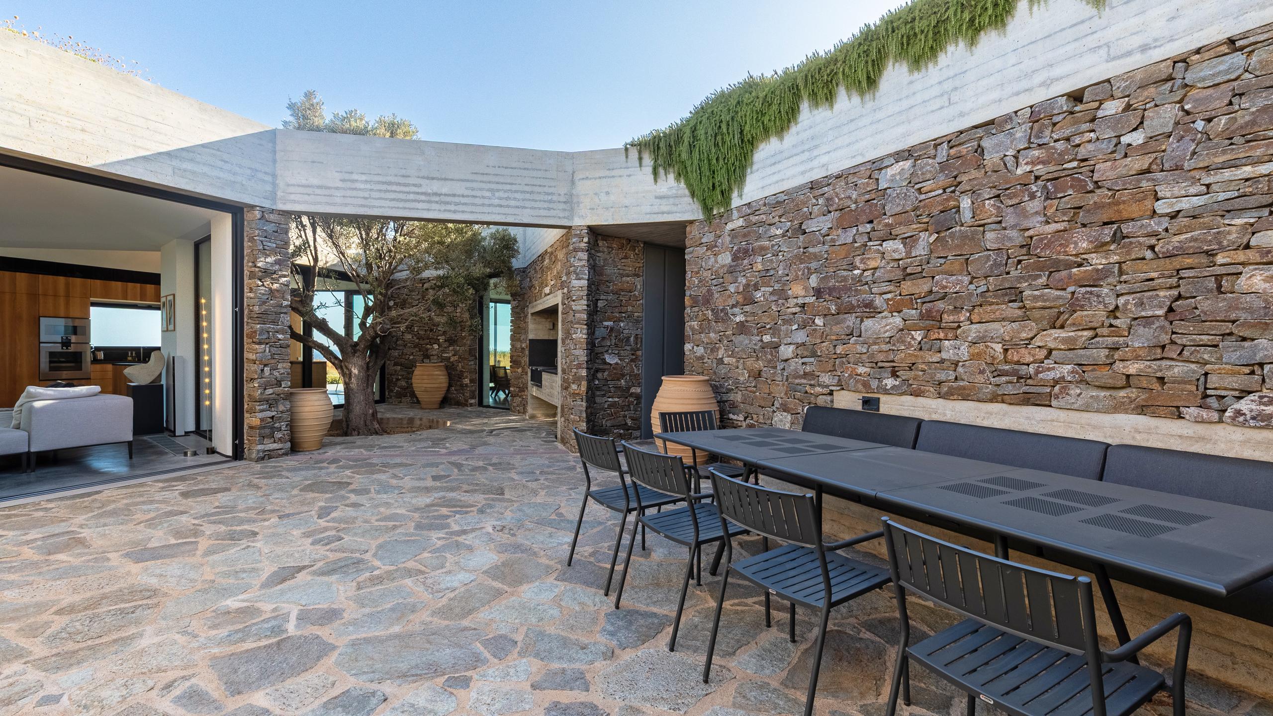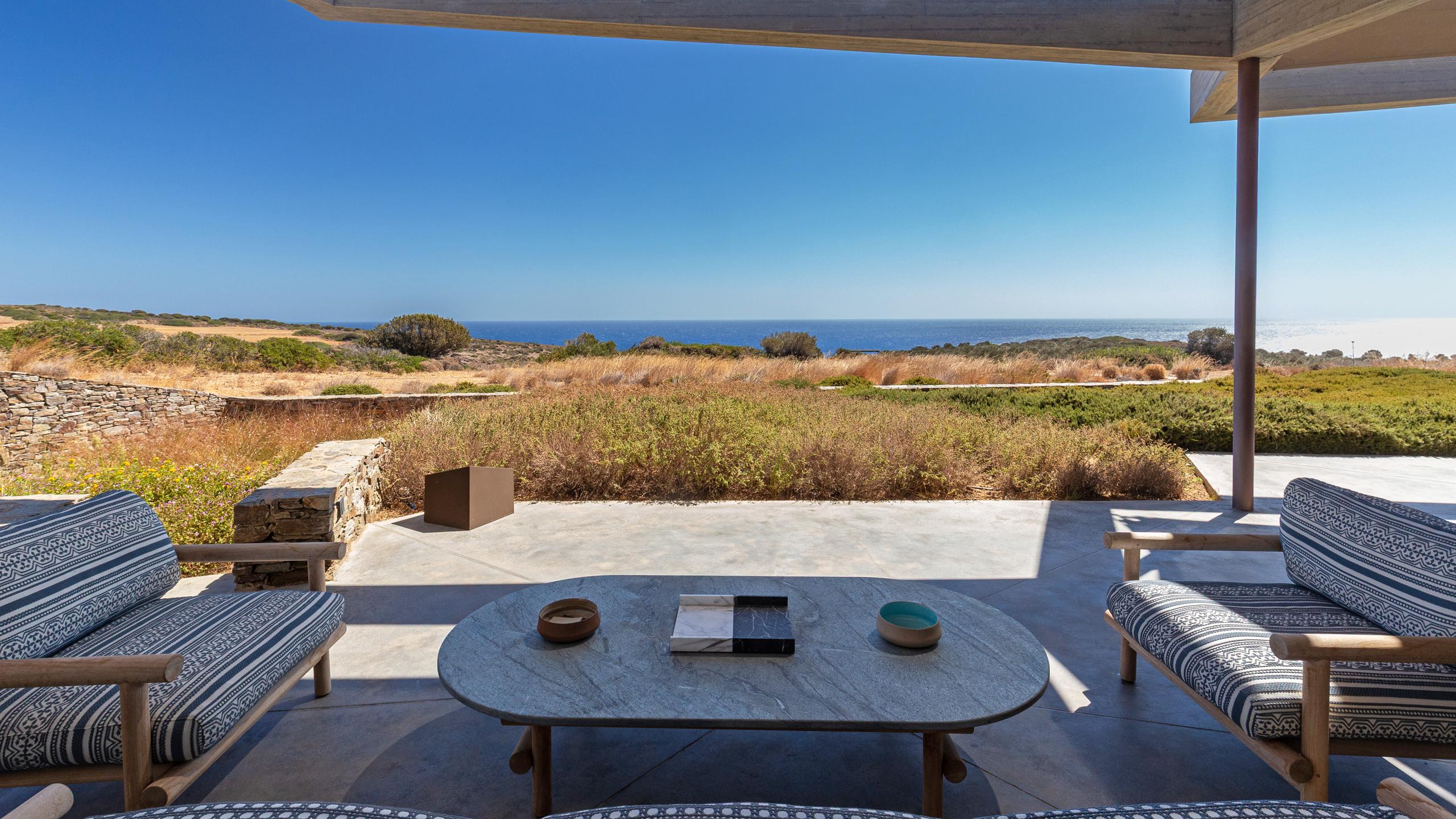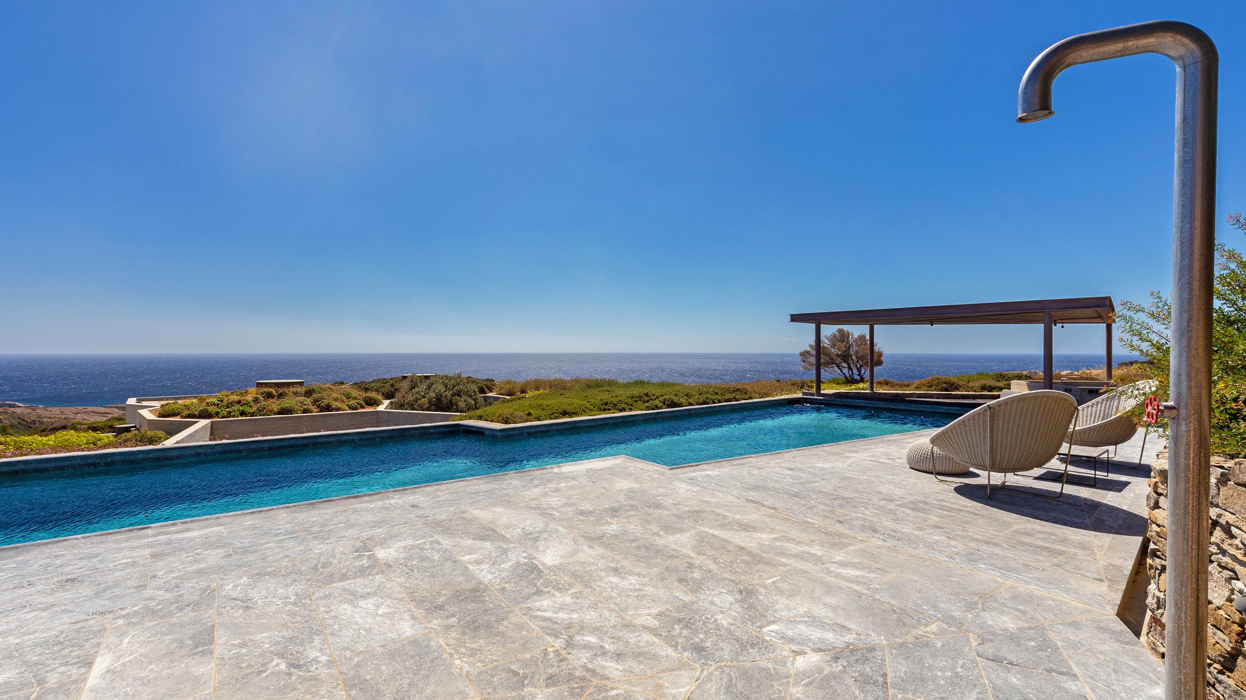 Outside, expansive terraces flow seamlessly around the main living spaces, framing views of the island’s hills and sky. A spectacular geometric pool anchors the landscape, while a series of sunken lounges and shaded patios provide elegant settings for dining, relaxation, and quiet contemplation. Every element has been carefully choreographed to capture the essence of Cycladic light and the ever-changing horizon.
