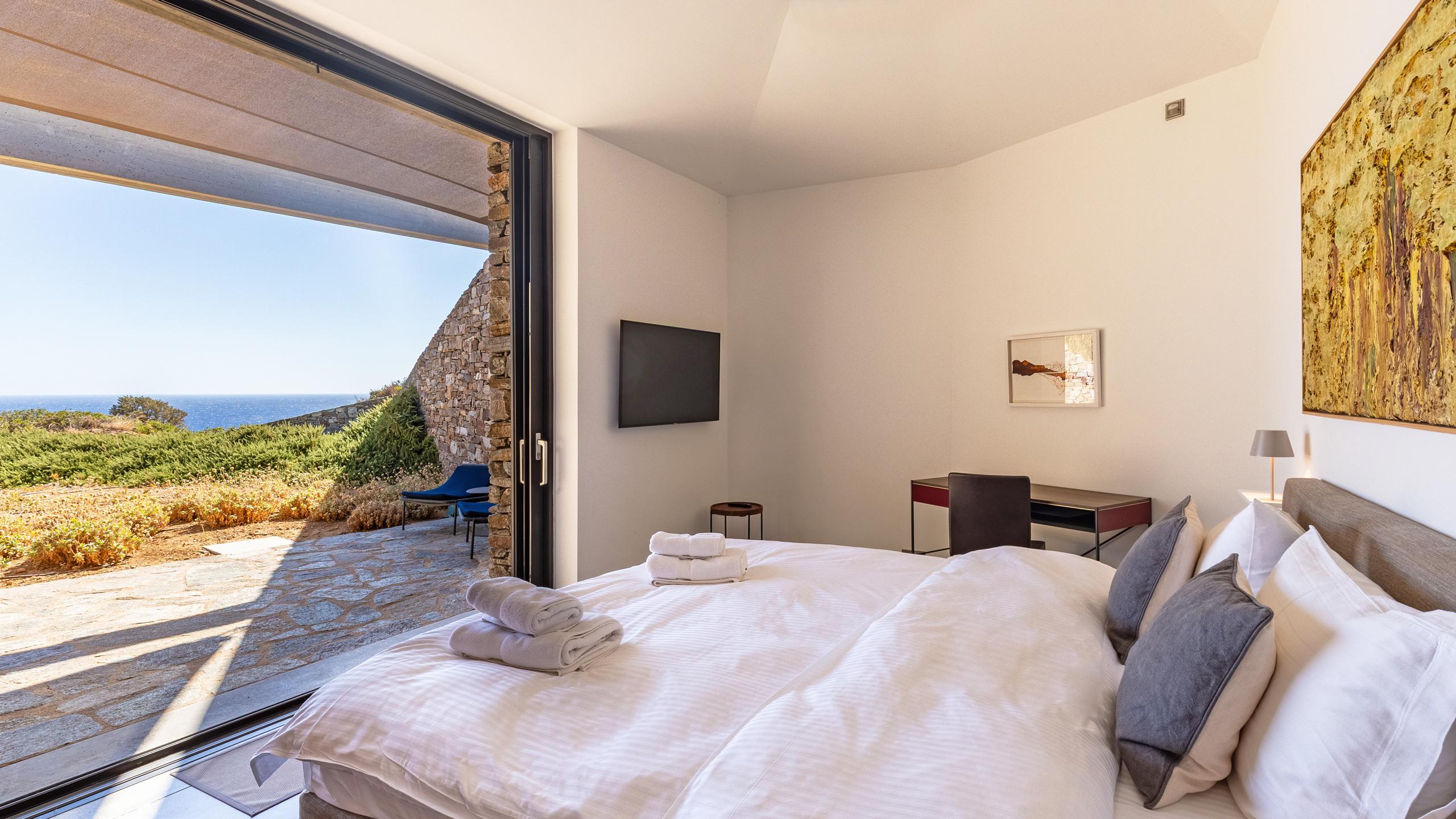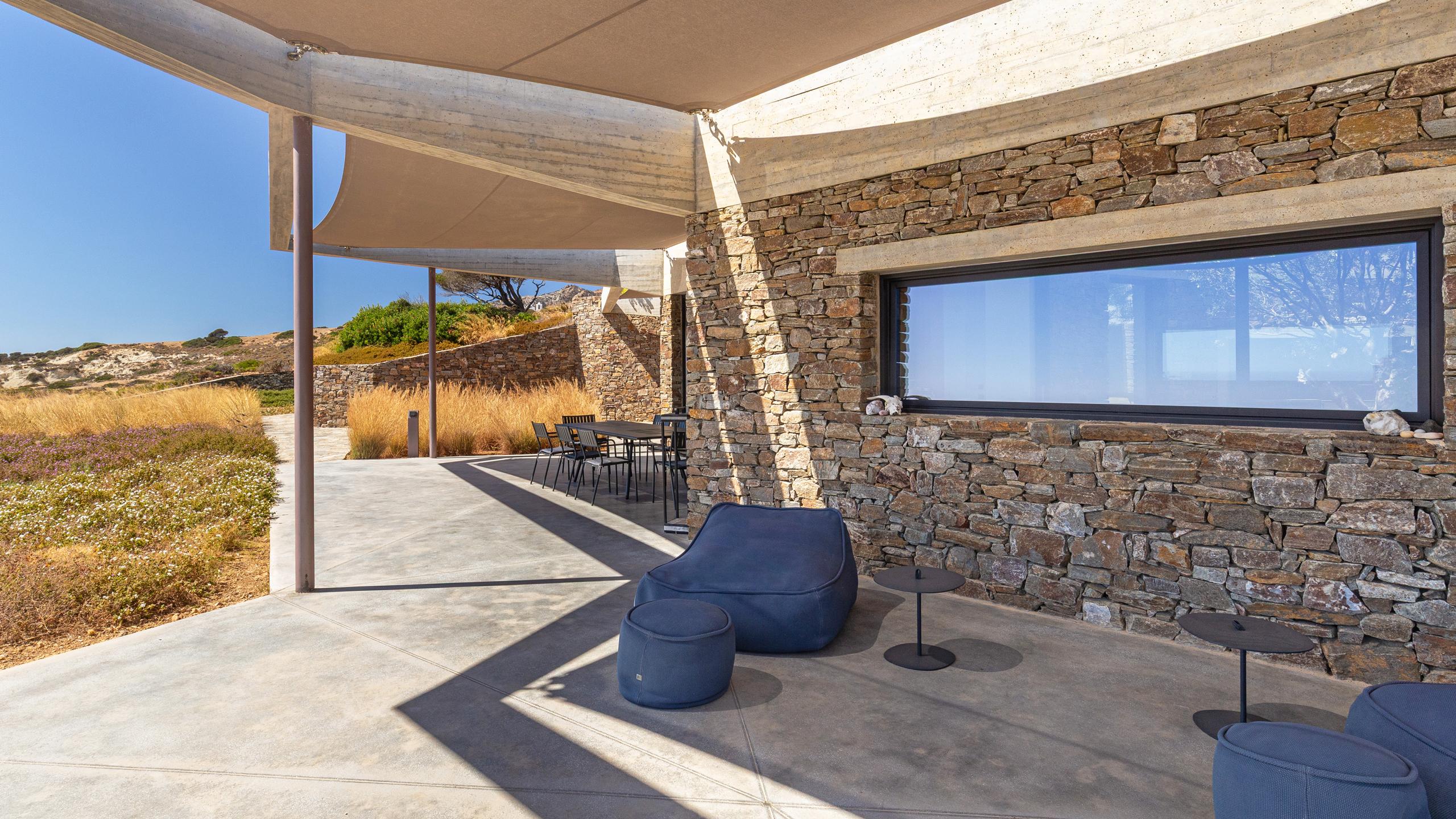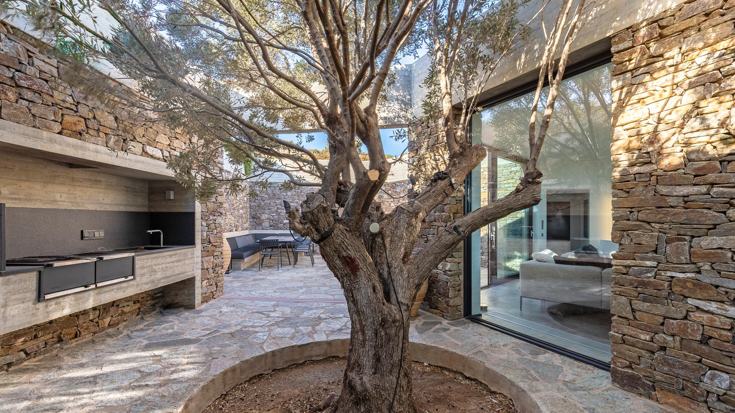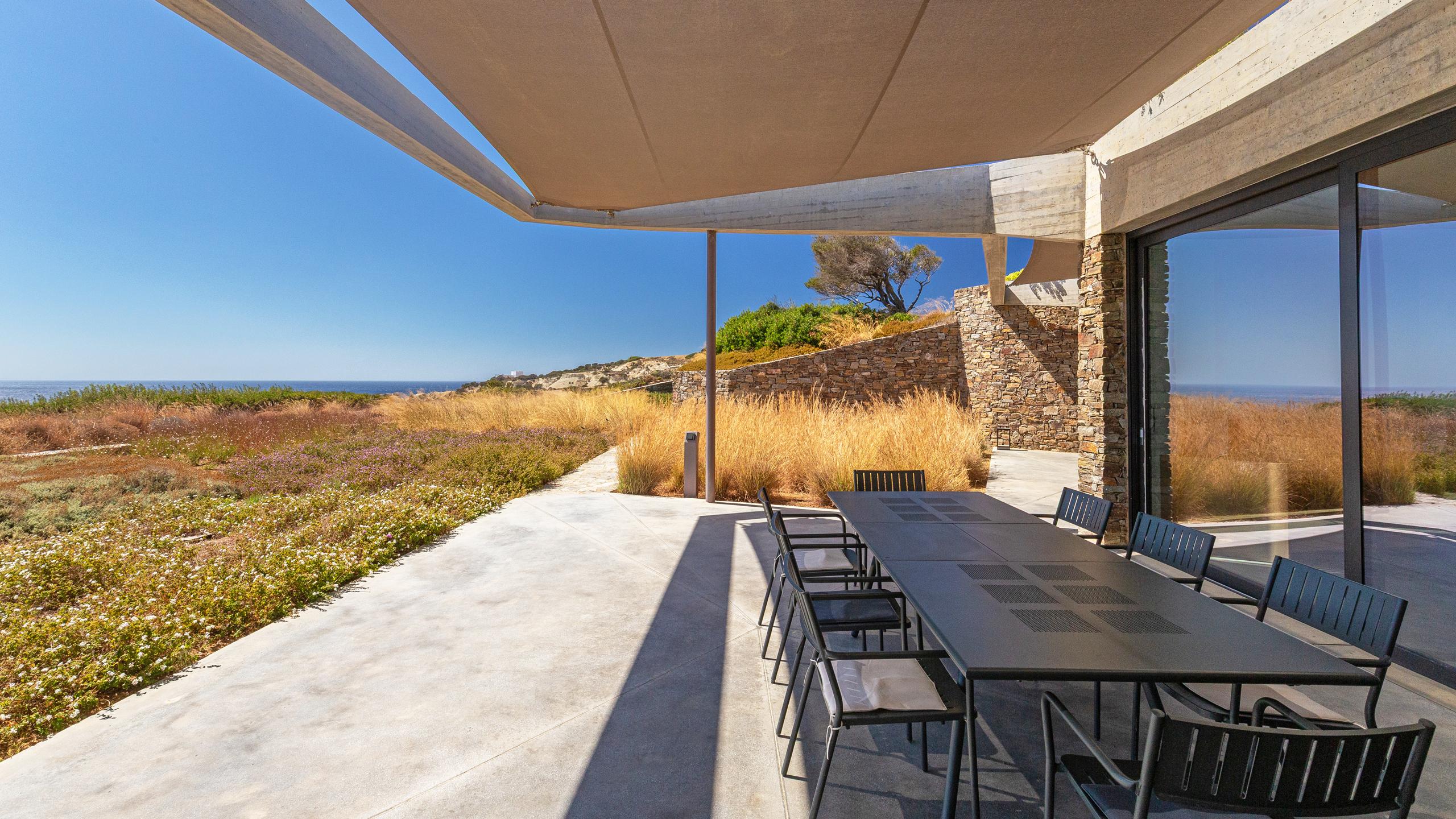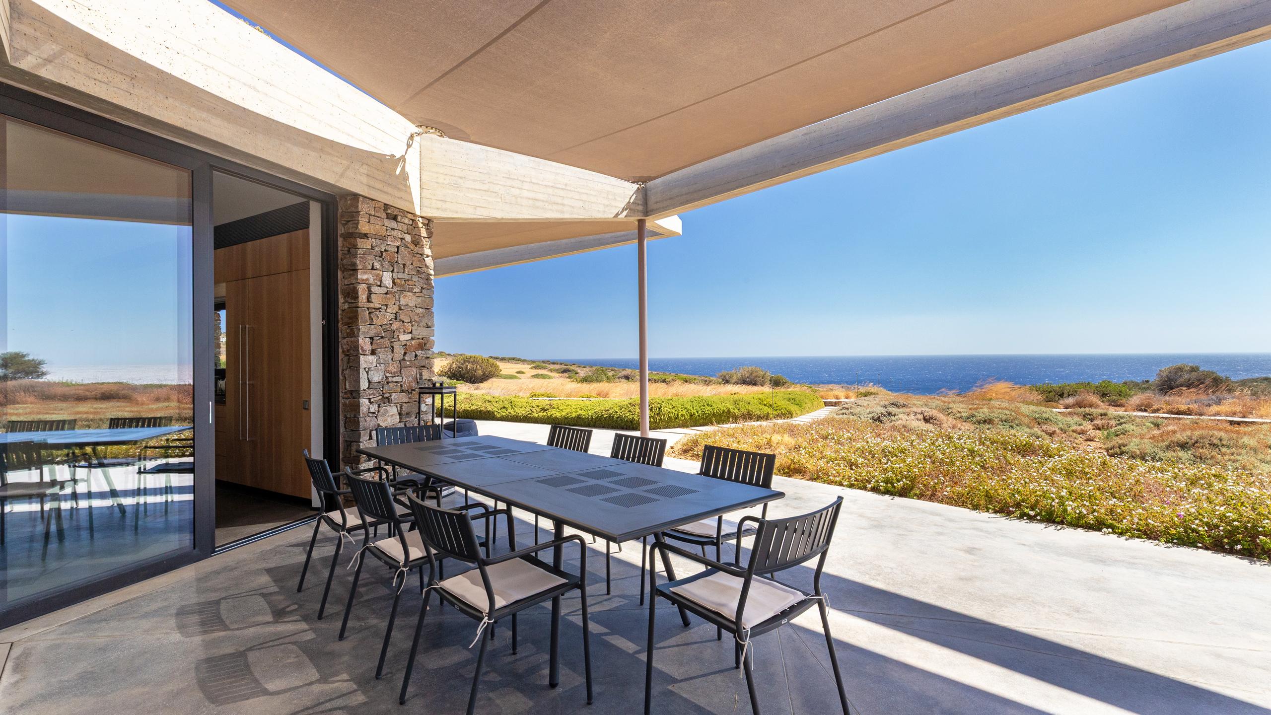 Outside, expansive terraces flow seamlessly around the main living spaces, framing views of the island’s hills and sky. A spectacular geometric pool anchors the landscape, while a series of sunken lounges and shaded patios provide elegant settings for dining, relaxation, and quiet contemplation. Every element has been carefully choreographed to capture the essence of Cycladic light and the ever-changing horizon.