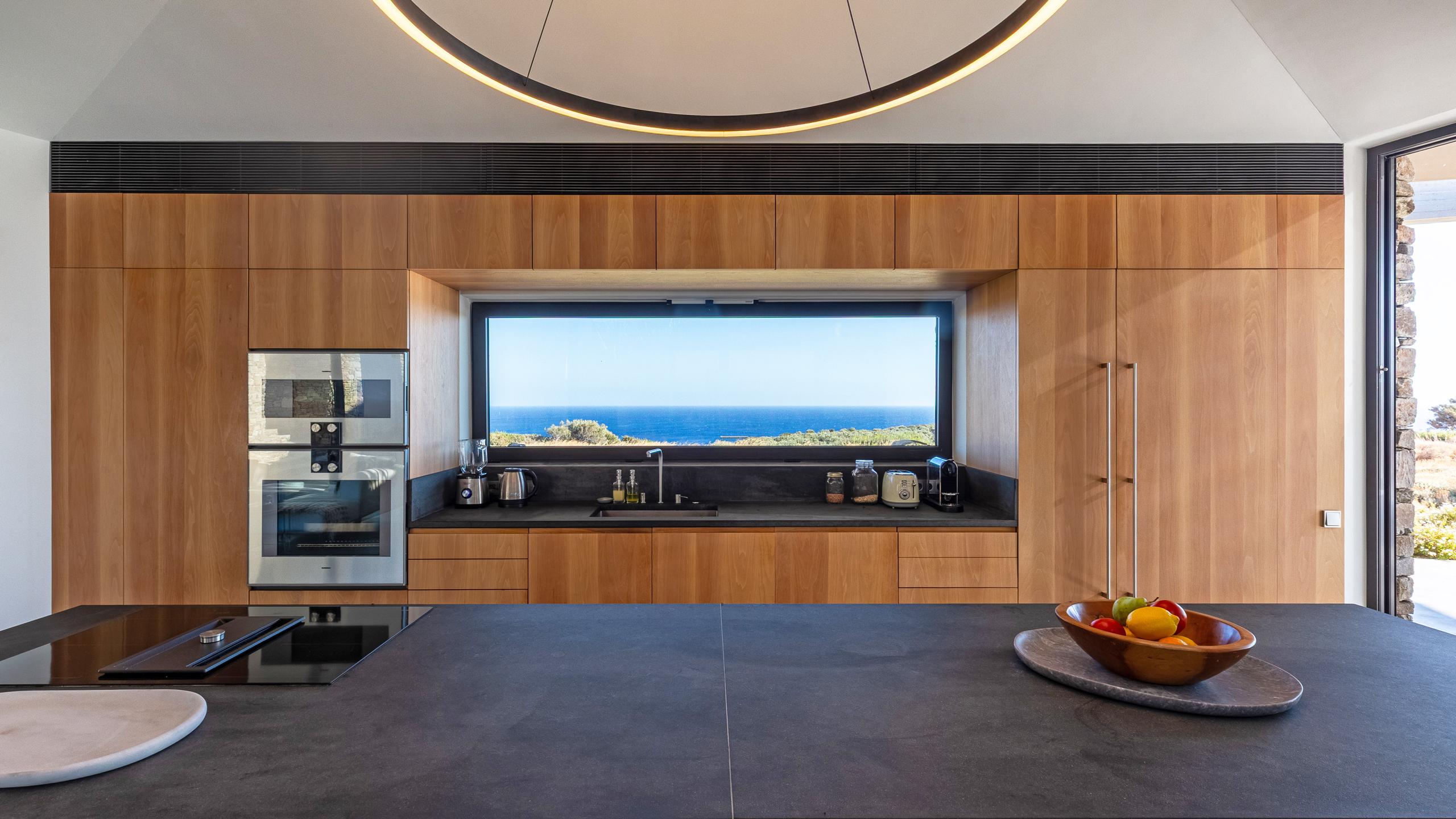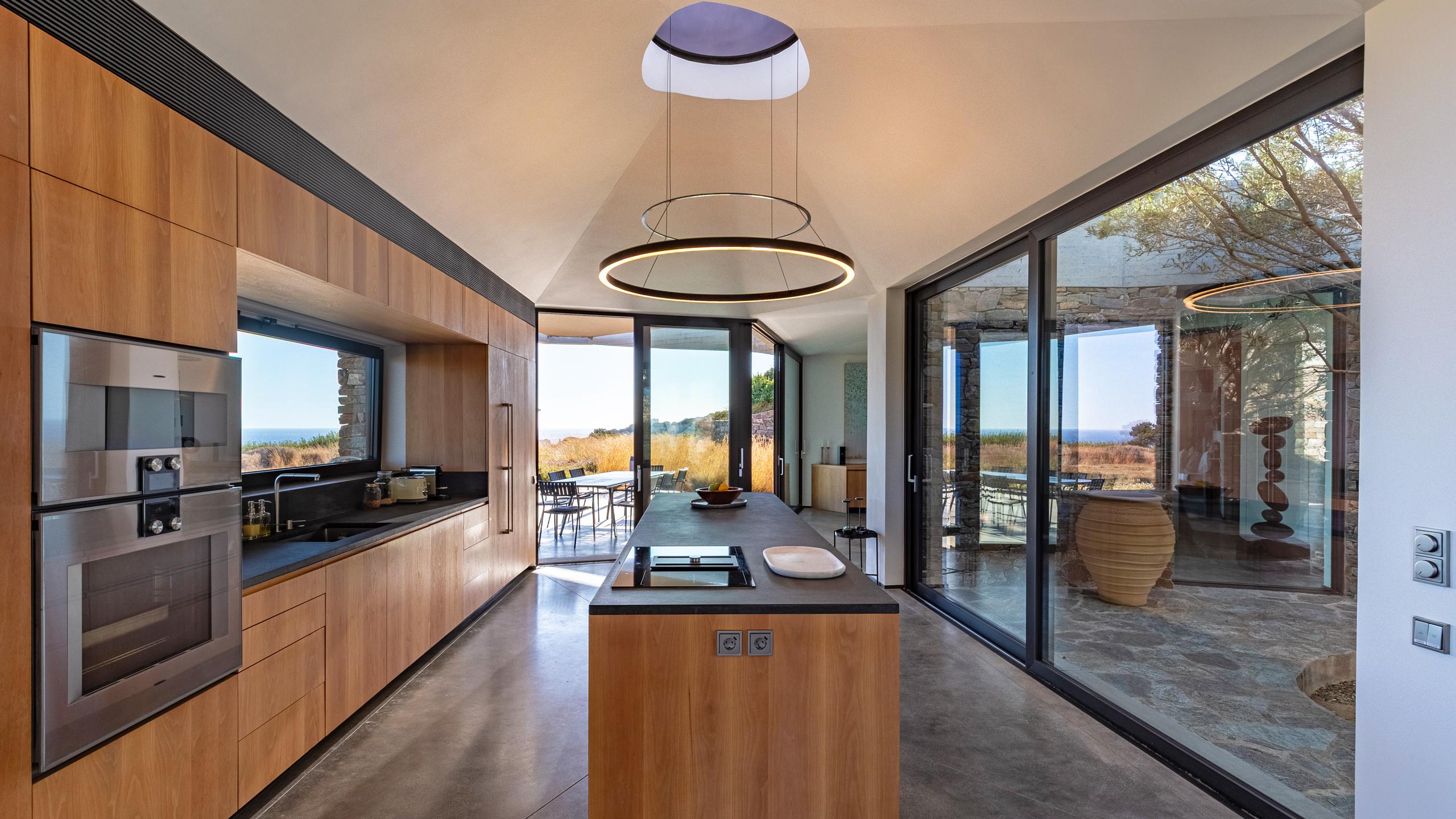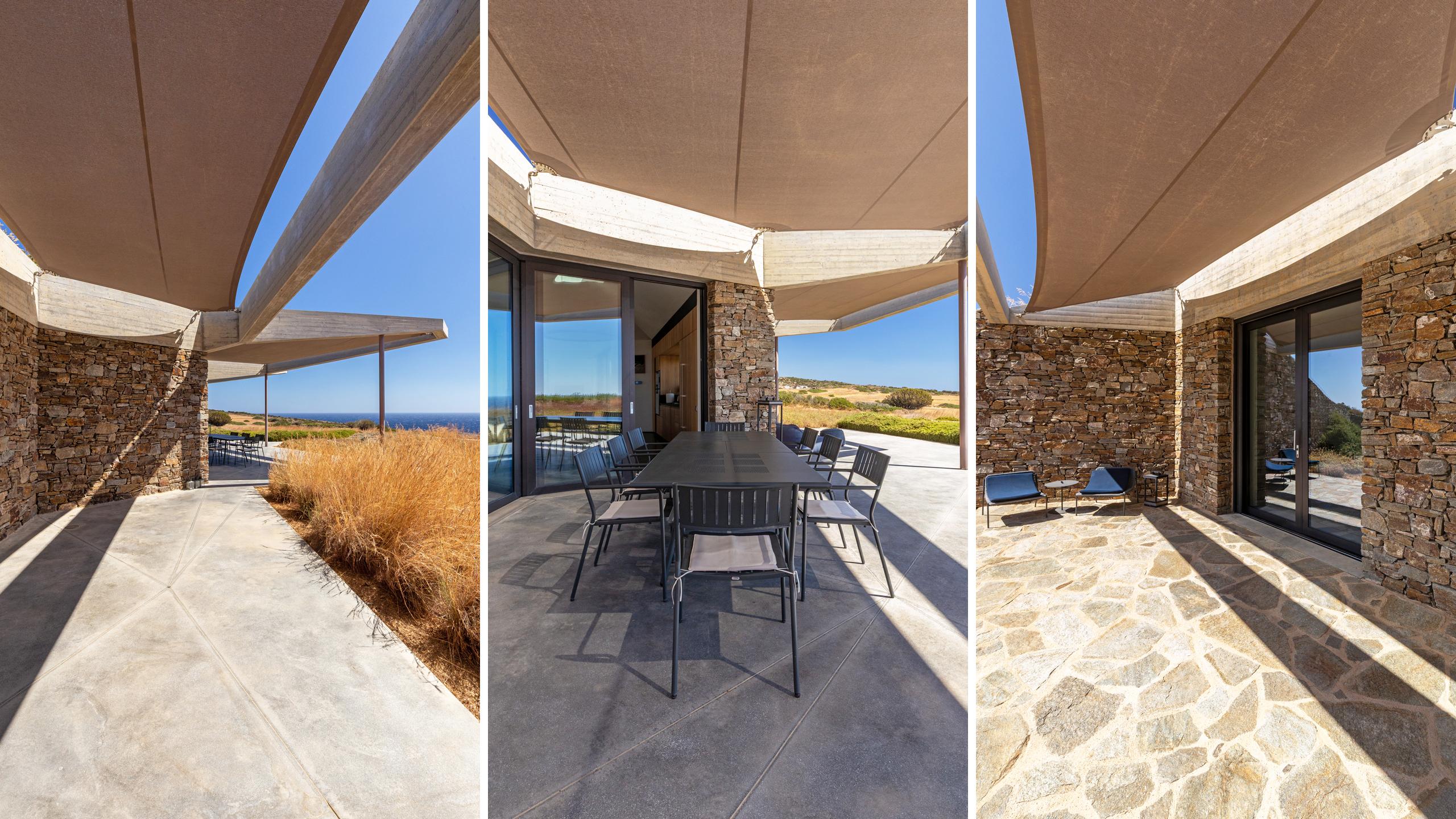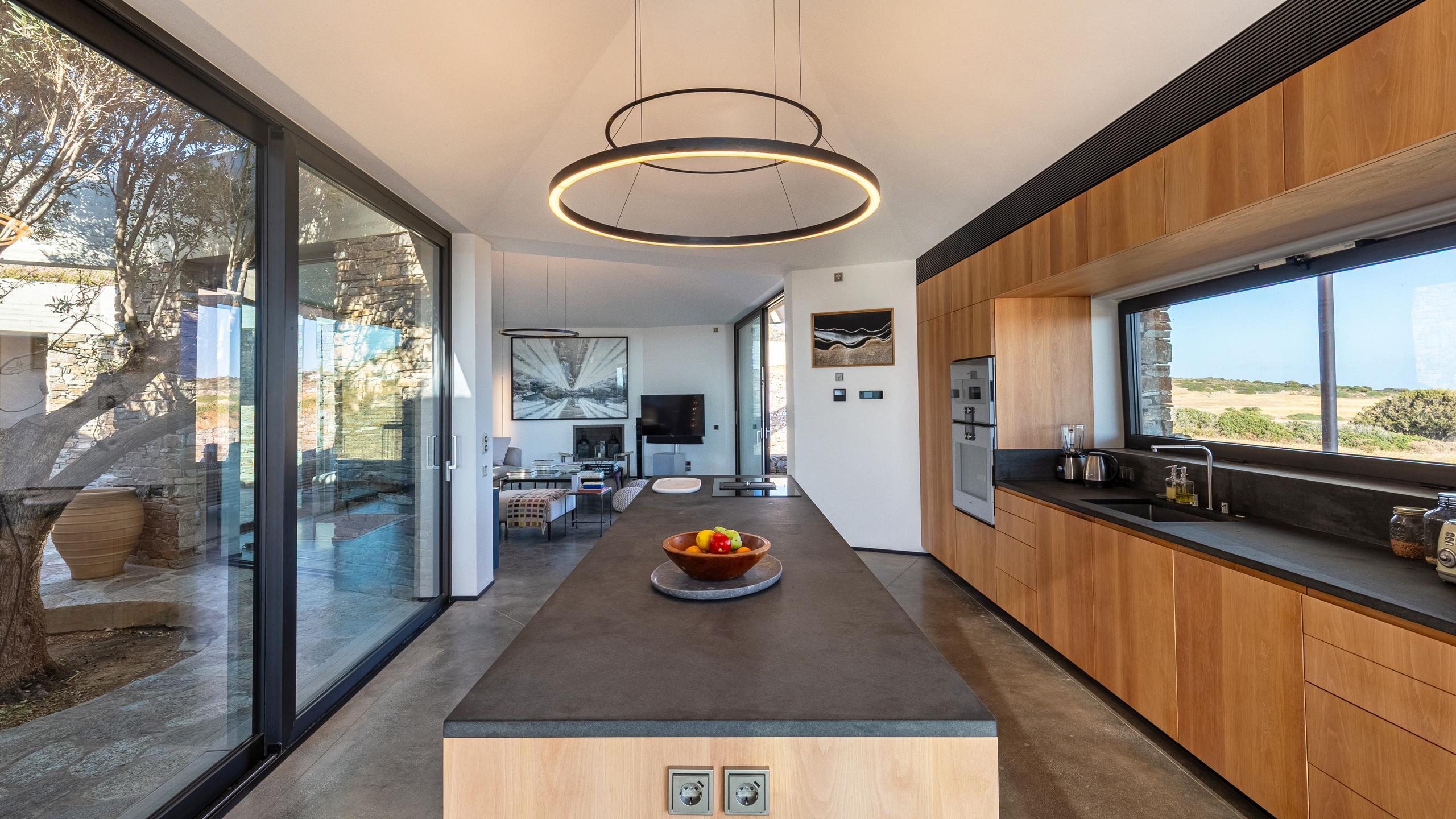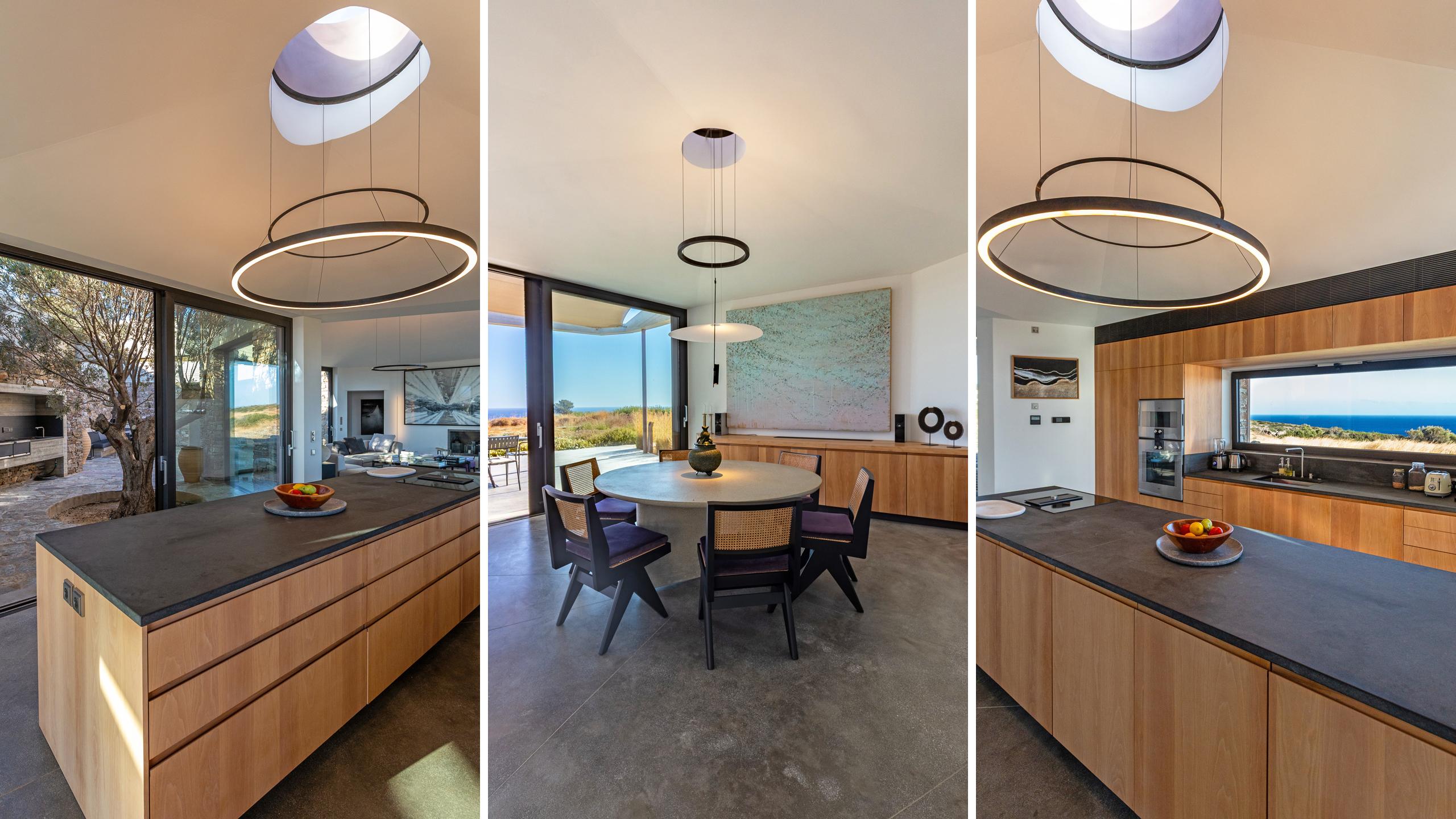 Outside, expansive terraces flow seamlessly around the main living spaces, framing views of the island’s hills and sky. A spectacular geometric pool anchors the landscape, while a series of sunken lounges and shaded patios provide elegant settings for dining, relaxation, and quiet contemplation. Every element has been carefully choreographed to capture the essence of Cycladic light and the ever-changing horizon.
