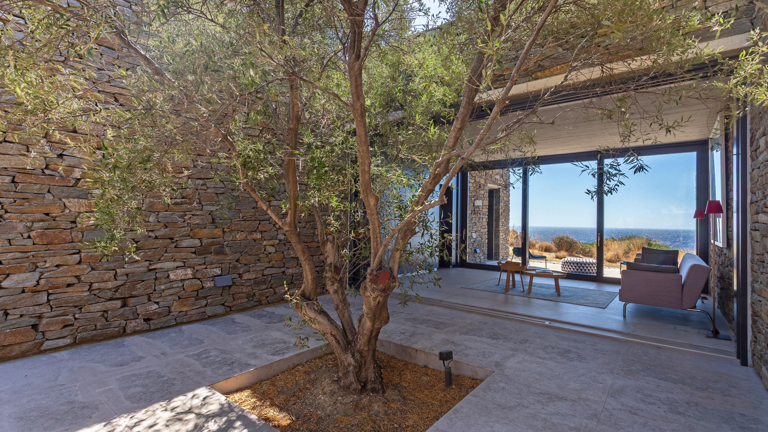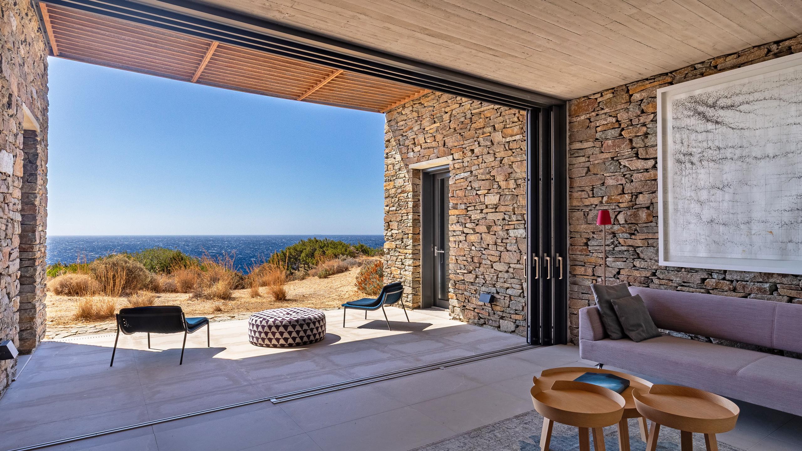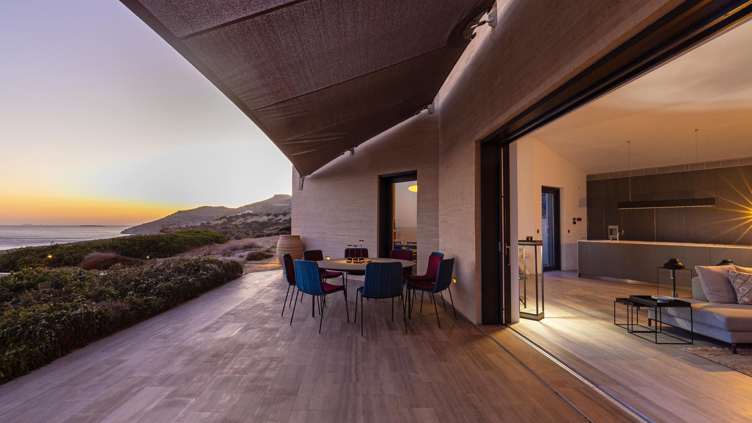 Outside, nature reigns supreme, with breathtaking, unobstructed sea views. A stay here reconnects you with nature and the unhurried rhythms of the island, surrounded by a wild and captivating setting. Every comfort is at guests’ disposal, from the alluring clifftop infinity pool to the sheltered, sunken dining area protected from the wind—always with the incredible view as the unifying element.