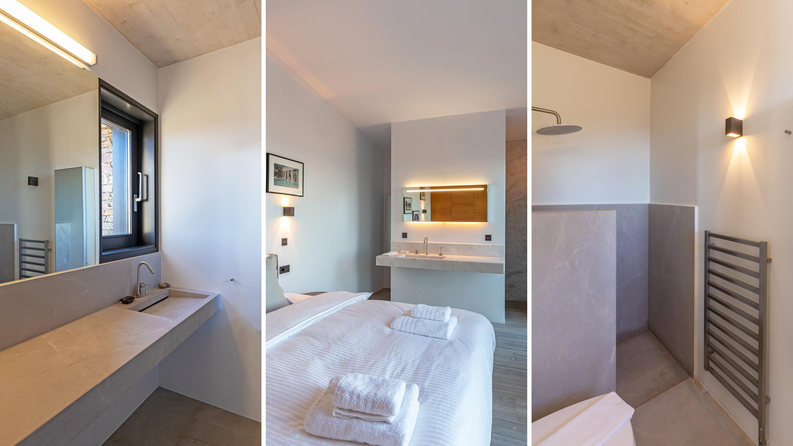 The interiors of both residences are defined by a boldly modern approach, with sharp, daring geometric lines, the result of work by a renowned architectural firm. Only the finest materials have been used, matched by top-tier technological features, all within a space of strong, distinctive design. Bedrooms are evenly divided between the Cliff House and the Orchard House, a perfect layout for two families or couples seeking privacy and independence.