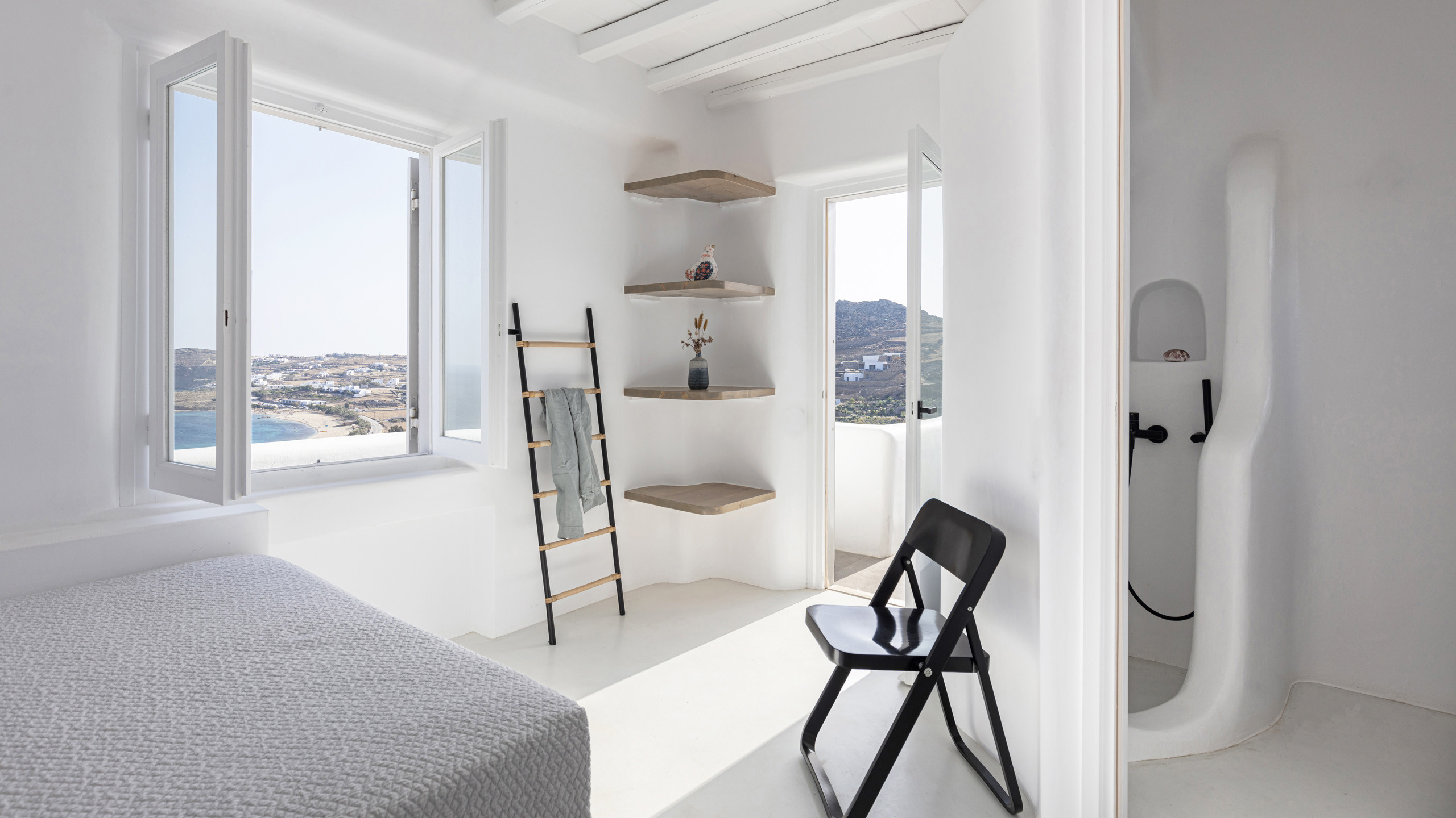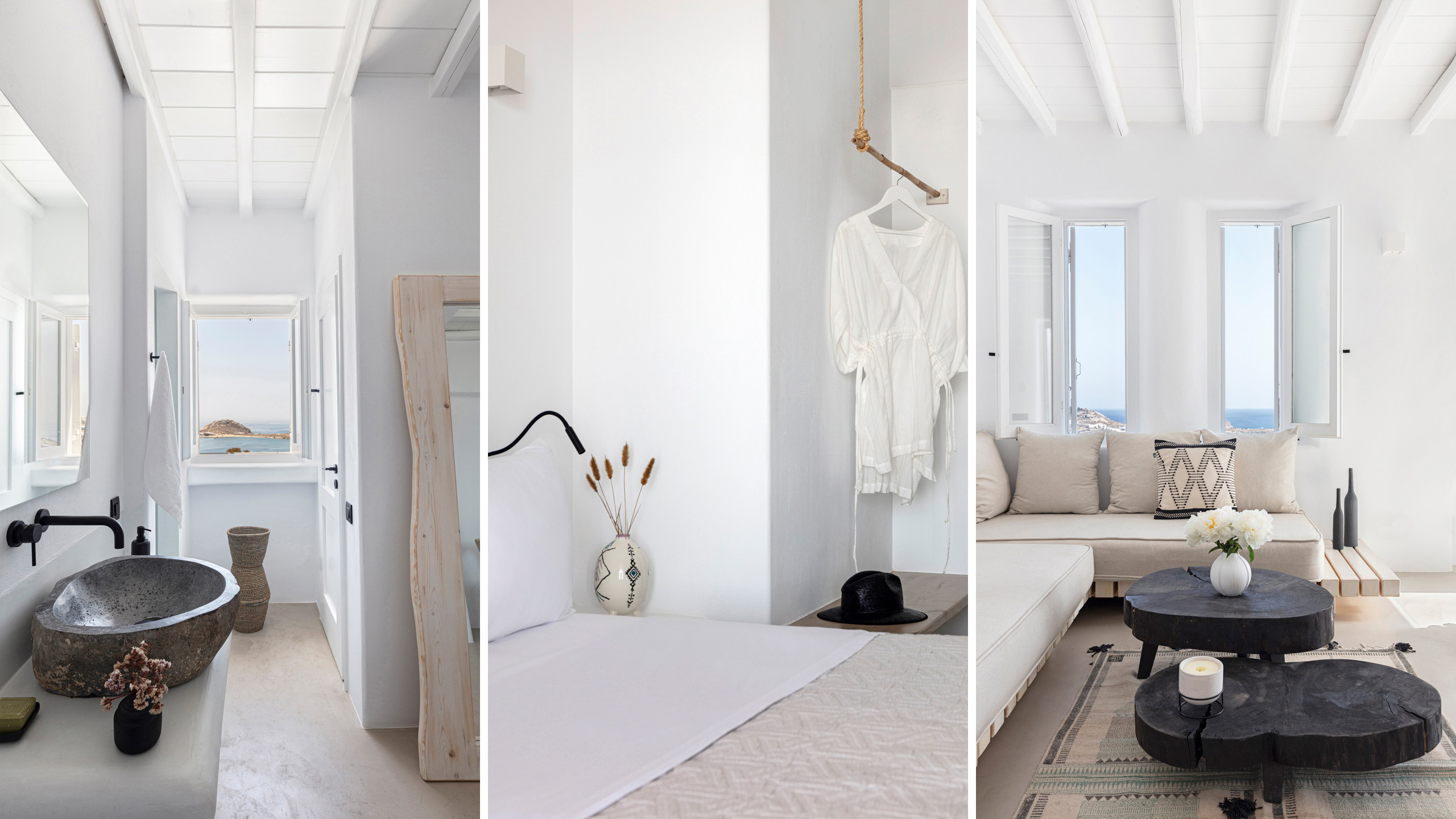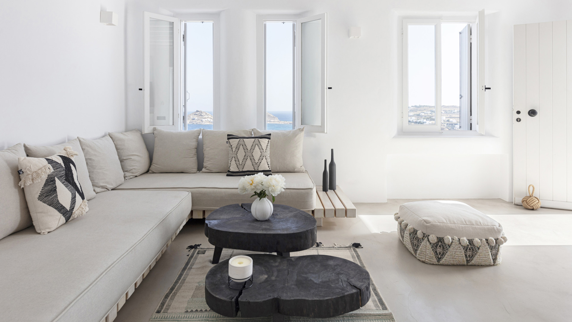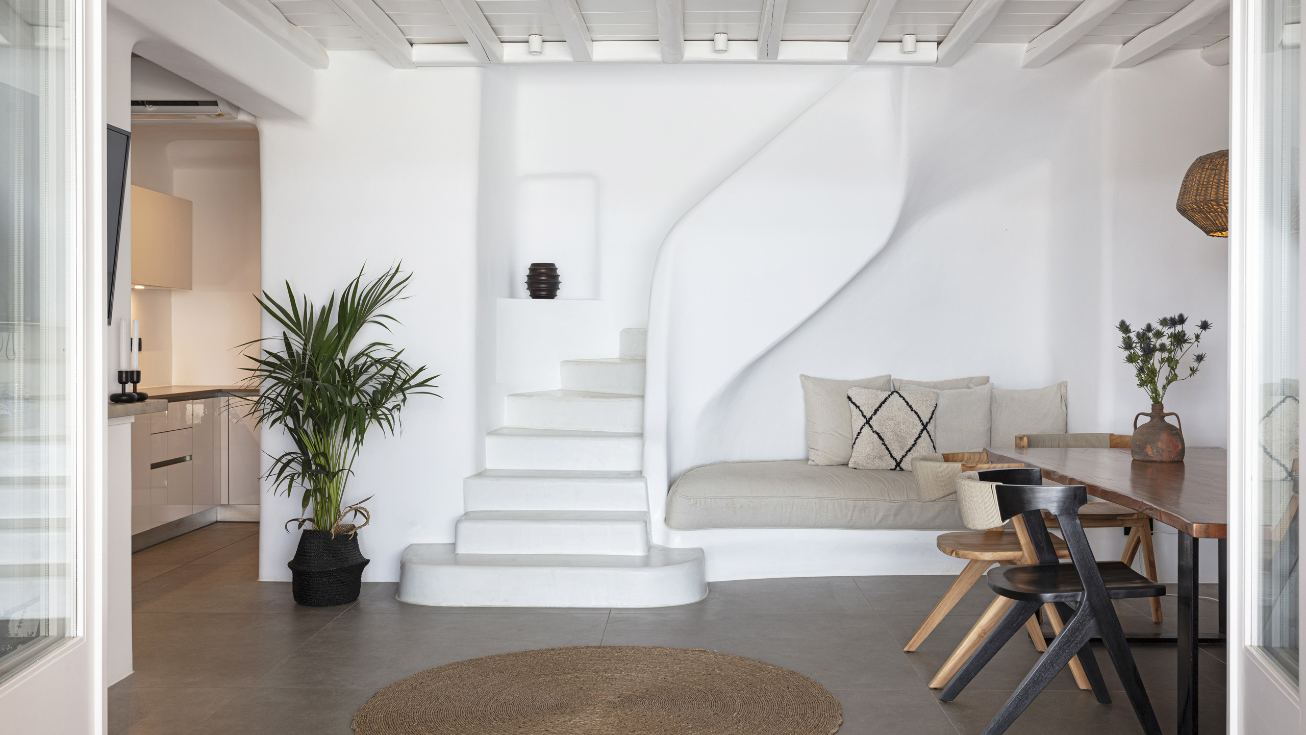 The property spans three levels, housing the bedrooms, and its style is simple and informal, featuring characteristic elements of Mykonian tradition.