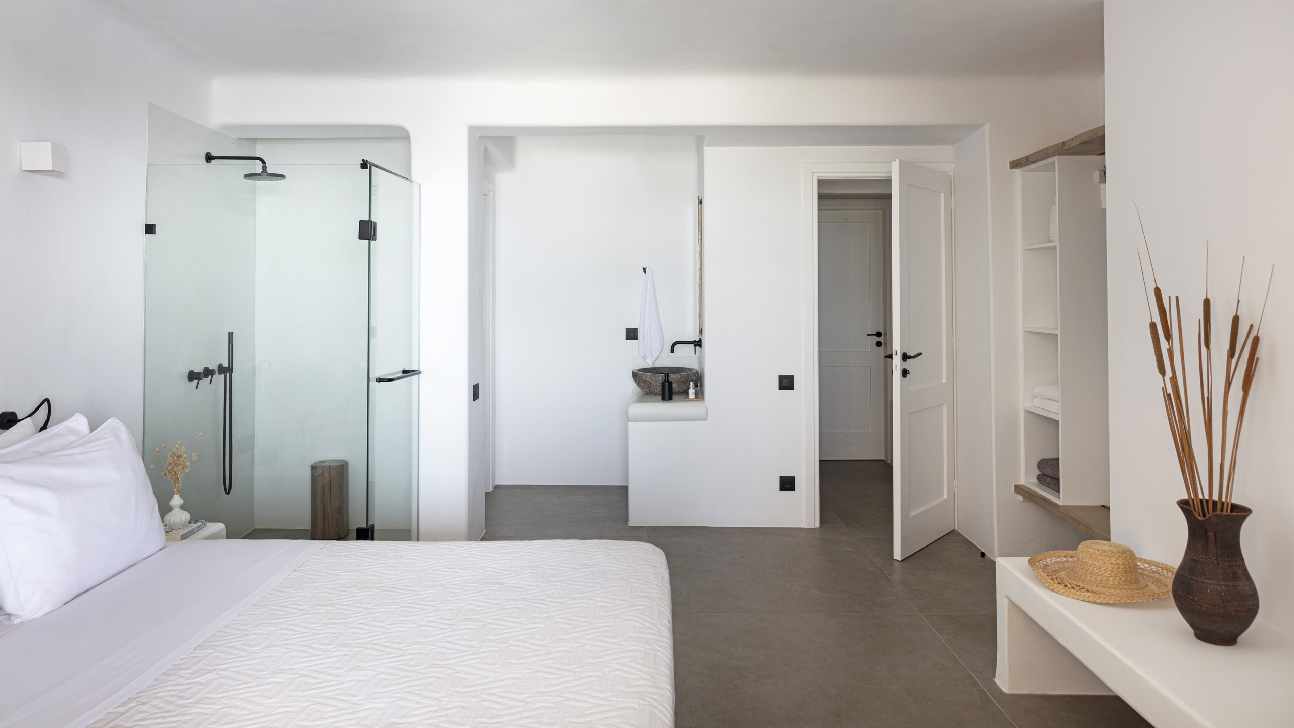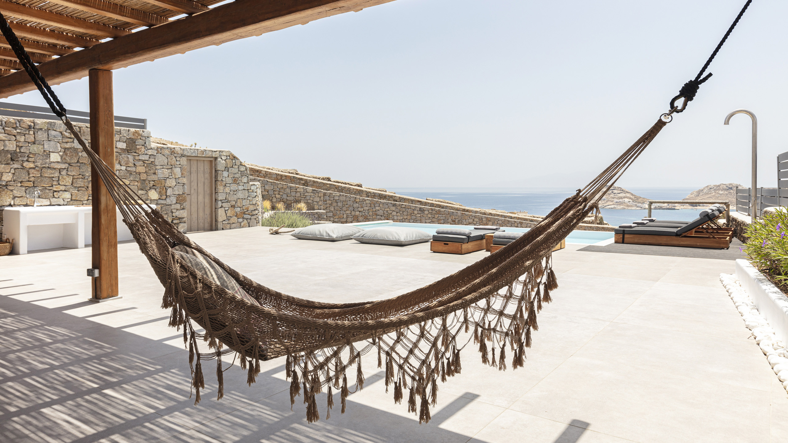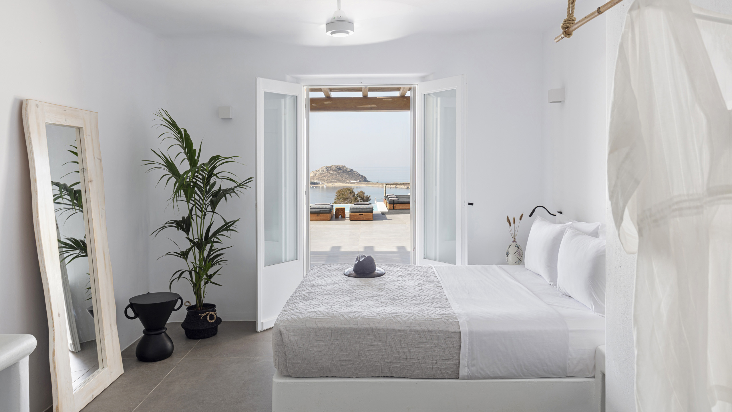 The property spans three levels, housing the bedrooms, and its style is simple and informal, featuring characteristic elements of Mykonian tradition.