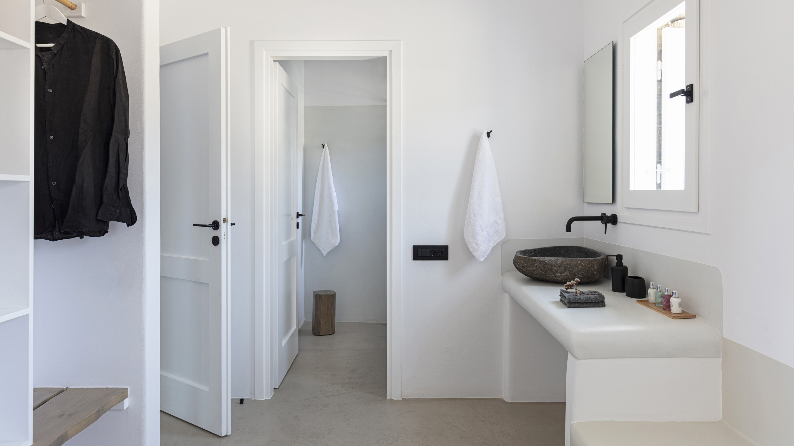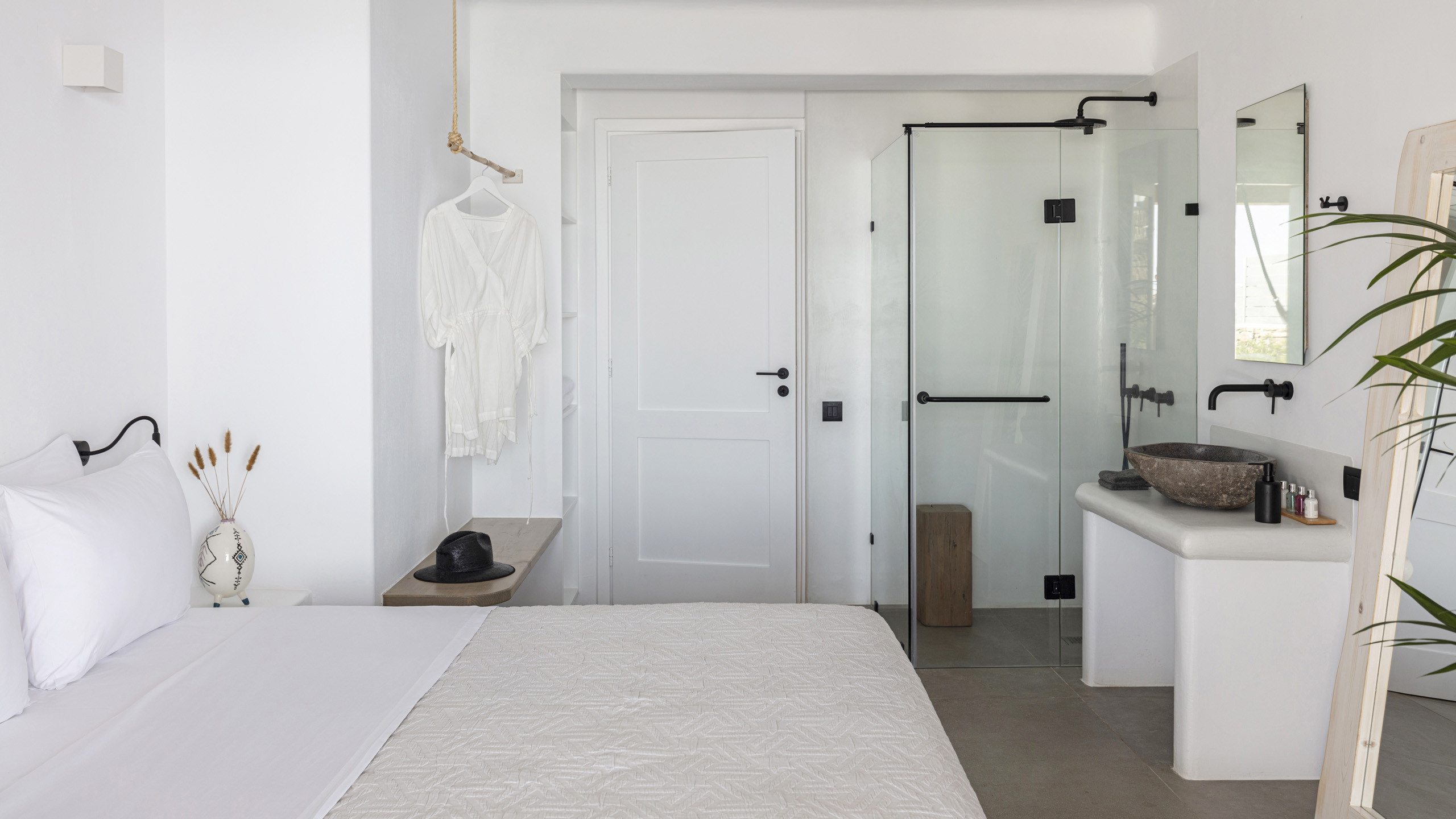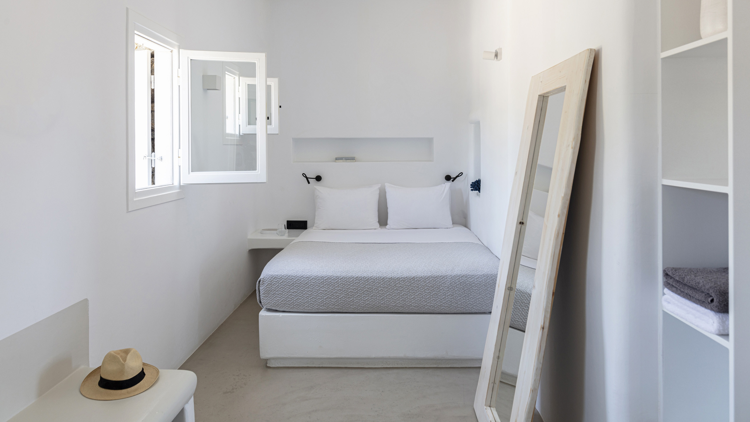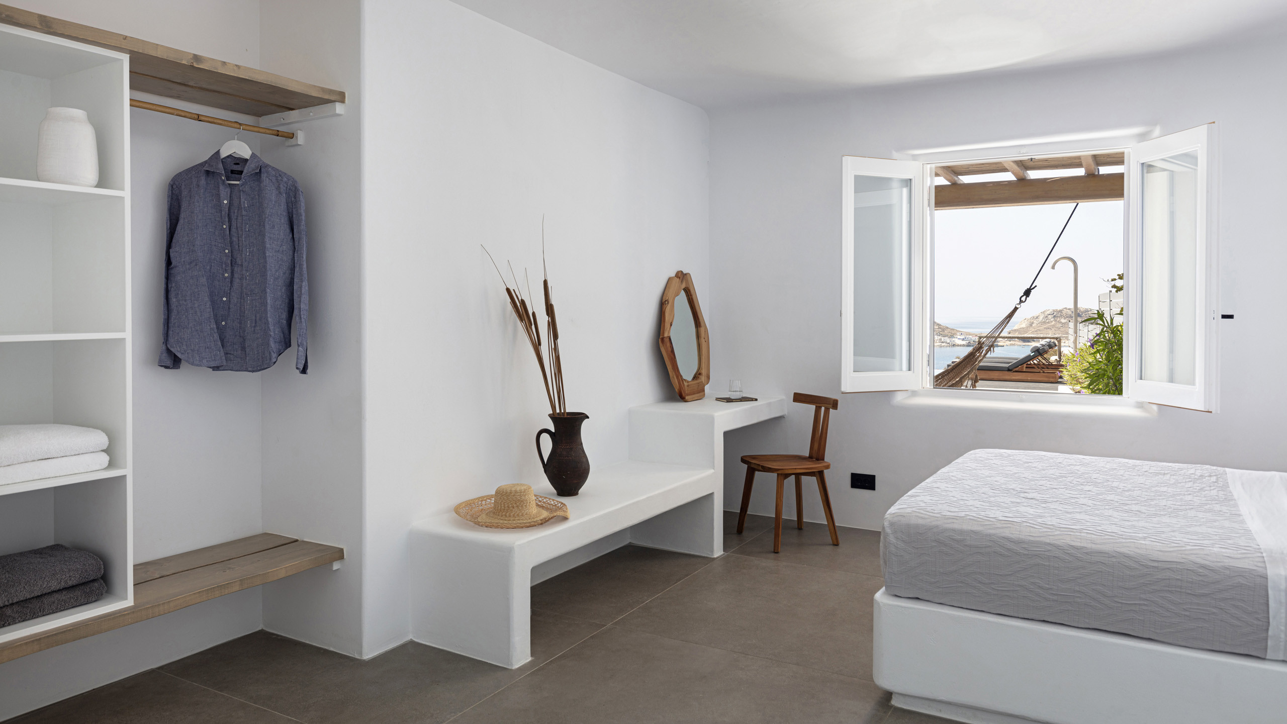 The property spans three levels, housing the bedrooms, and its style is simple and informal, featuring characteristic elements of Mykonian tradition.