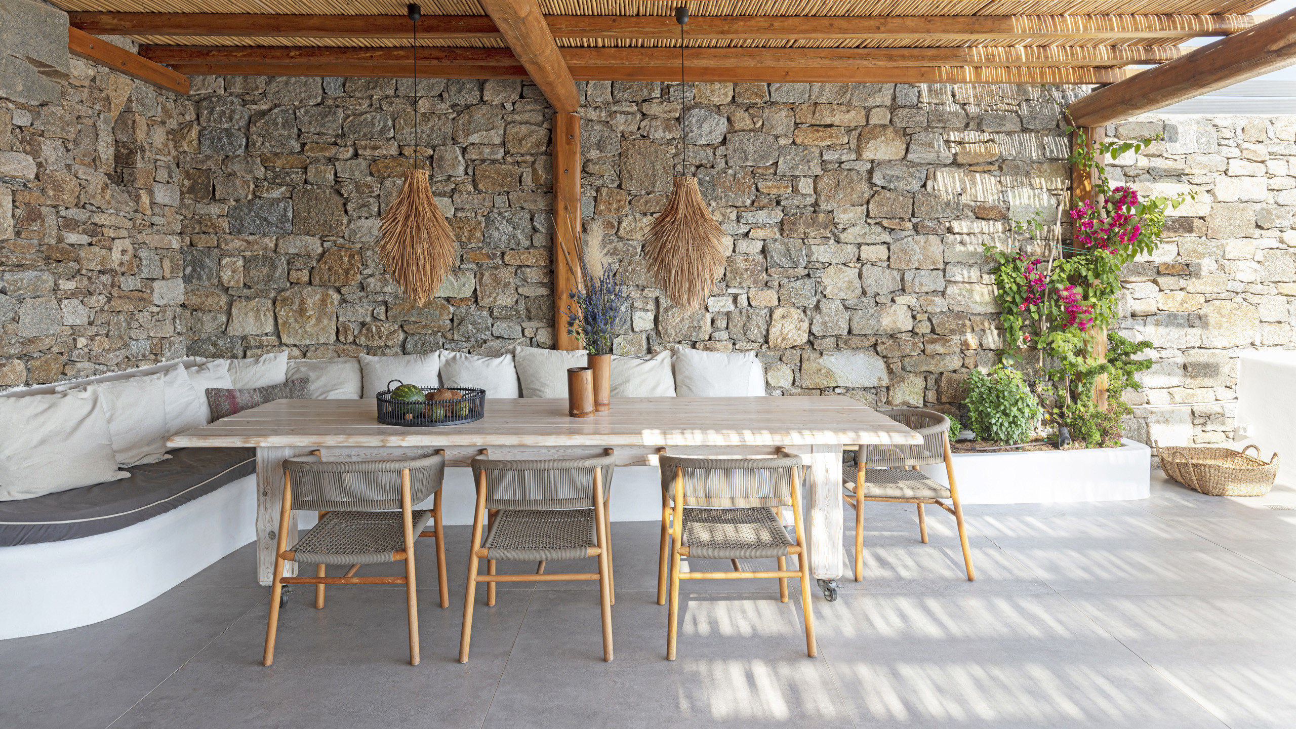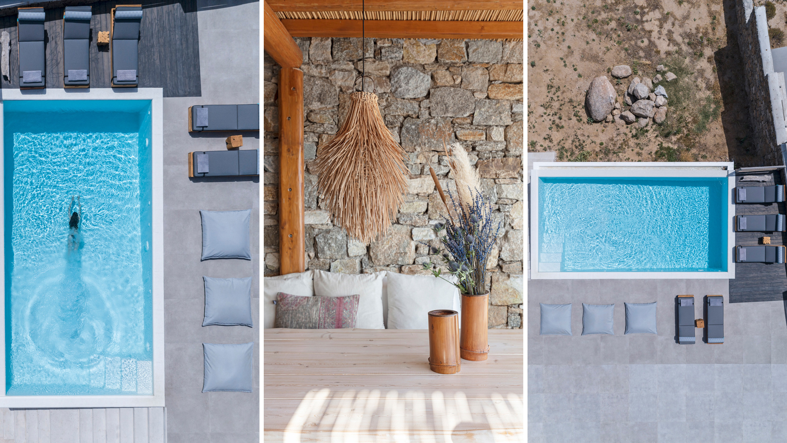 The outdoor areas are simple and well-executed, with the pool commanding the main terrace and a pleasant covered dining area, perfect for gatherings and enjoying an aperitif at any time of the day.