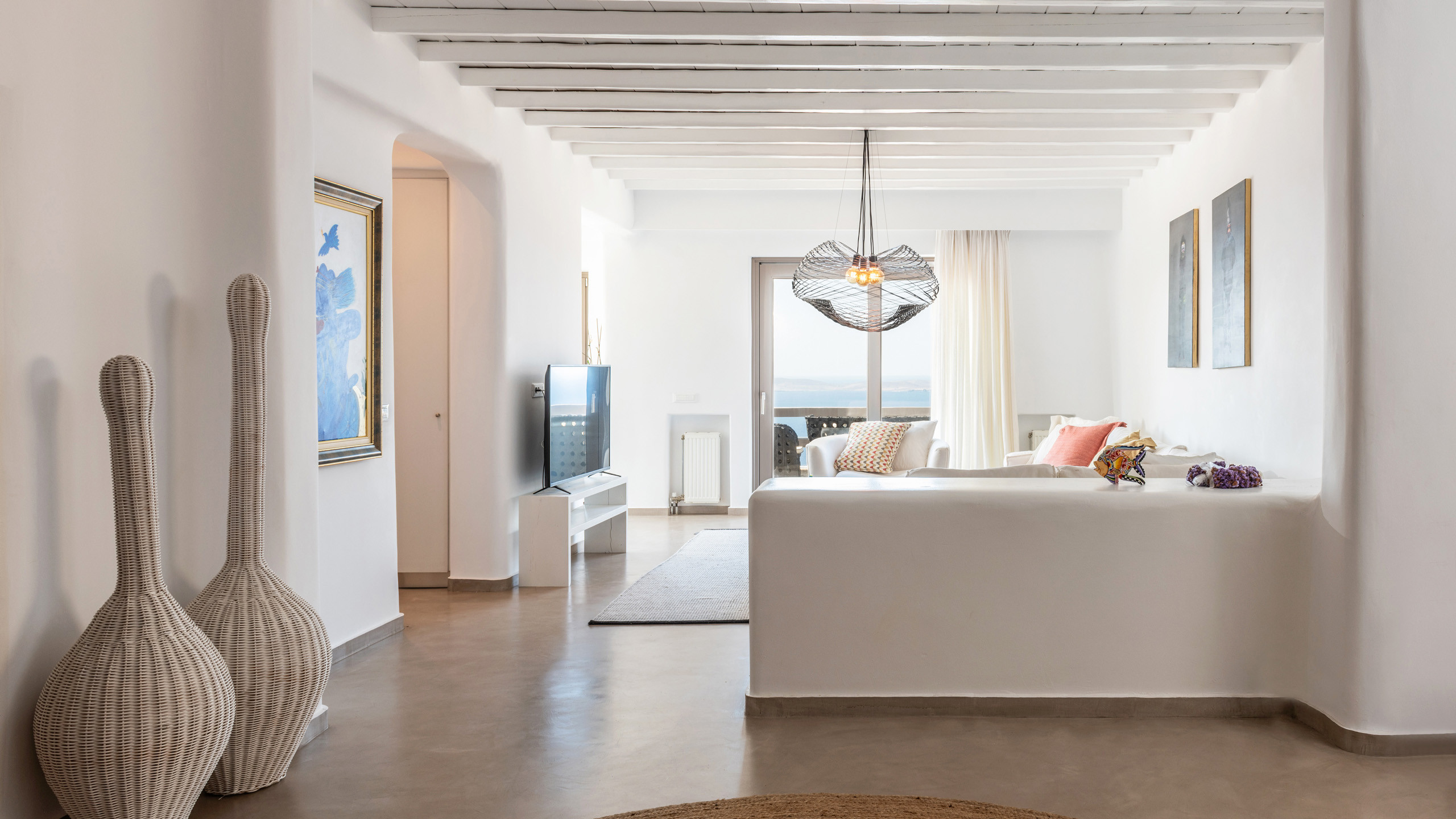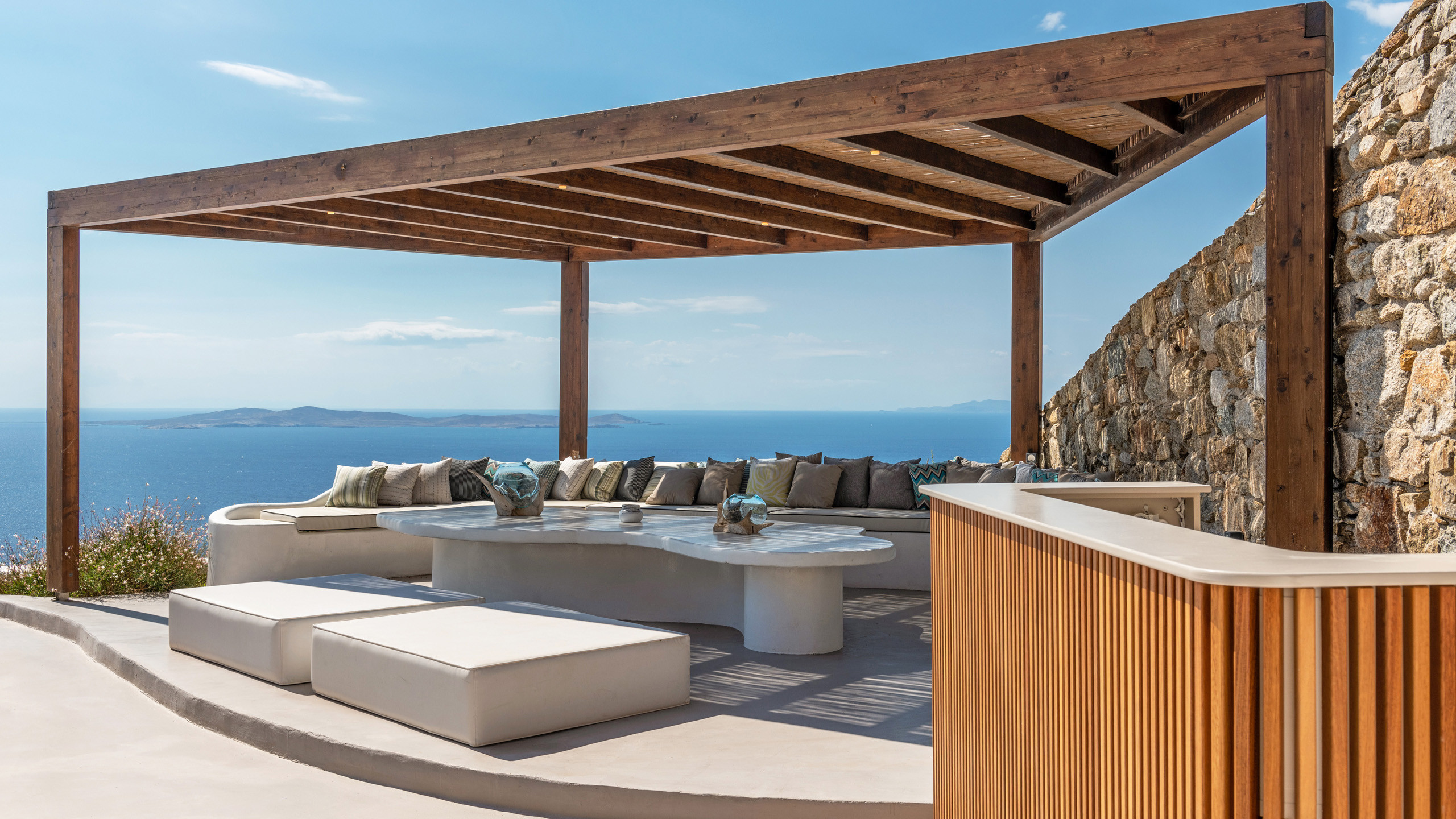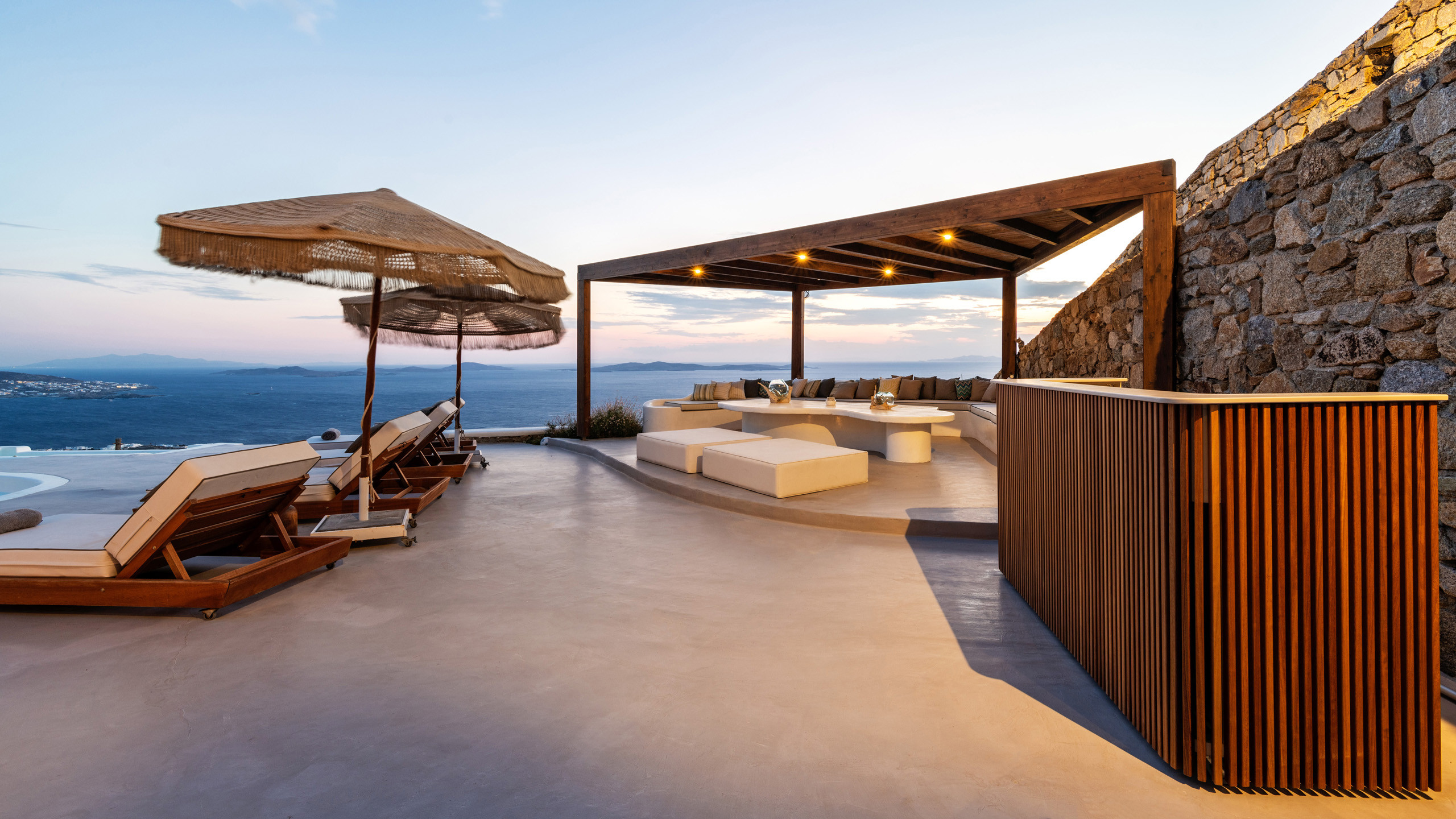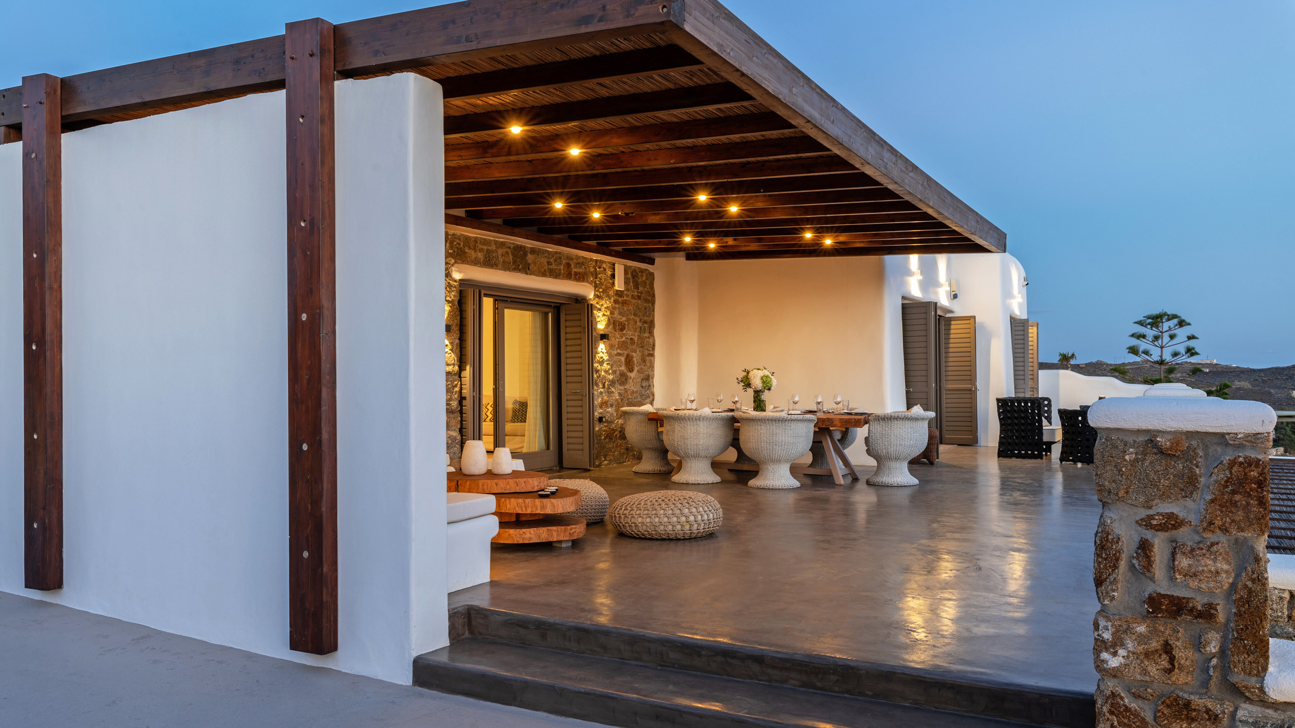 The Tourlos area has seen a significant increase in prominent properties, including undoubtedly Magneto, a private villa with a modern and captivating taste. From its advantageous position, it enjoys a magnificent panoramic view of the sea and sunset, maintaining a certain privacy as the area is not too frequented by large tourist flows.
