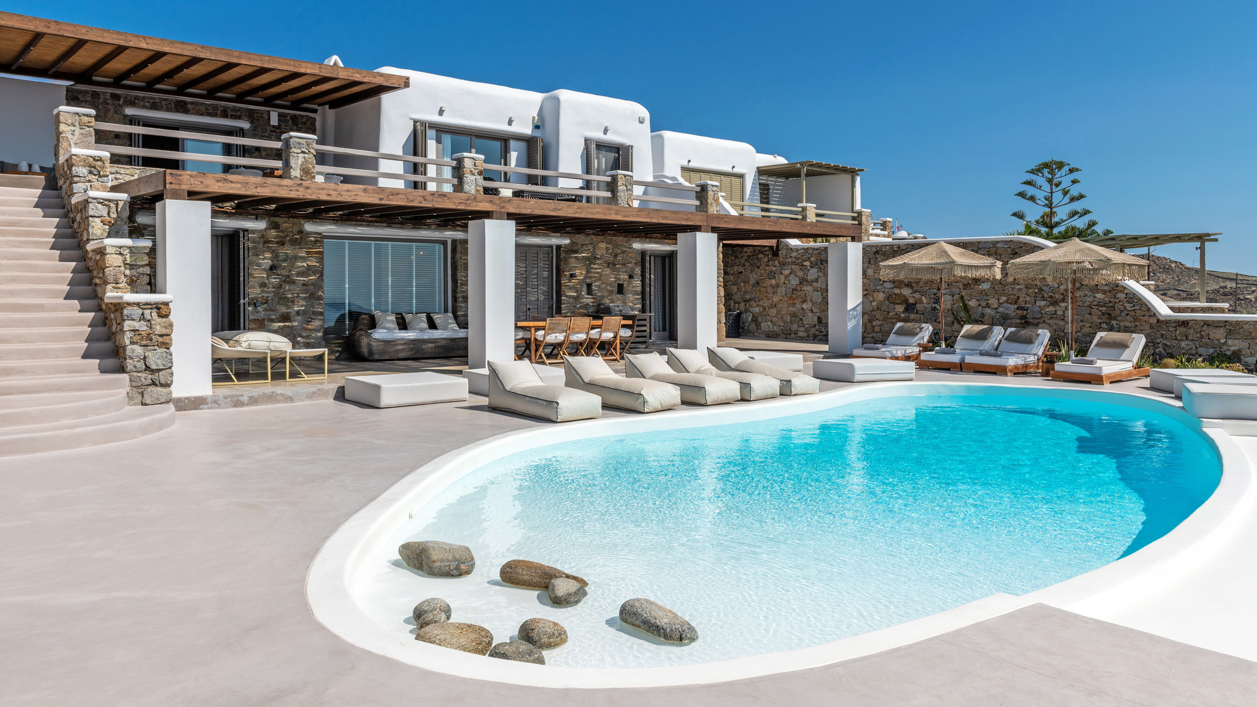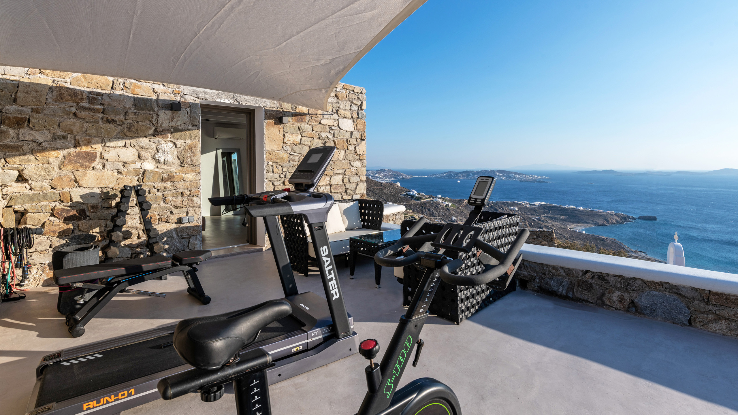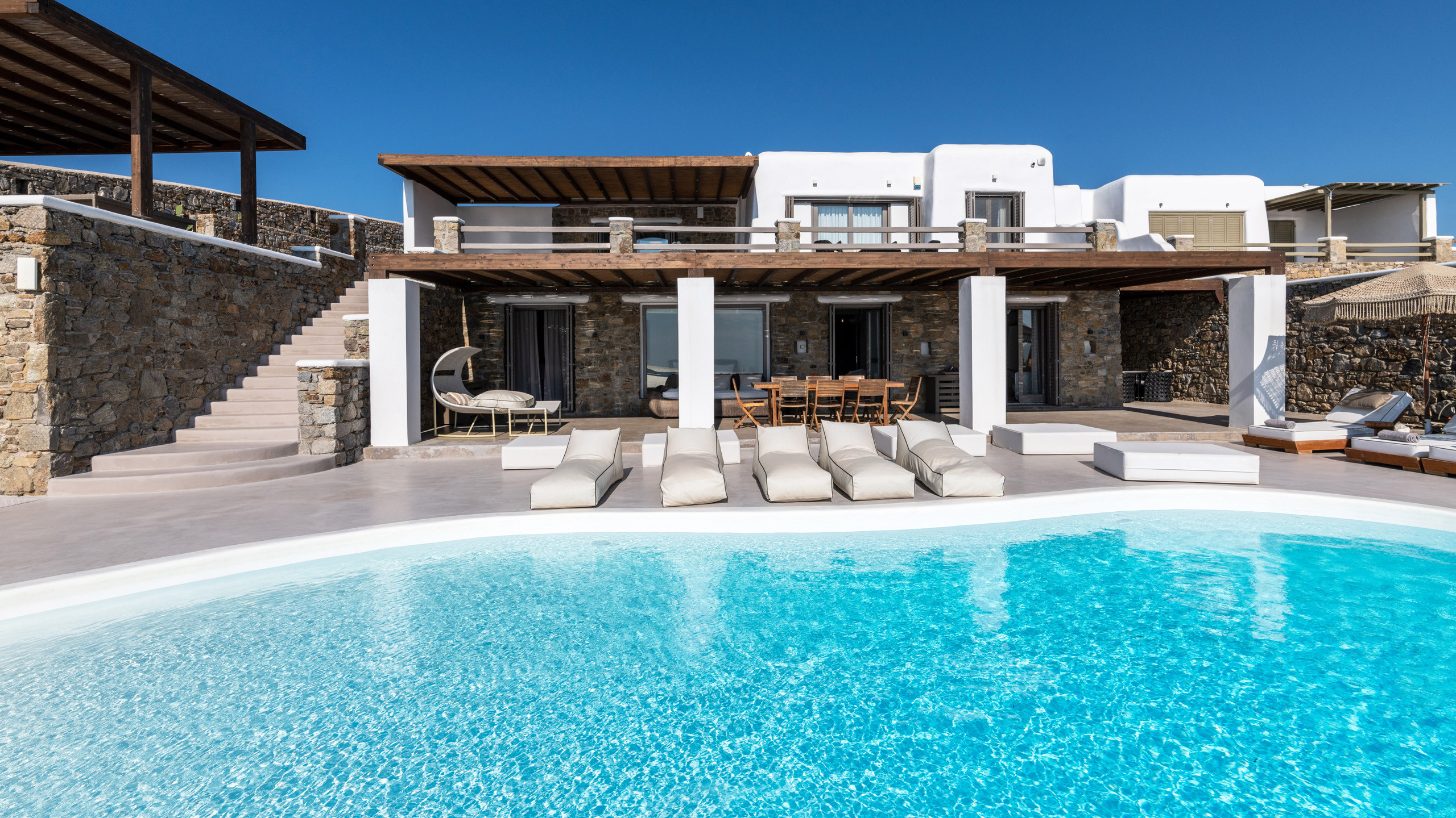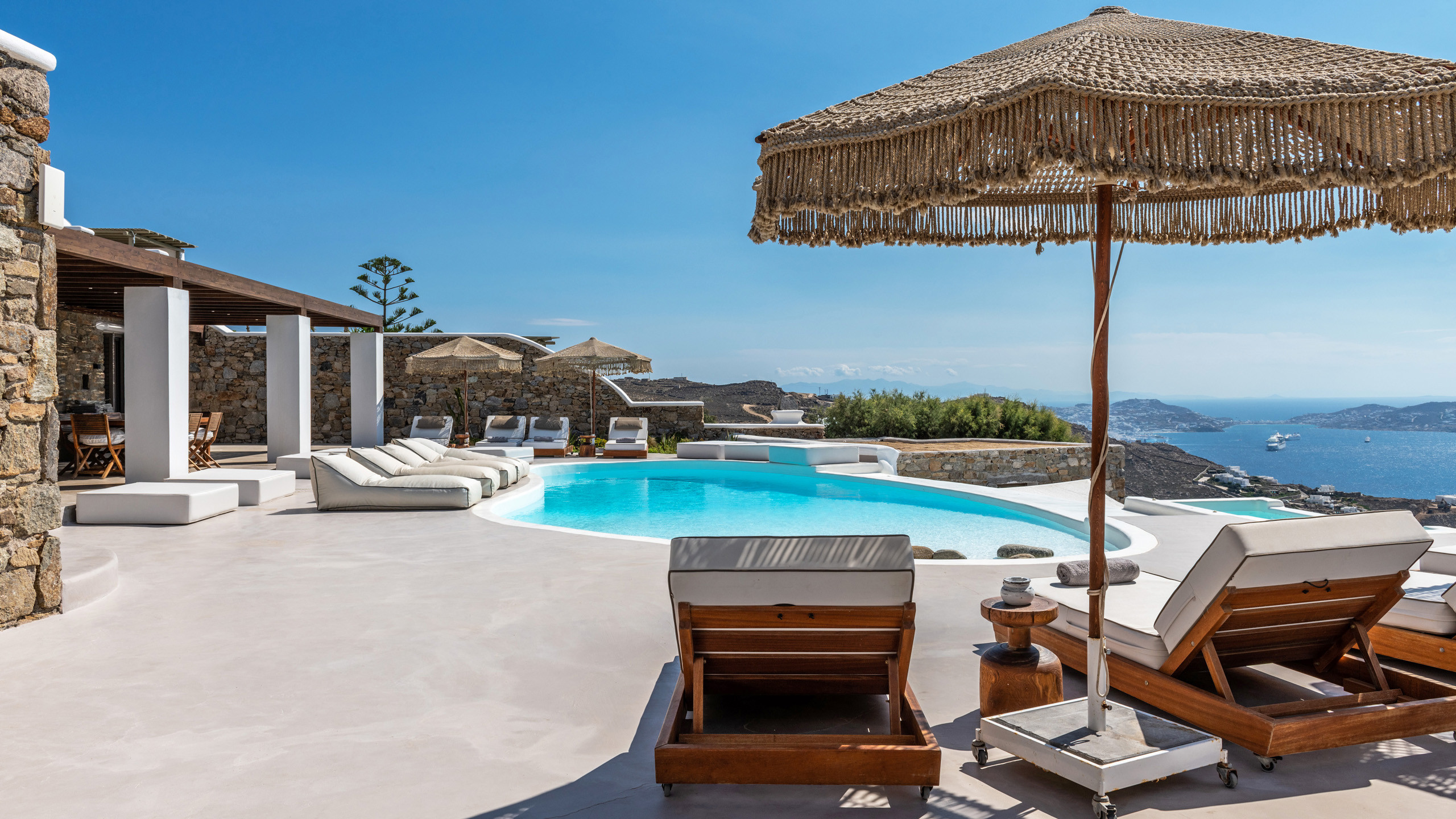 The exteriors are well executed, with the main terrace hosting an inviting private pool and an enjoyable Jacuzzi for the well-being of guests. A short distance away is the inevitable pergola, providing pleasant shade for the dining area, and numerous well-furnished lounges/relaxation areas with a contemporary flair nearby. For the incurable sports enthusiasts, there is an outdoor gym available for workouts while admiring the splendid view, a cherry on top that enriches the overall setting.