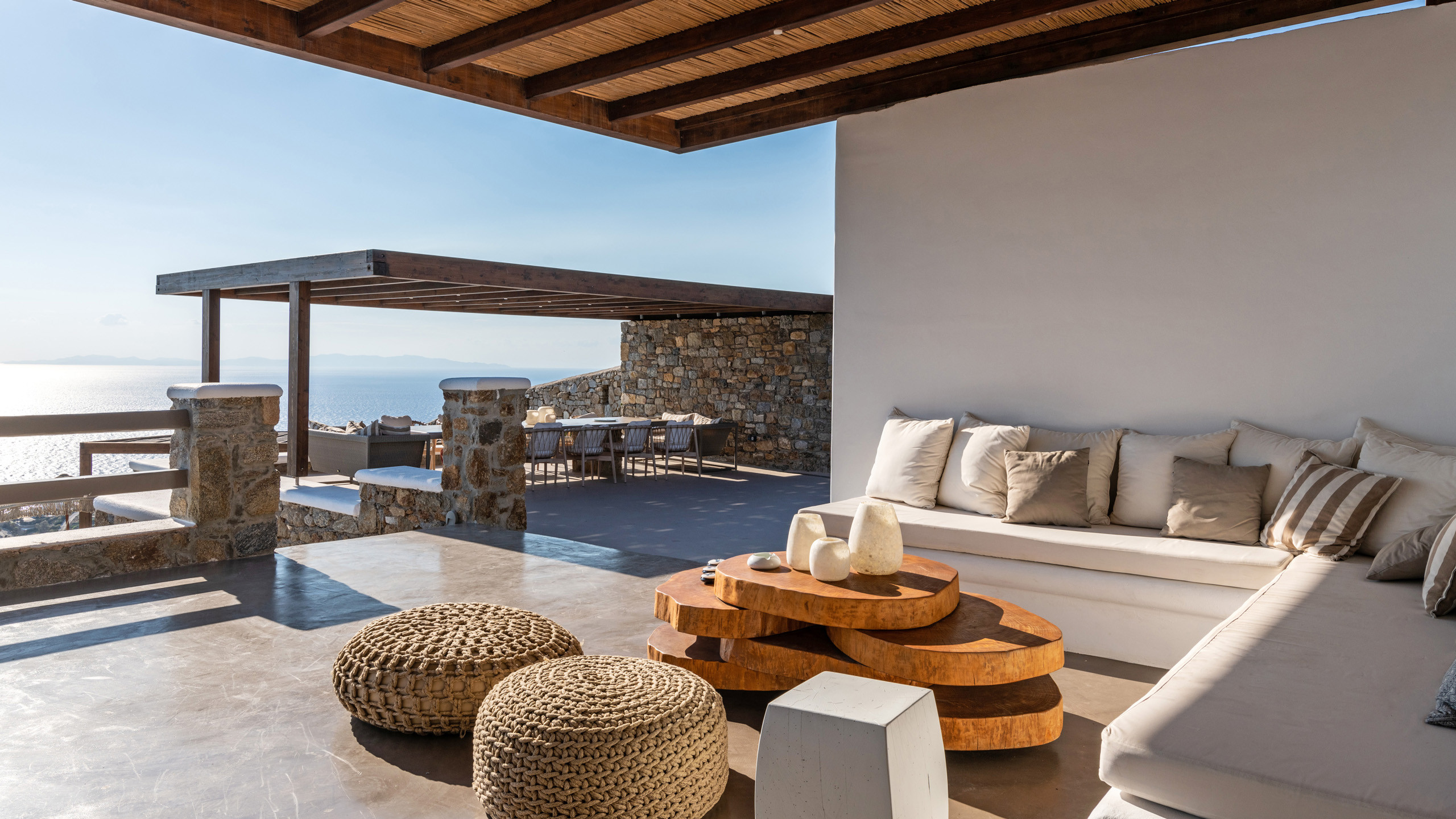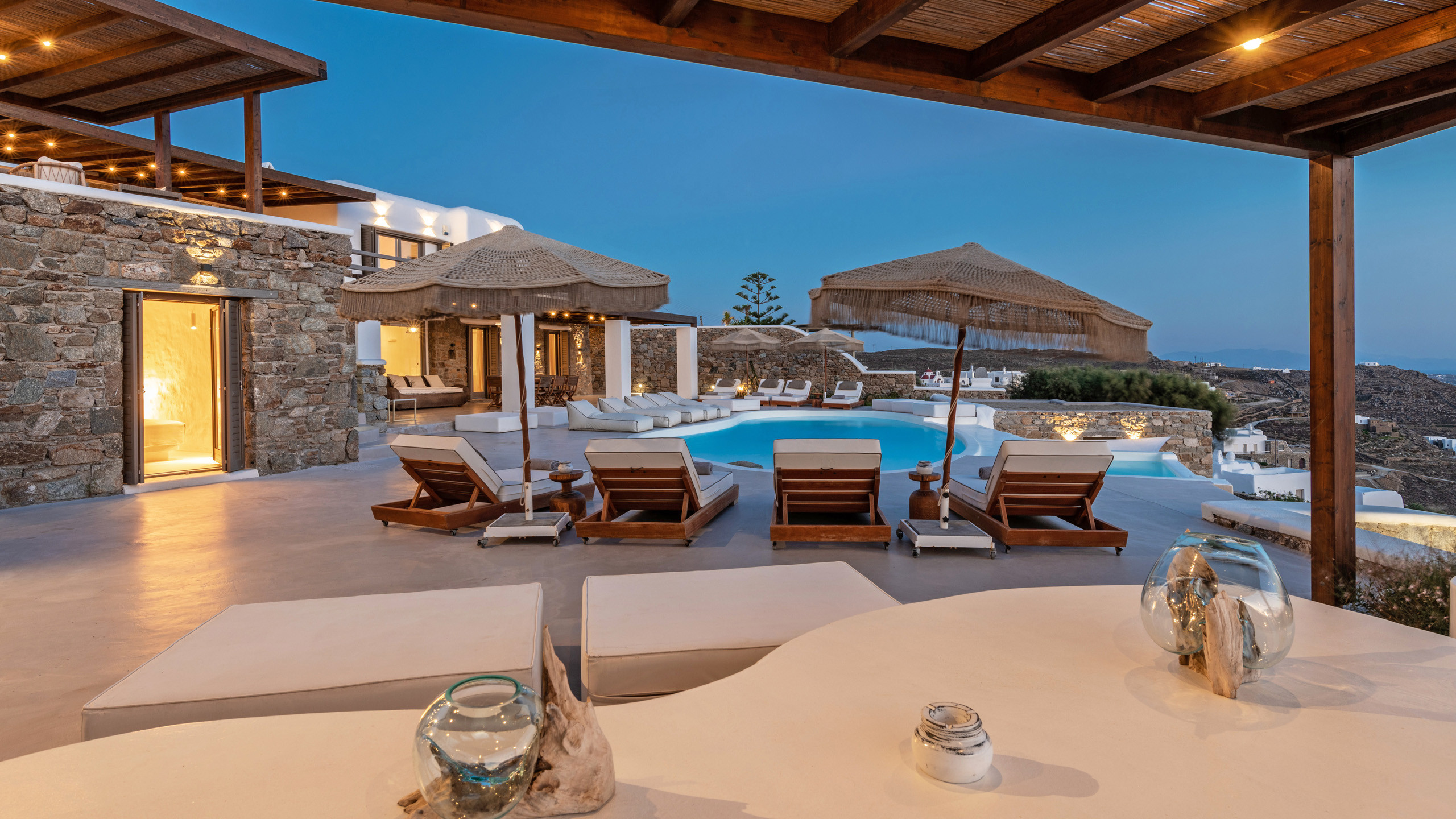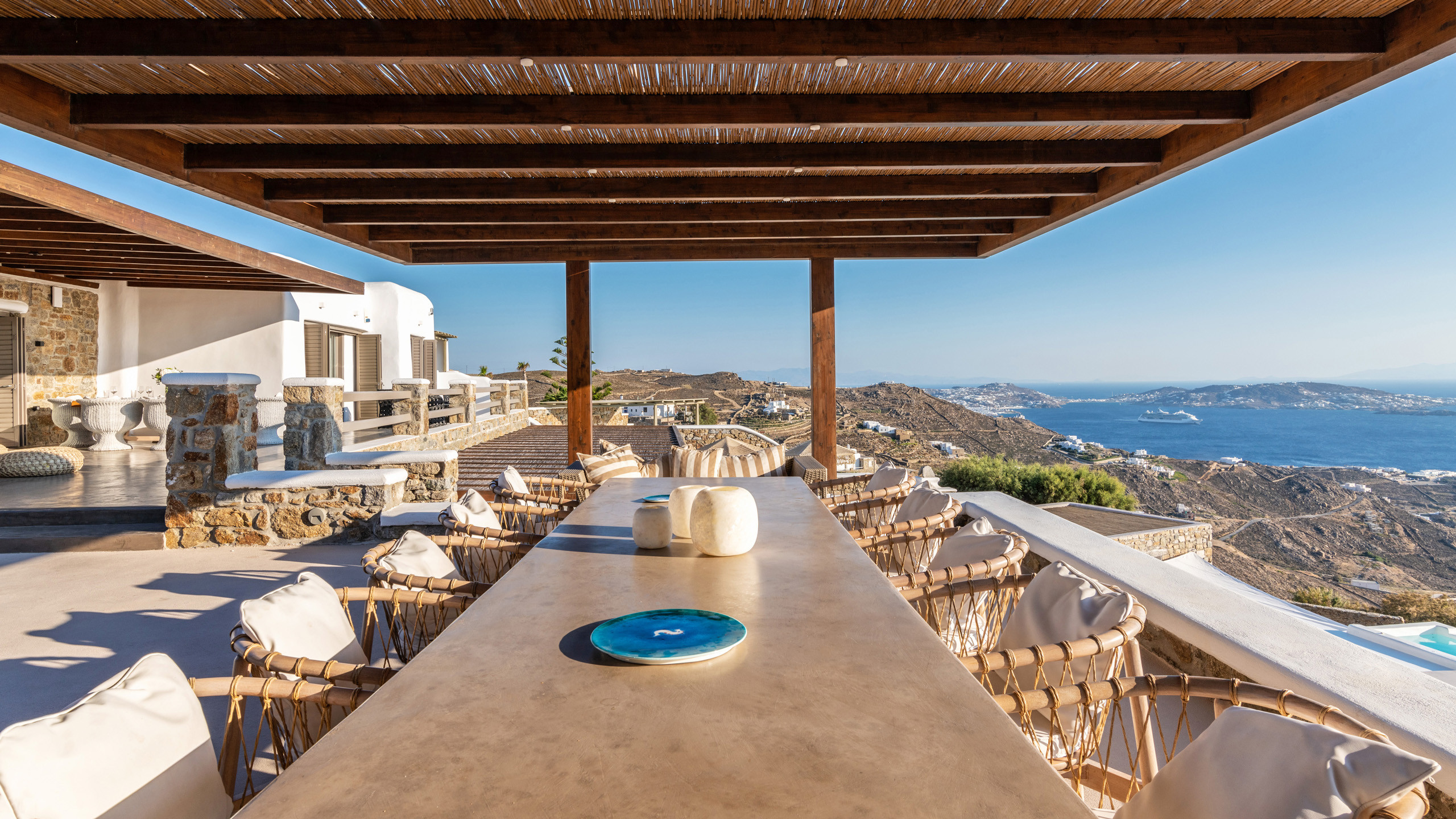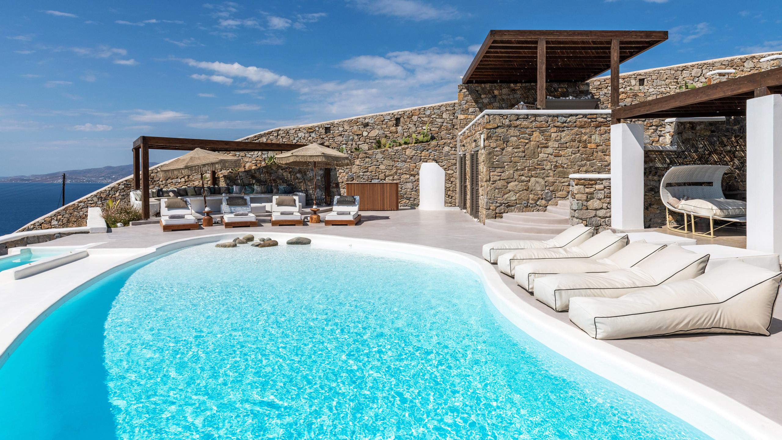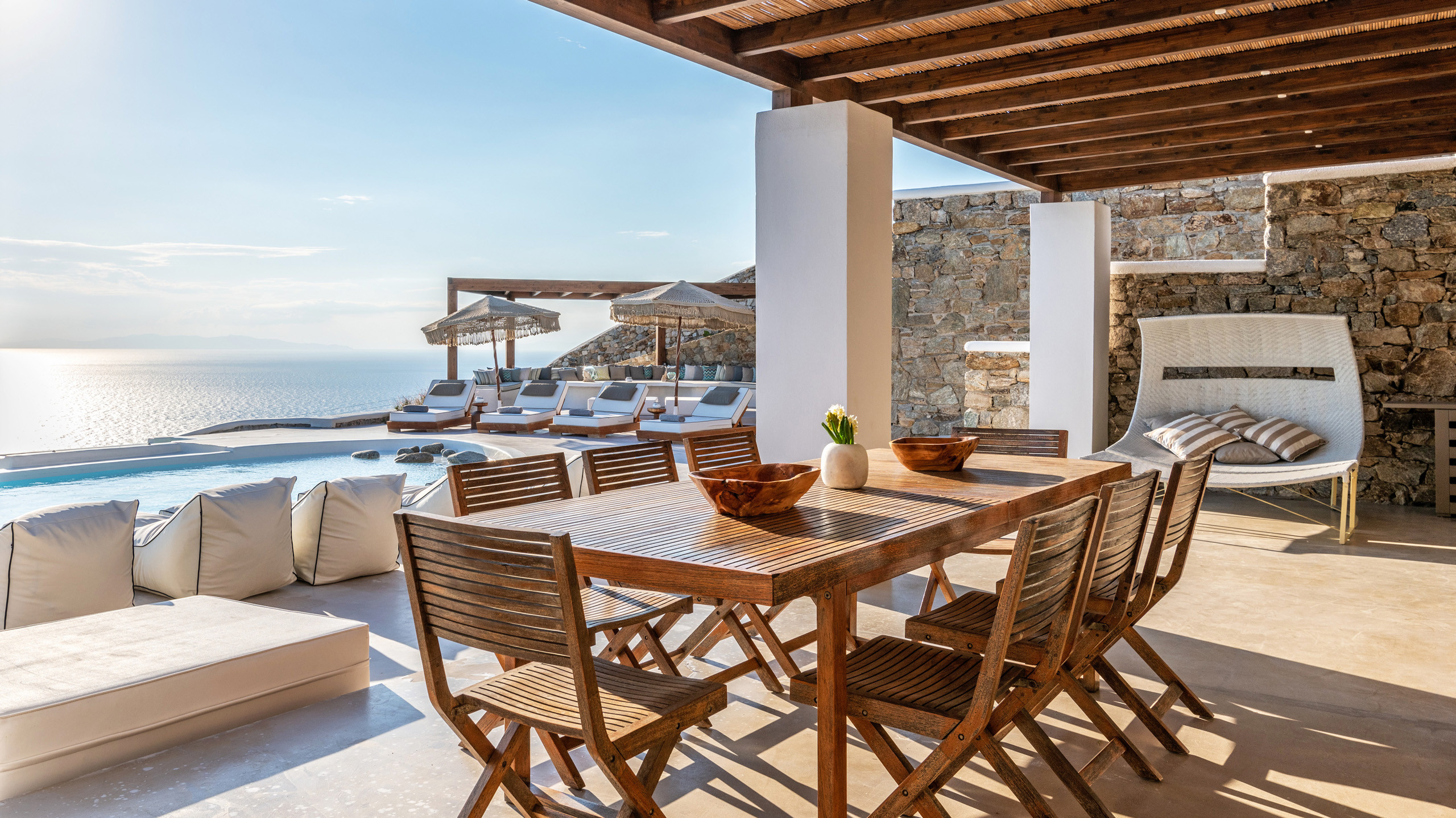 The exteriors are well executed, with the main terrace hosting an inviting private pool and an enjoyable Jacuzzi for the well-being of guests. A short distance away is the inevitable pergola, providing pleasant shade for the dining area, and numerous well-furnished lounges/relaxation areas with a contemporary flair nearby. For the incurable sports enthusiasts, there is an outdoor gym available for workouts while admiring the splendid view, a cherry on top that enriches the overall setting.