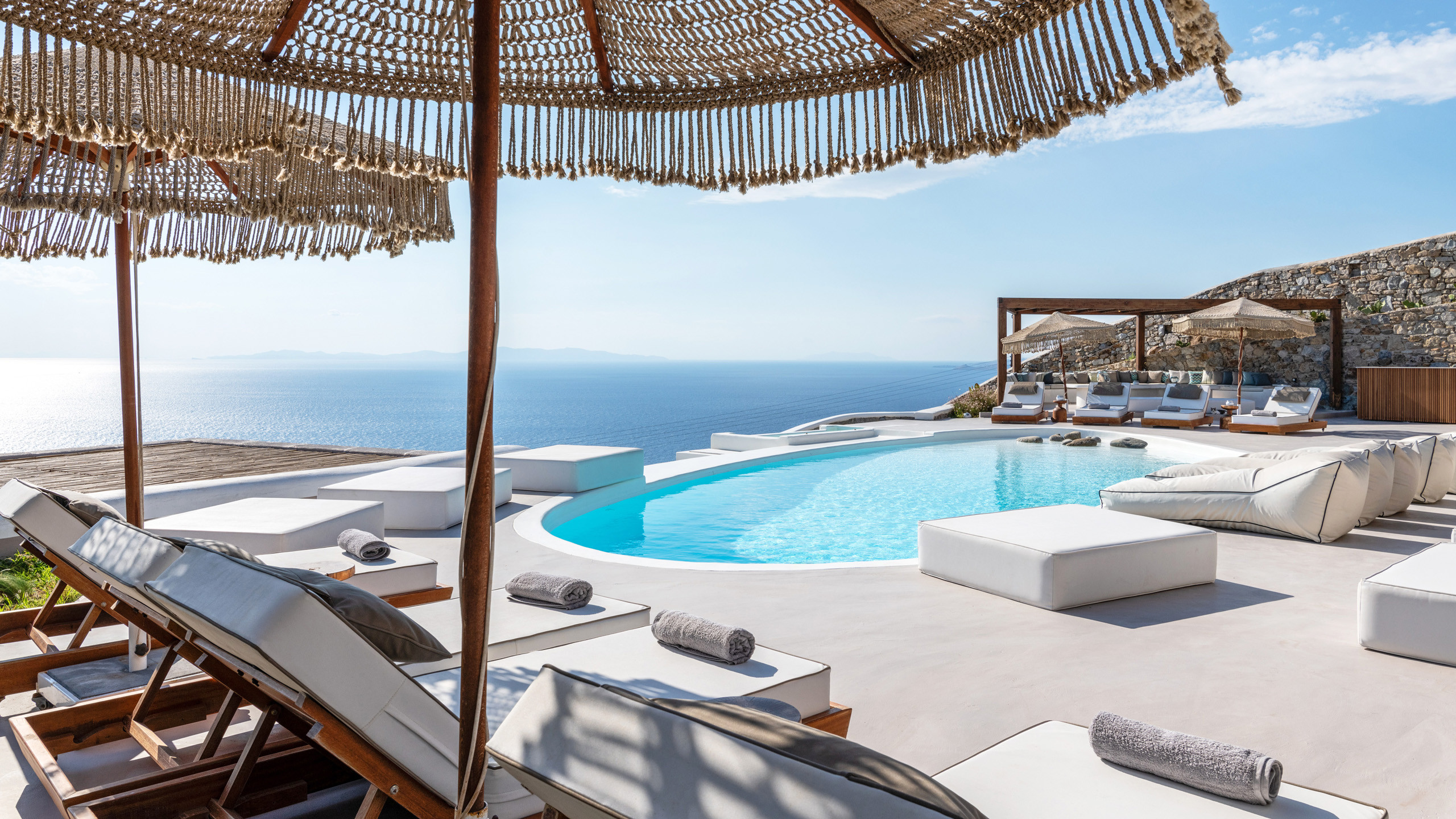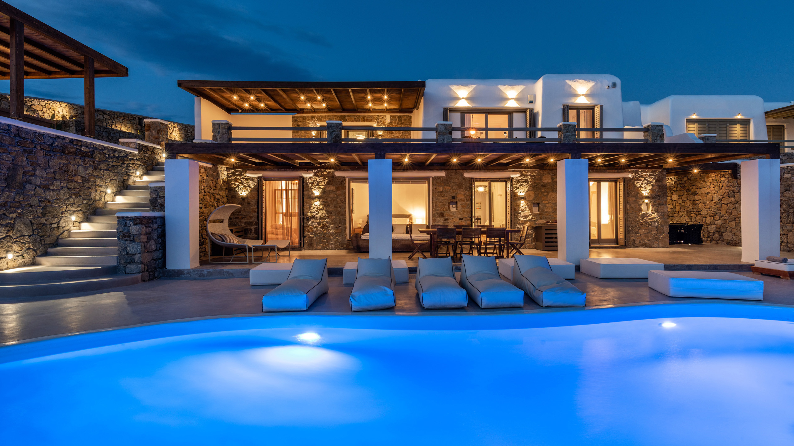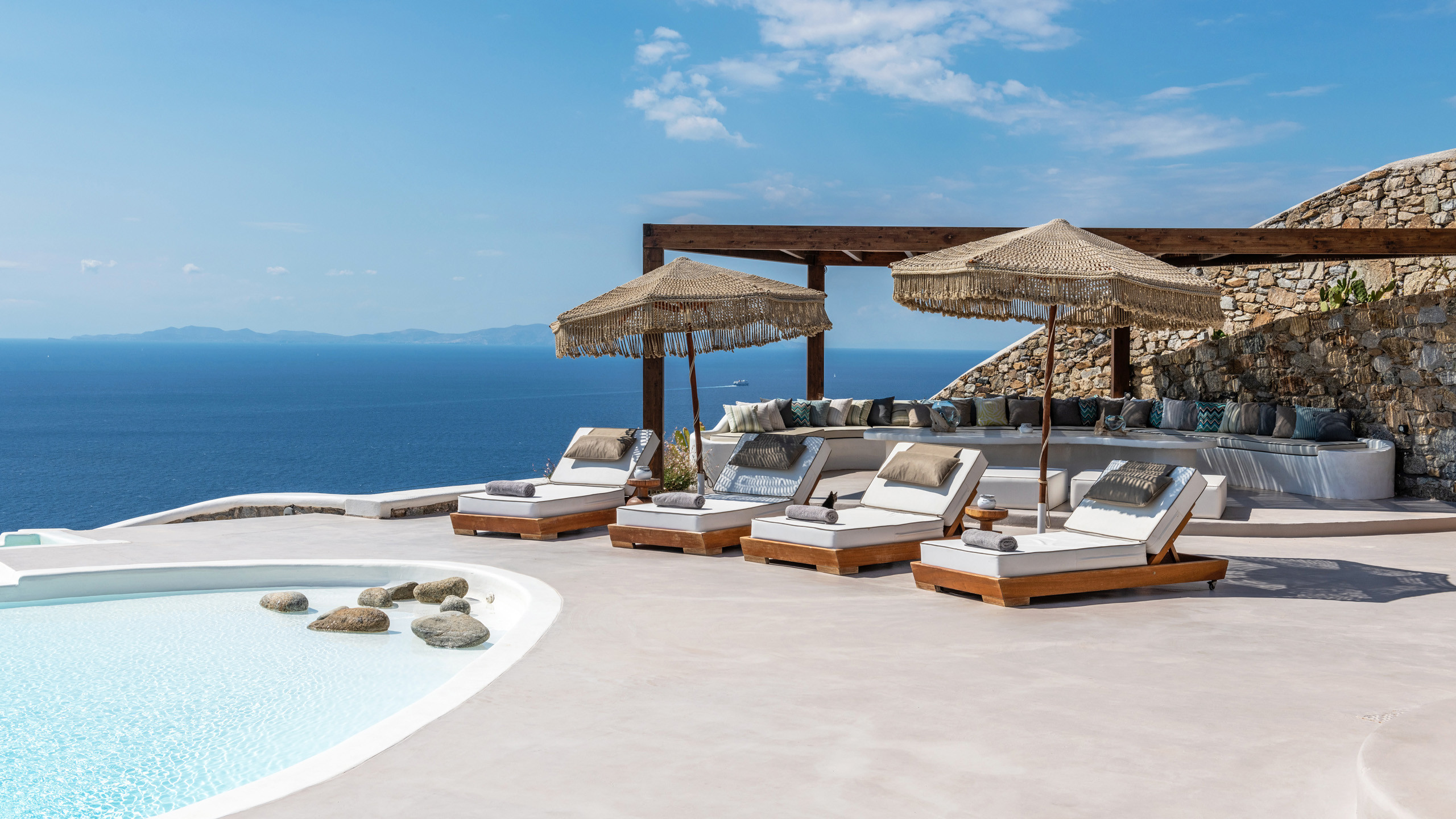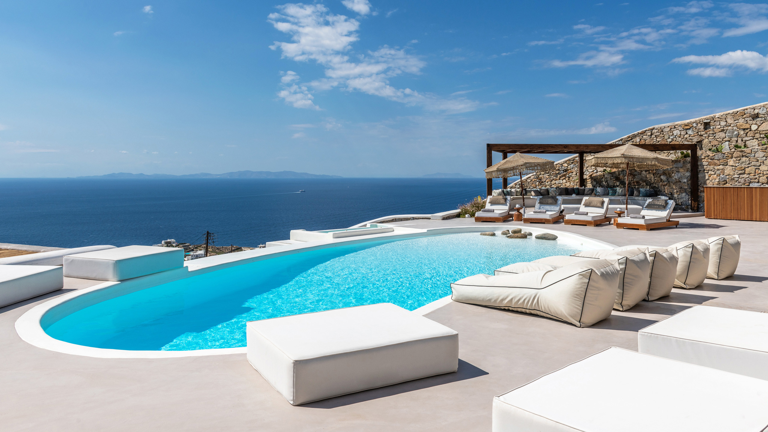 The exteriors are well executed, with the main terrace hosting an inviting private pool and an enjoyable Jacuzzi for the well-being of guests. A short distance away is the inevitable pergola, providing pleasant shade for the dining area, and numerous well-furnished lounges/relaxation areas with a contemporary flair nearby. For the incurable sports enthusiasts, there is an outdoor gym available for workouts while admiring the splendid view, a cherry on top that enriches the overall setting.