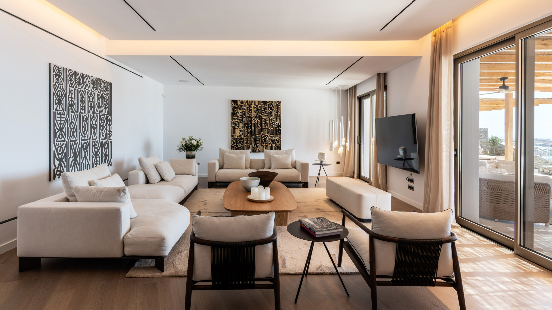 The interiors of Symphony Estate are elegant, luxurious, and refined, with great attention to both the materials used and the furnishings. Warm tones and a clear modern approach characterize the design, without unnecessary excesses or extravagance. All spaces are incredibly welcoming and comfortable, equipped with the latest technological amenities in both the common areas and the bedrooms distributed on two levels facing the respective pools.