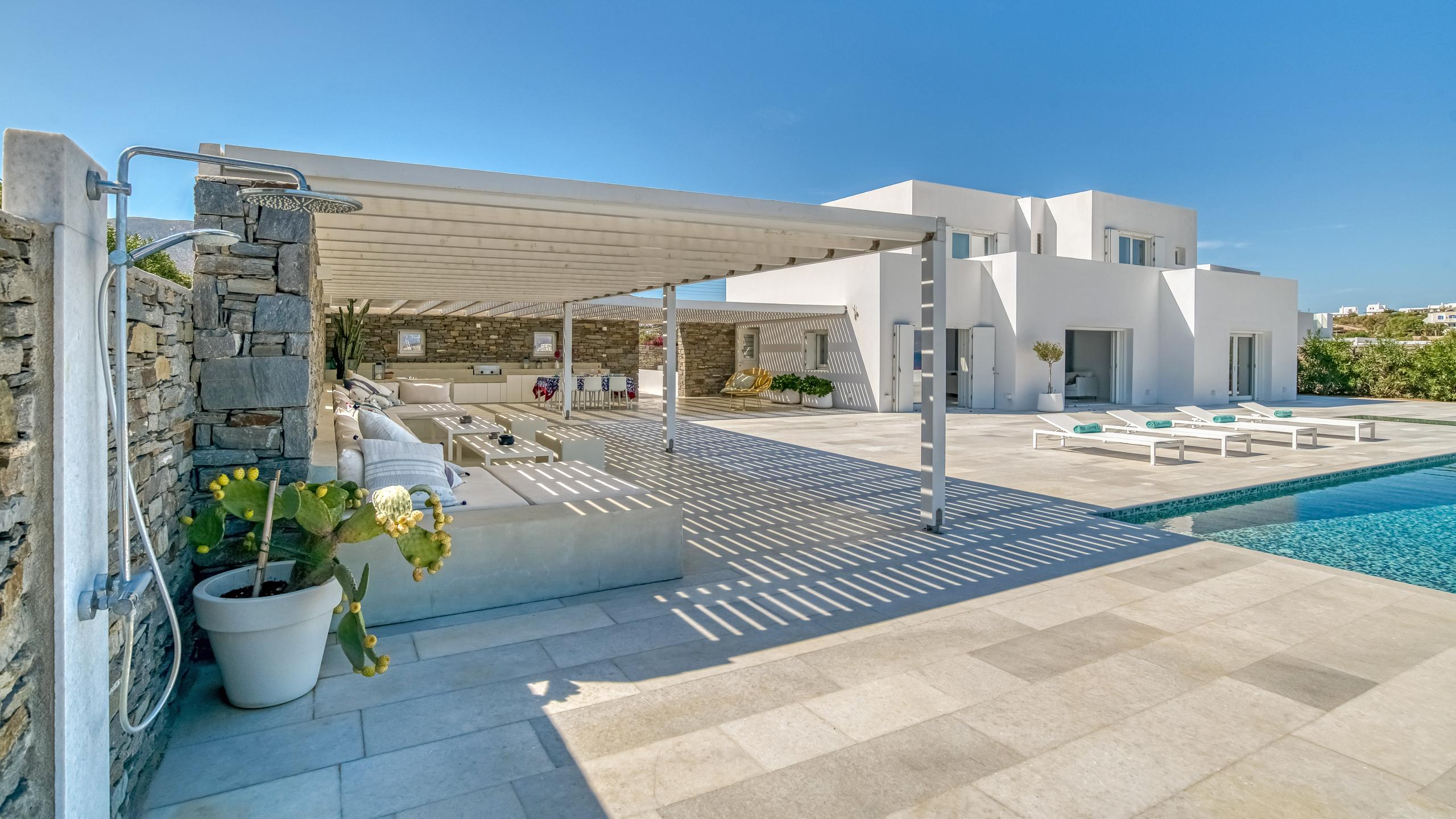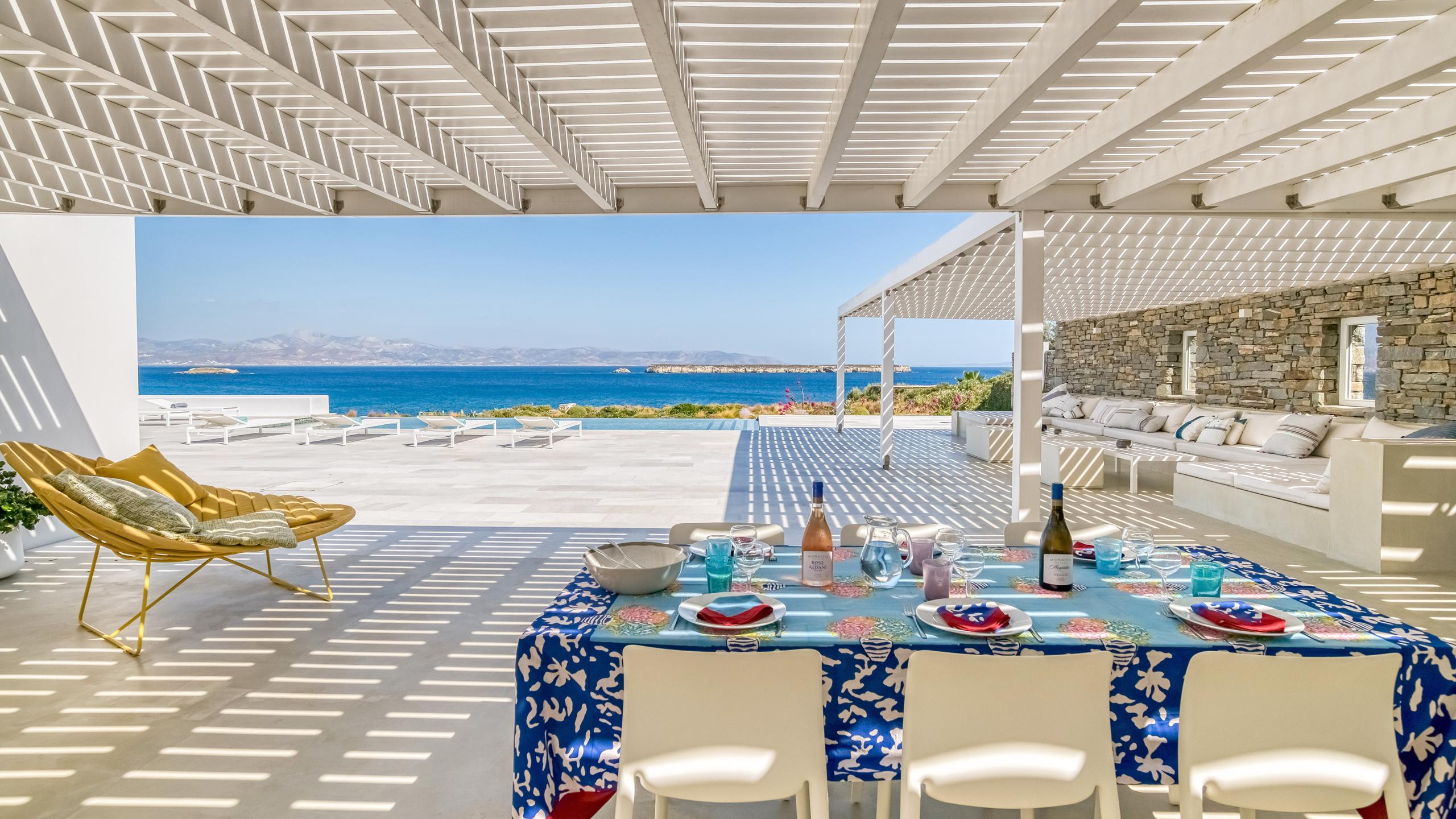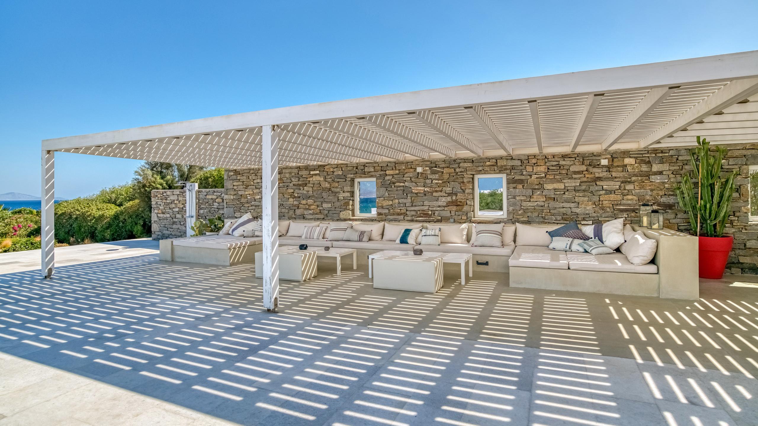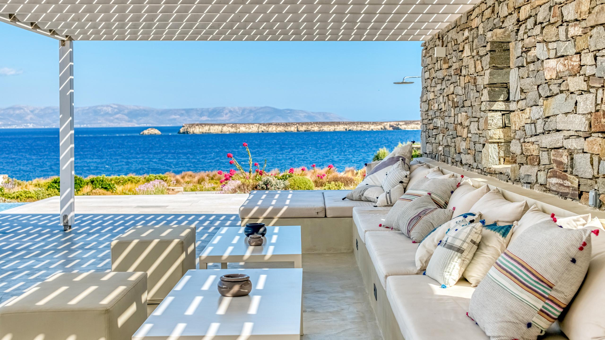 The exteriors are welcoming and refined, with an inviting infinity pool taking center stage on the front terrace, and a spacious pergola—typical of Cycladic tradition—hosting a charming lounge and outdoor dining area, all framed by the breathtaking sea view as a priceless backdrop.