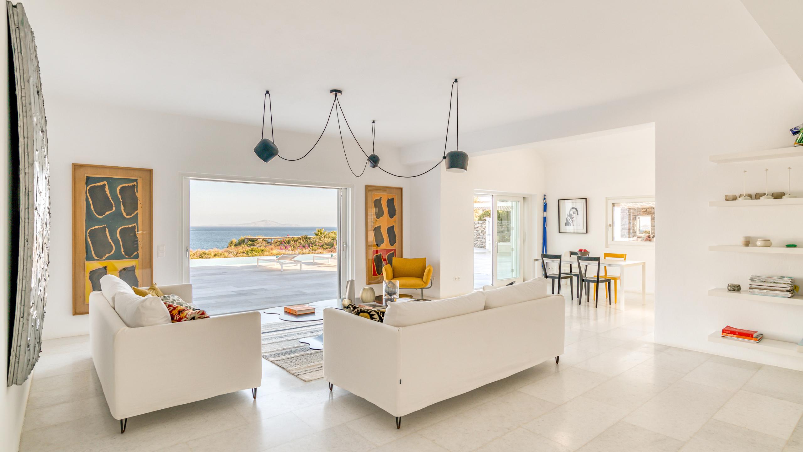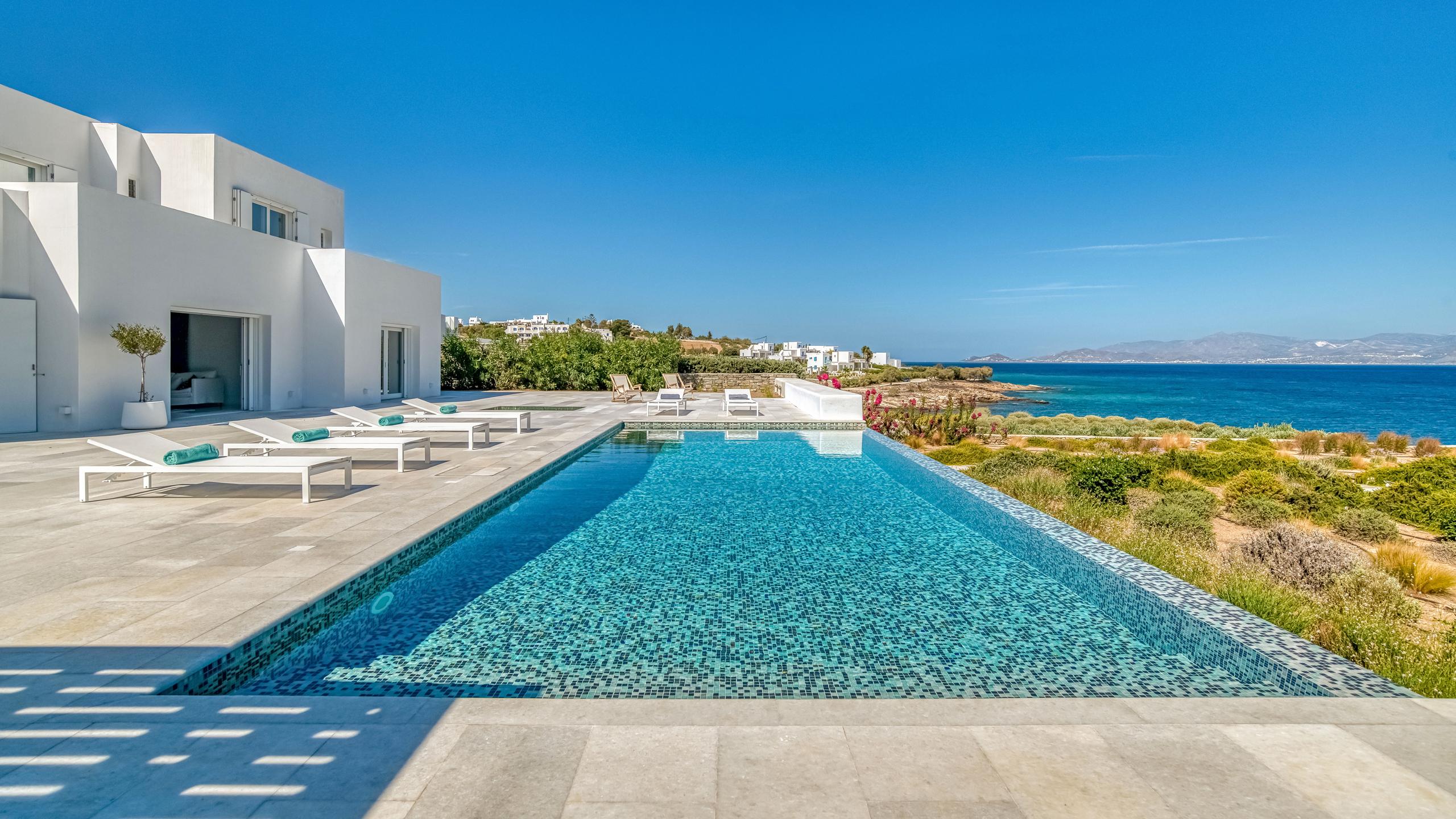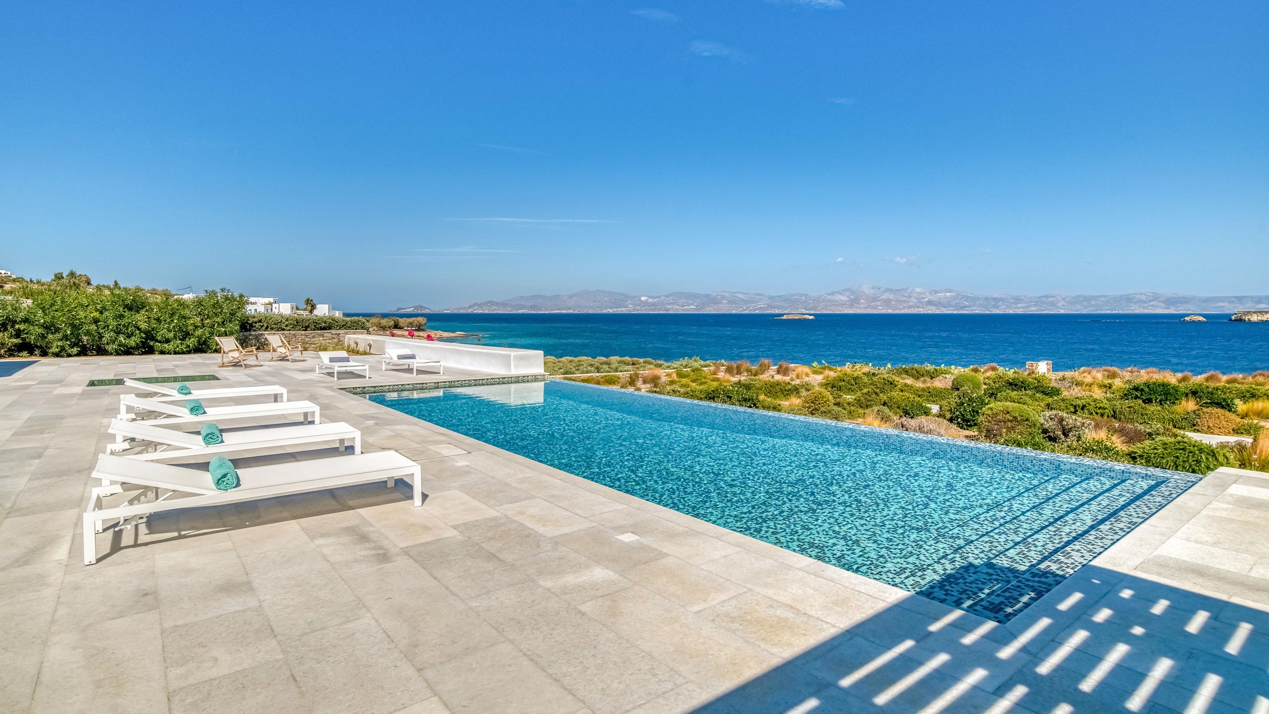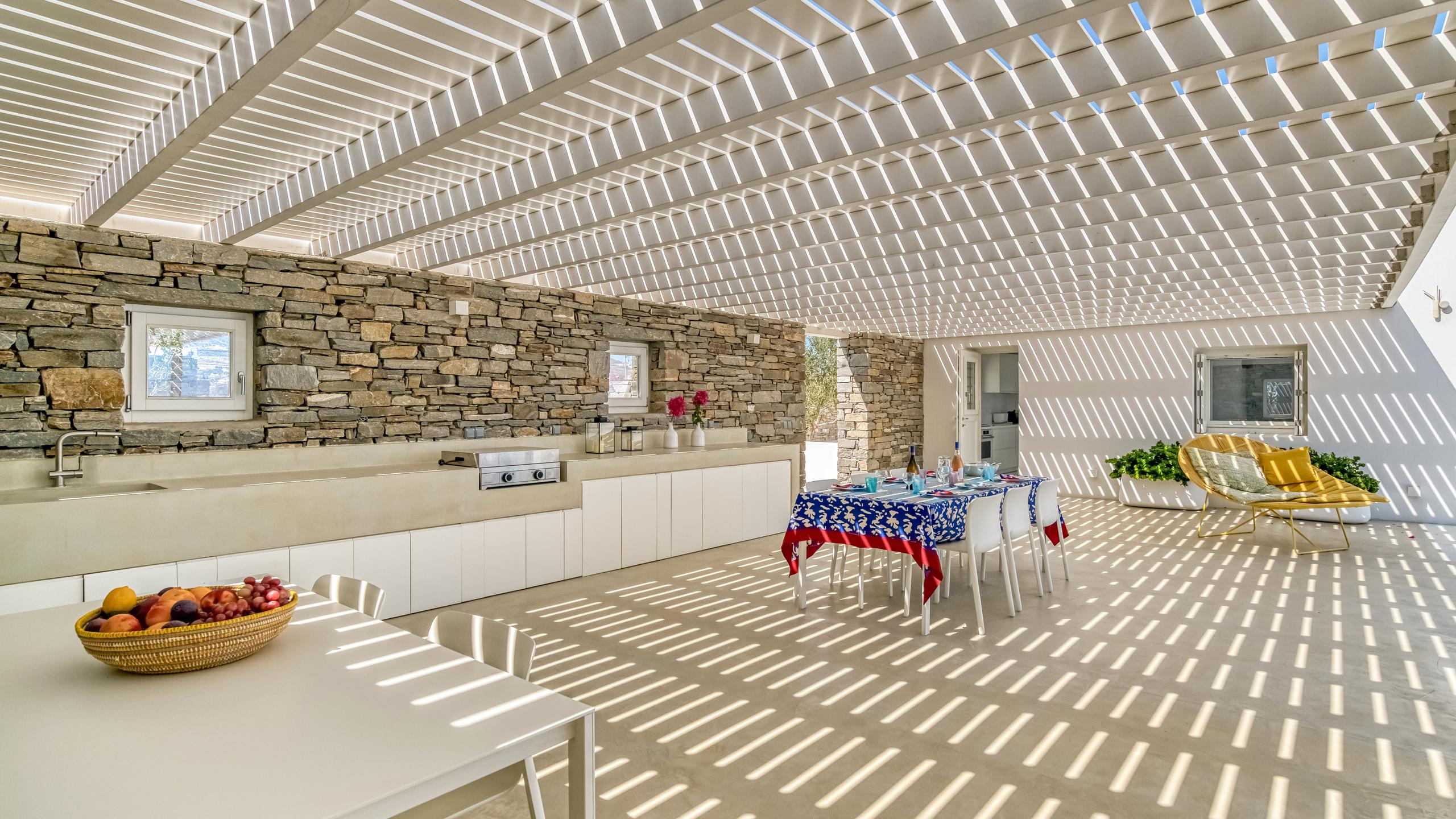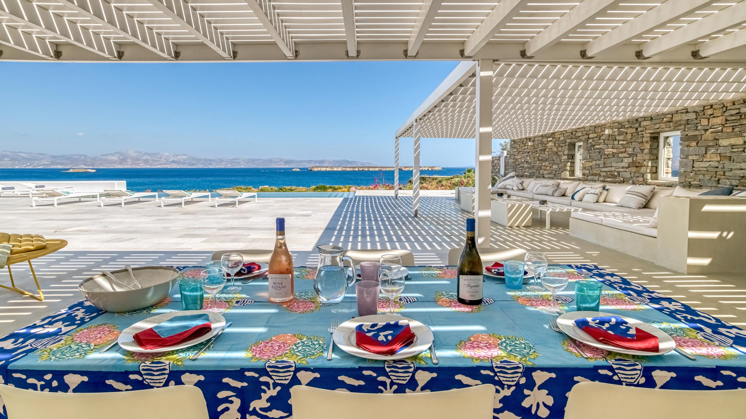 The exteriors are welcoming and refined, with an inviting infinity pool taking center stage on the front terrace, and a spacious pergola—typical of Cycladic tradition—hosting a charming lounge and outdoor dining area, all framed by the breathtaking sea view as a priceless backdrop.
