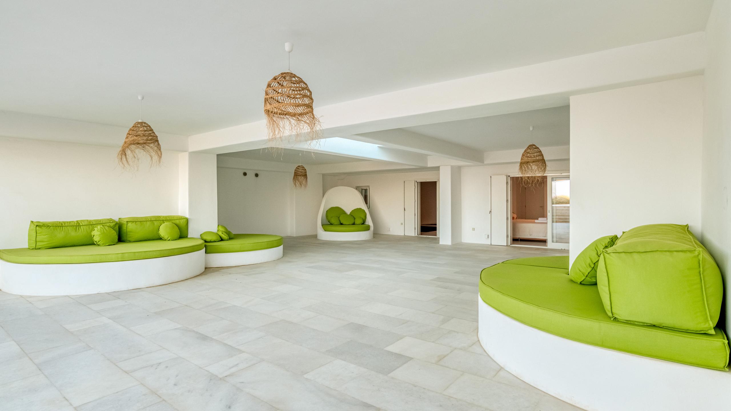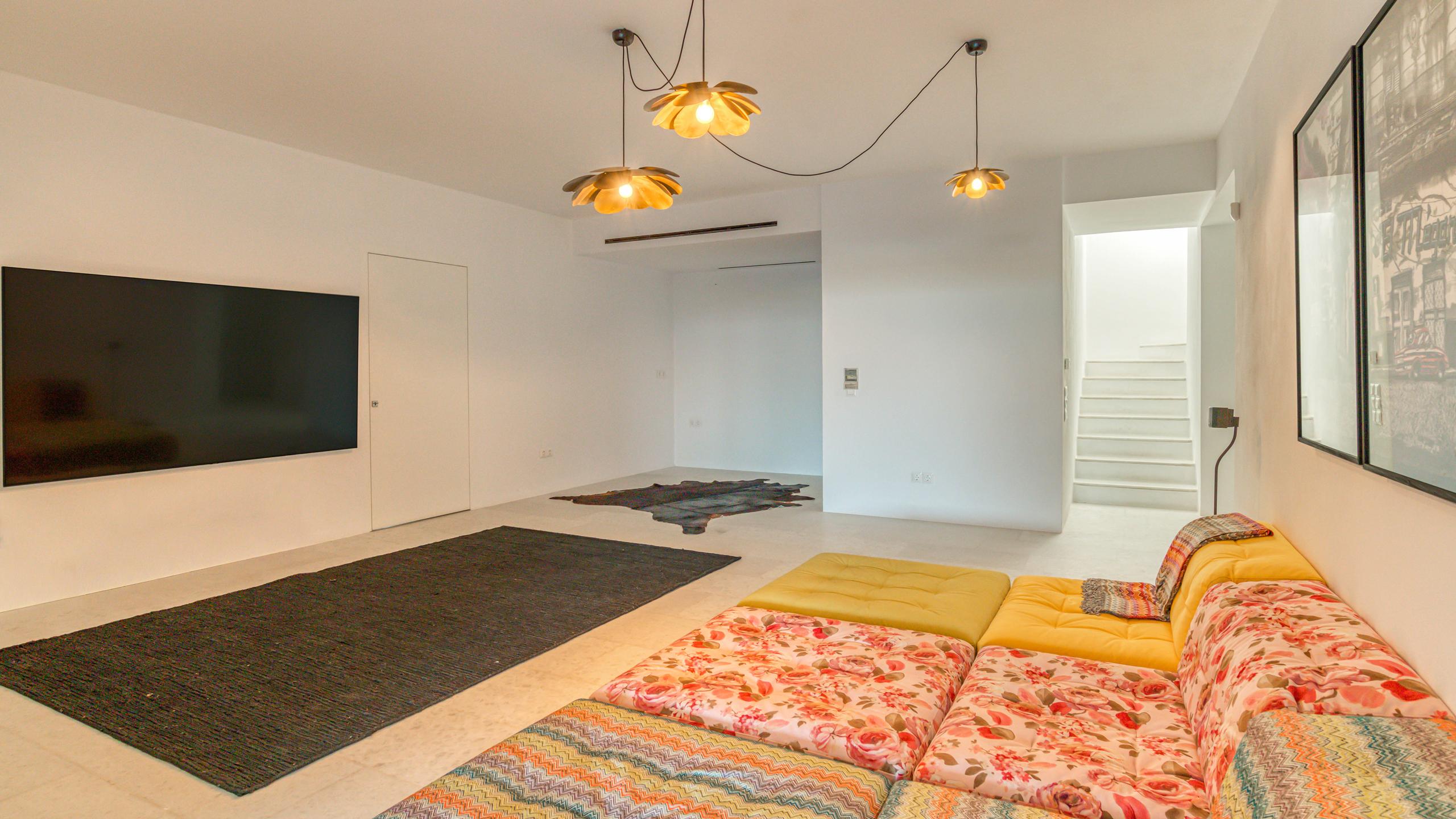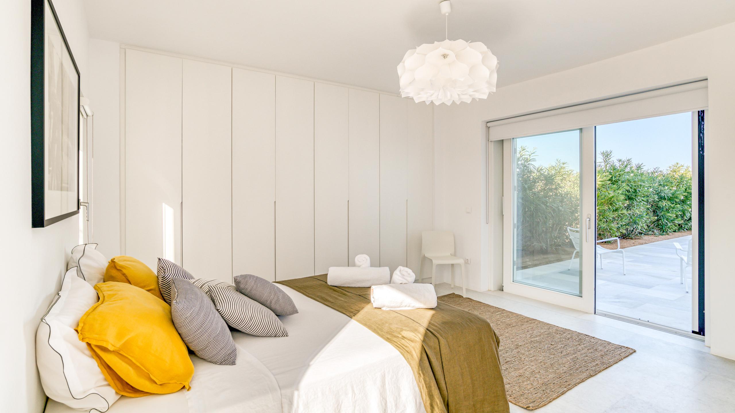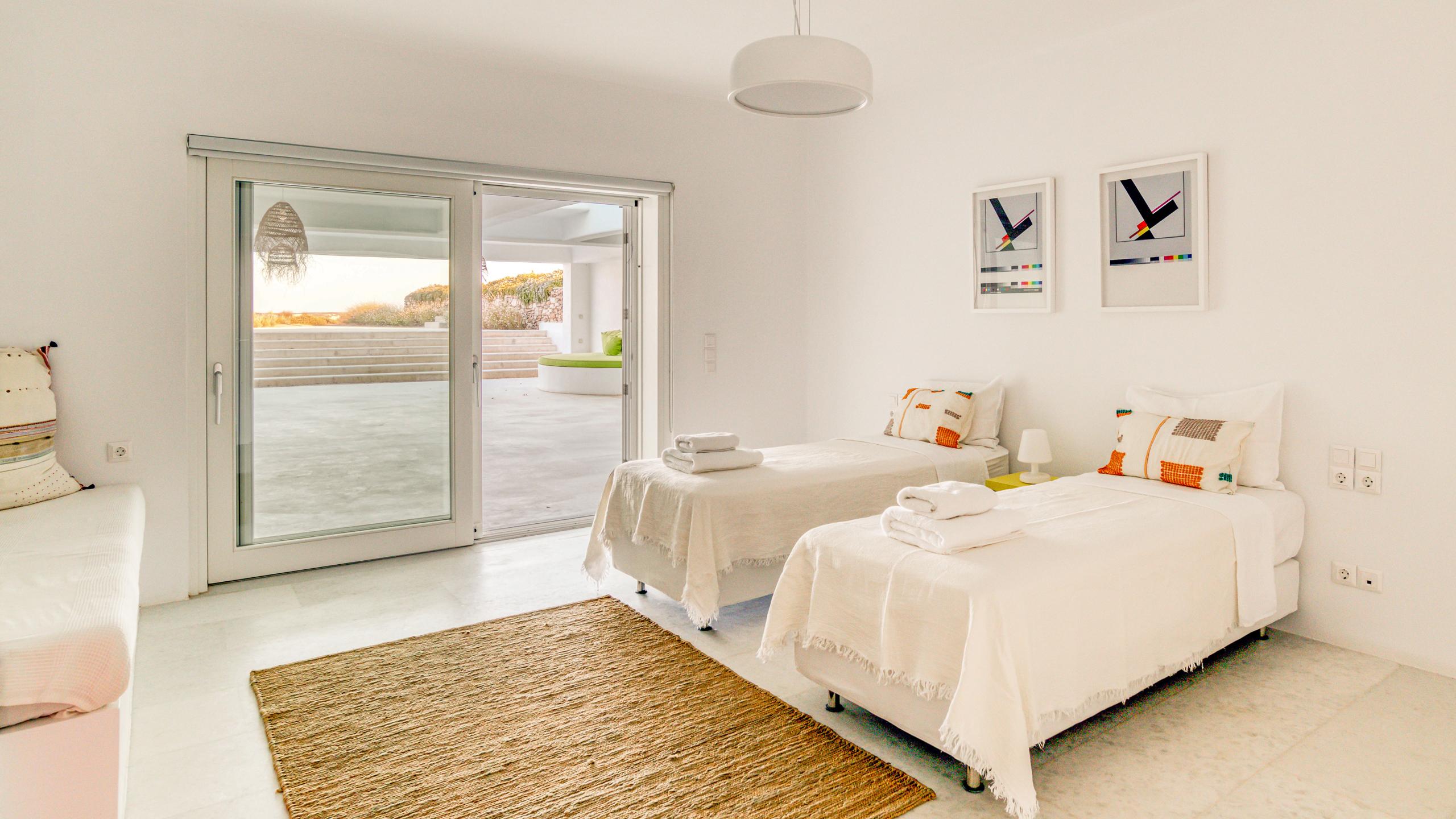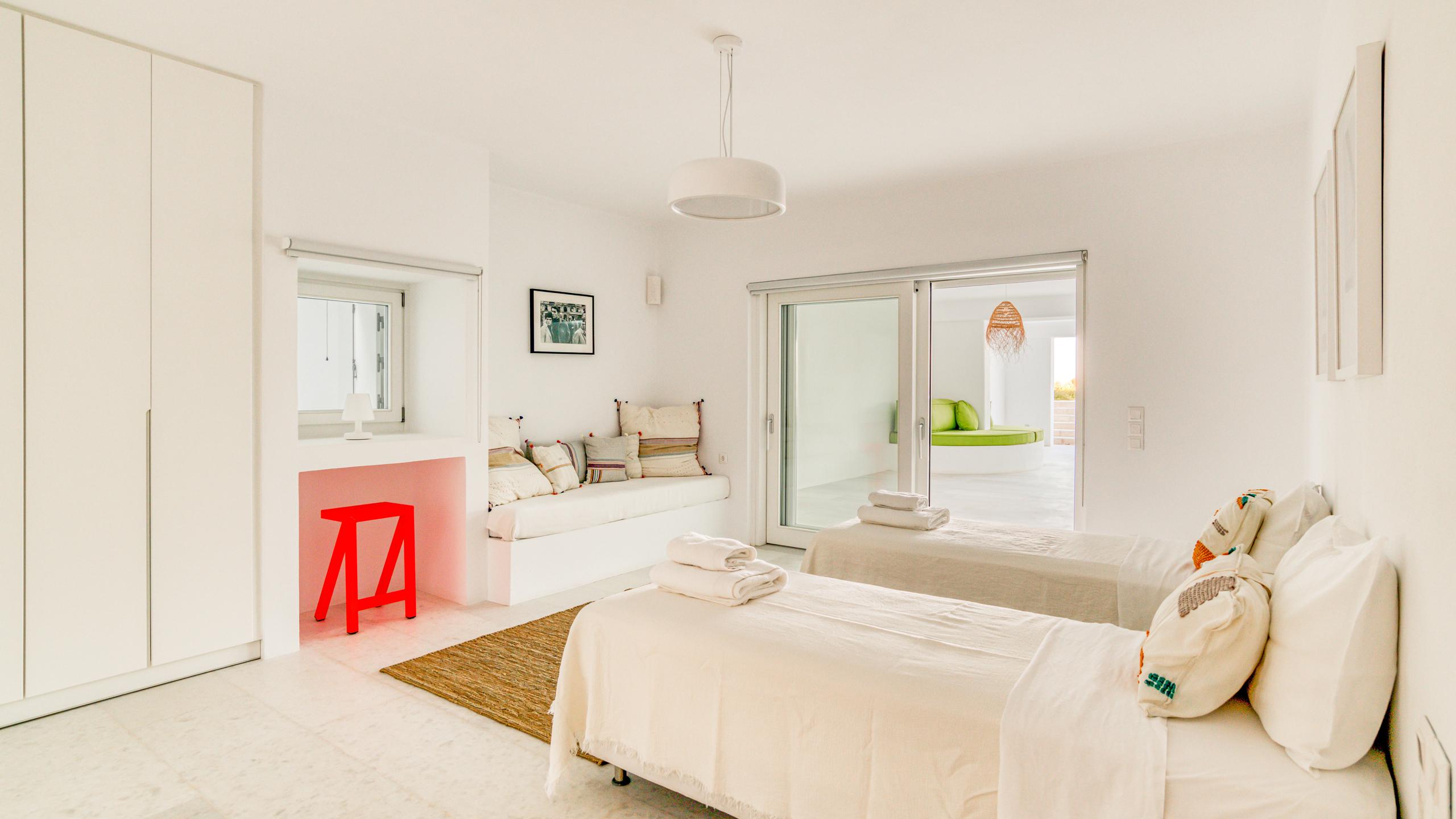 Inside, the atmosphere is relaxed, minimalist, and inviting at once, with white tones dominating the spaces, enhanced by carefully chosen furnishings and artworks that add character. Large French doors open to the outside both in the common areas and in the comfortable bedrooms, which are spread across the villa’s three levels.