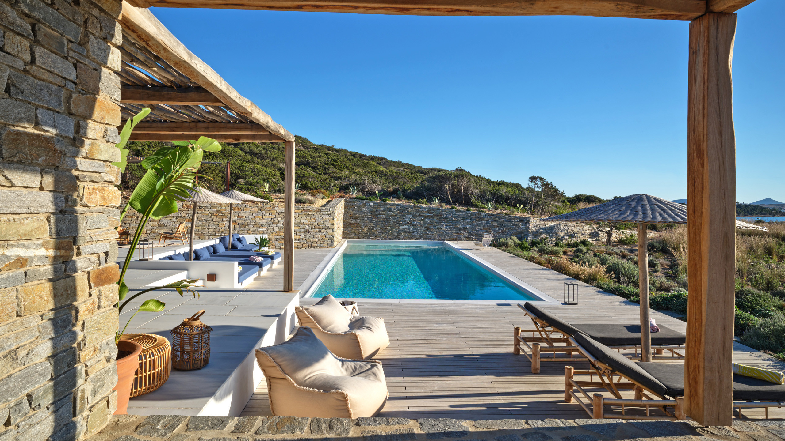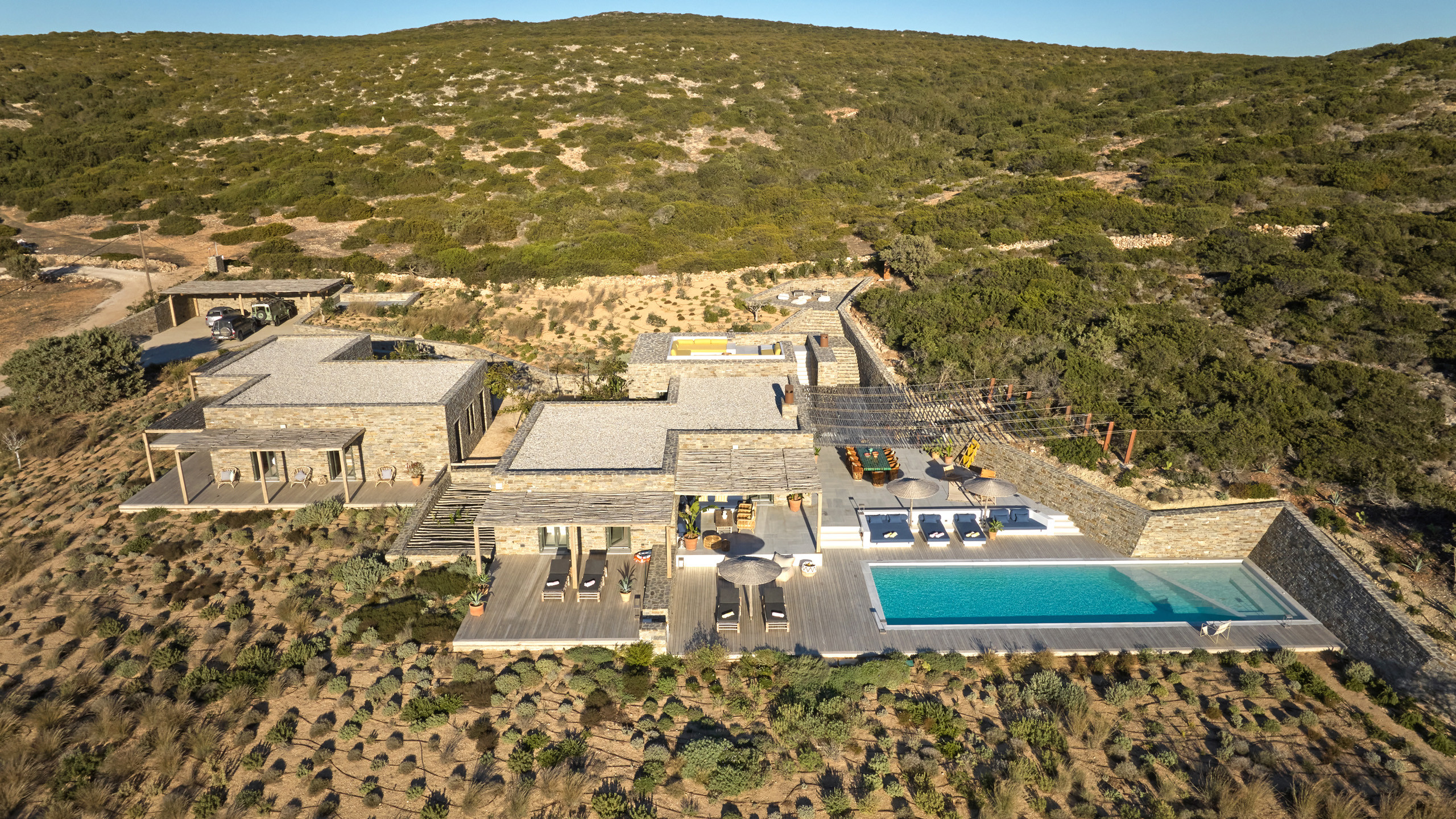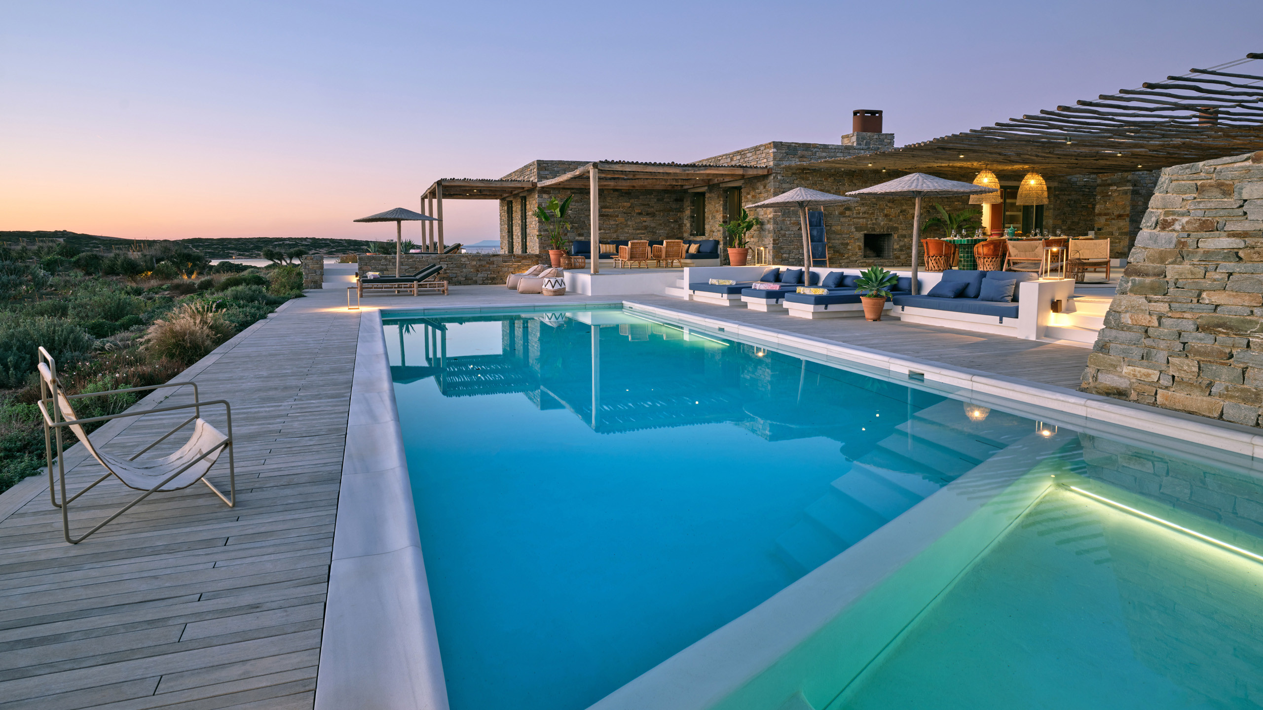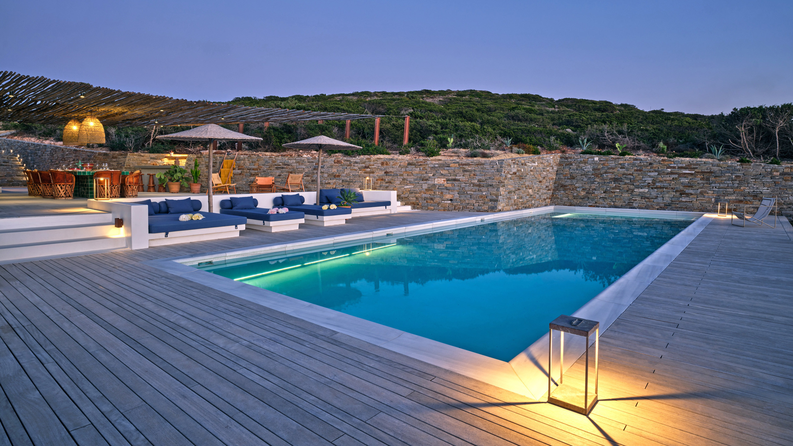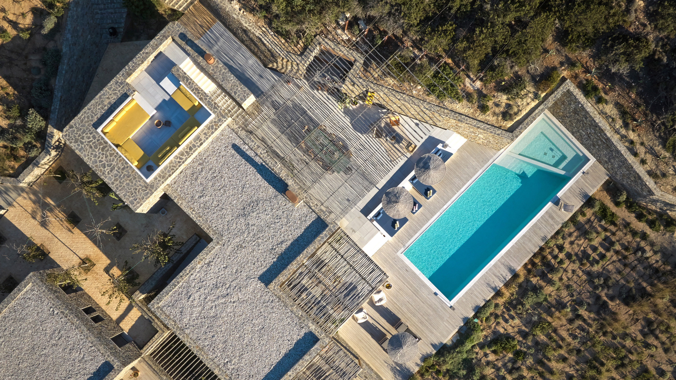 The architecture of the house is a modern reinterpretation of classical Cycladic style, with exposed stone walls and a wing entirely dedicated to guest rooms, all positioned on the main level with access to the outside. The pool, with a dedicated hydro-massage corner, takes center stage, surrounded by a wooden platform with comfortable sun loungers. The well-appointed dining area, shaded by a pergola, is strategically positioned to maximize the stunning sea views, complete with a BBQ area and an adjacent bar corner. Additionally, there are two other very enjoyable relaxation areas, including the rooftop lounge area, ideal for sunset drinks while admiring the sea views from different angles.