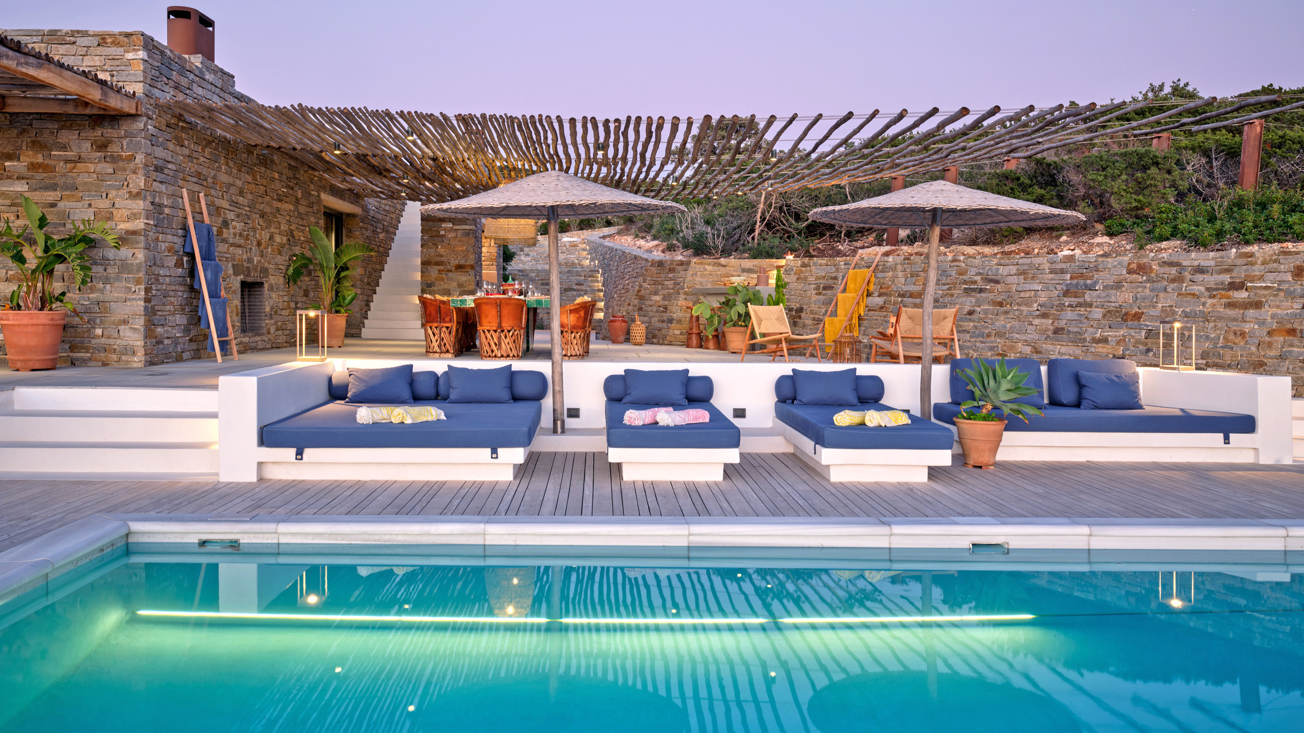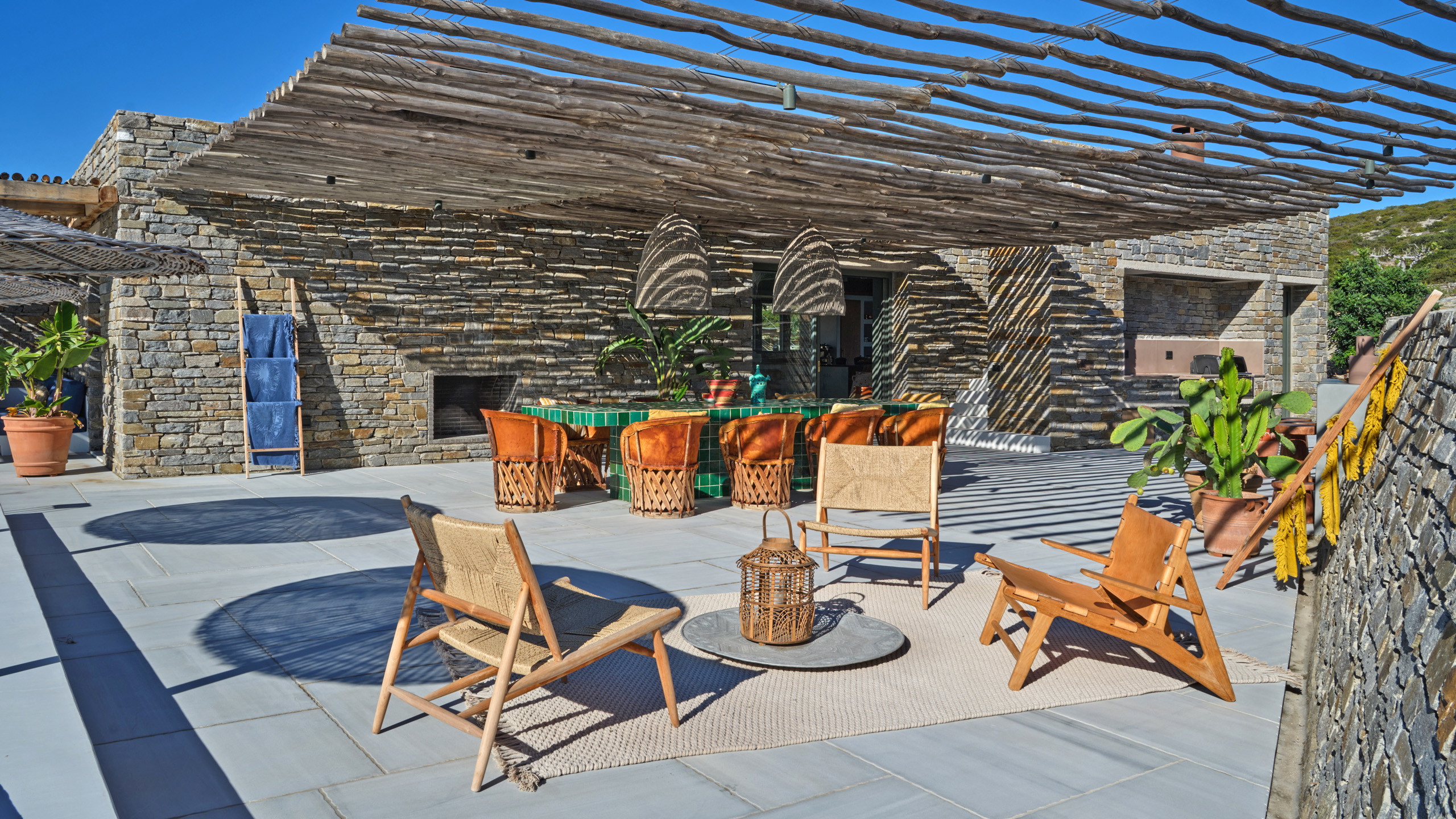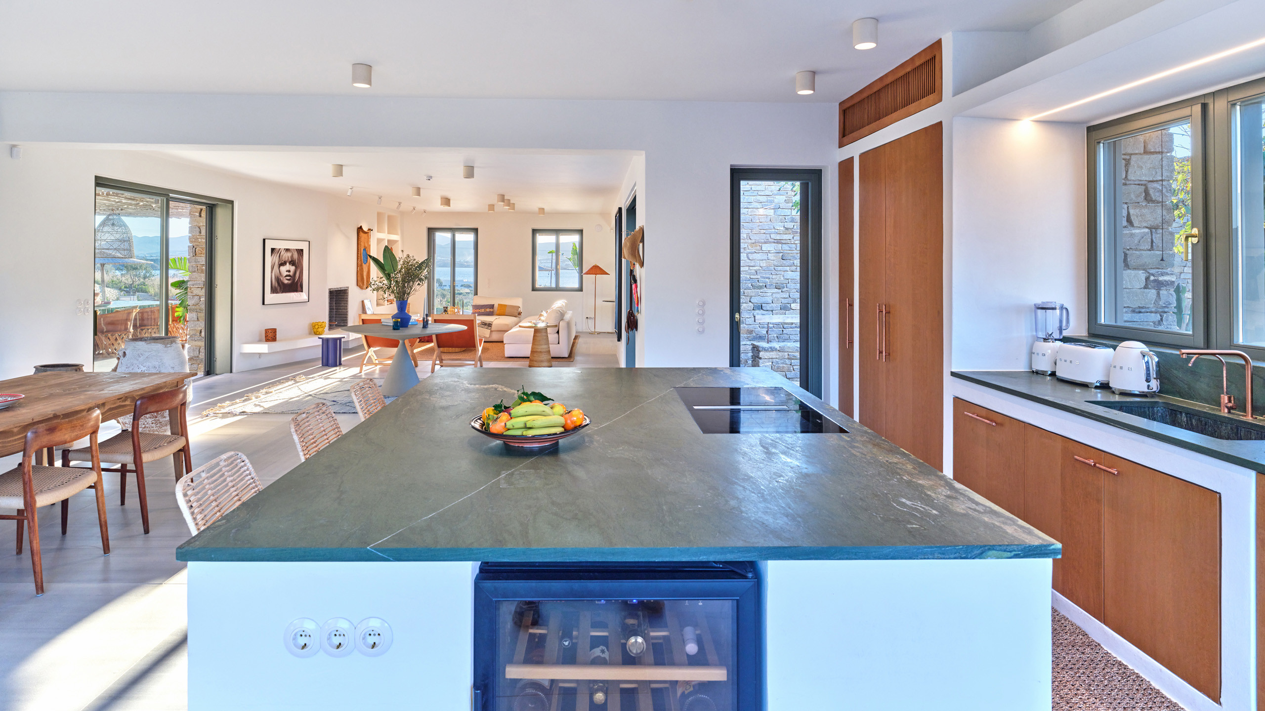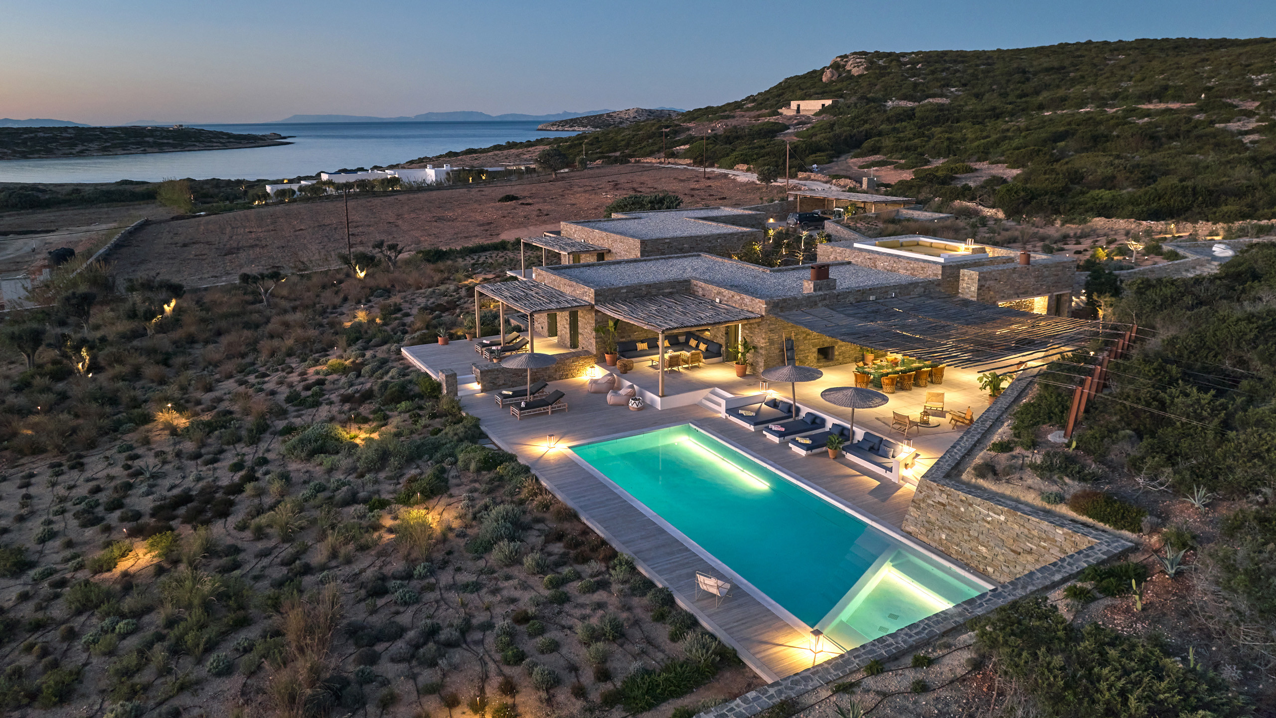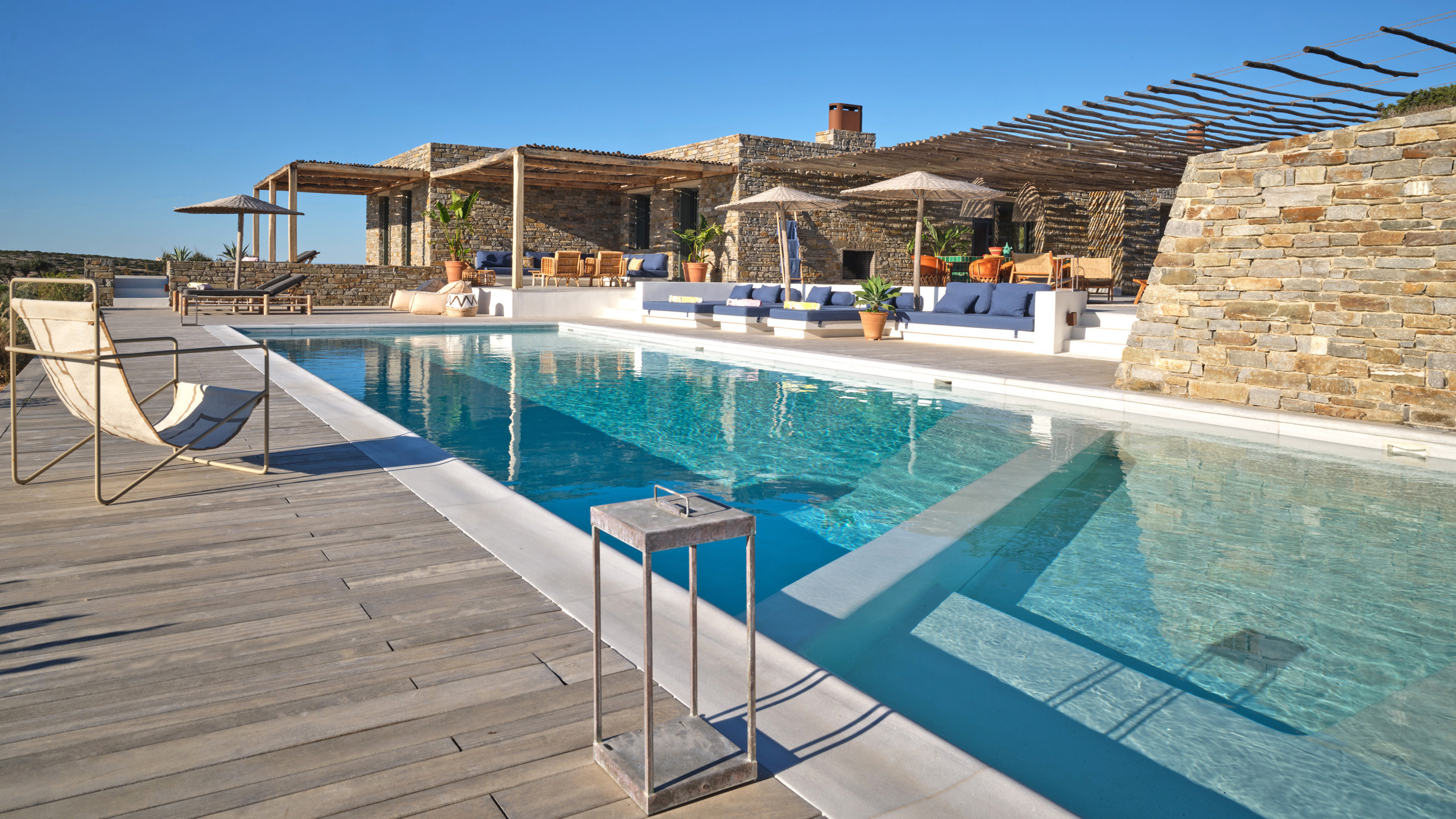 The architecture of the house is a modern reinterpretation of classical Cycladic style, with exposed stone walls and a wing entirely dedicated to guest rooms, all positioned on the main level with access to the outside. The pool, with a dedicated hydro-massage corner, takes center stage, surrounded by a wooden platform with comfortable sun loungers. The well-appointed dining area, shaded by a pergola, is strategically positioned to maximize the stunning sea views, complete with a BBQ area and an adjacent bar corner. Additionally, there are two other very enjoyable relaxation areas, including the rooftop lounge area, ideal for sunset drinks while admiring the sea views from different angles.