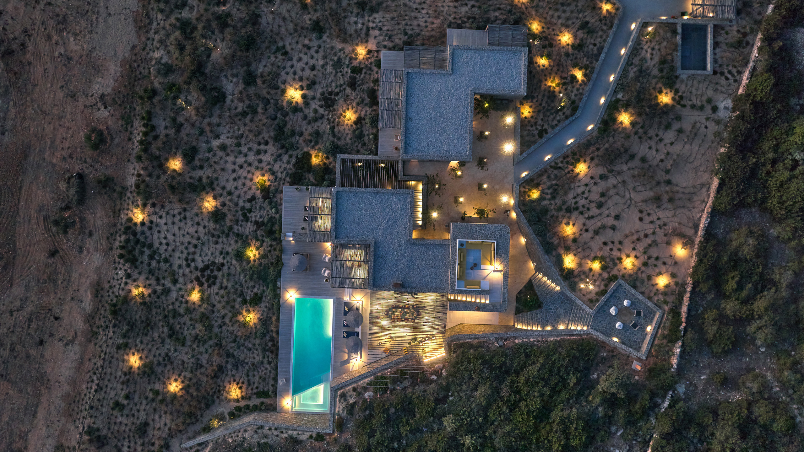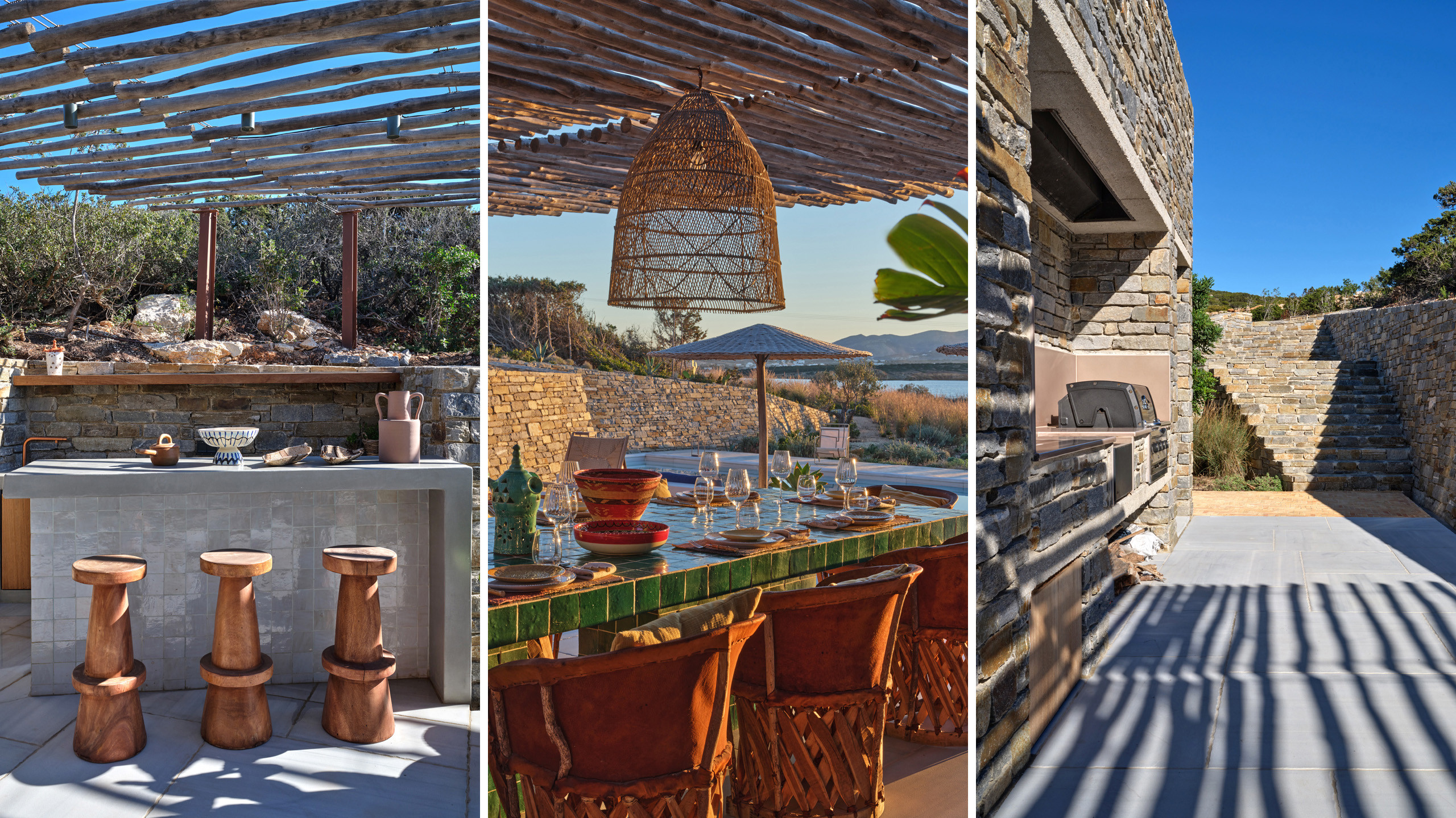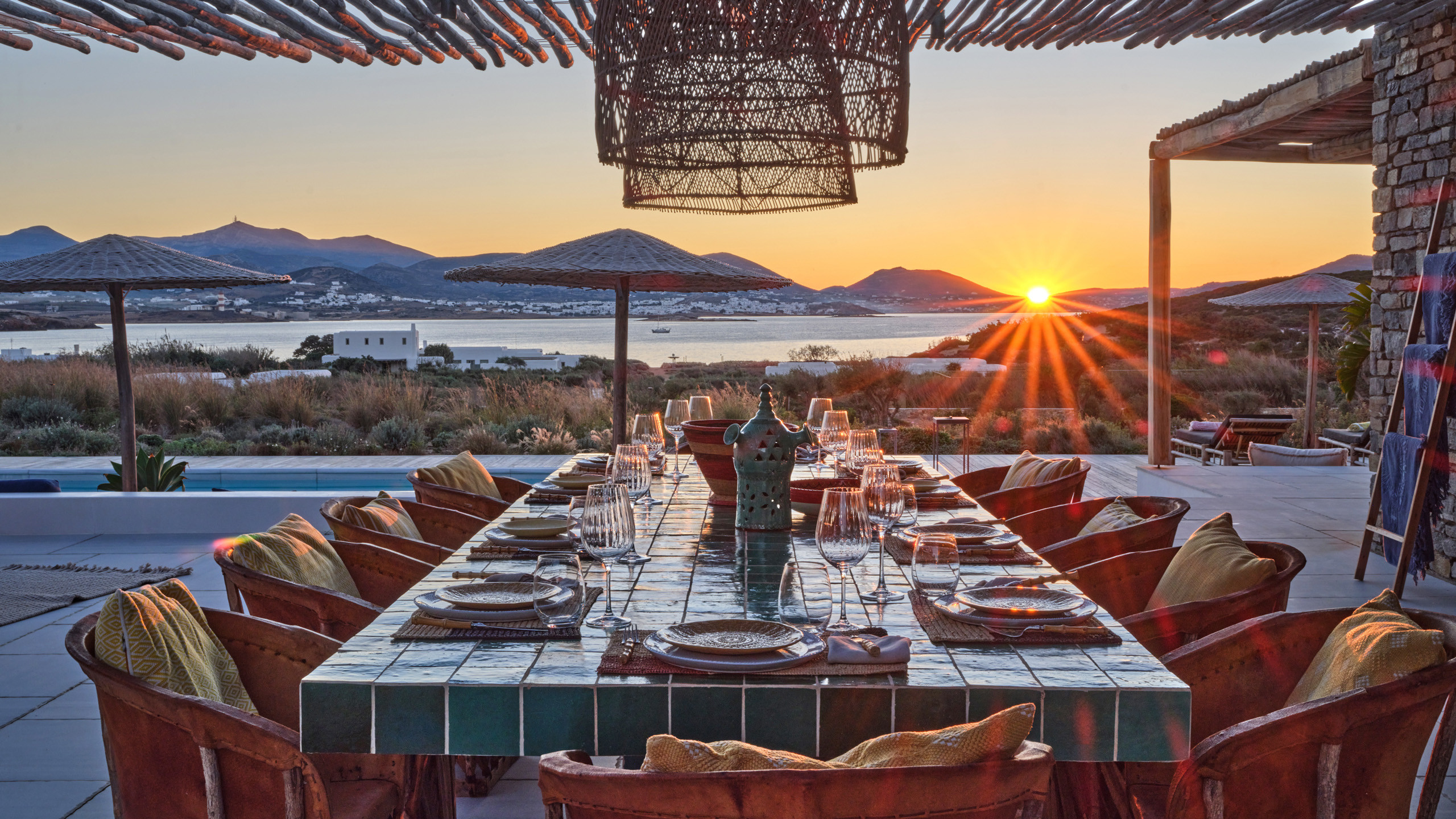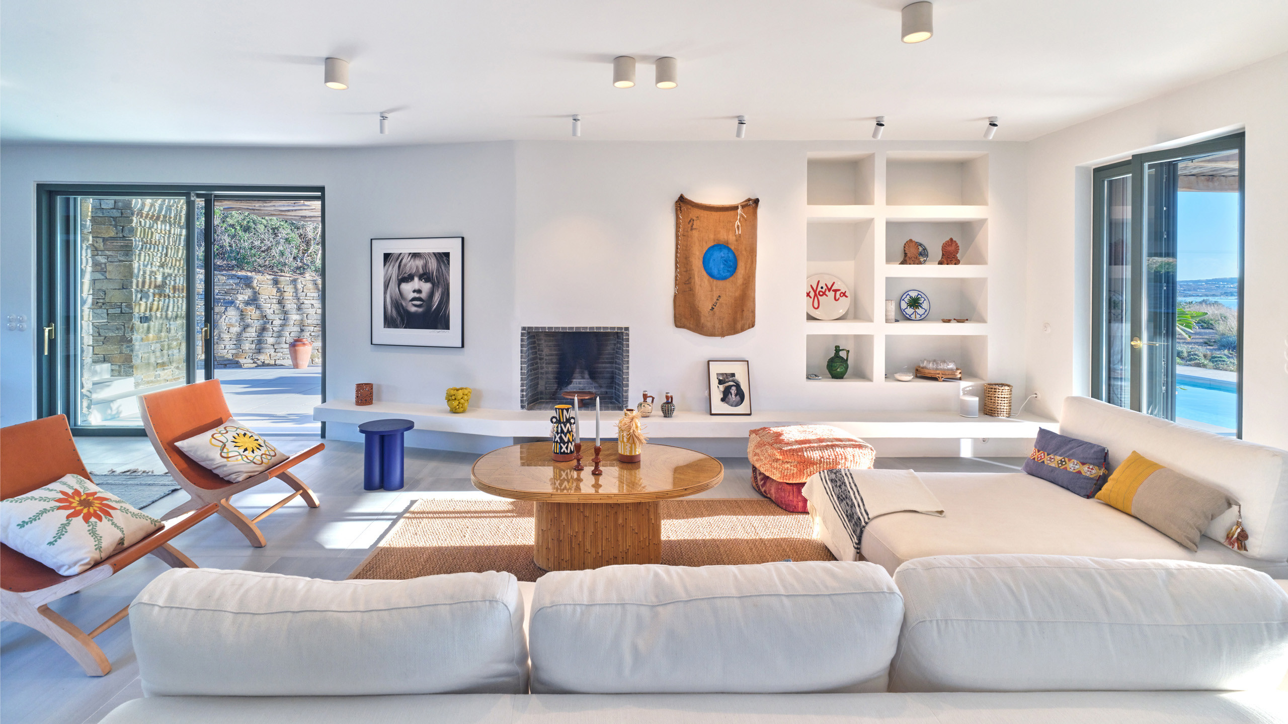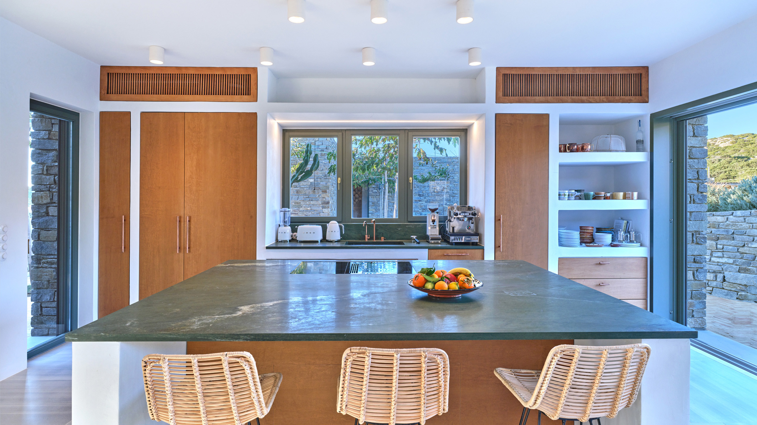 The architecture of the house is a modern reinterpretation of classical Cycladic style, with exposed stone walls and a wing entirely dedicated to guest rooms, all positioned on the main level with access to the outside. The pool, with a dedicated hydro-massage corner, takes center stage, surrounded by a wooden platform with comfortable sun loungers. The well-appointed dining area, shaded by a pergola, is strategically positioned to maximize the stunning sea views, complete with a BBQ area and an adjacent bar corner. Additionally, there are two other very enjoyable relaxation areas, including the rooftop lounge area, ideal for sunset drinks while admiring the sea views from different angles.