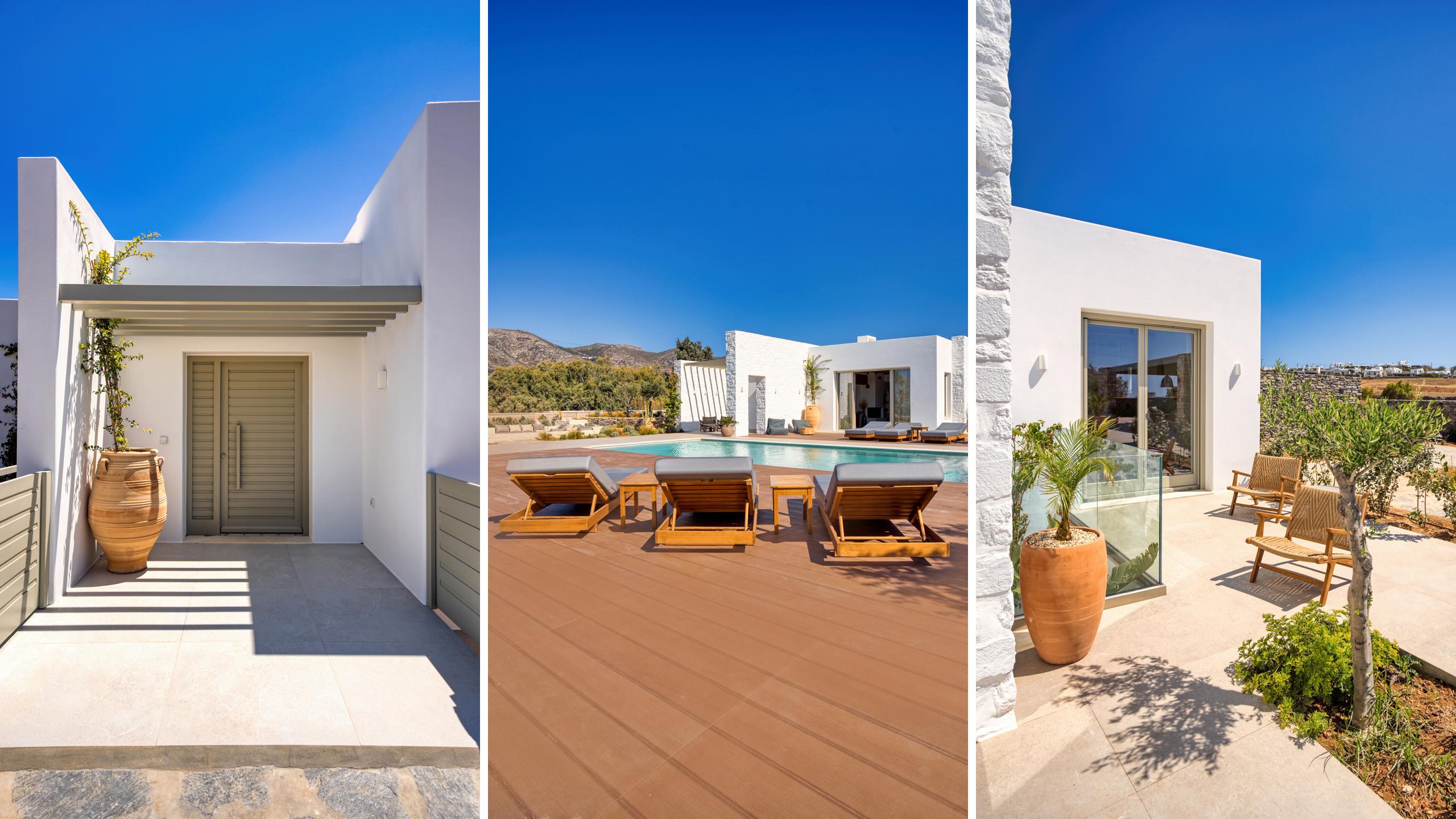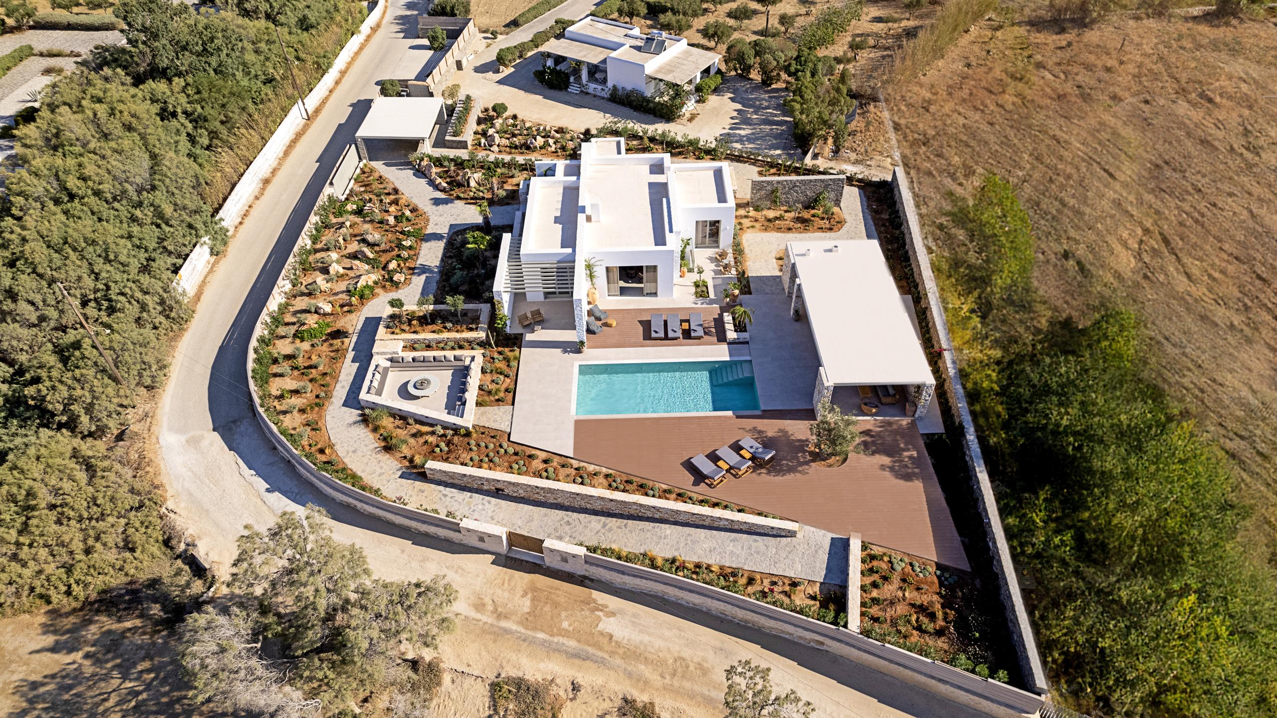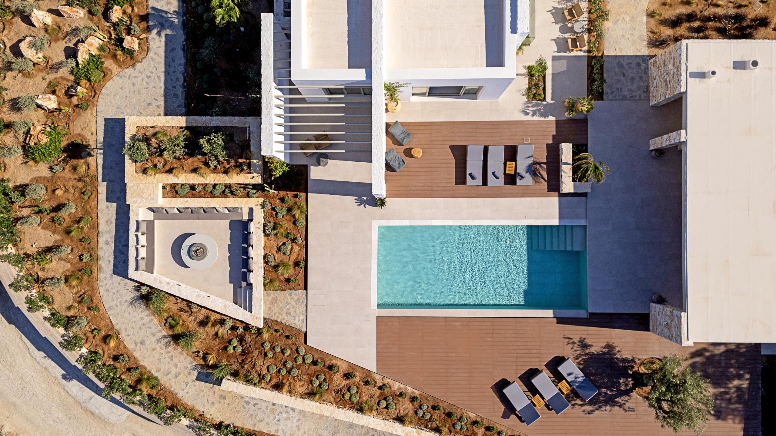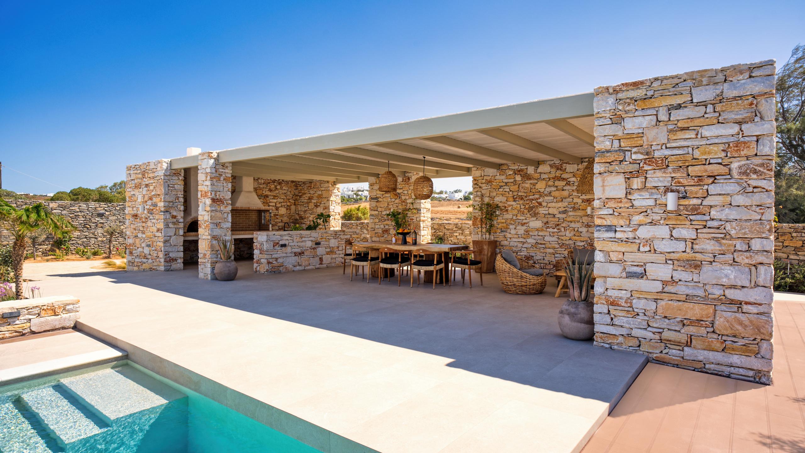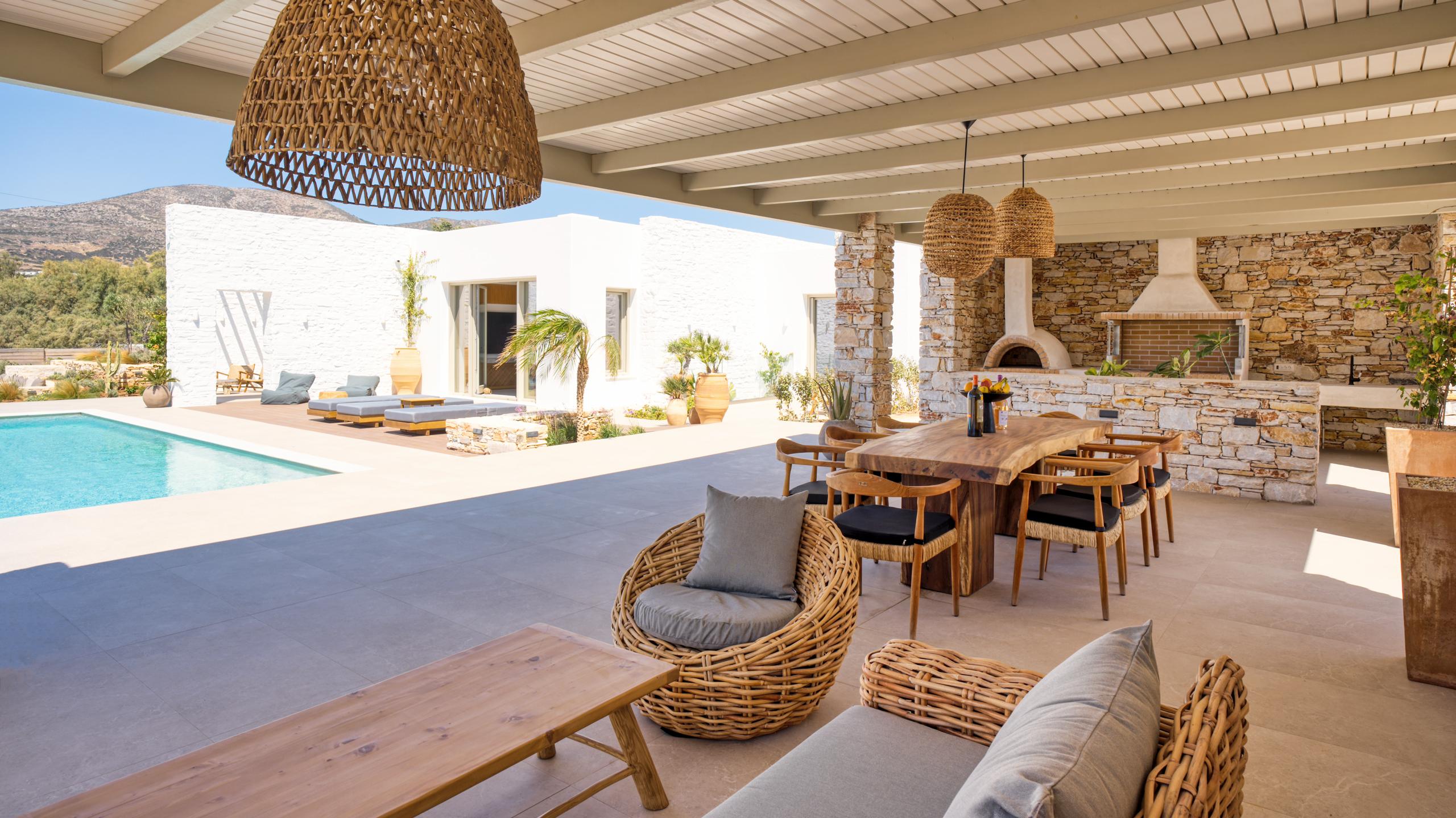 The outdoor areas reflect a fresh, modern style while embracing all the quintessential Cycladic elements: a beautiful and inviting swimming pool, a spacious pergola with an alfresco dining area and outdoor kitchen, and lush Mediterranean greenery that enhances the setting.
