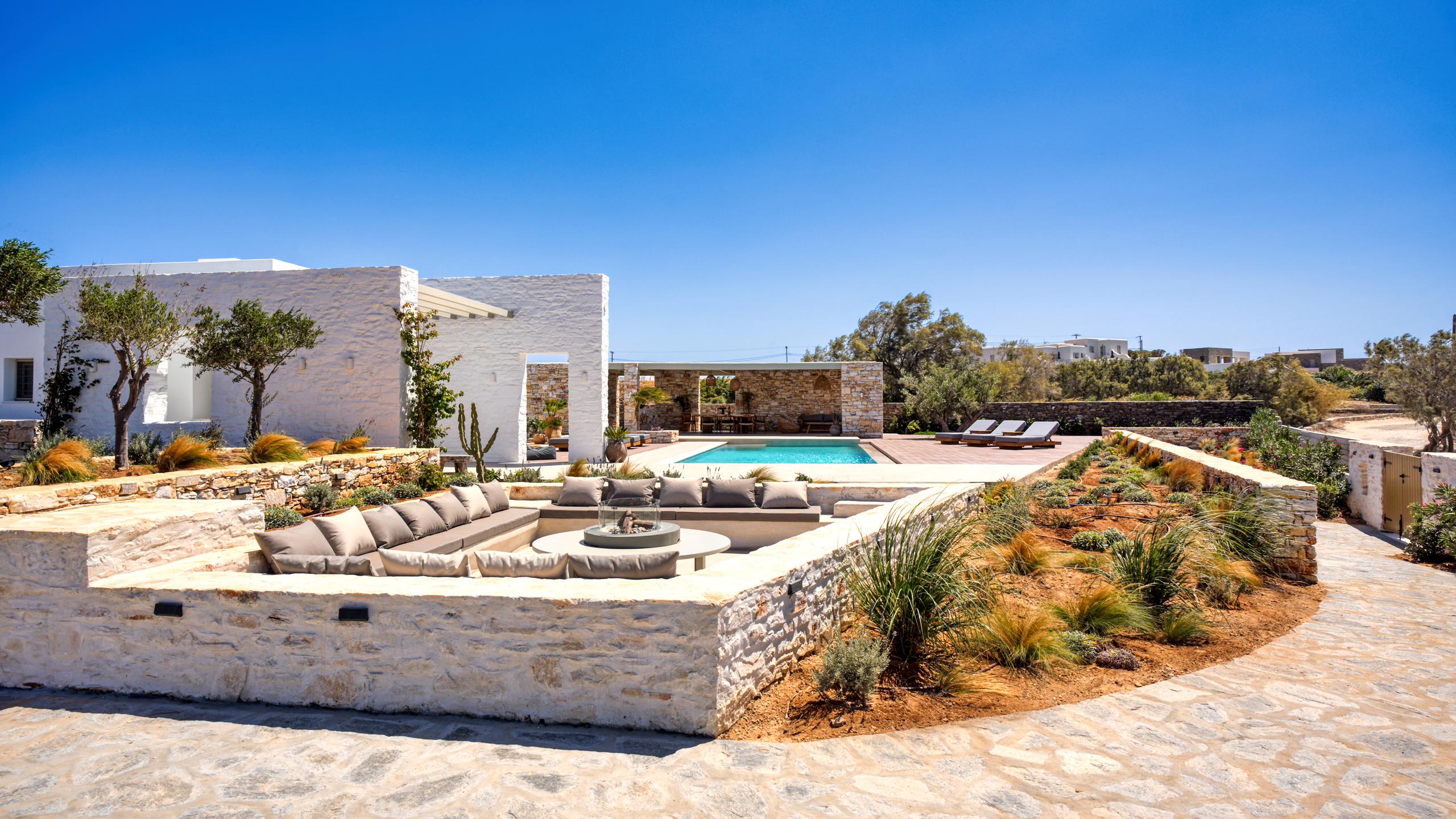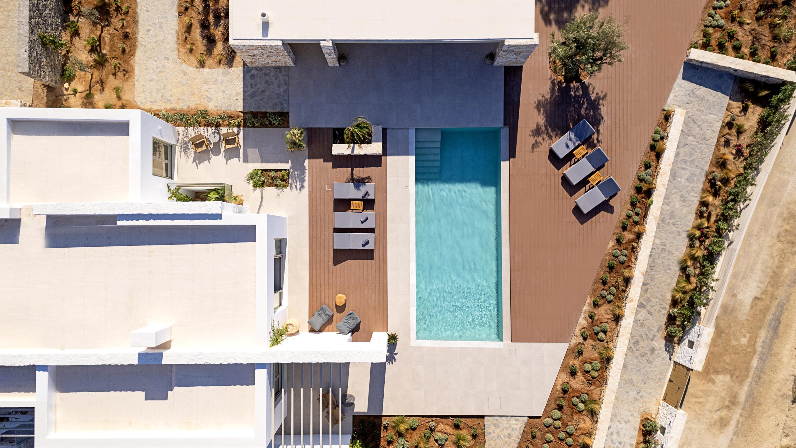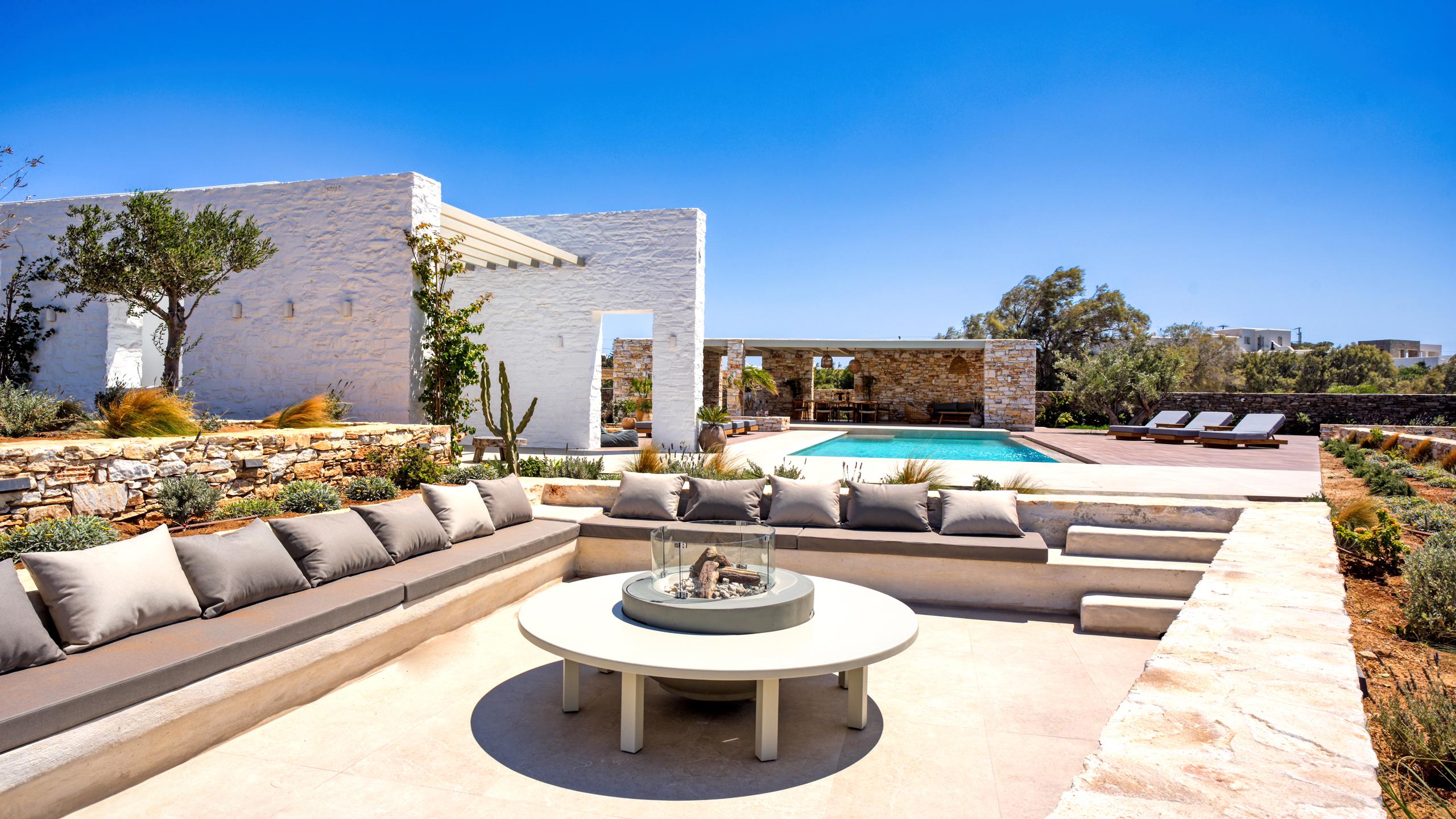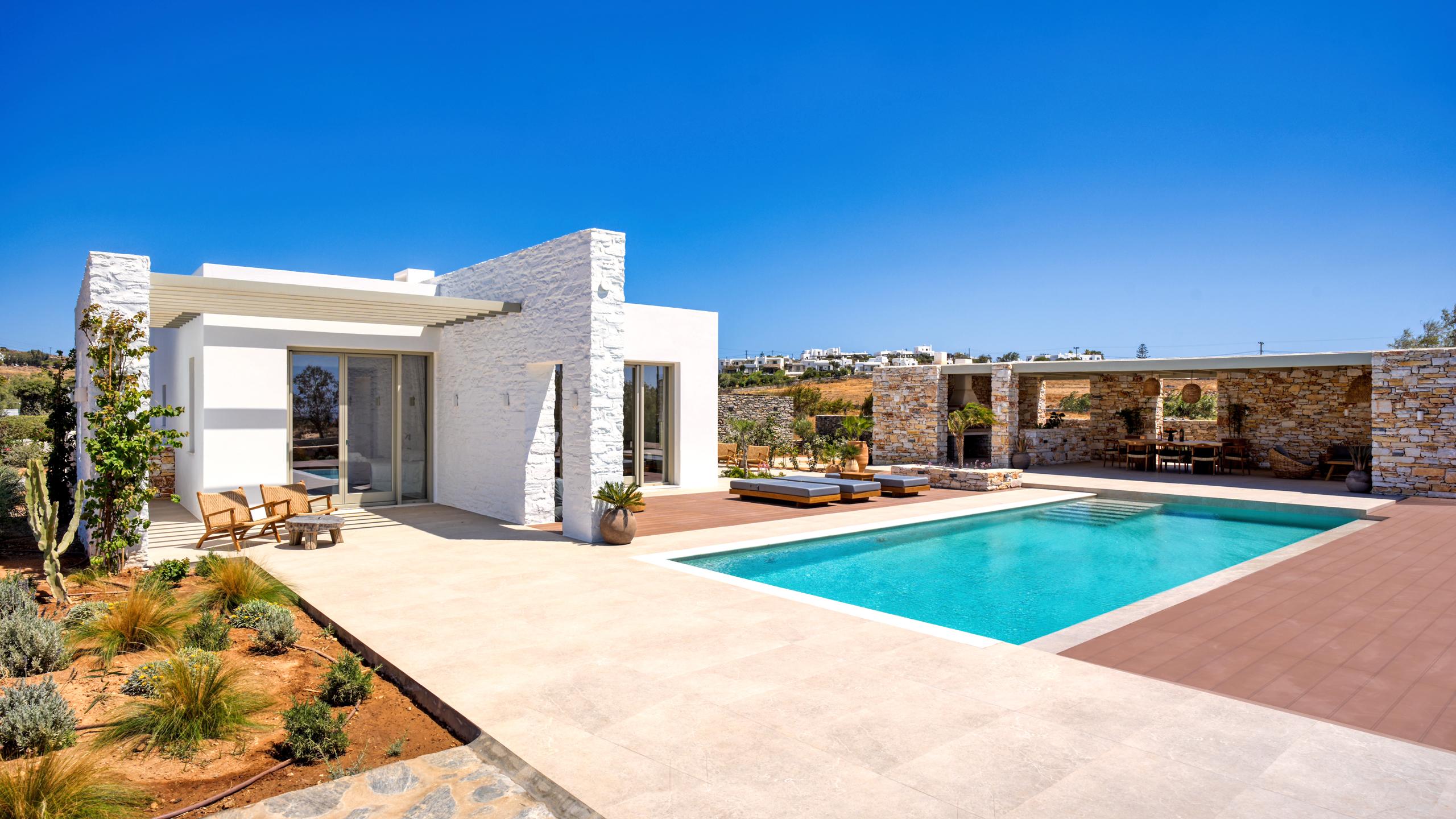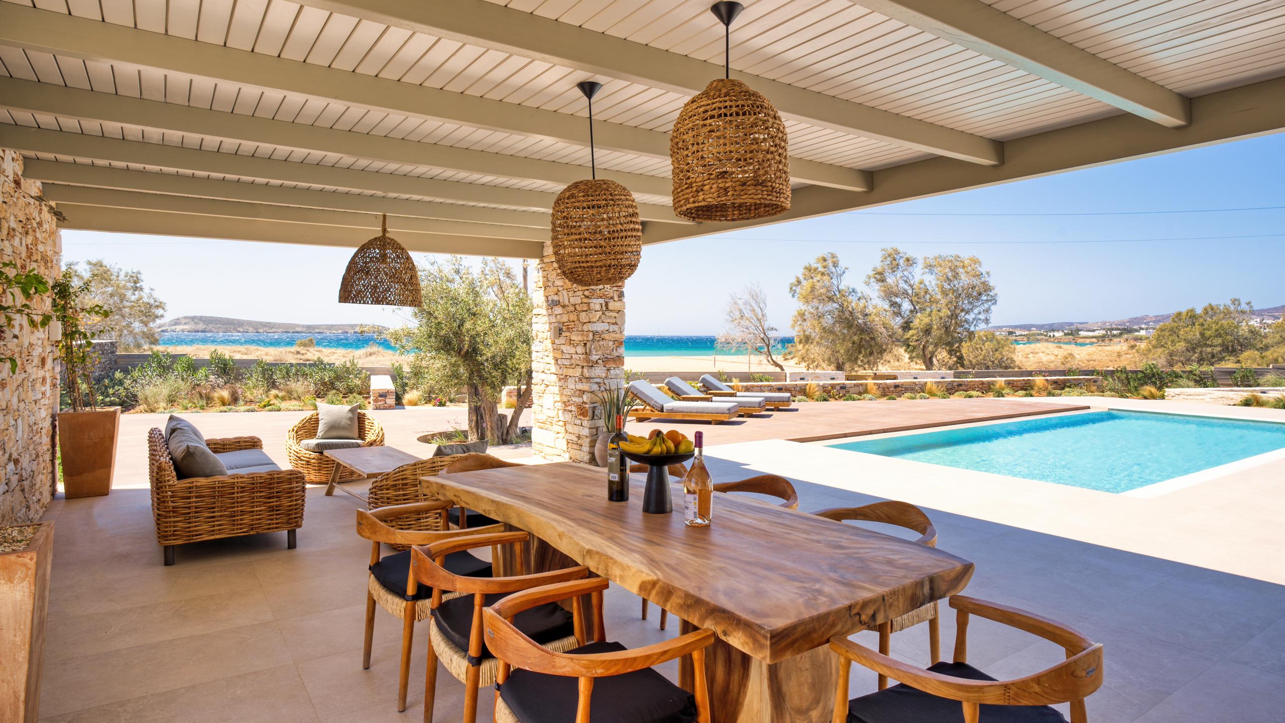 The outdoor areas reflect a fresh, modern style while embracing all the quintessential Cycladic elements: a beautiful and inviting swimming pool, a spacious pergola with an alfresco dining area and outdoor kitchen, and lush Mediterranean greenery that enhances the setting.