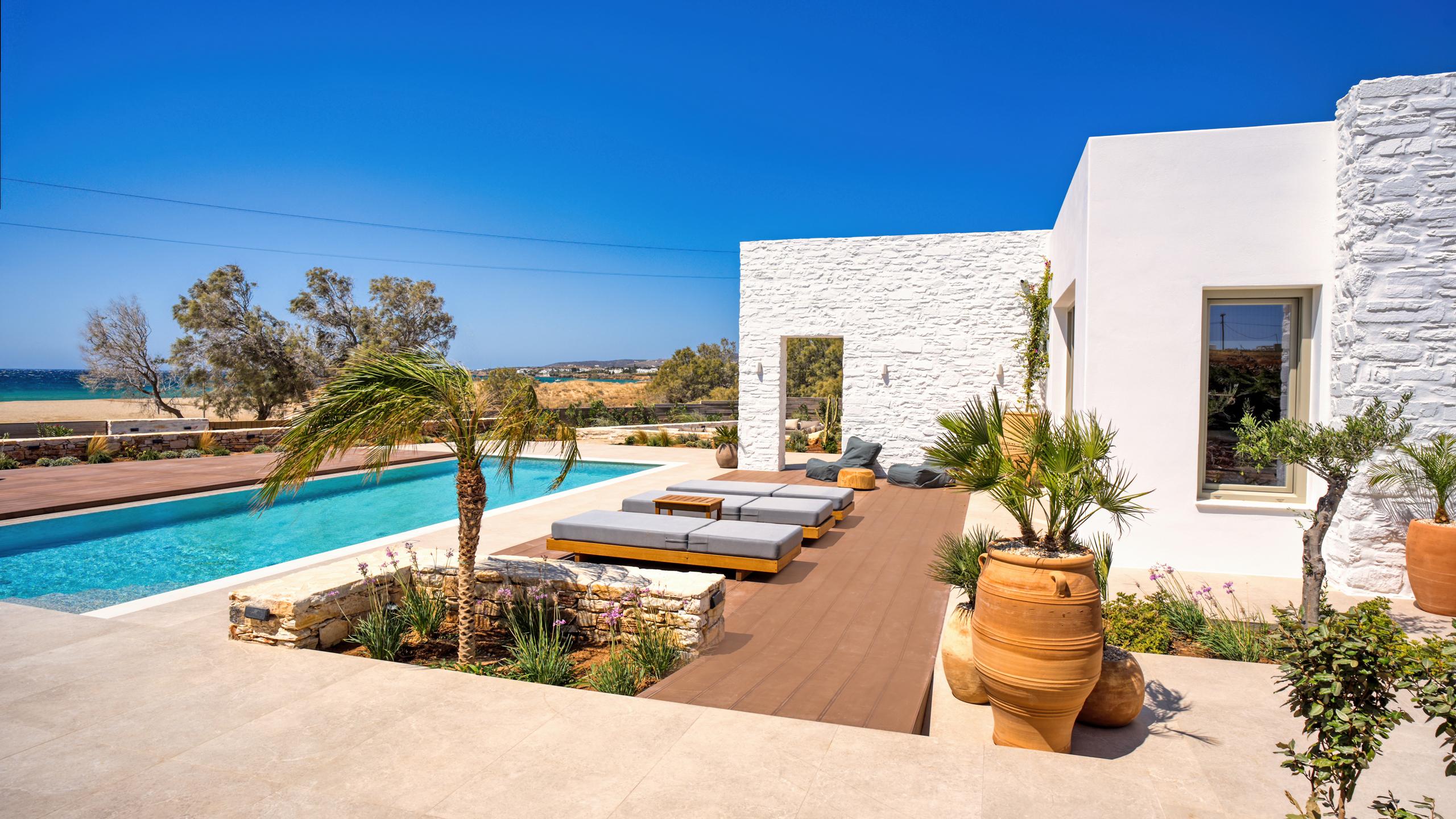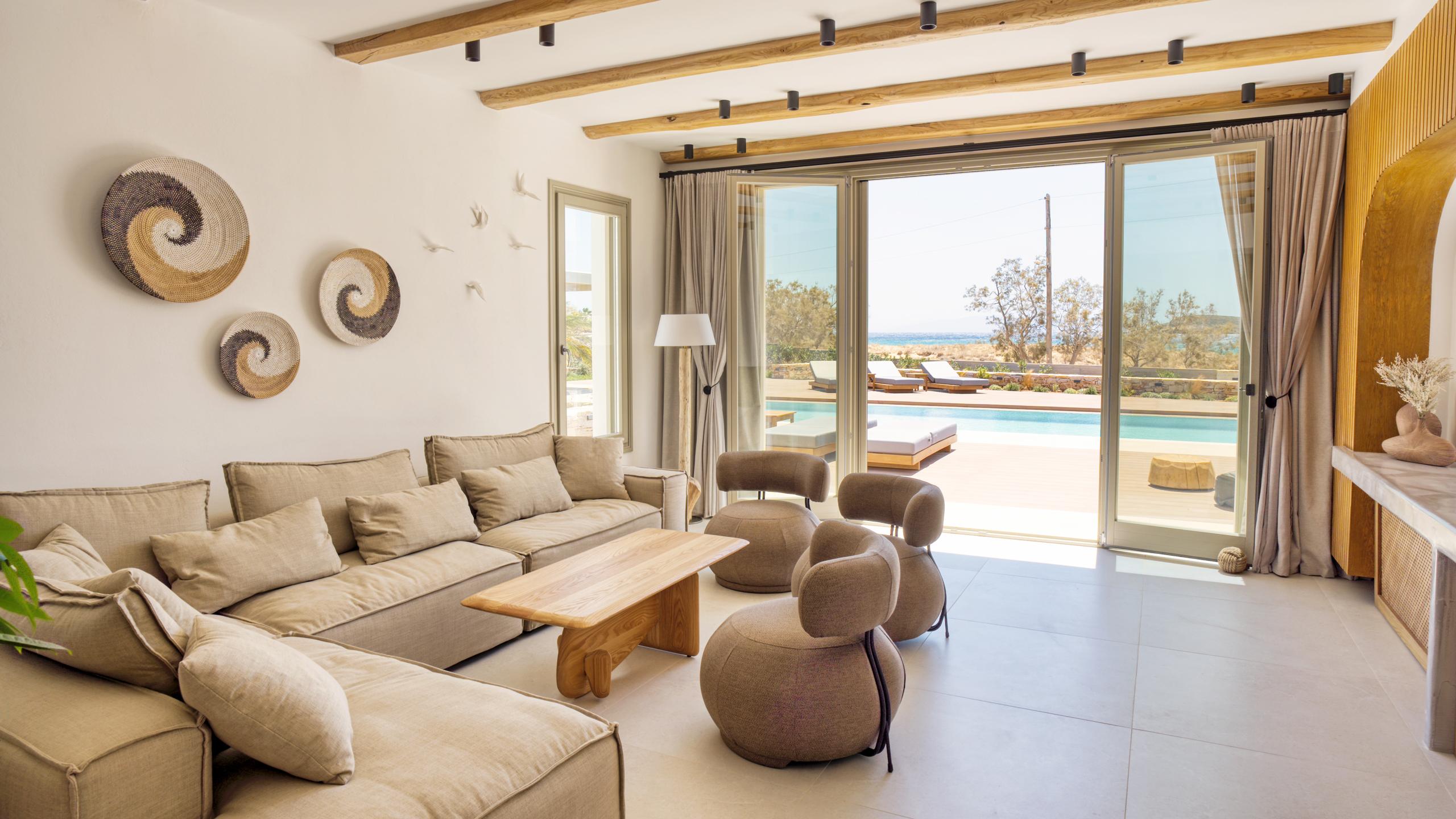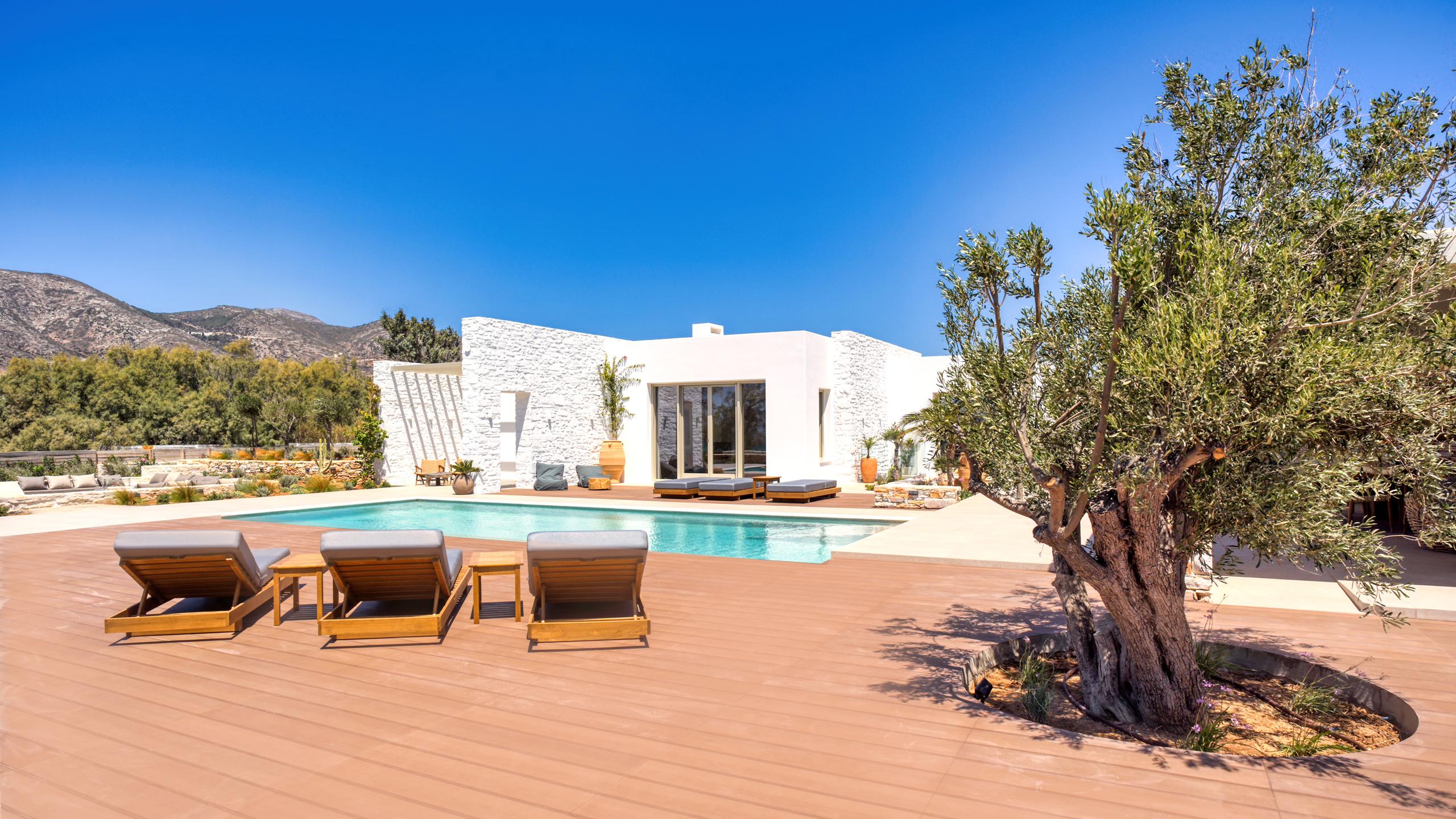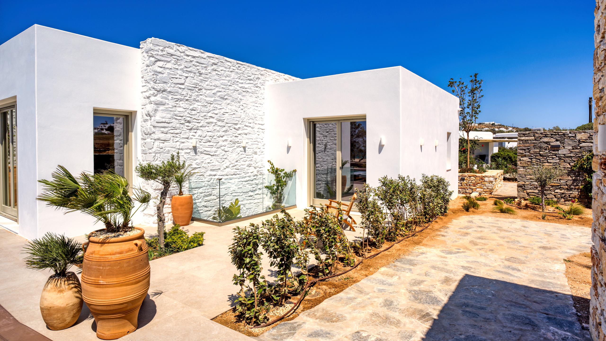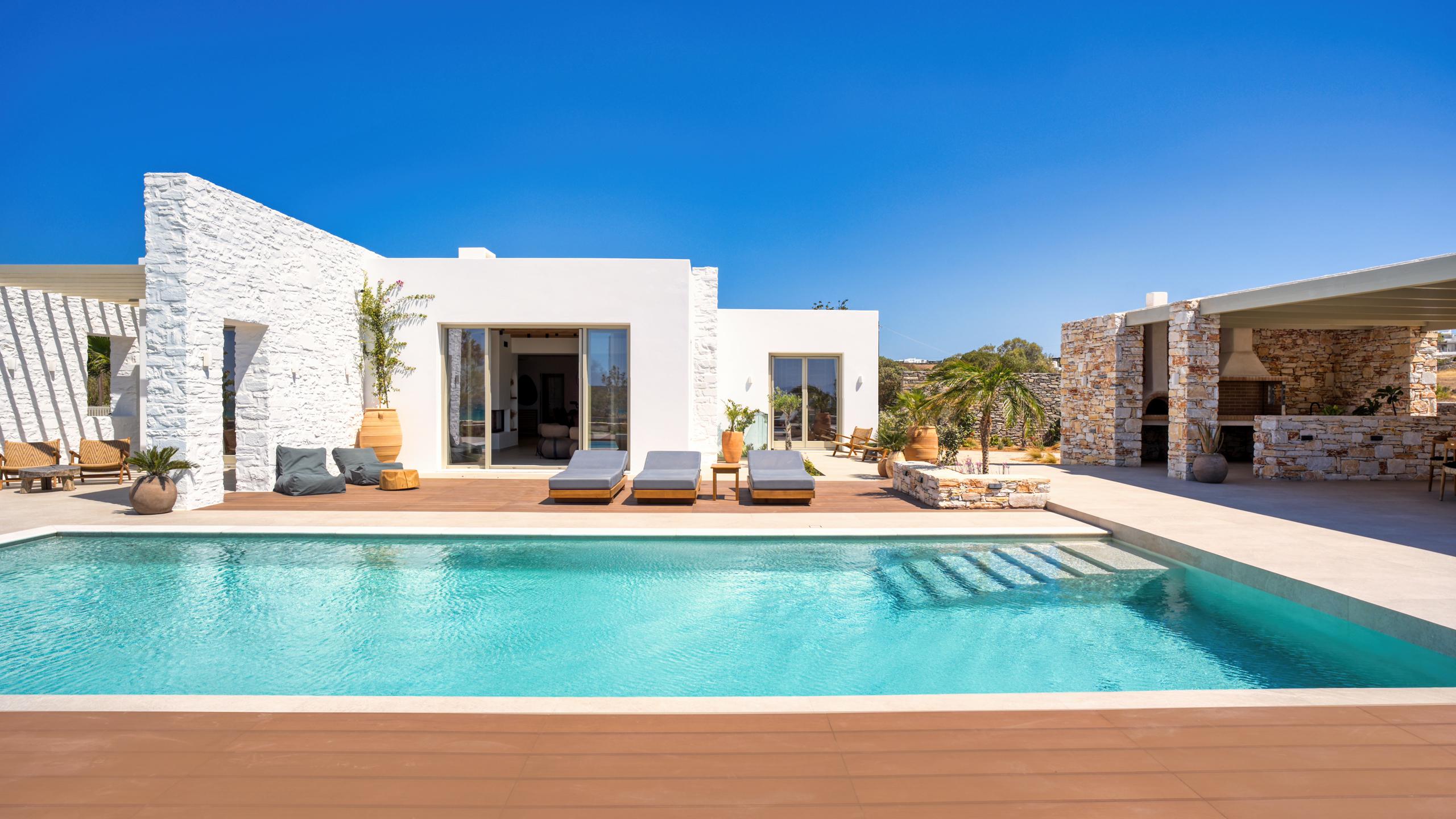 The outdoor areas reflect a fresh, modern style while embracing all the quintessential Cycladic elements: a beautiful and inviting swimming pool, a spacious pergola with an alfresco dining area and outdoor kitchen, and lush Mediterranean greenery that enhances the setting.