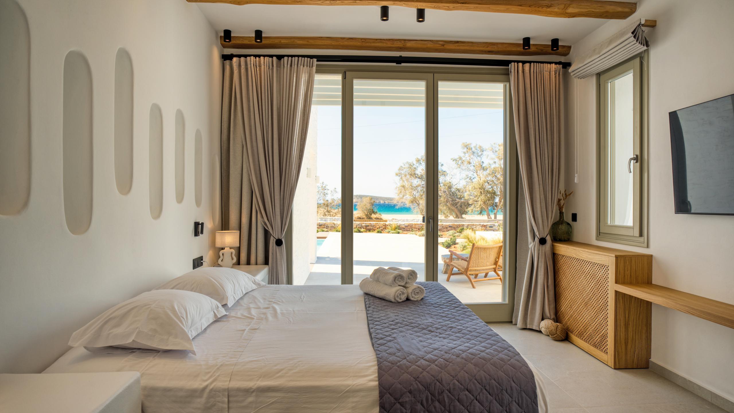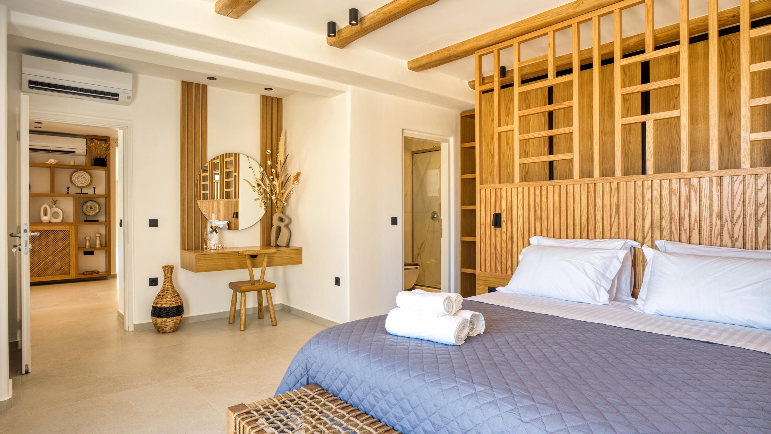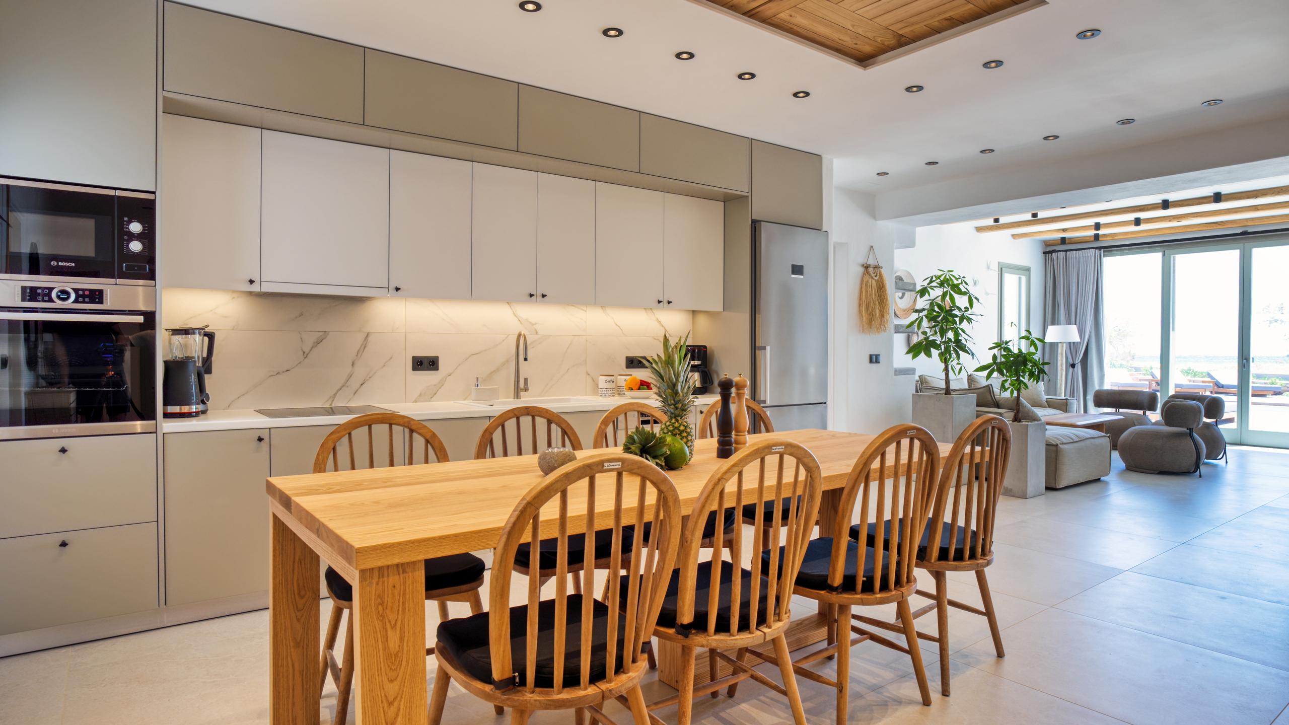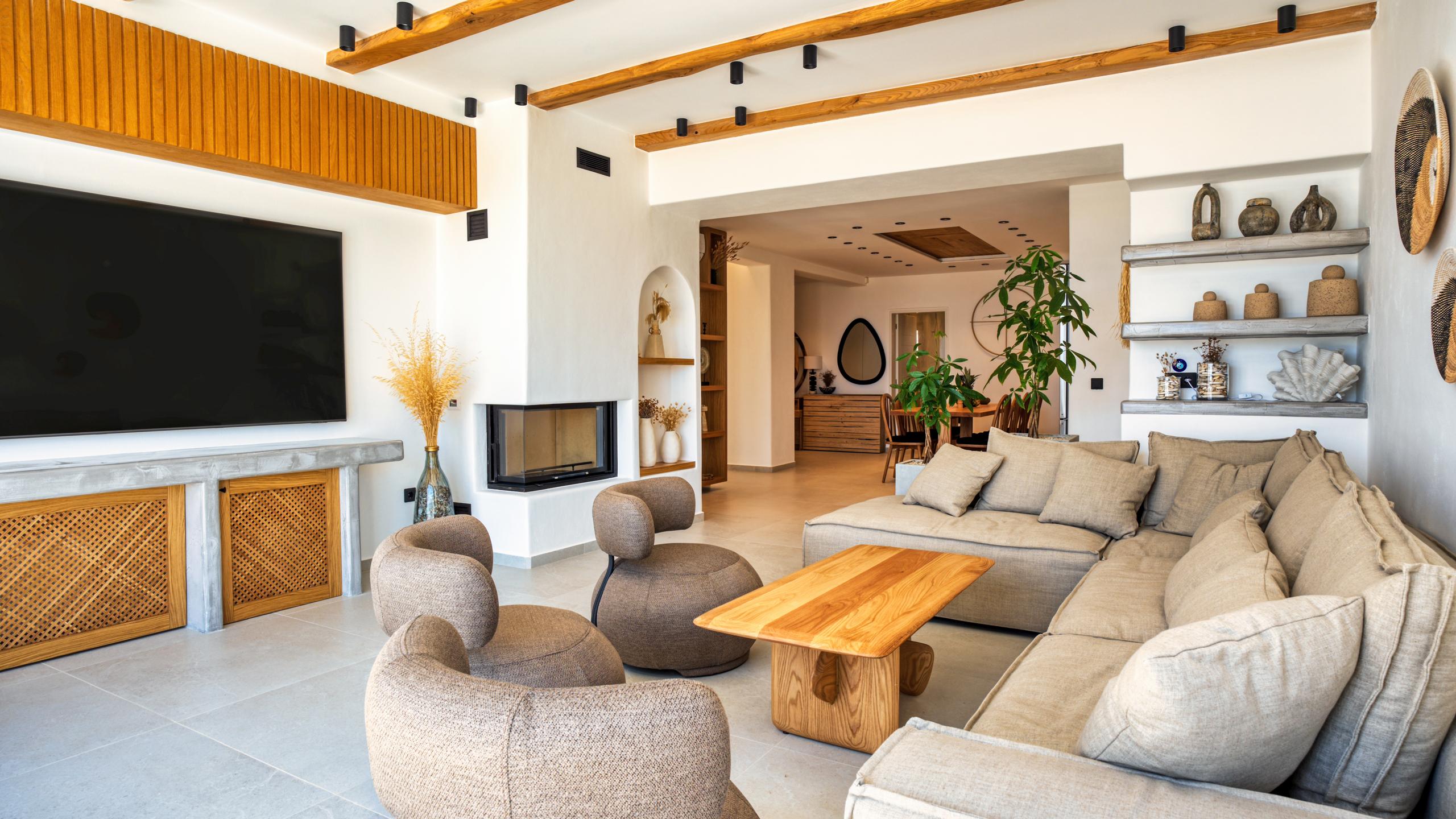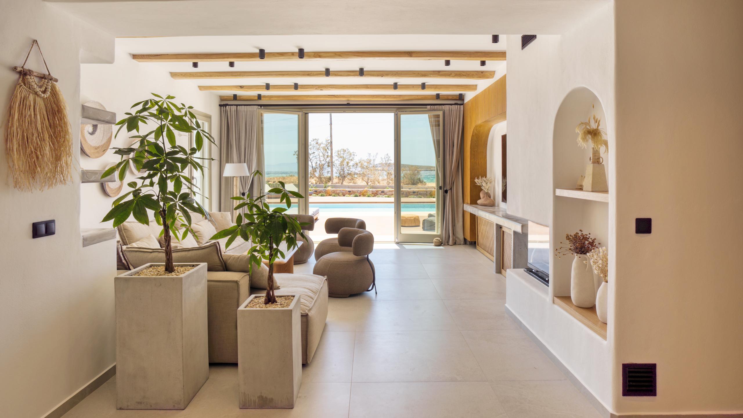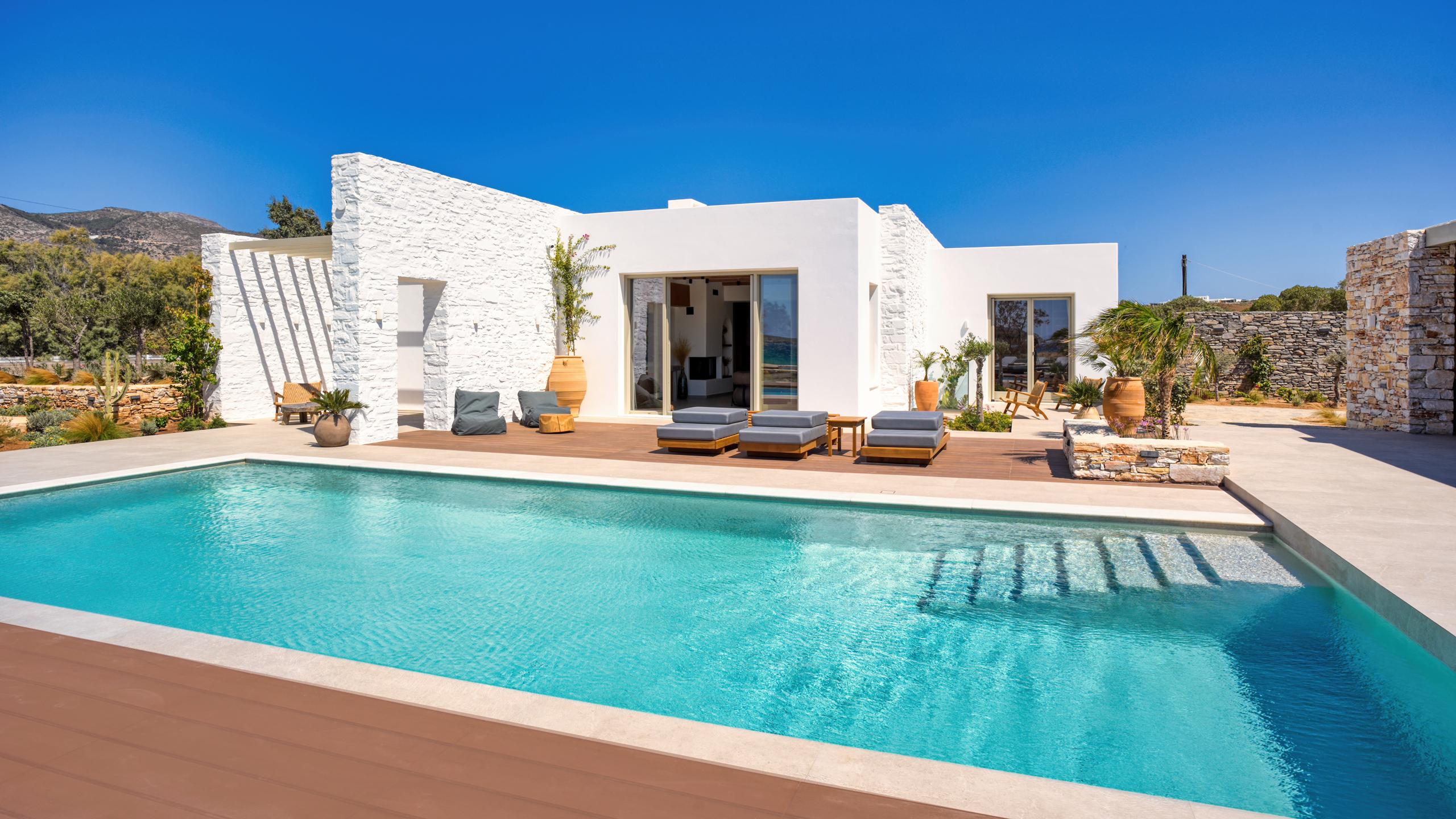 The outdoor areas reflect a fresh, modern style while embracing all the quintessential Cycladic elements: a beautiful and inviting swimming pool, a spacious pergola with an alfresco dining area and outdoor kitchen, and lush Mediterranean greenery that enhances the setting.