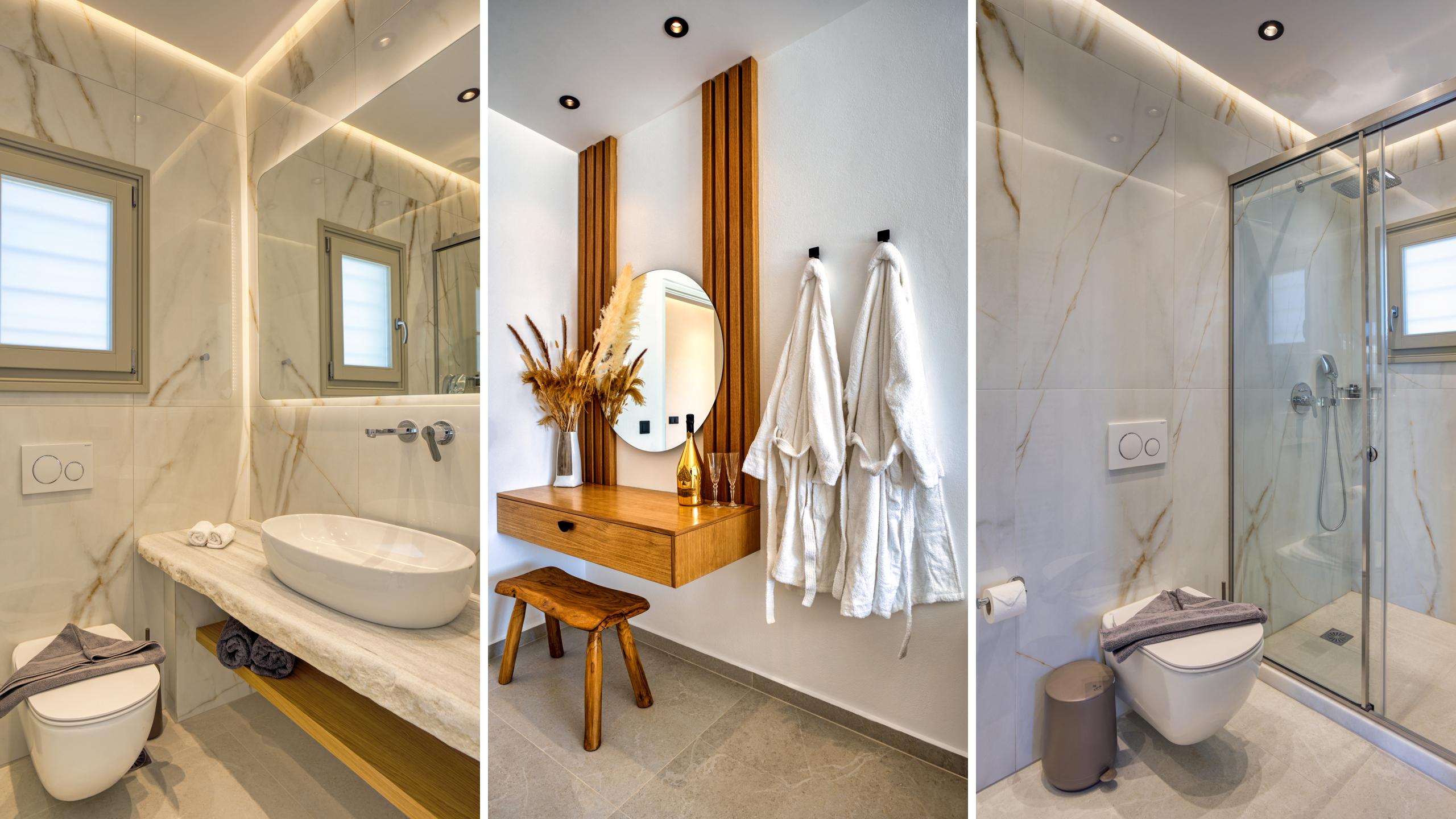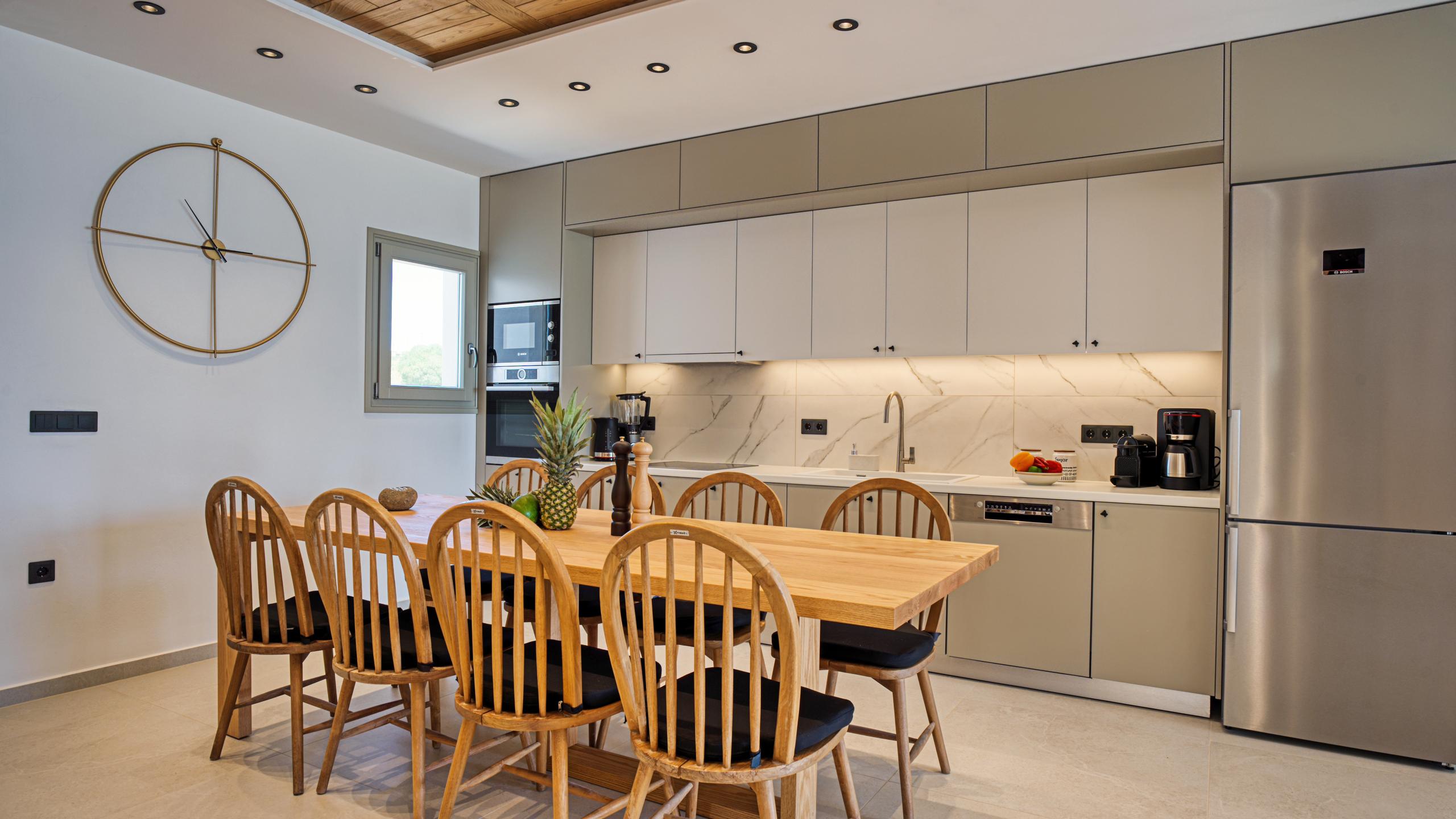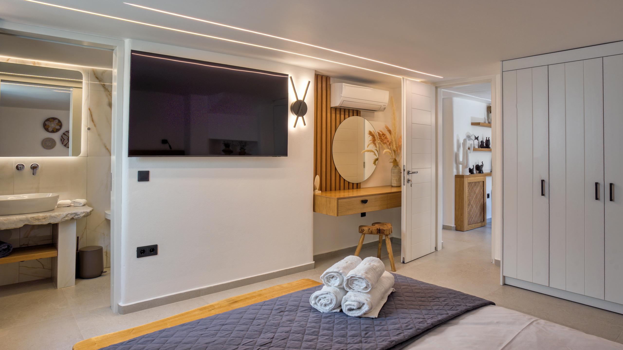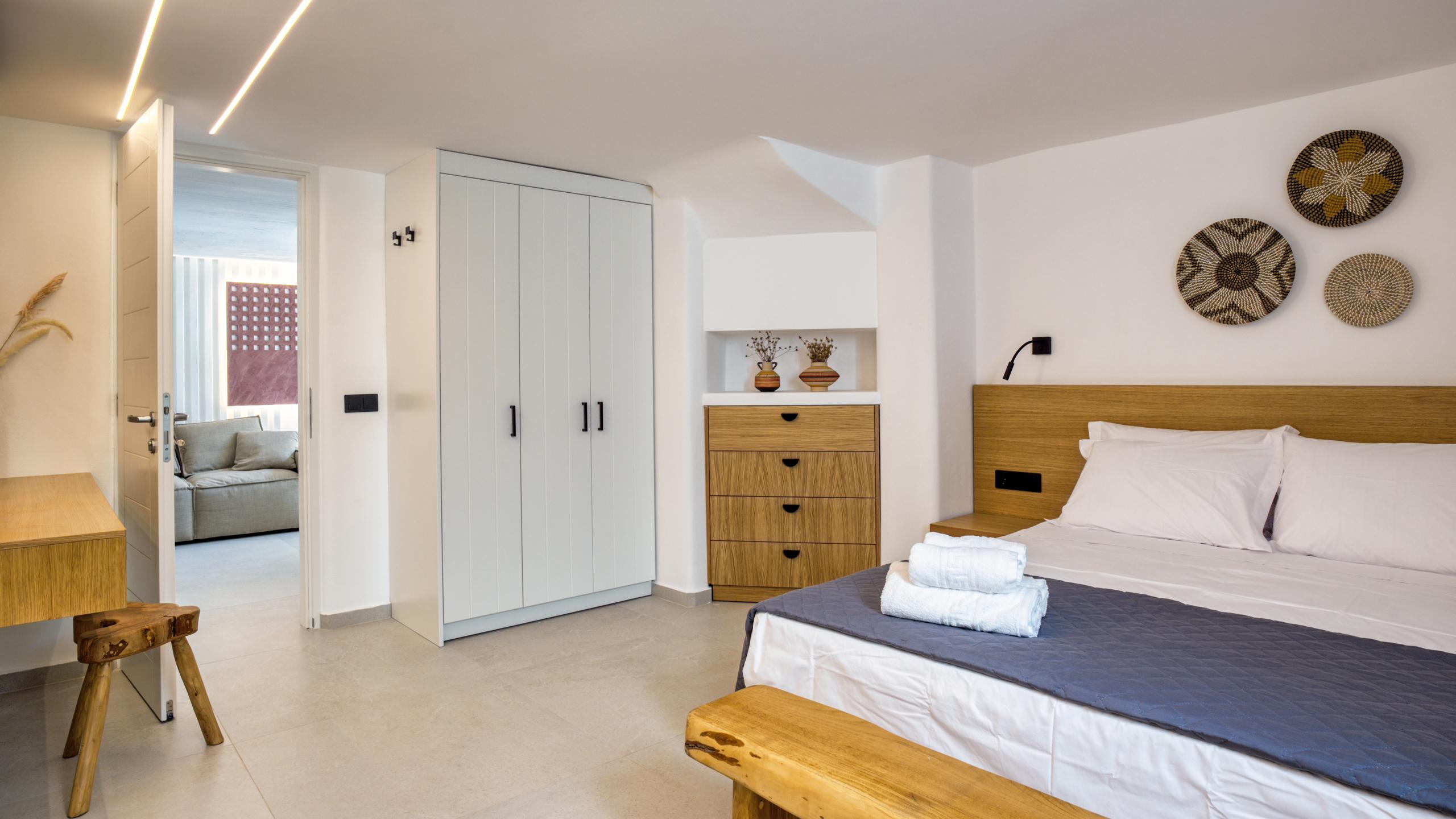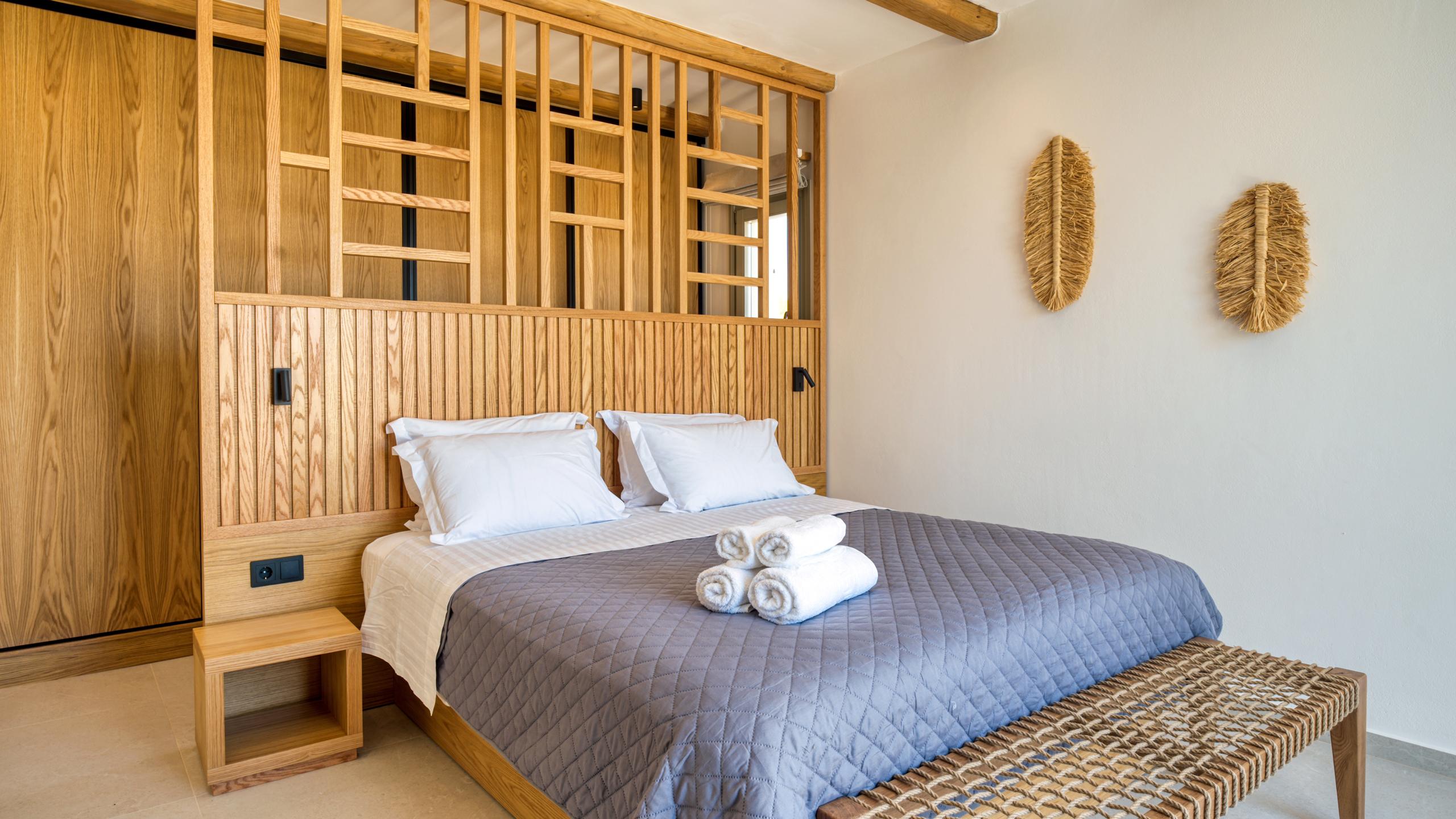 The outdoor areas reflect a fresh, modern style while embracing all the quintessential Cycladic elements: a beautiful and inviting swimming pool, a spacious pergola with an alfresco dining area and outdoor kitchen, and lush Mediterranean greenery that enhances the setting.