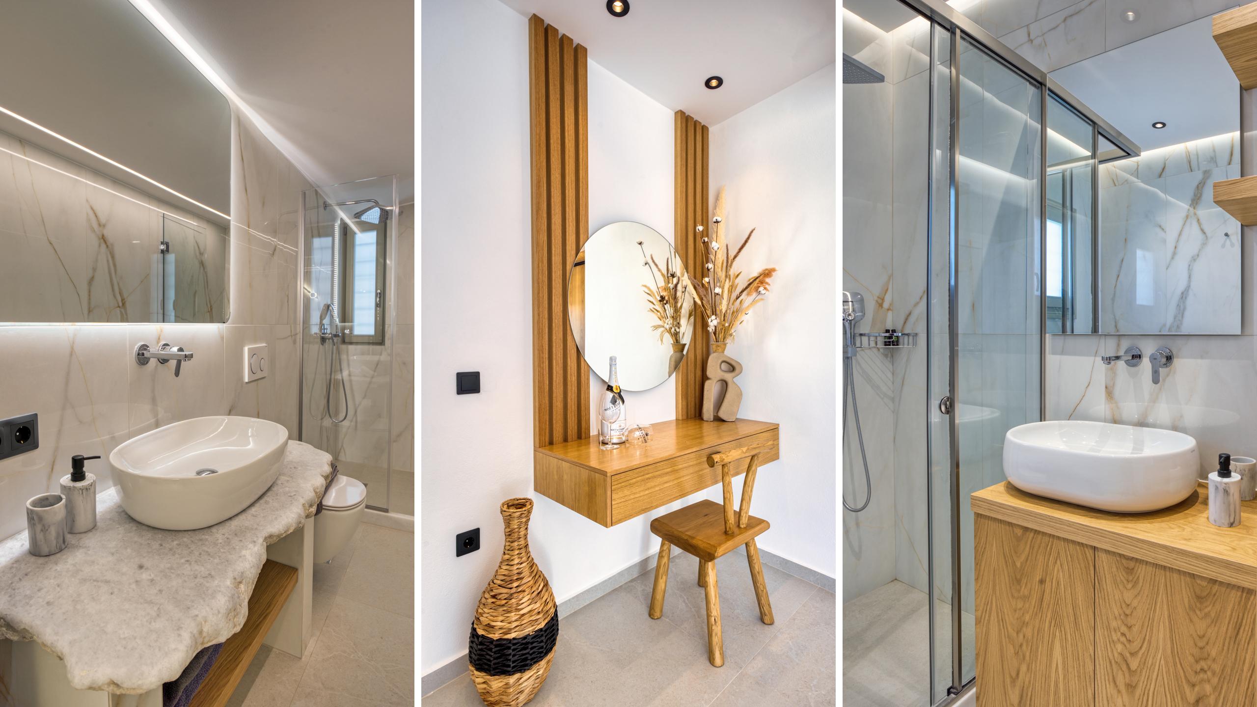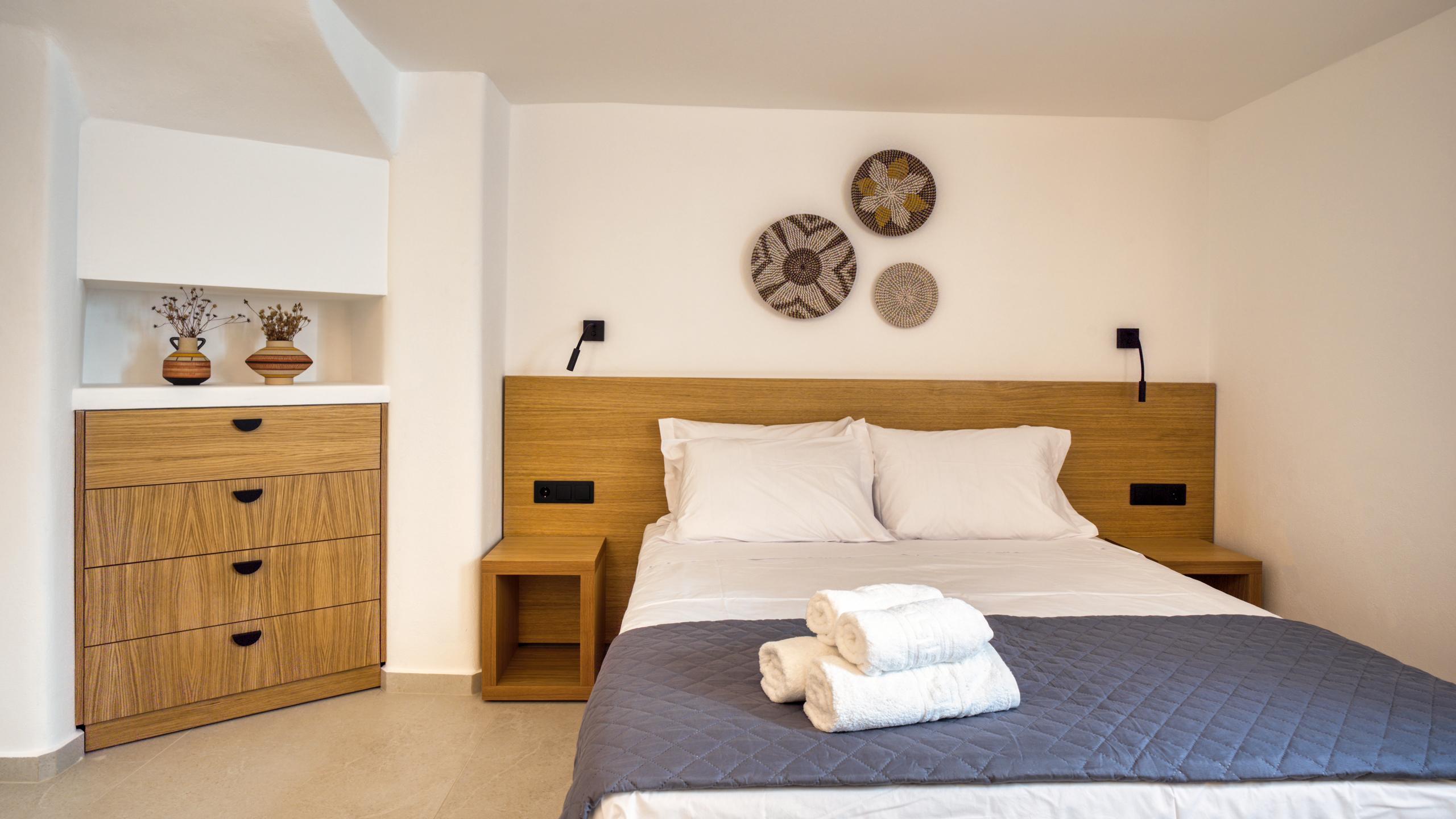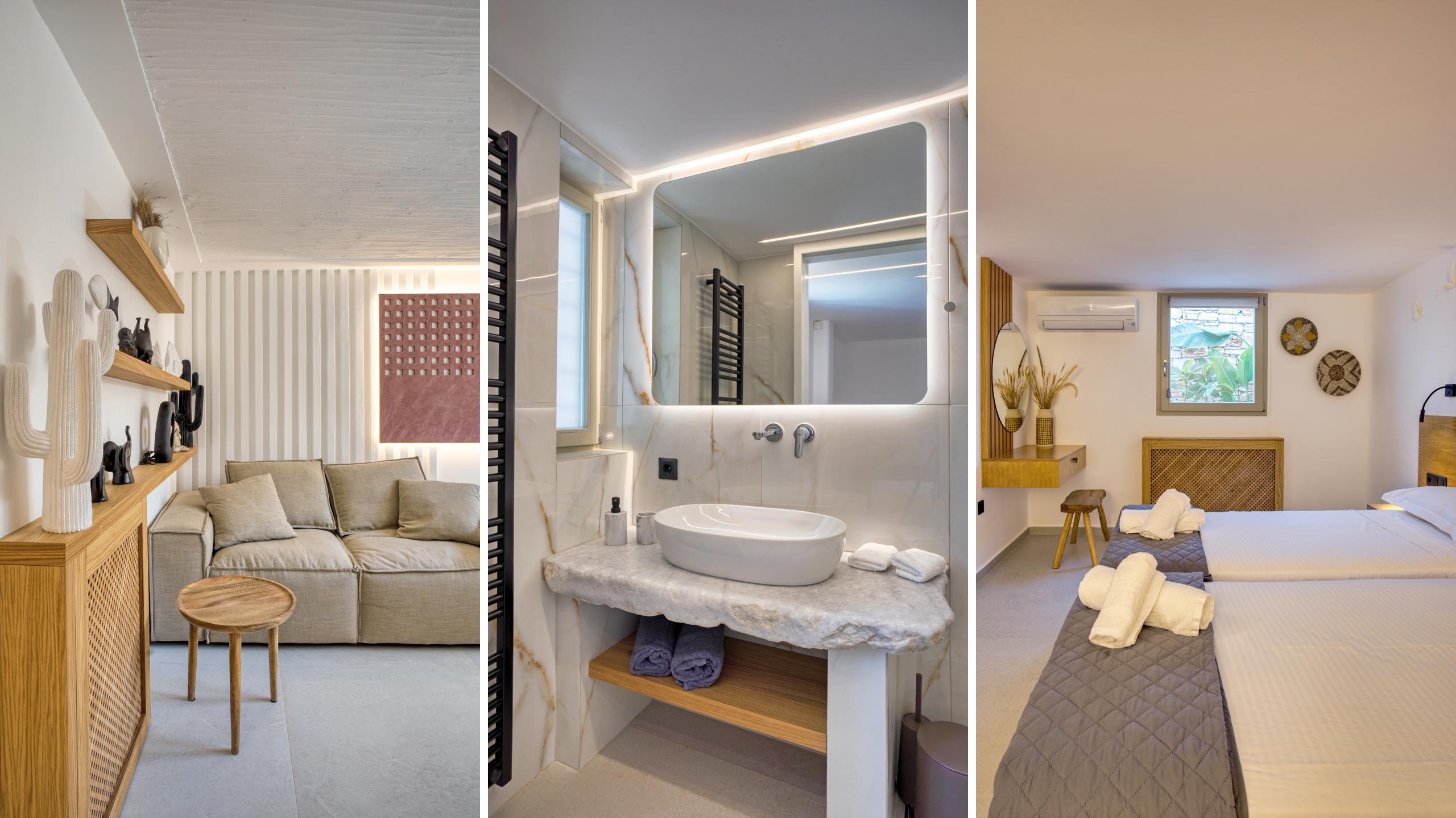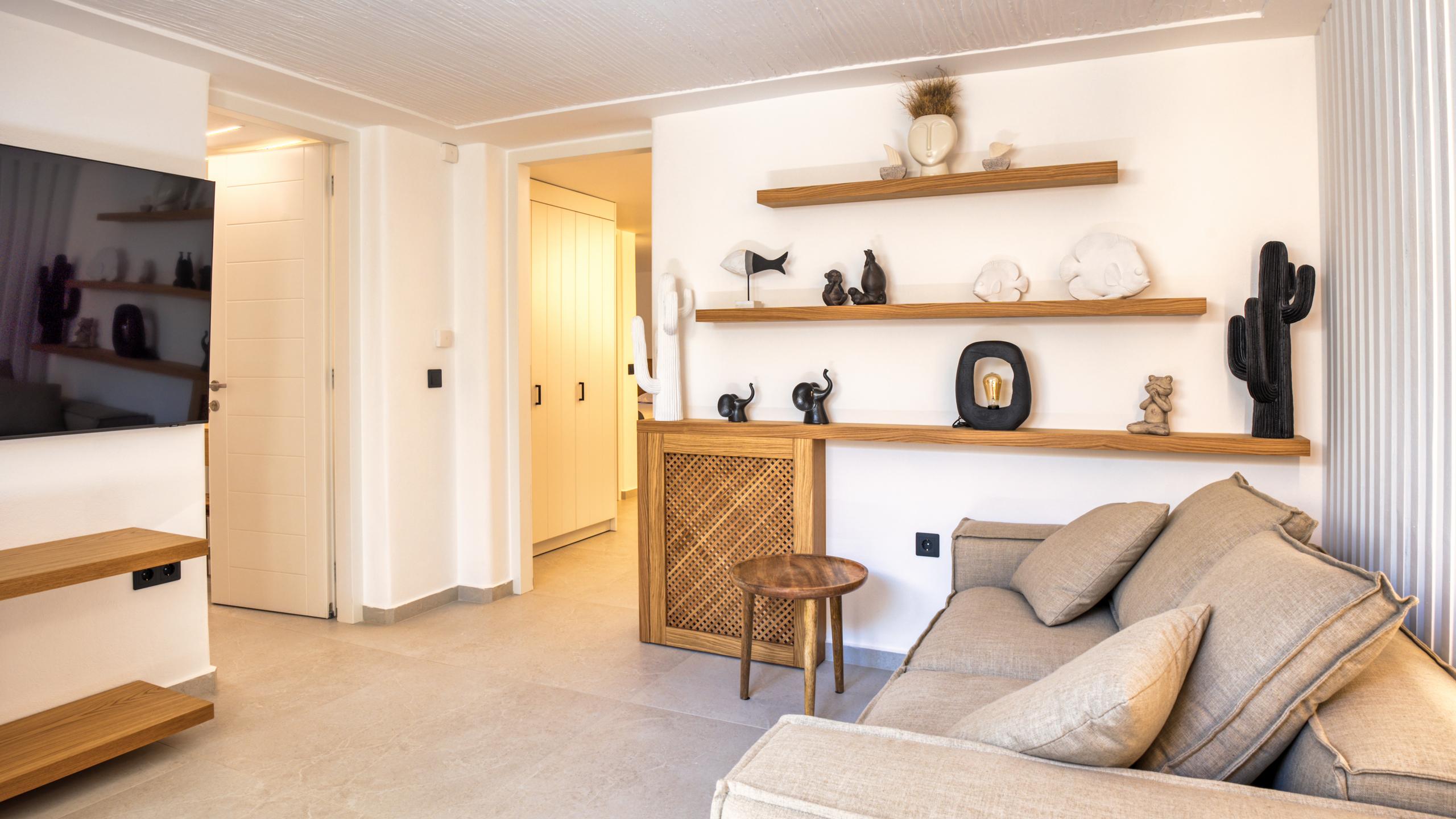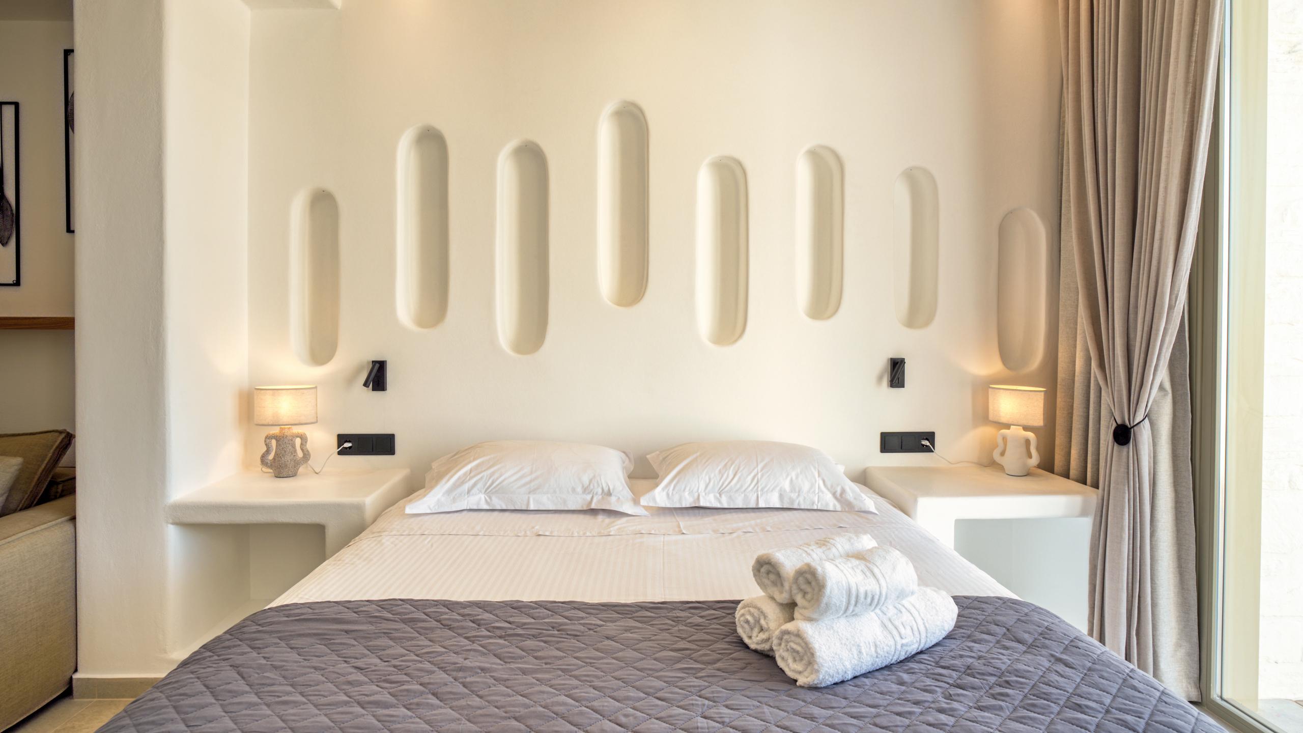 The outdoor areas reflect a fresh, modern style while embracing all the quintessential Cycladic elements: a beautiful and inviting swimming pool, a spacious pergola with an alfresco dining area and outdoor kitchen, and lush Mediterranean greenery that enhances the setting.