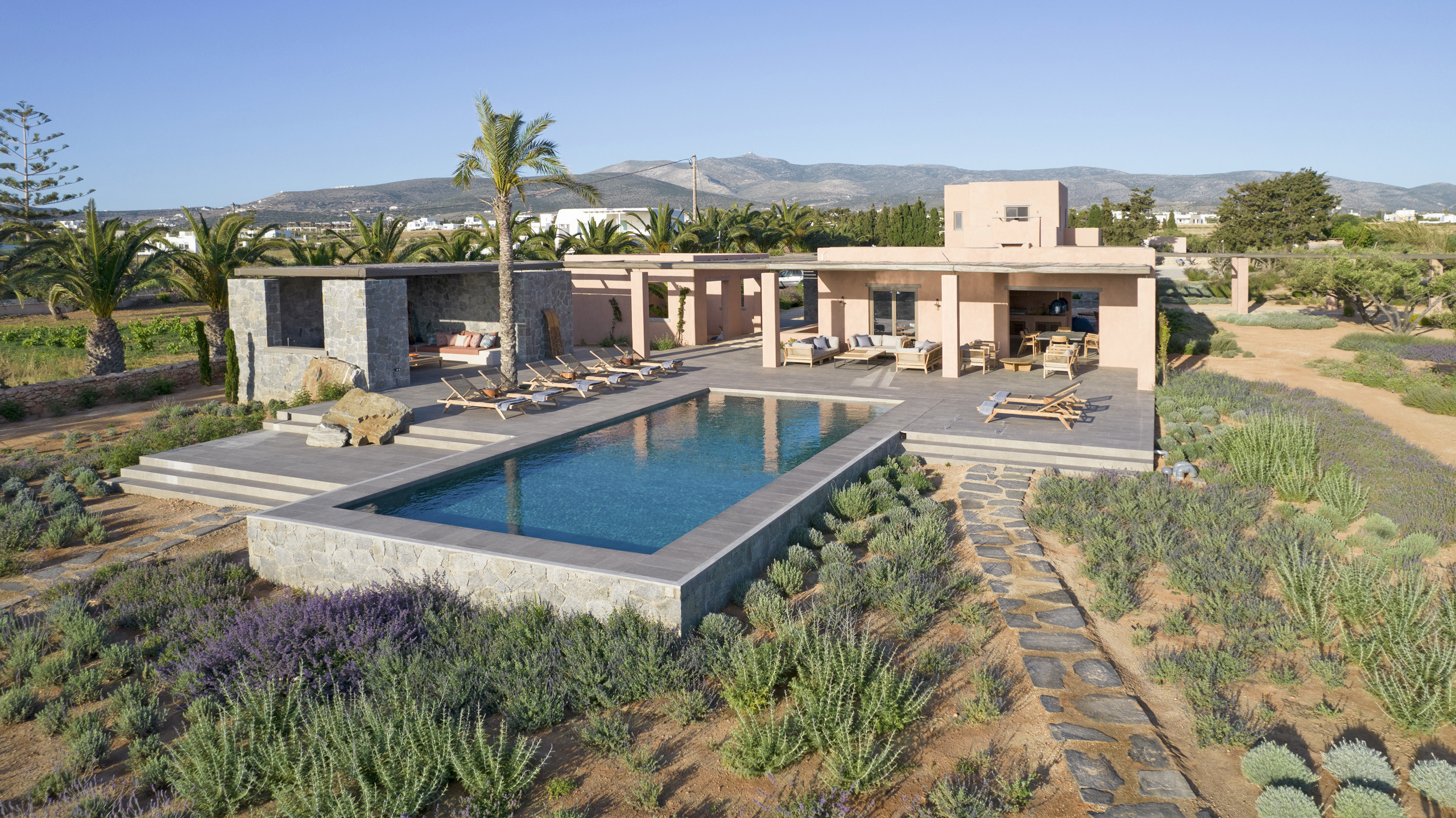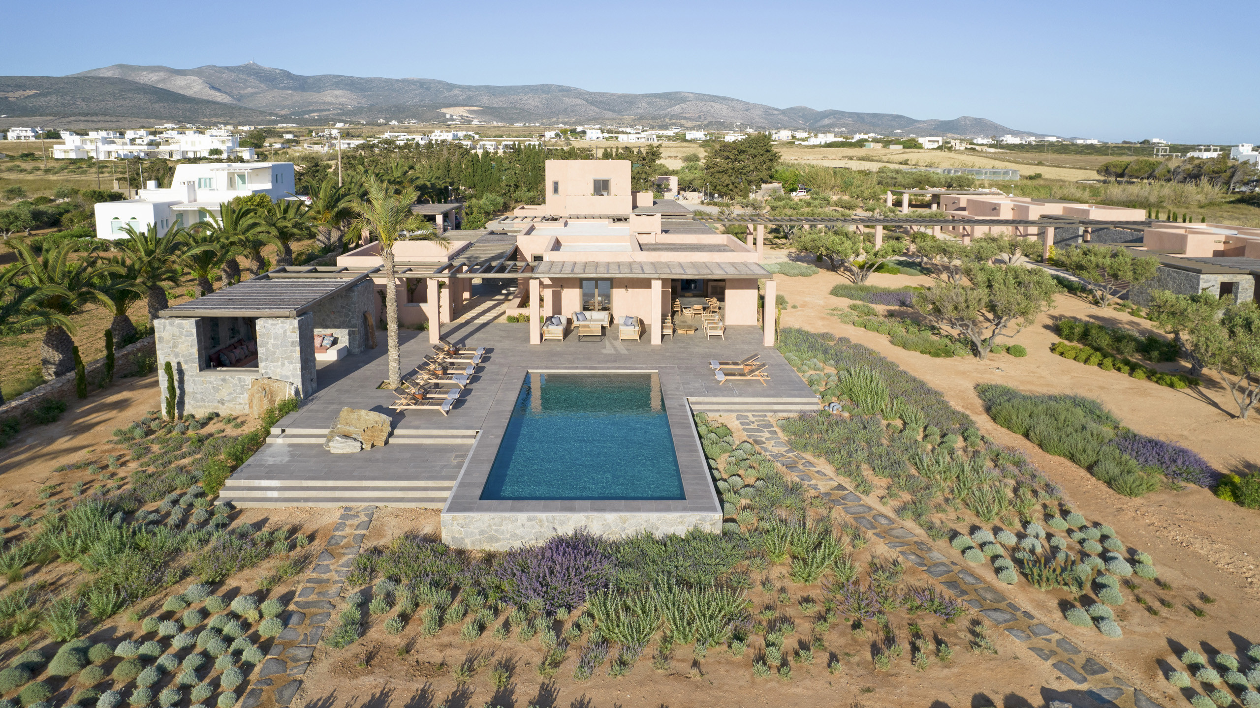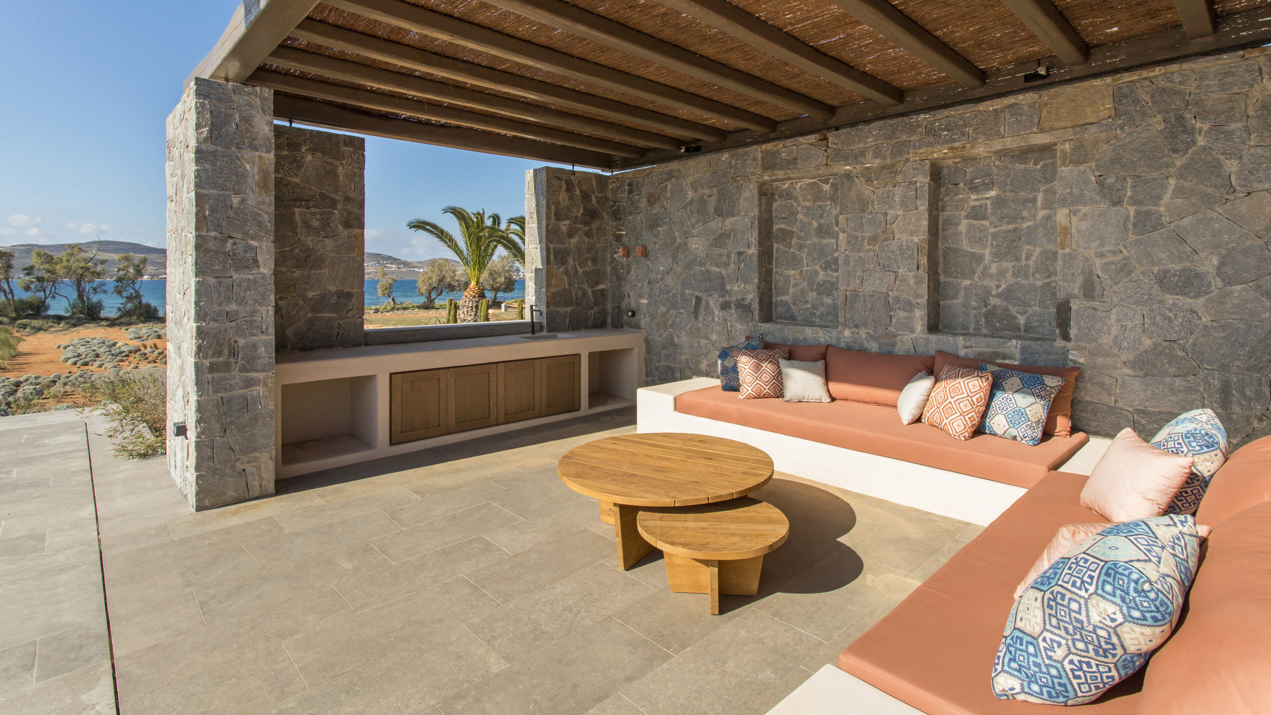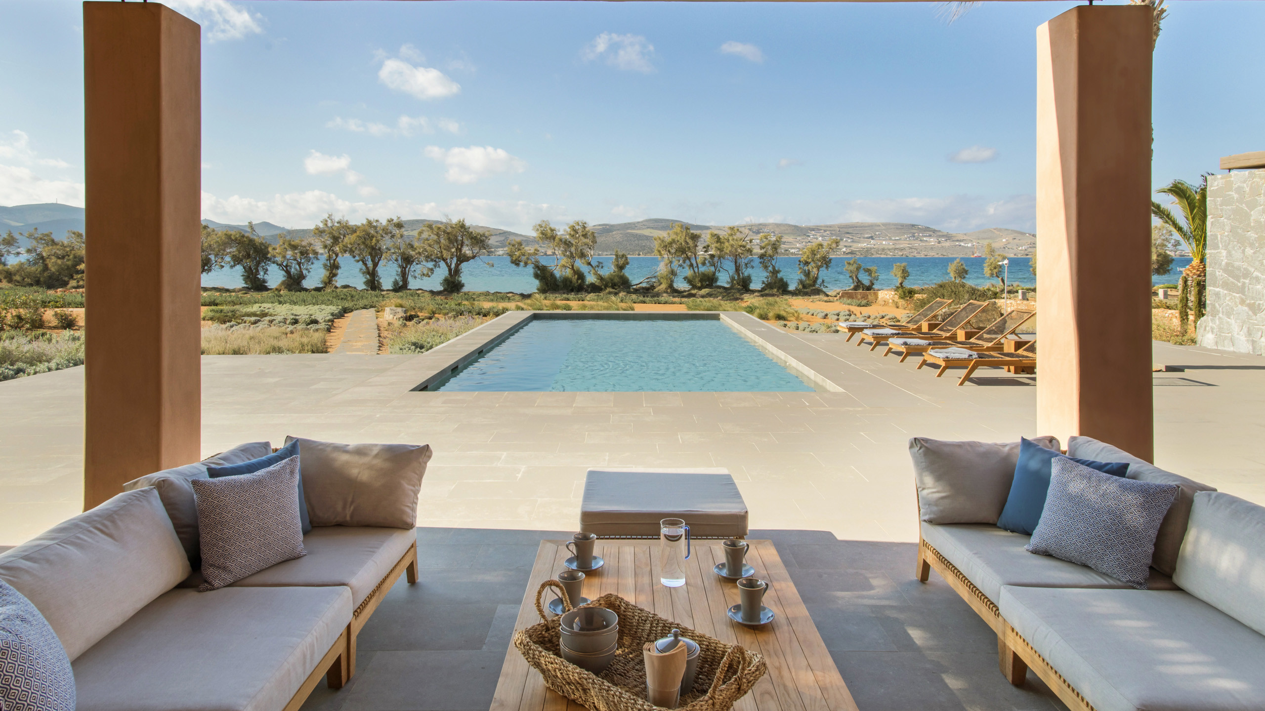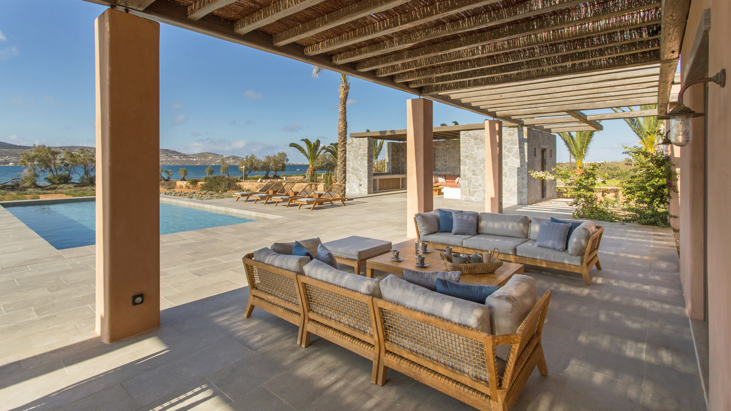 The pool, positioned perpendicular to the coast, is perfect for cooling off during the hottest hours of the day, with a pleasant shaded relaxation area nearby and a well-designed dining space beneath the portico, seamlessly connected to the kitchen to facilitate the work of our chefs. The colors and materials used in the building's design are captivating, with pastel shades rarely seen in this part of Greece, contributing to a relaxing and sophisticated atmosphere.