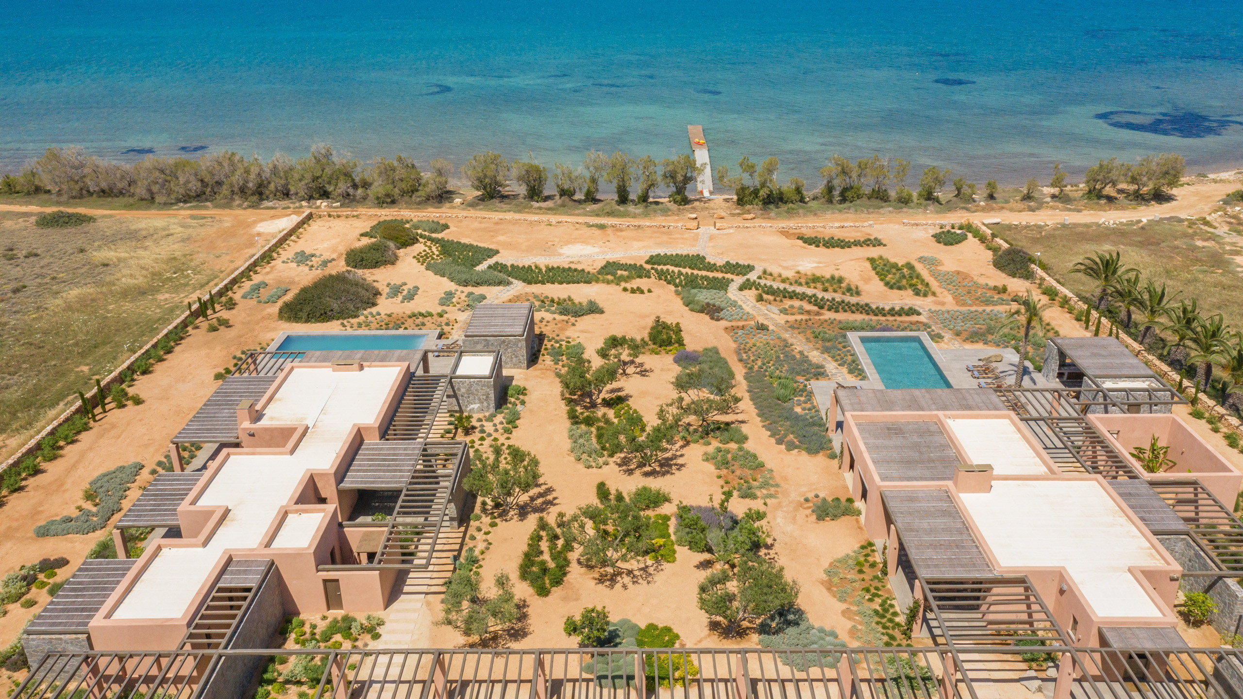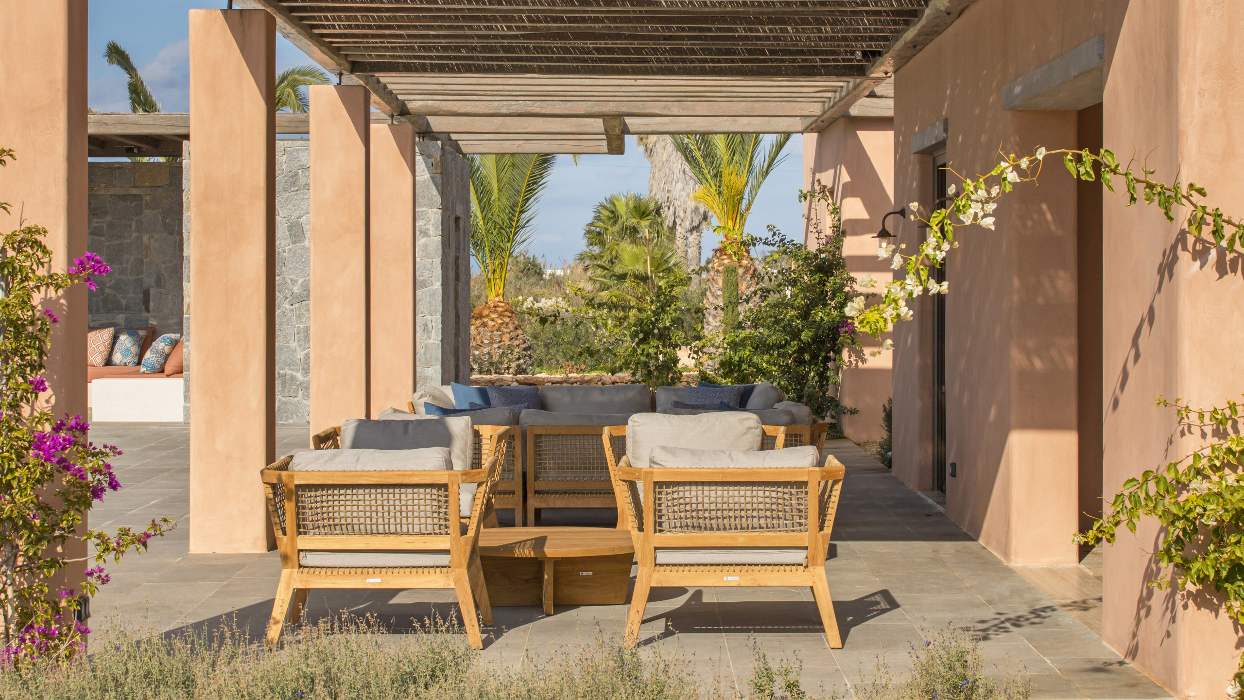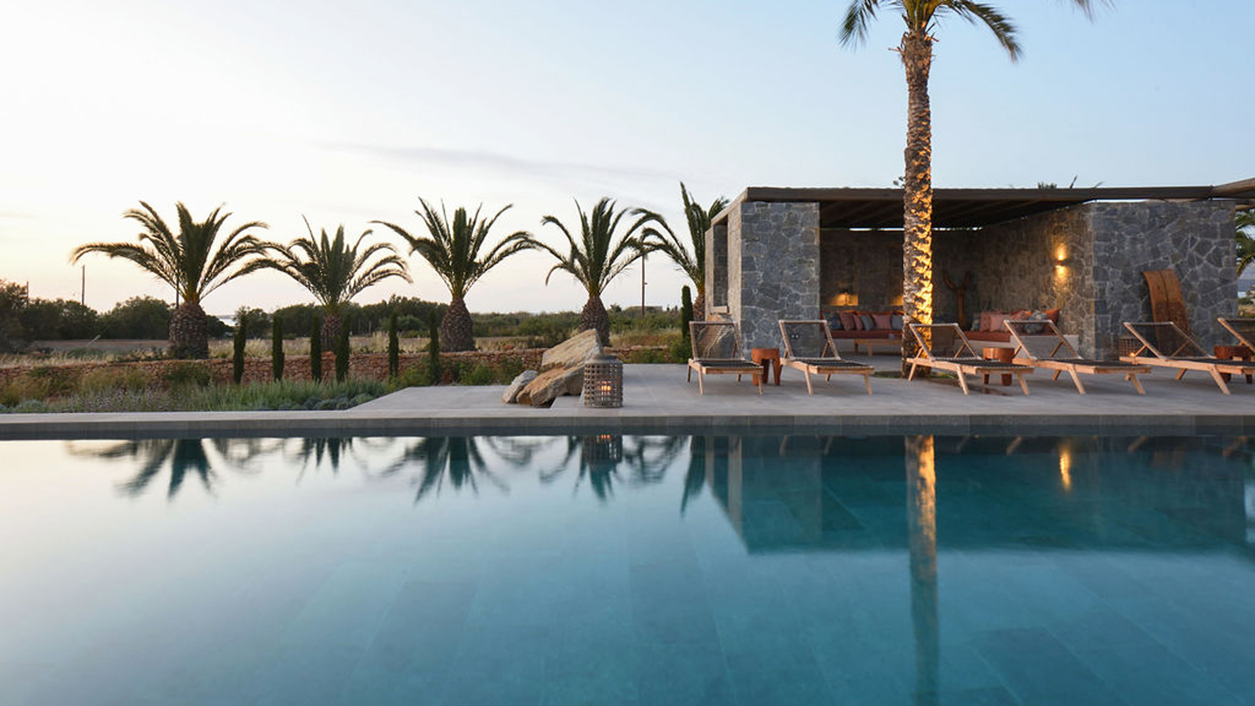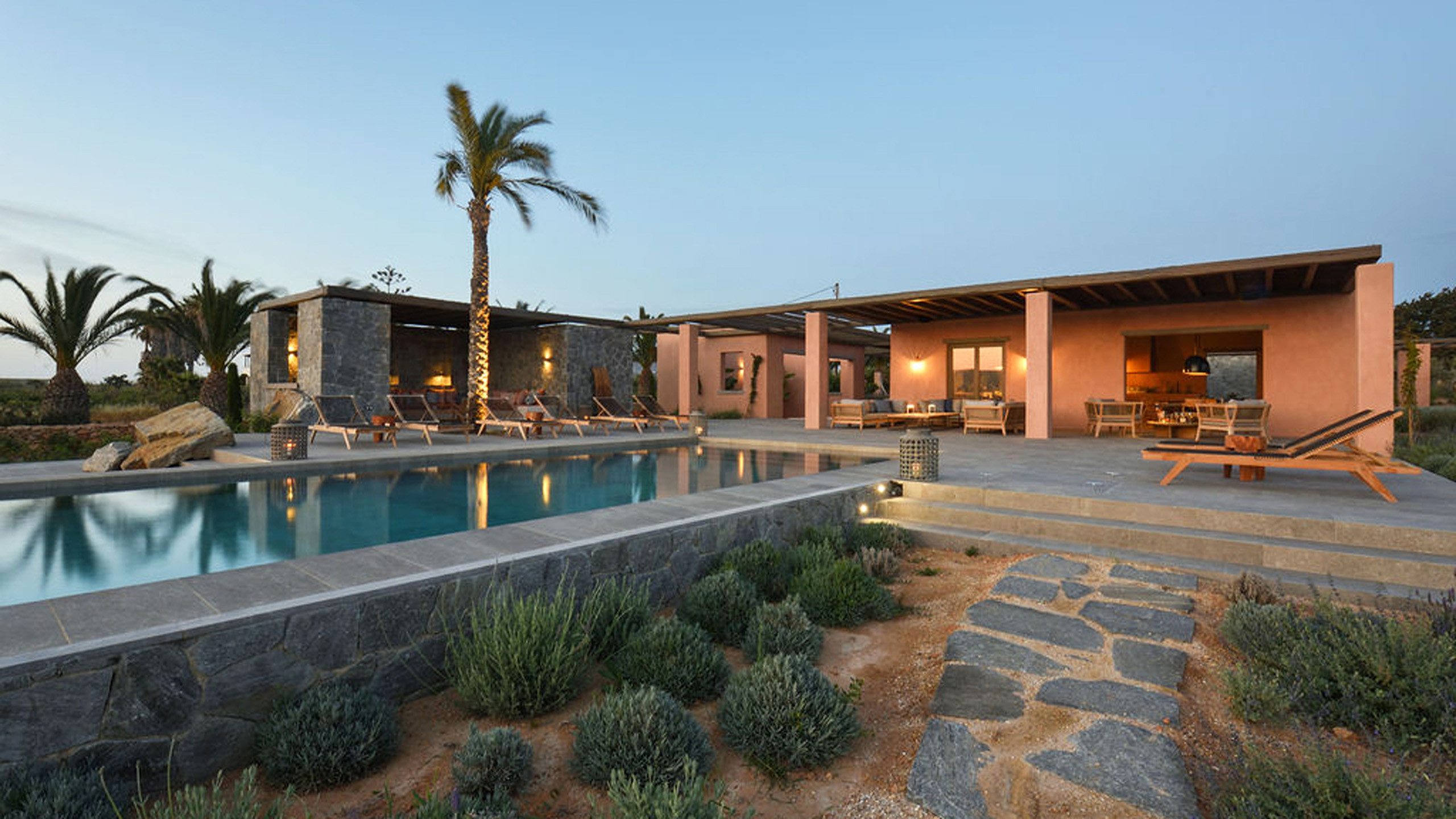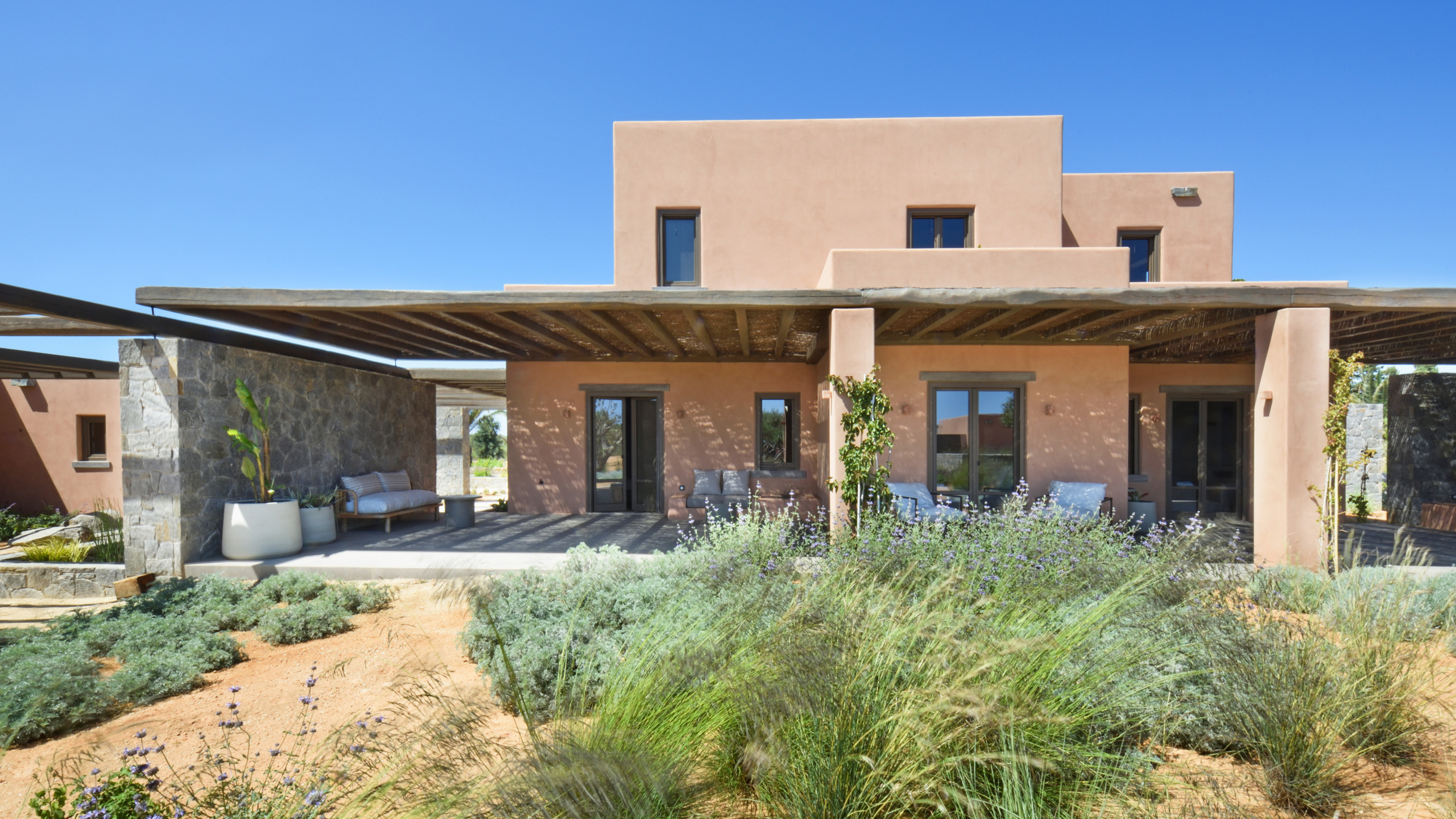 The pool, positioned perpendicular to the coast, is perfect for cooling off during the hottest hours of the day, with a pleasant shaded relaxation area nearby and a well-designed dining space beneath the portico, seamlessly connected to the kitchen to facilitate the work of our chefs. The colors and materials used in the building's design are captivating, with pastel shades rarely seen in this part of Greece, contributing to a relaxing and sophisticated atmosphere.